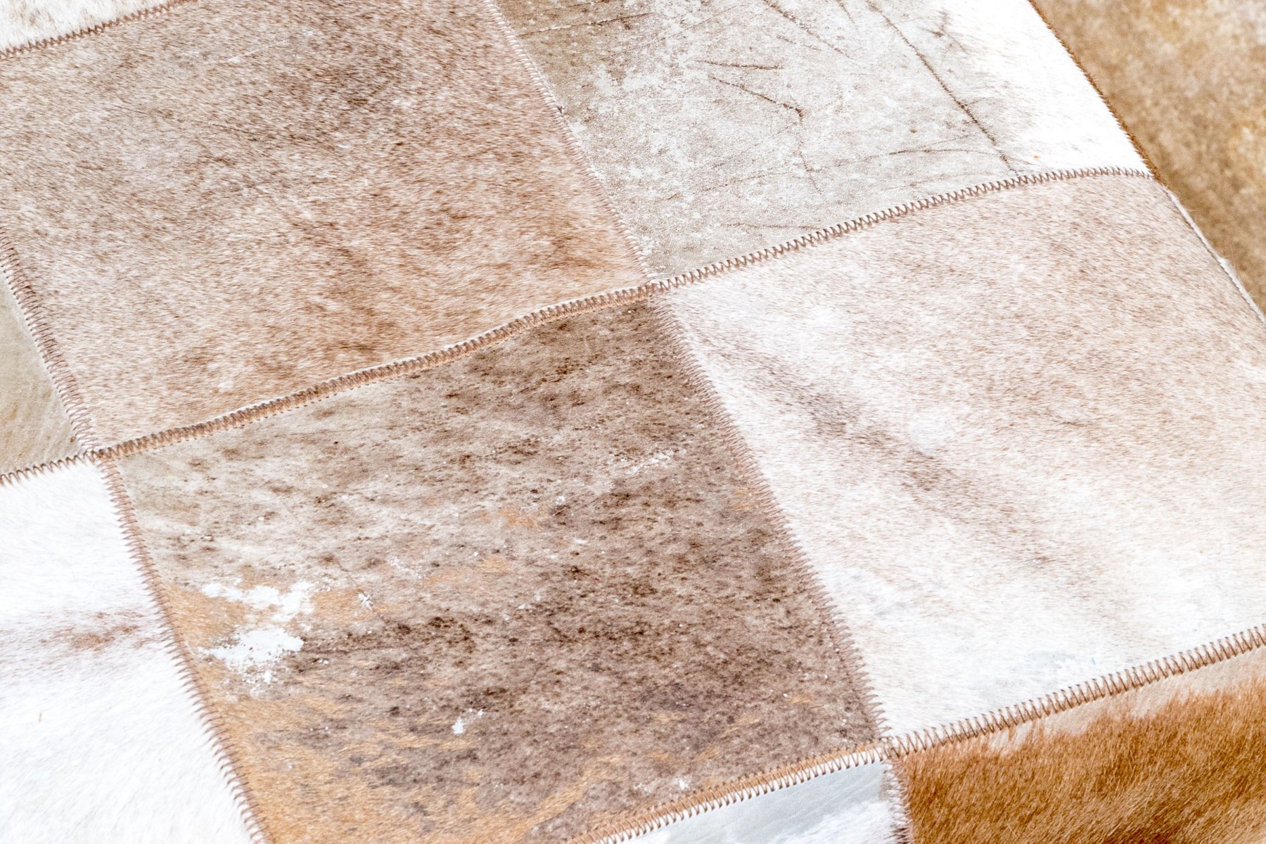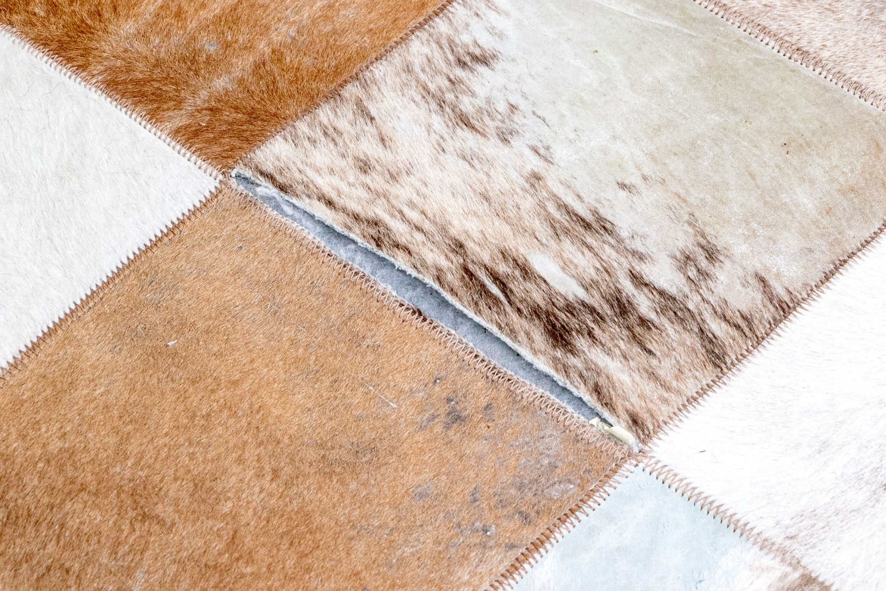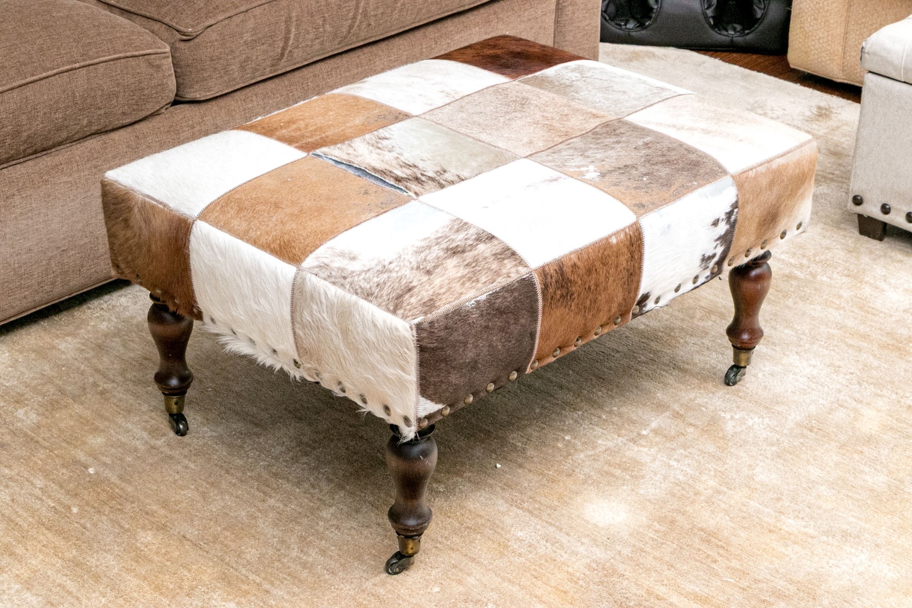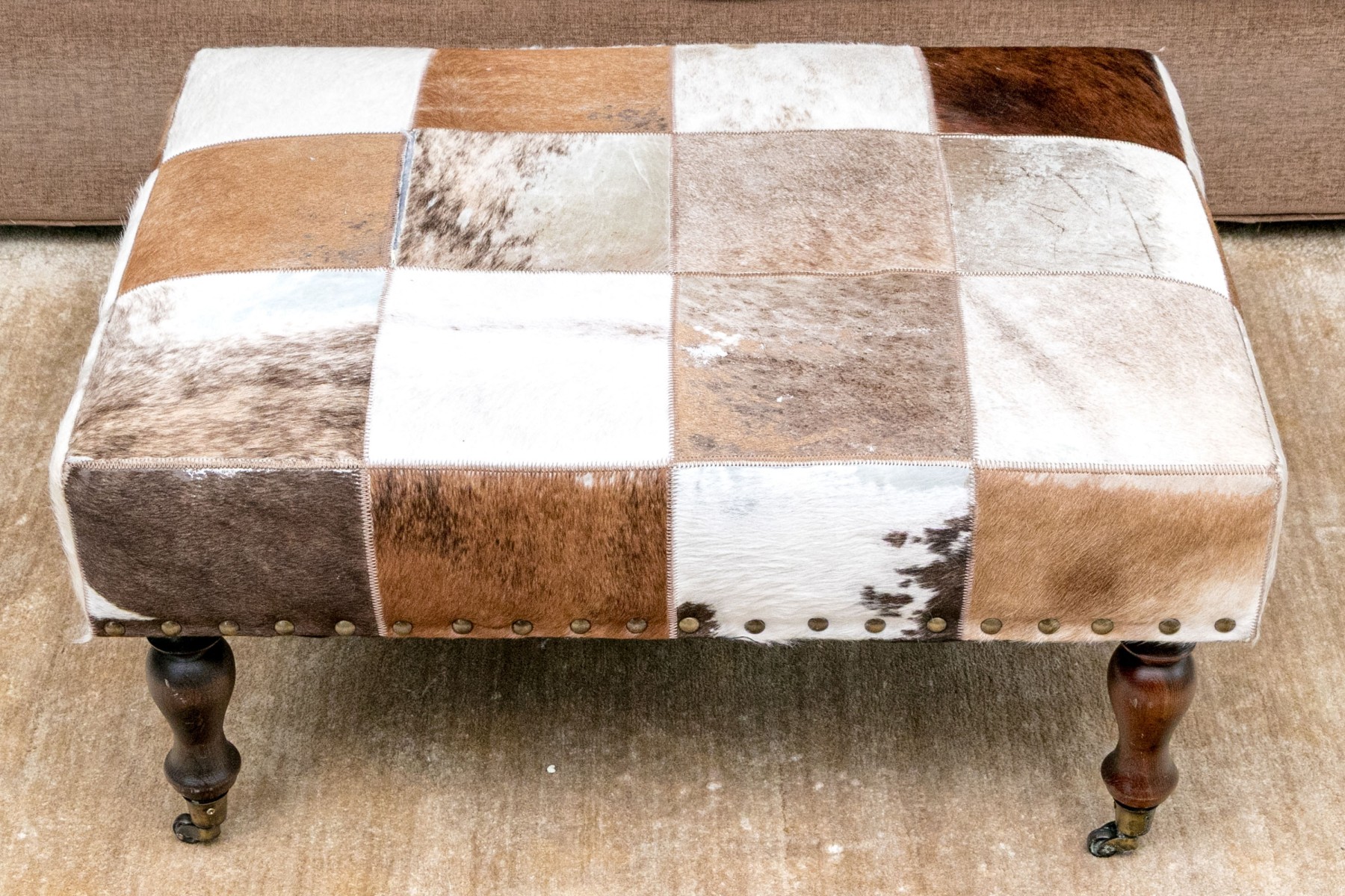 A fantastic vintage ottoman upholstered in hide with an eye-catching checkered design in white, gray, light brown, and dark brown with a brass nailhead trim around the apron. Raised on dark brown baluster legs with brass casters.