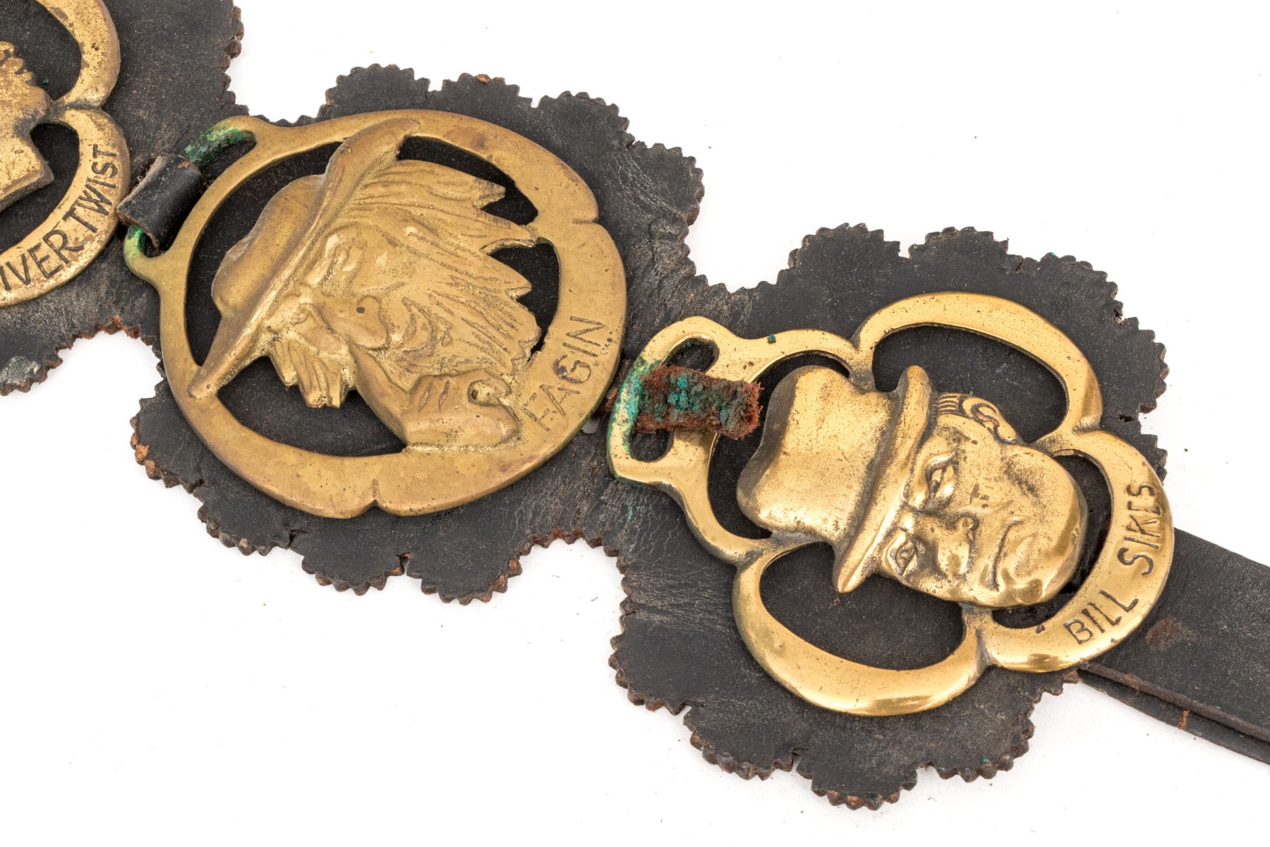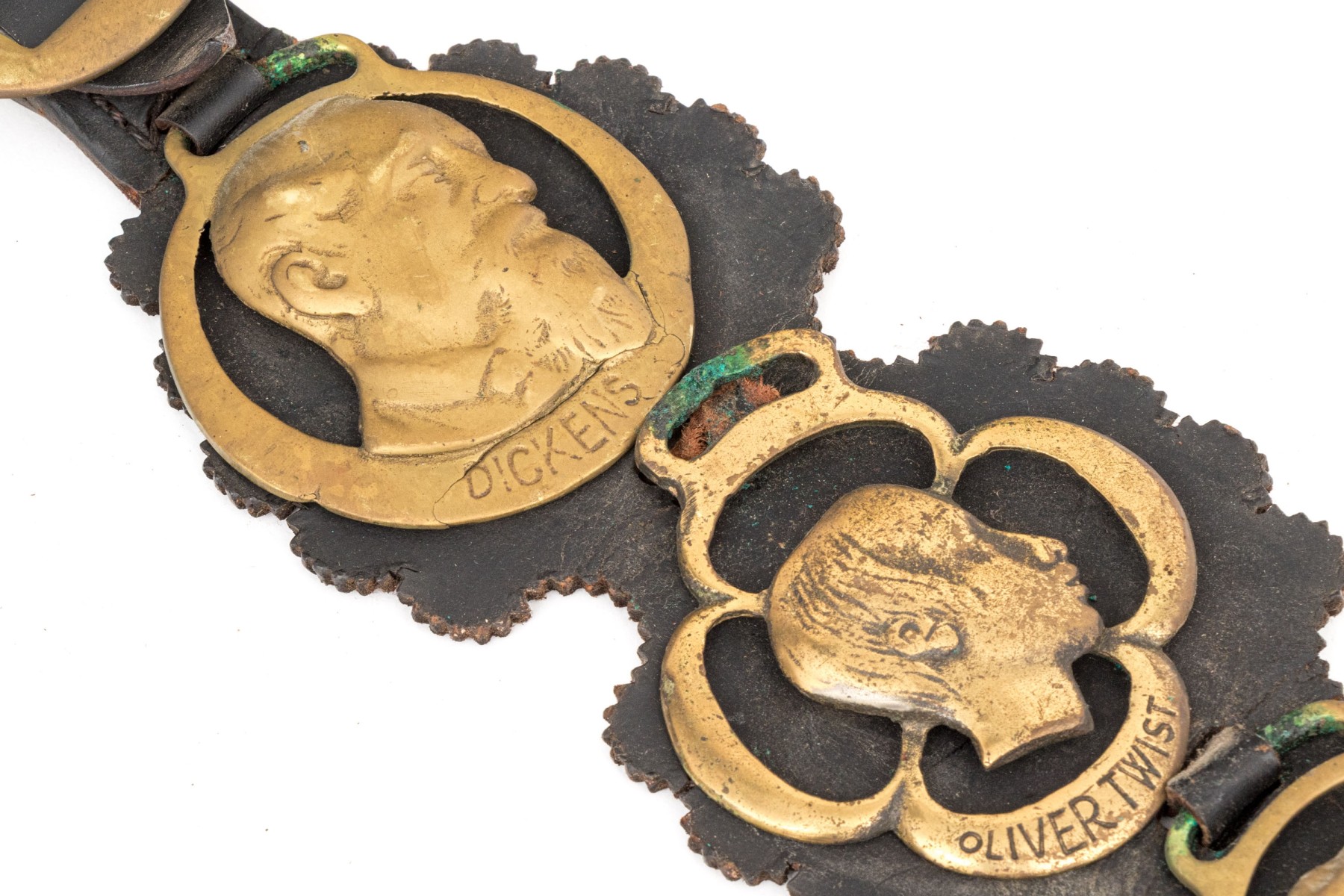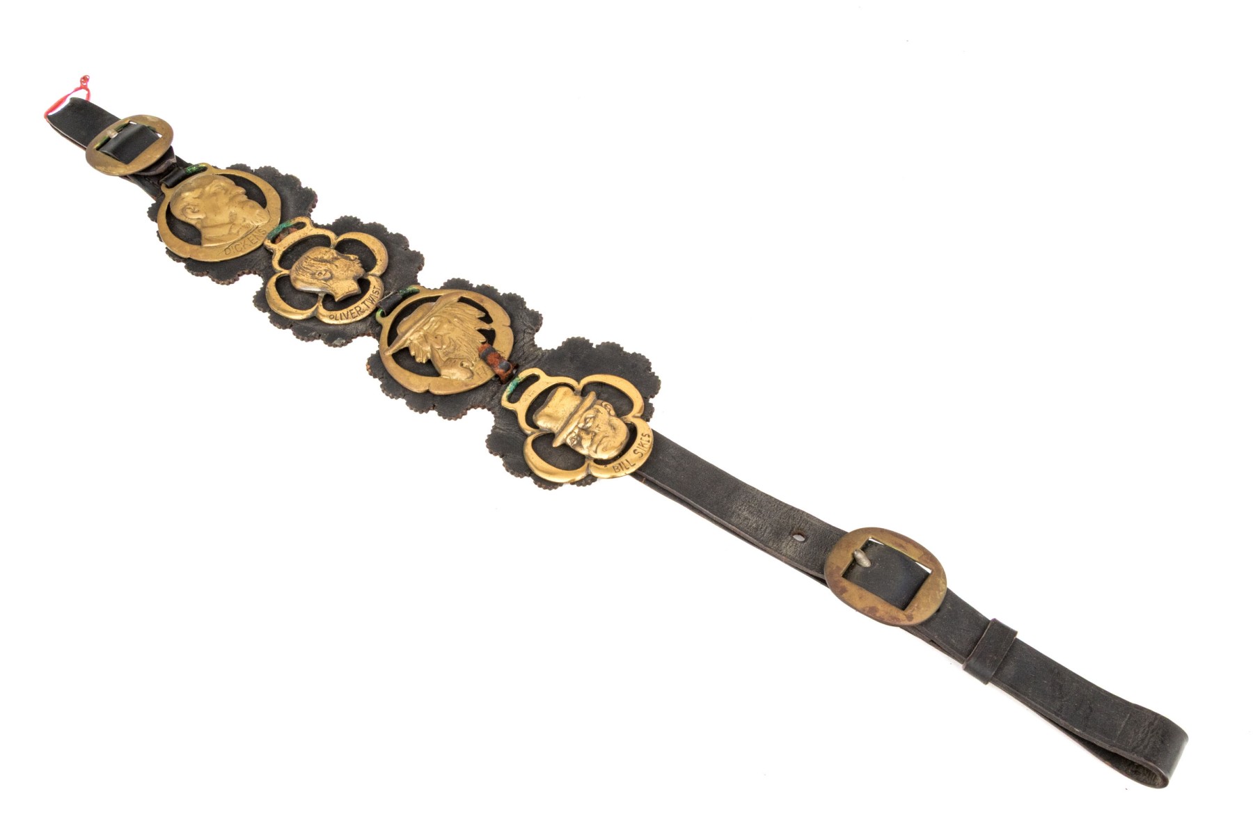 A leather strap with buckle set with four brasses depicting Charles Dickens and characters from his novels.