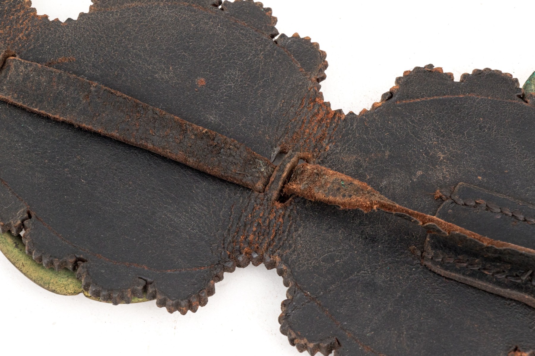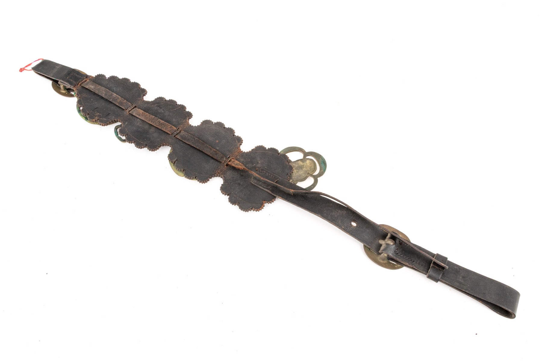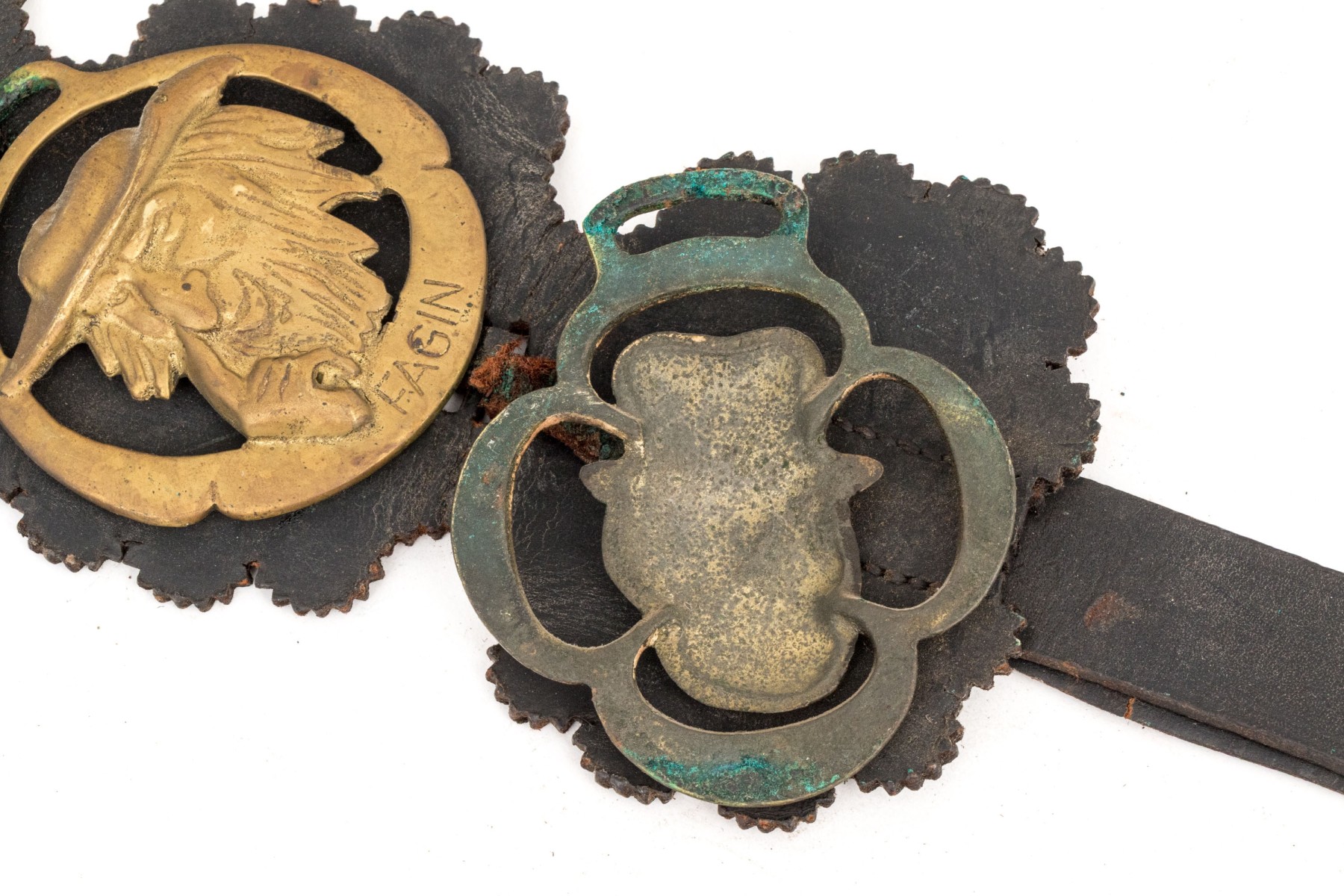 A leather strap with buckle set with four brasses depicting Charles Dickens and characters from his novels.