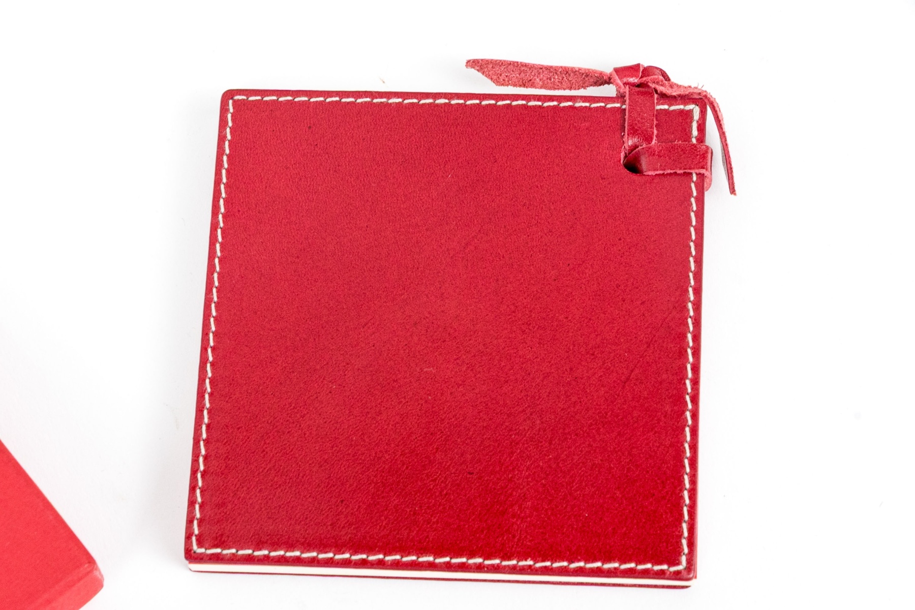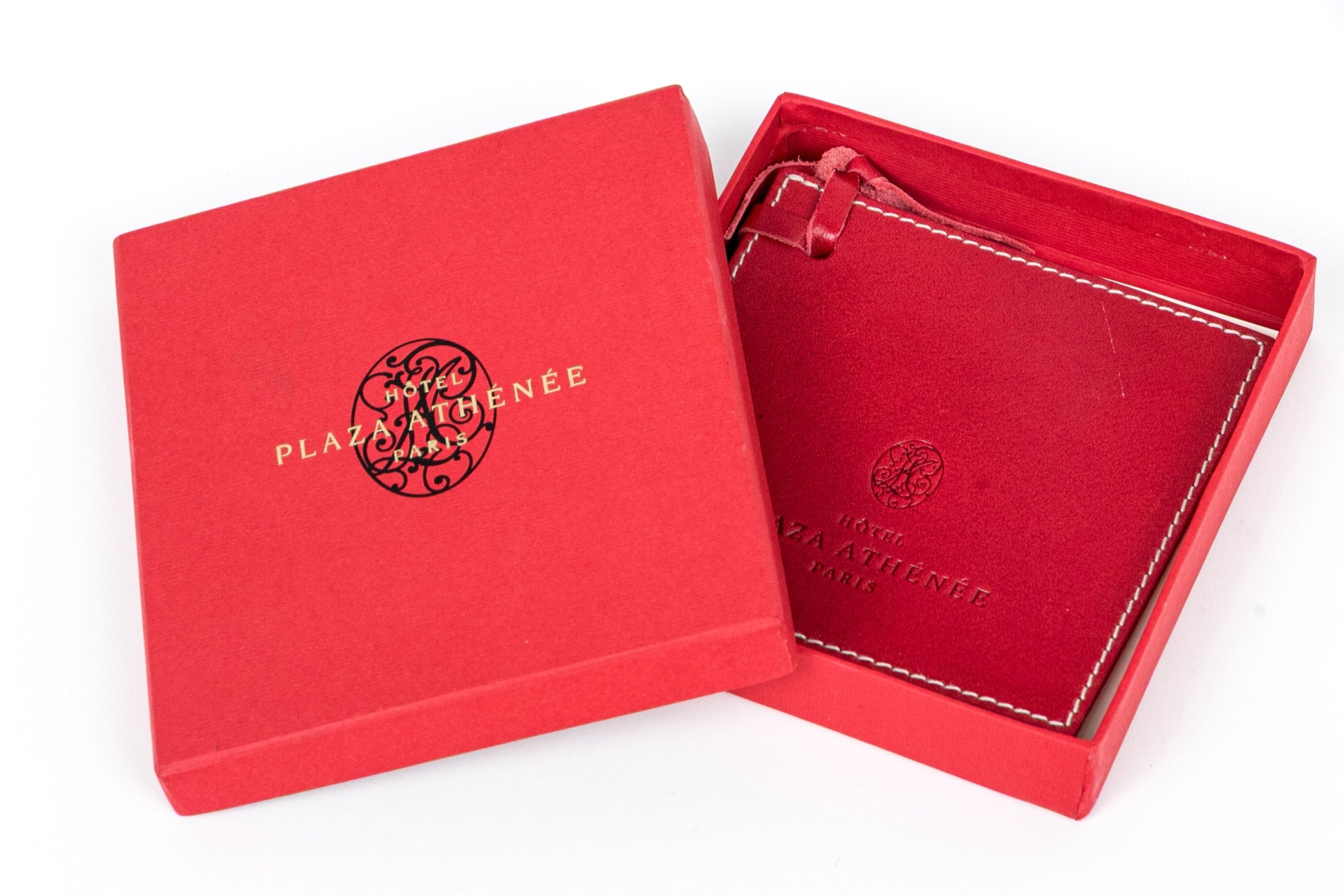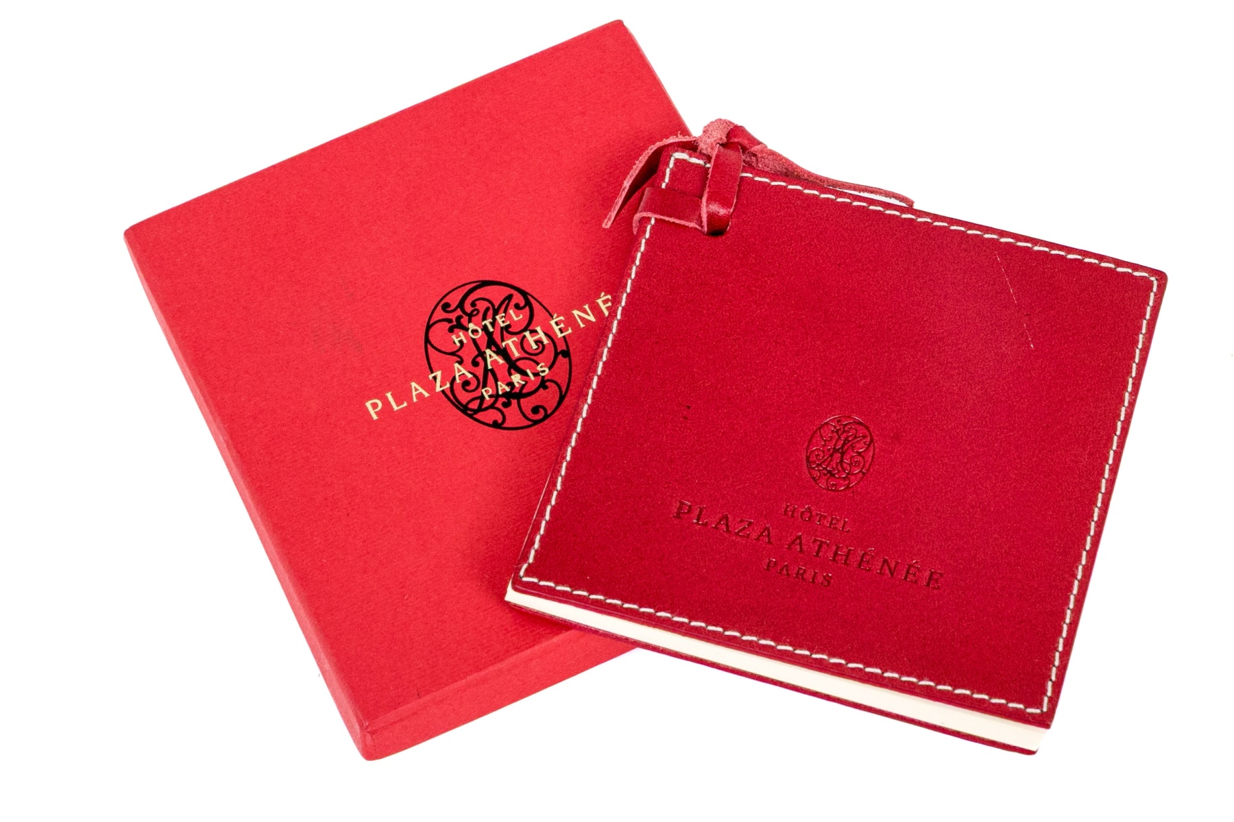 A small red leather covered notebook with leather ribbon tie. Presented in the hotel red box.