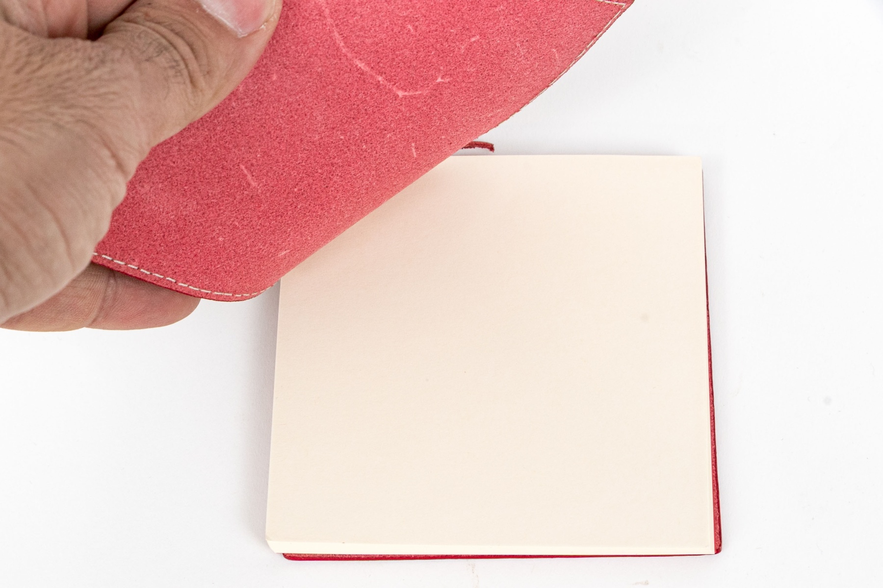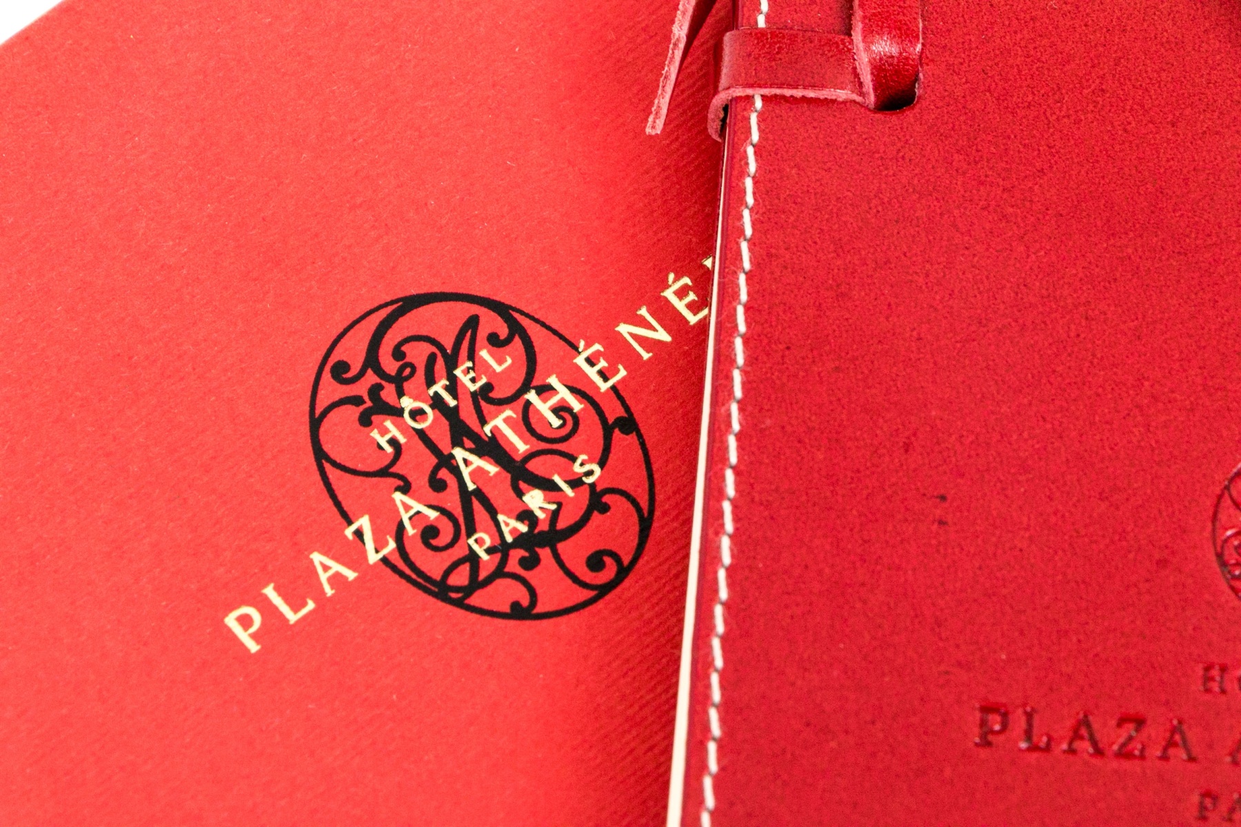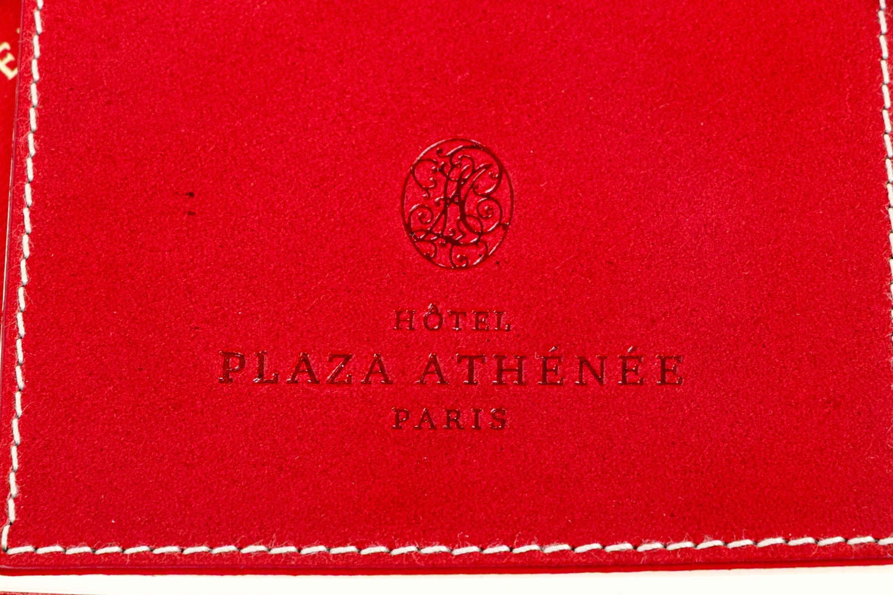 A small red leather covered notebook with leather ribbon tie. Presented in the hotel red box.