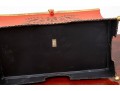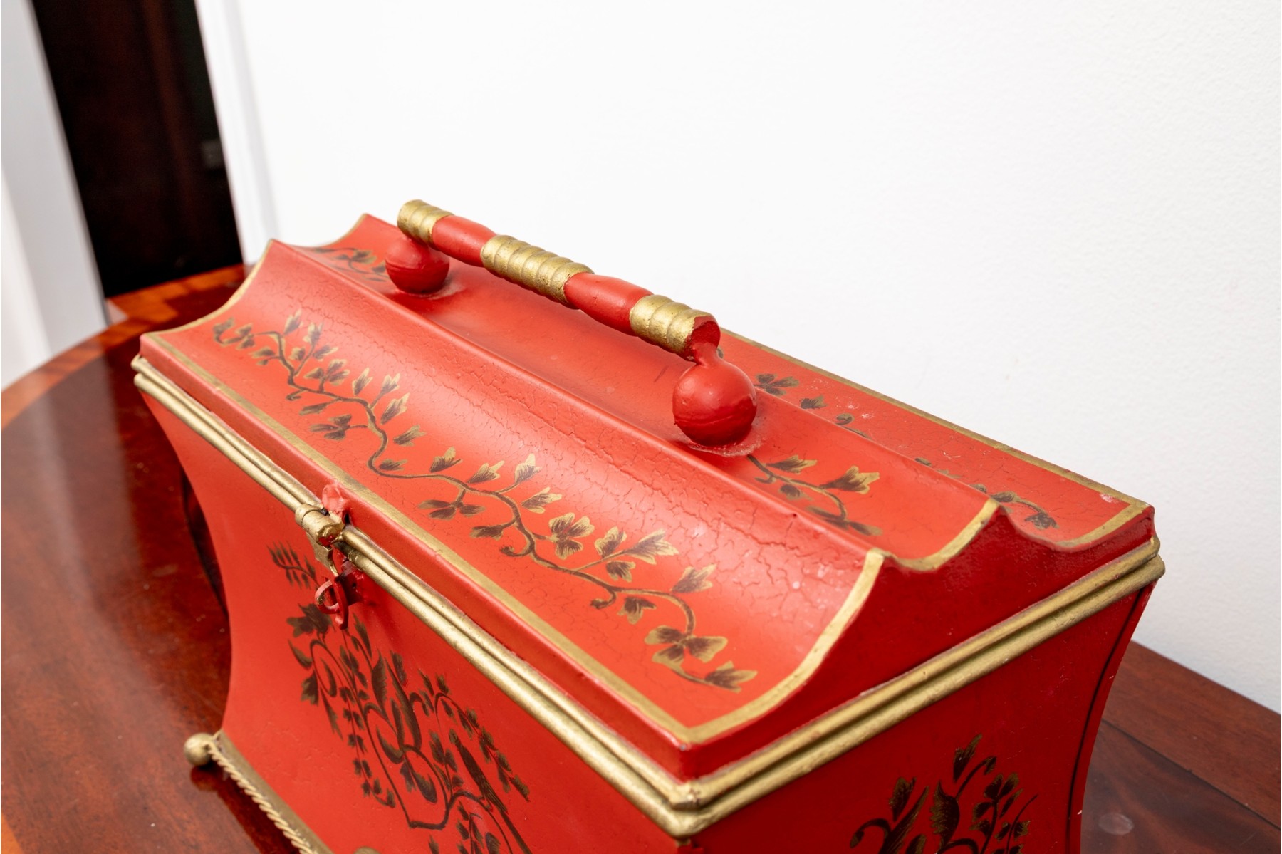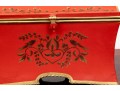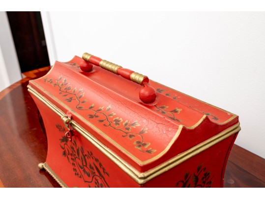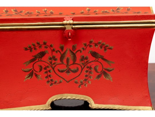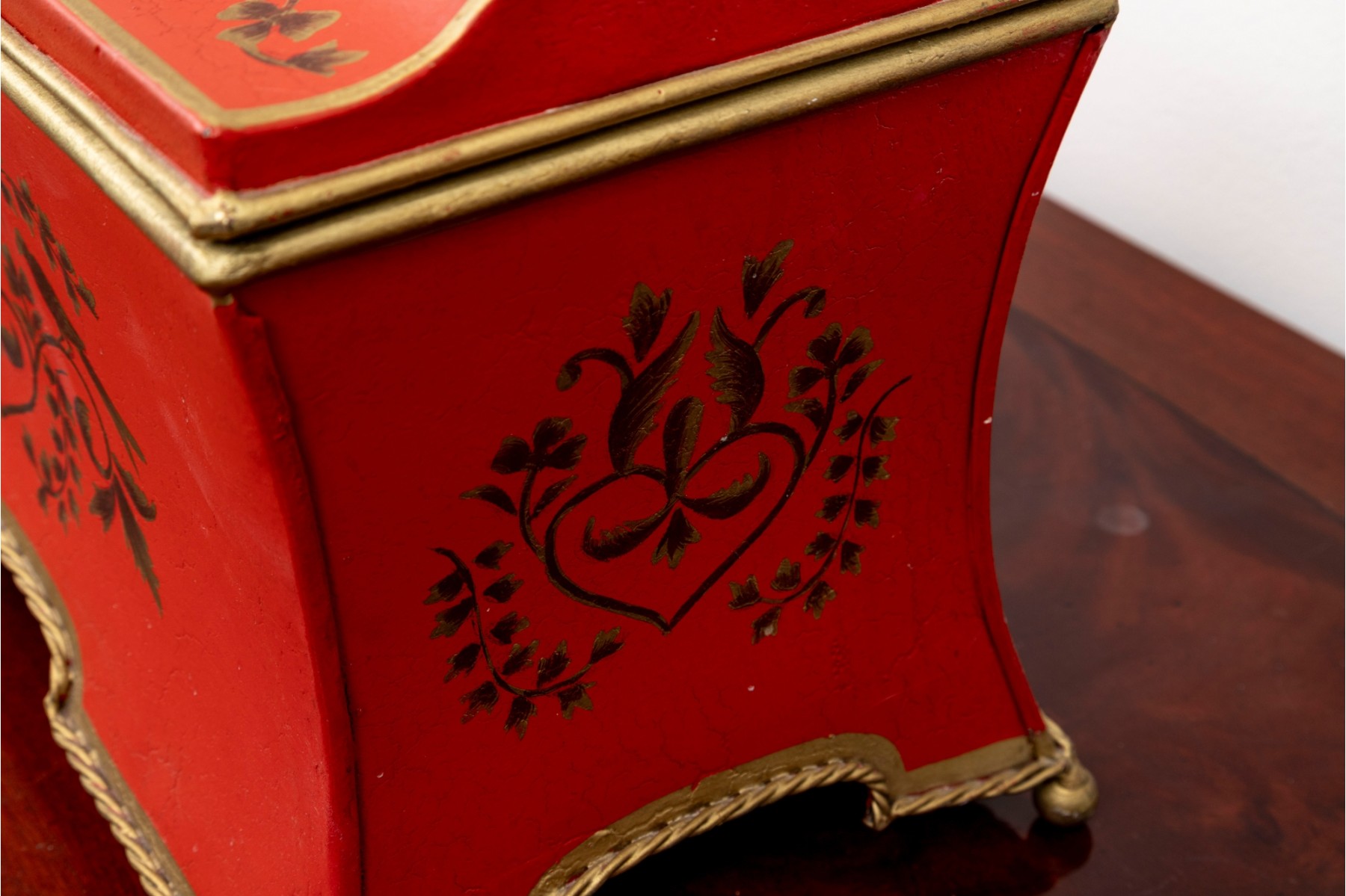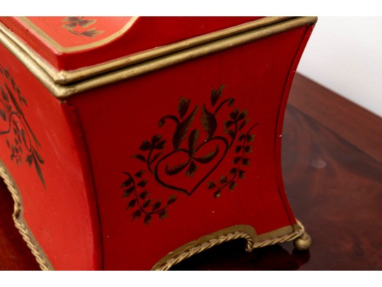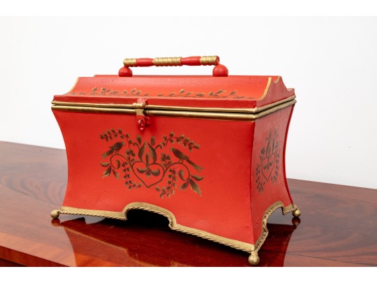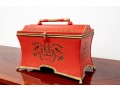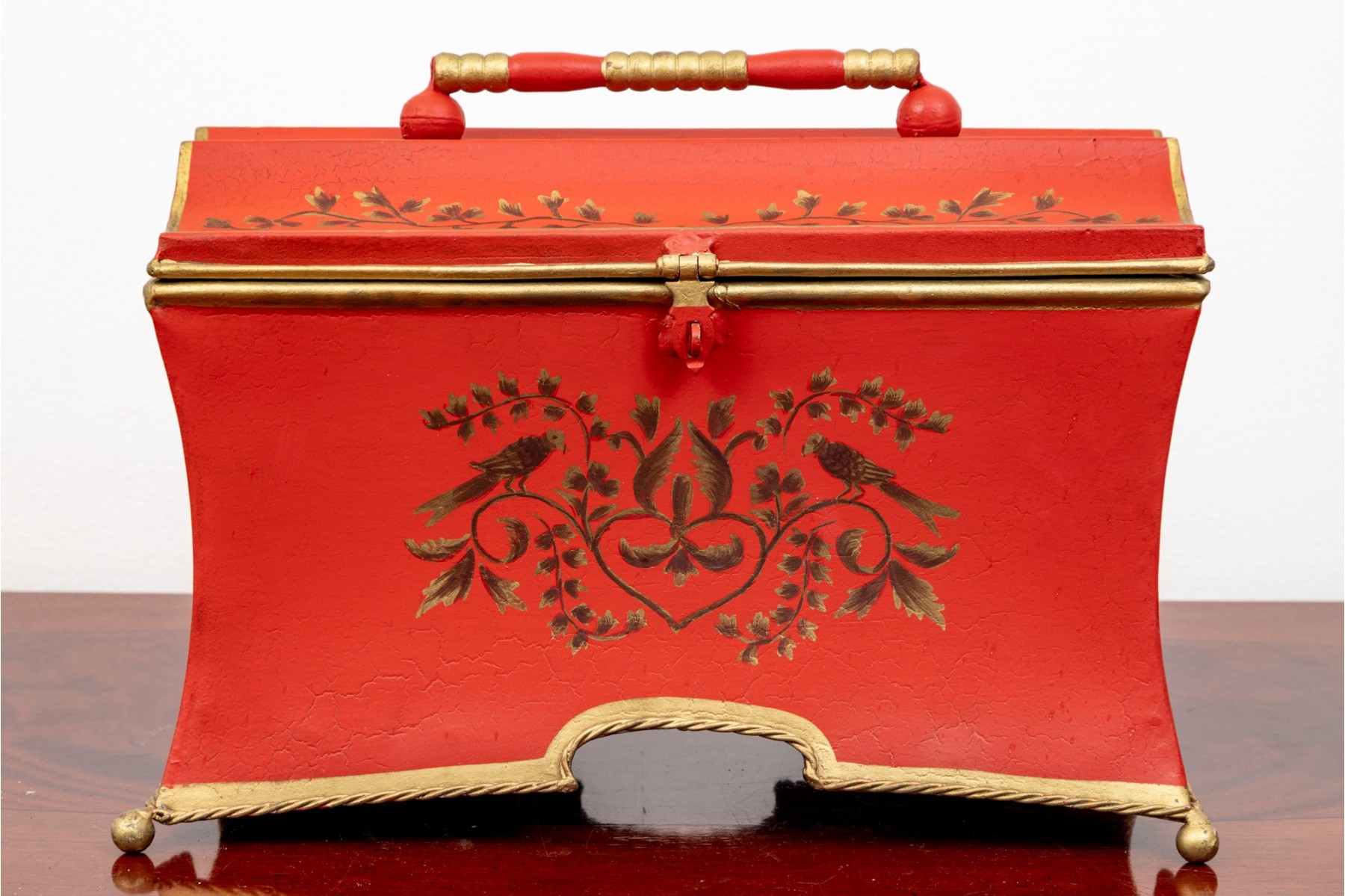 An Indian tole metal box hand-painted with gold embellishments and avian patterns over a solid, brick red background.