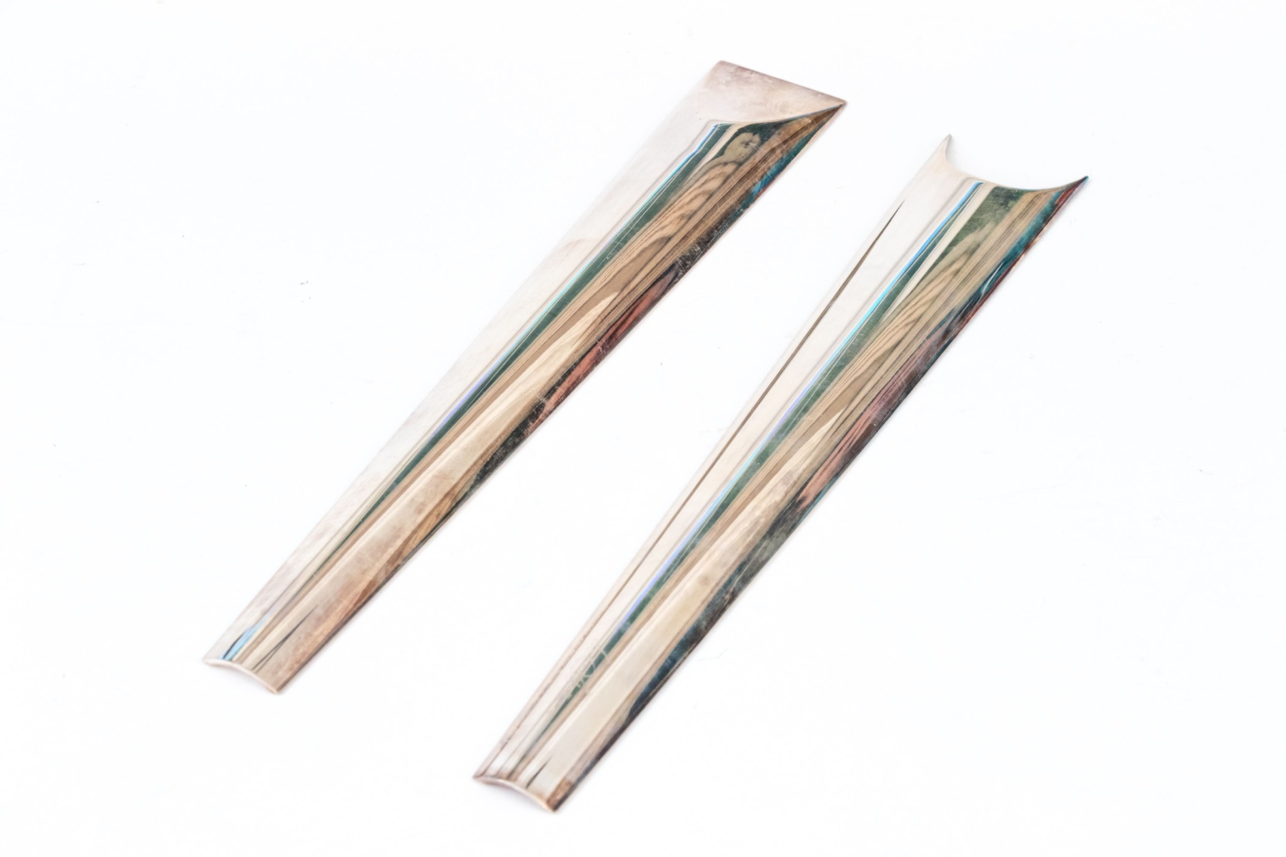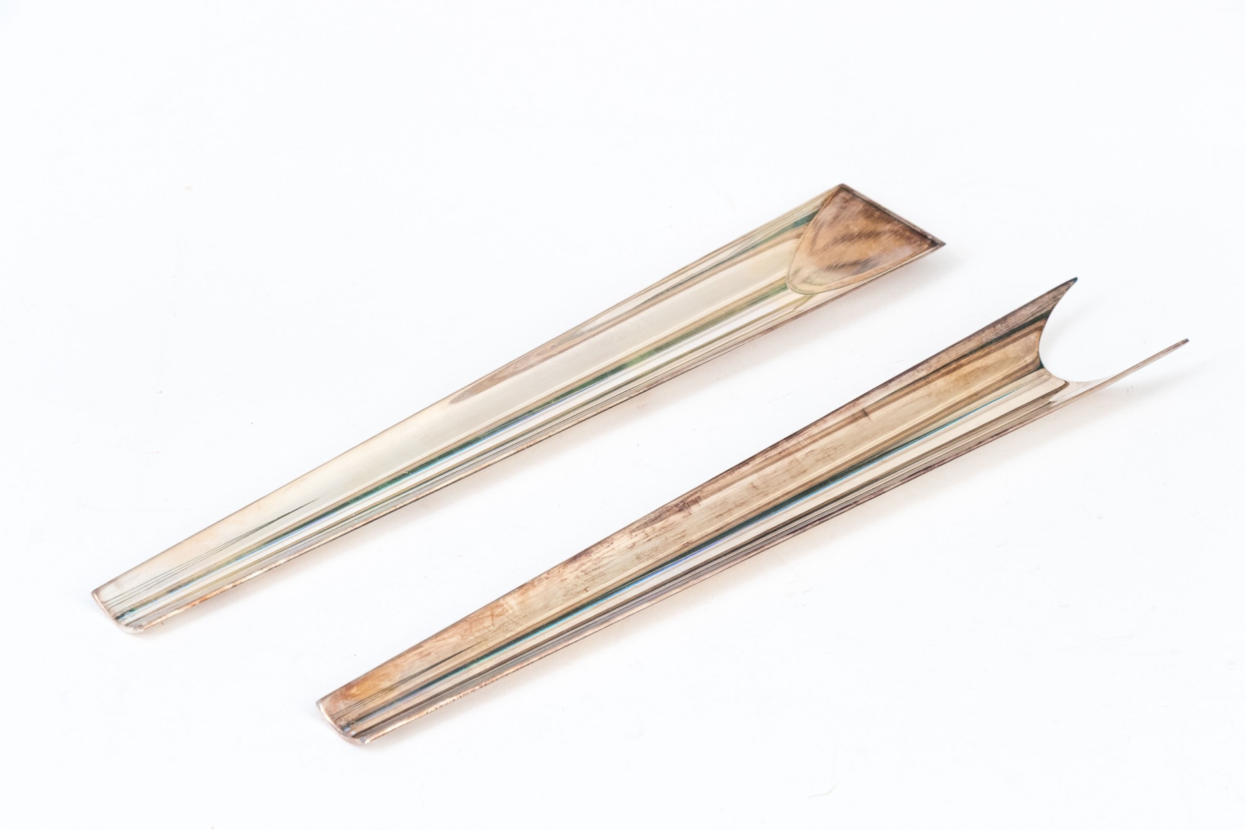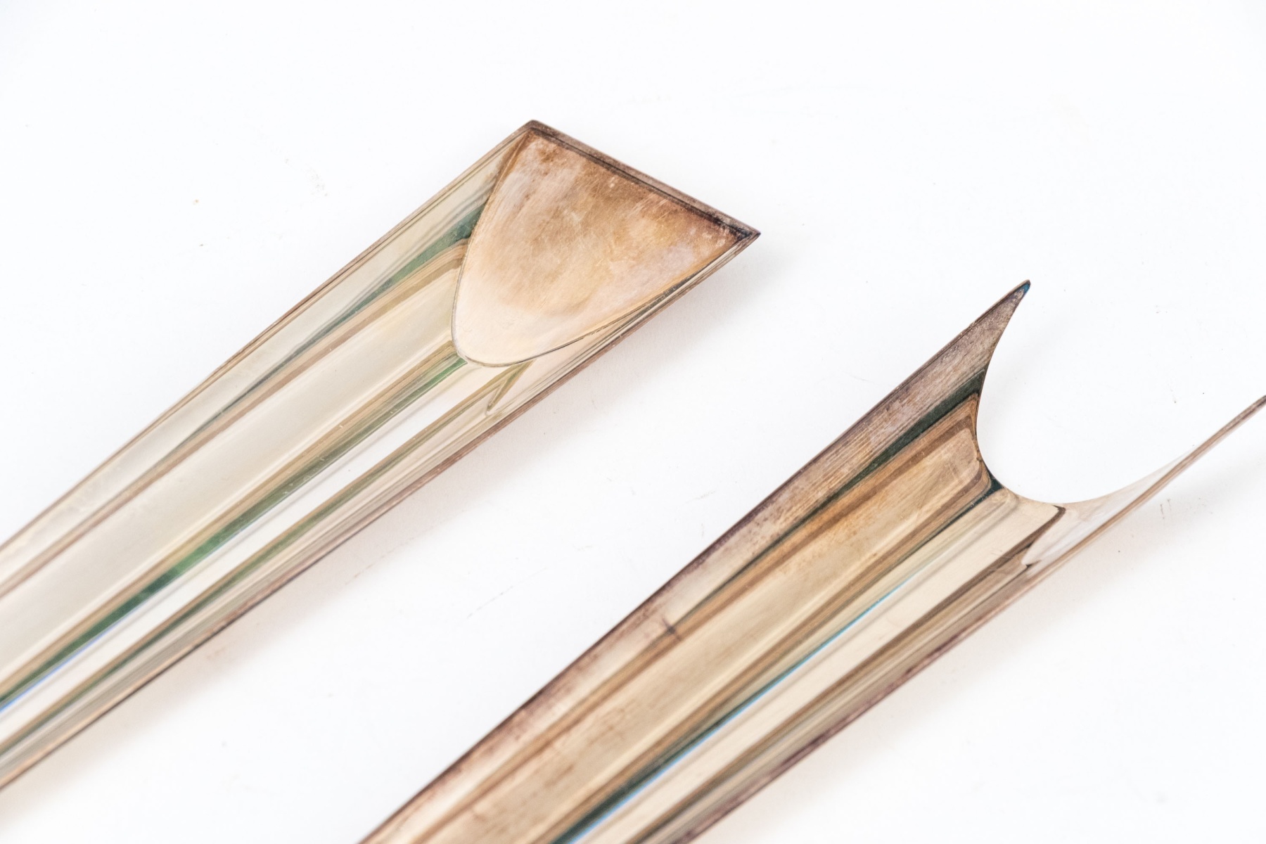 An eye-catching set of vintage Lino Sabattini silverplated salad servers including a two-prong fork and a spoon with dramatic and sleek minimalist forms exemplary of the stylish mid-to-late 20th century aesthetic. Marked near the ends of the handles Union A/16 Collezione Sabattini Bregnano Italy.