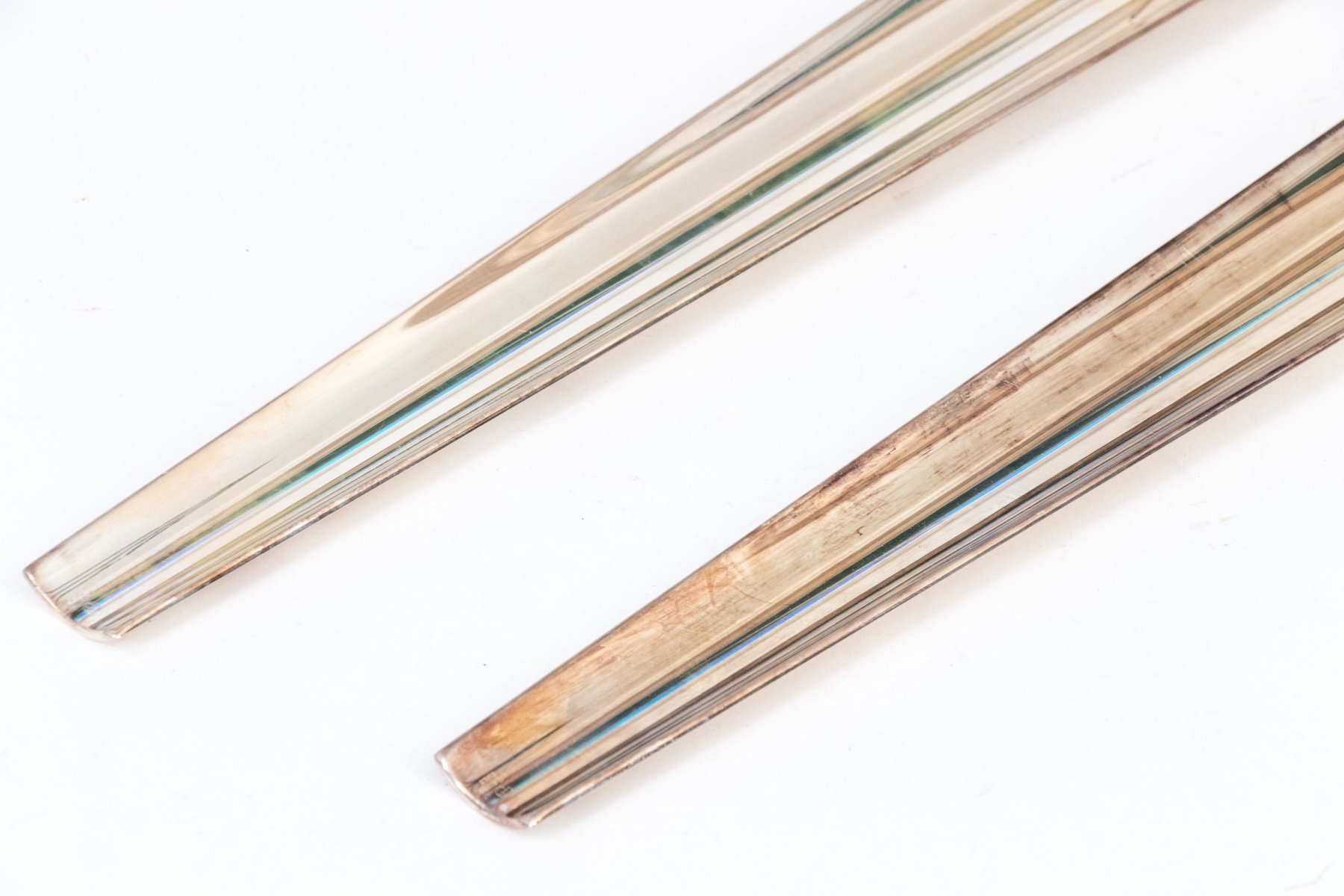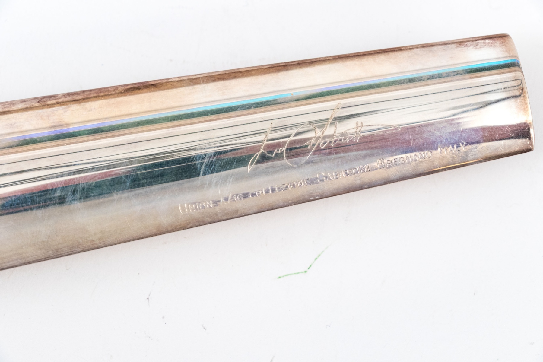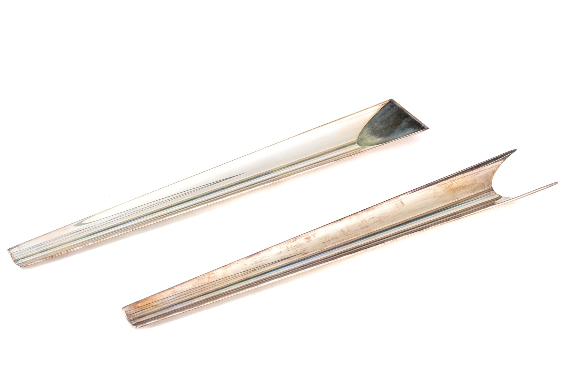 An eye-catching set of vintage Lino Sabattini silverplated salad servers including a two-prong fork and a spoon with dramatic and sleek minimalist forms exemplary of the stylish mid-to-late 20th century aesthetic. Marked near the ends of the handles Union A/16 Collezione Sabattini Bregnano Italy.