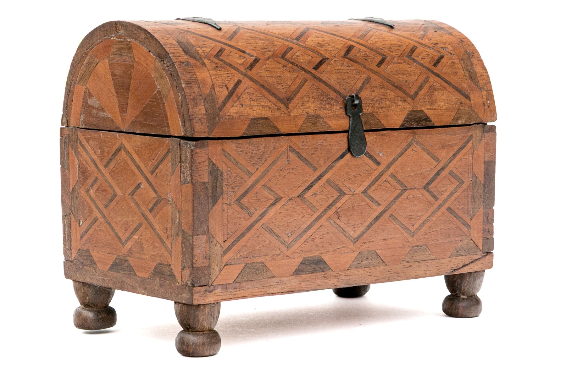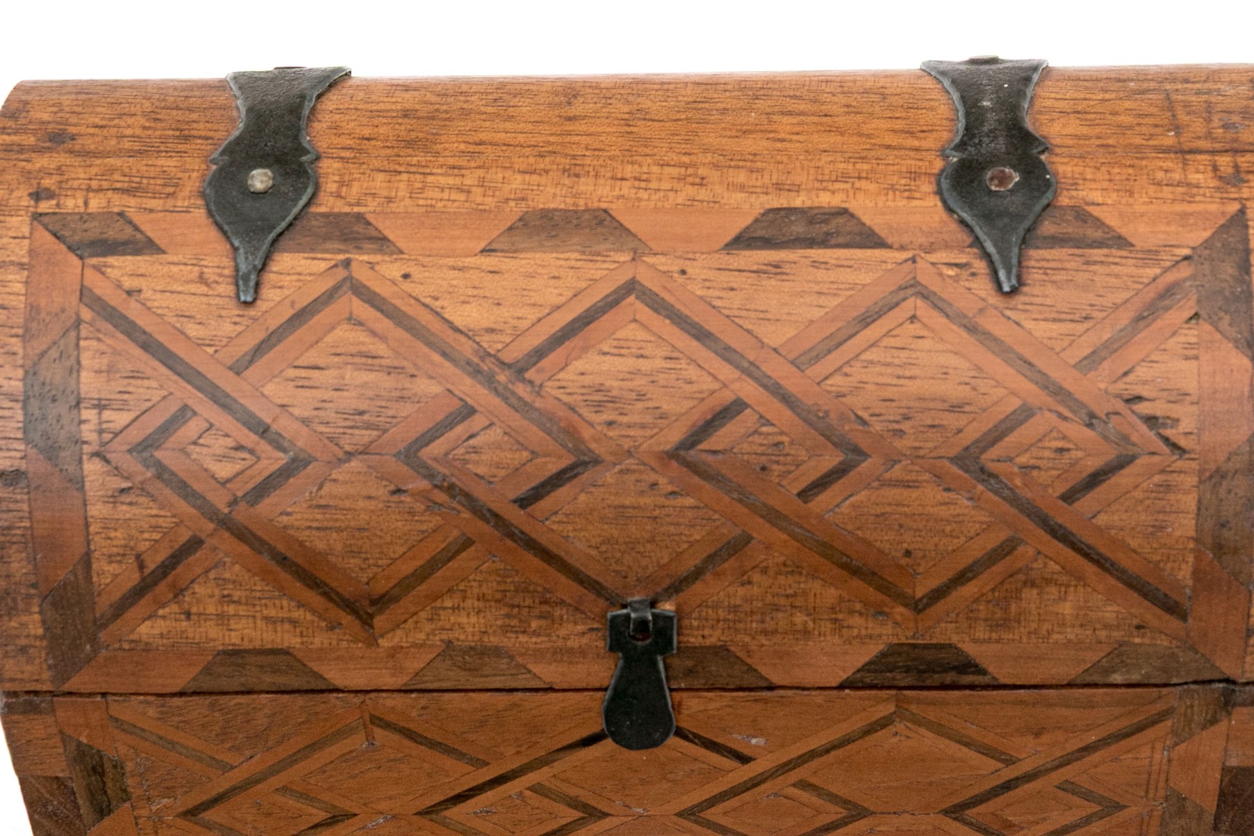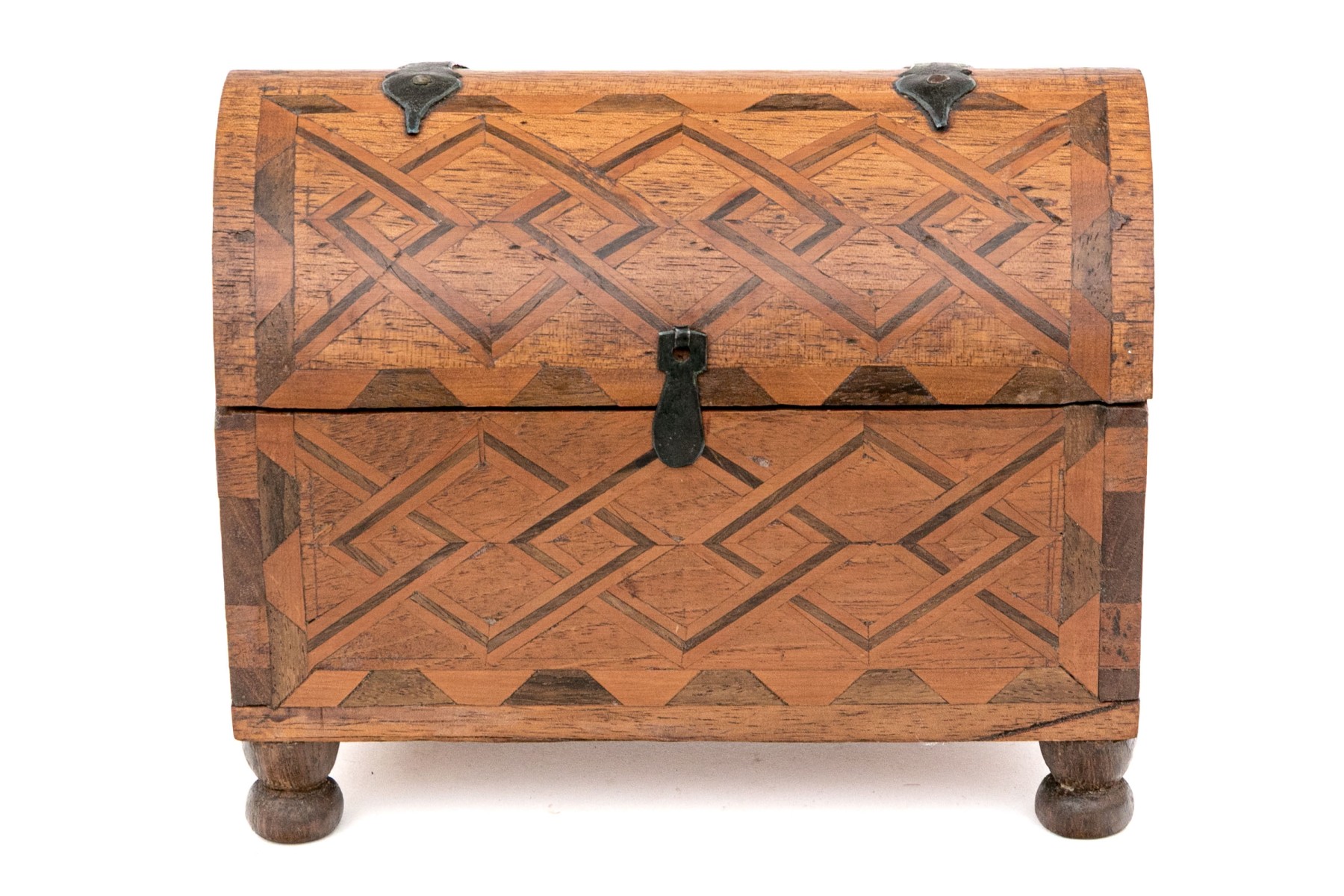 A delightful antique Italian jewelry casket with a classic domed lid over a rectangular body detailed with gorgeous inlaid marquetry showcasing interconnected diamond motifs in light and dark brown hues. The casket is raised on simply detailed feet and adorned with black metal brackets along the top. The hinged lid opens to a cream and red floral lattice patterned paper liner within.