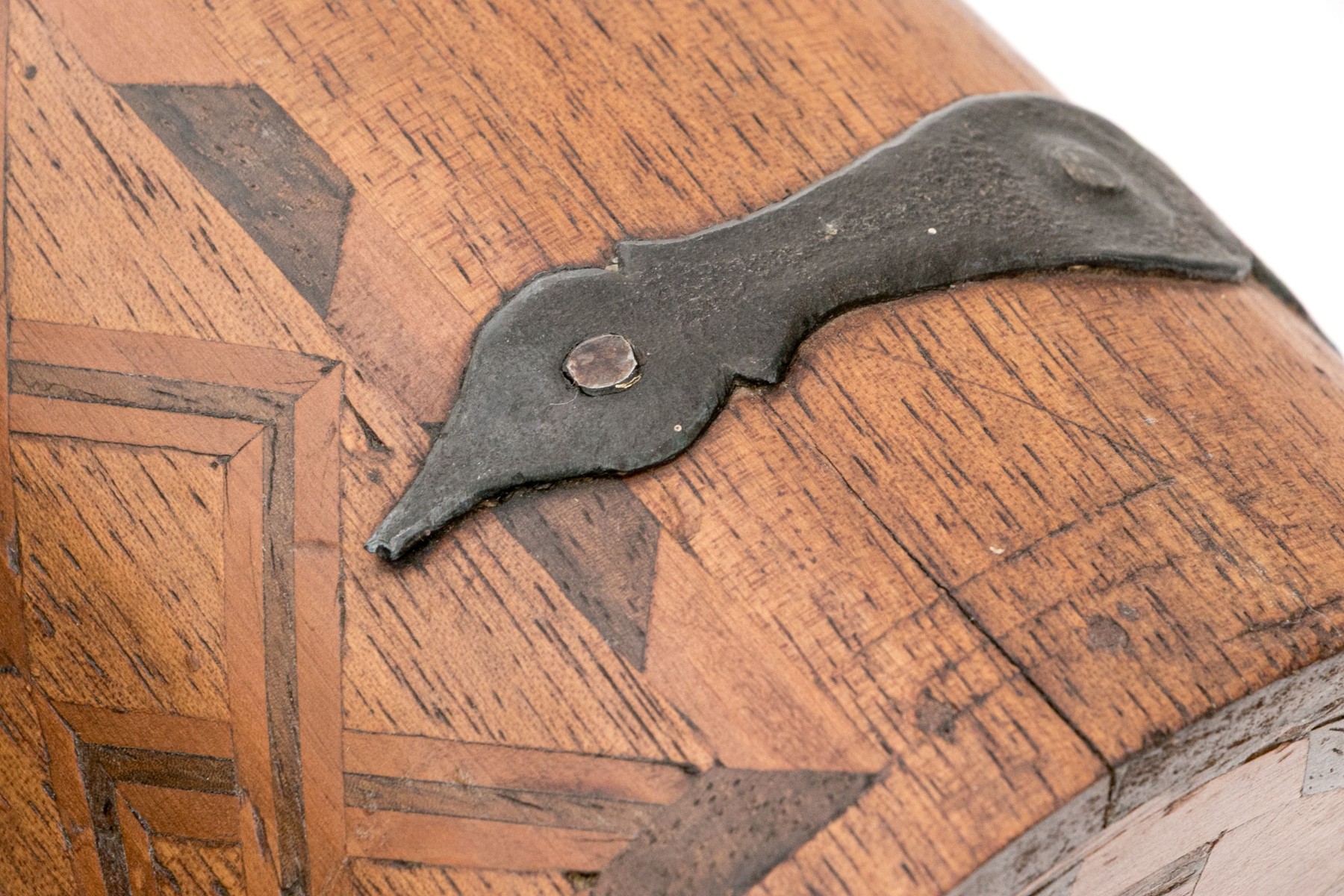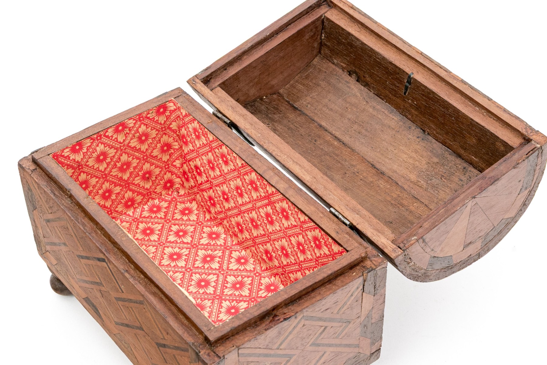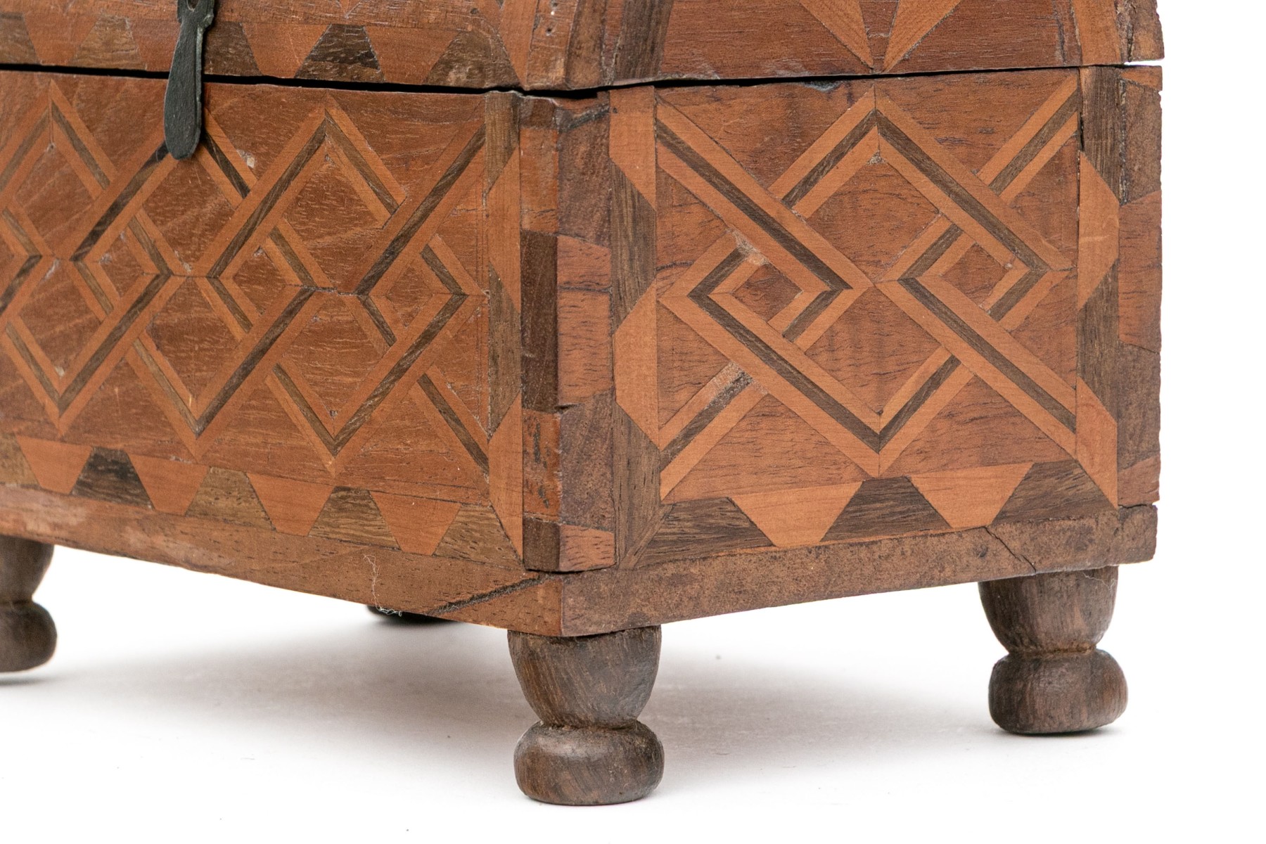 A delightful antique Italian jewelry casket with a classic domed lid over a rectangular body detailed with gorgeous inlaid marquetry showcasing interconnected diamond motifs in light and dark brown hues. The casket is raised on simply detailed feet and adorned with black metal brackets along the top. The hinged lid opens to a cream and red floral lattice patterned paper liner within.