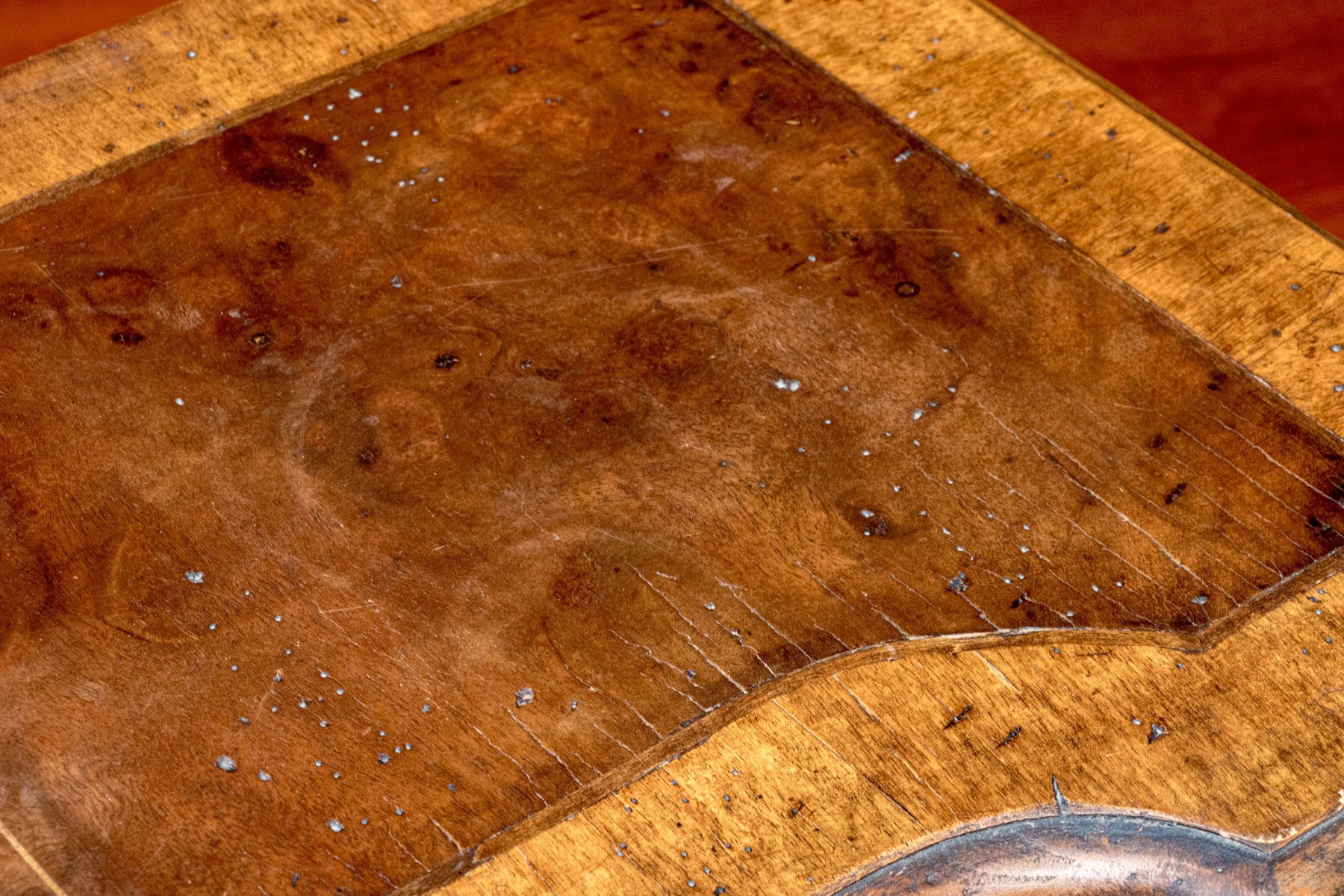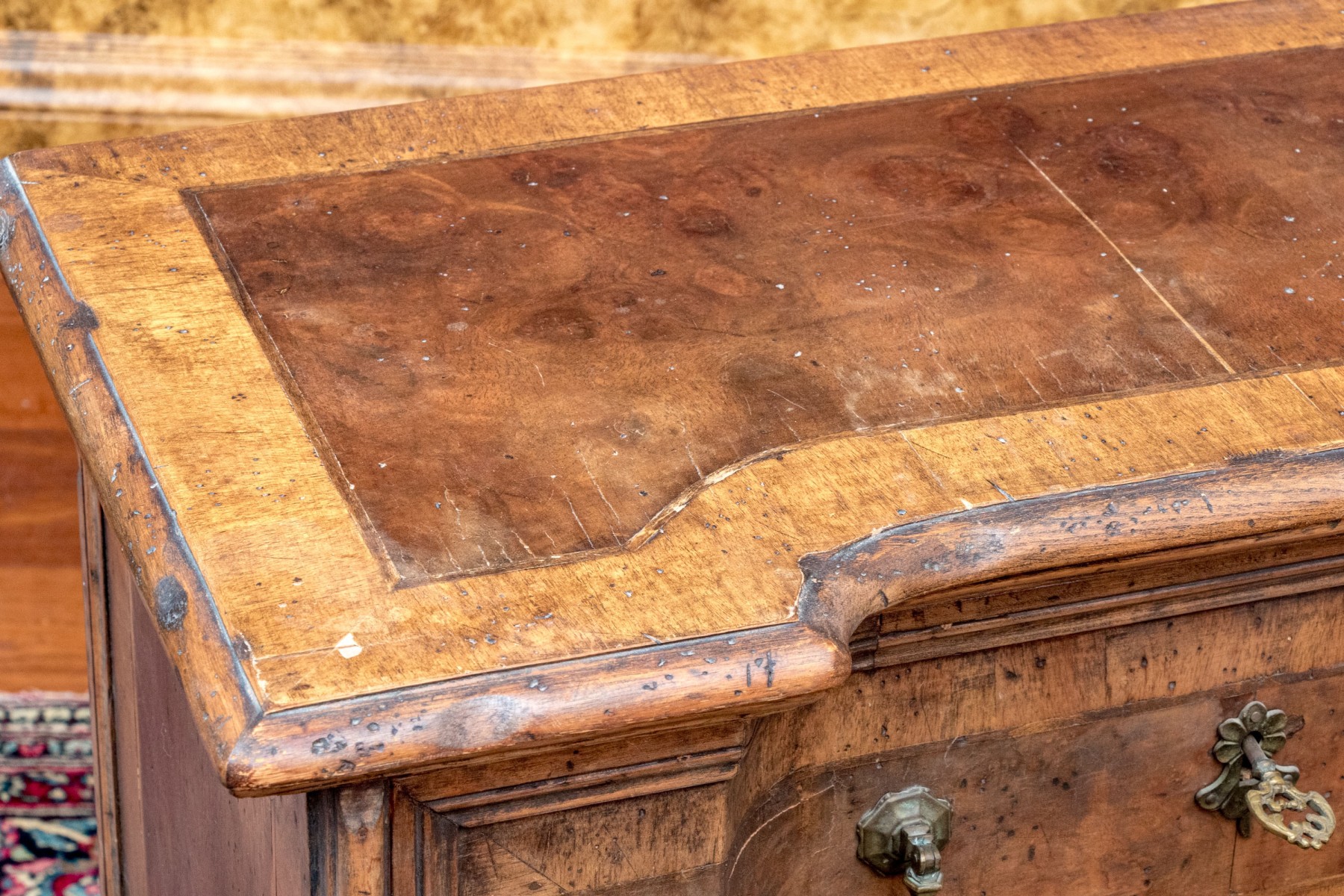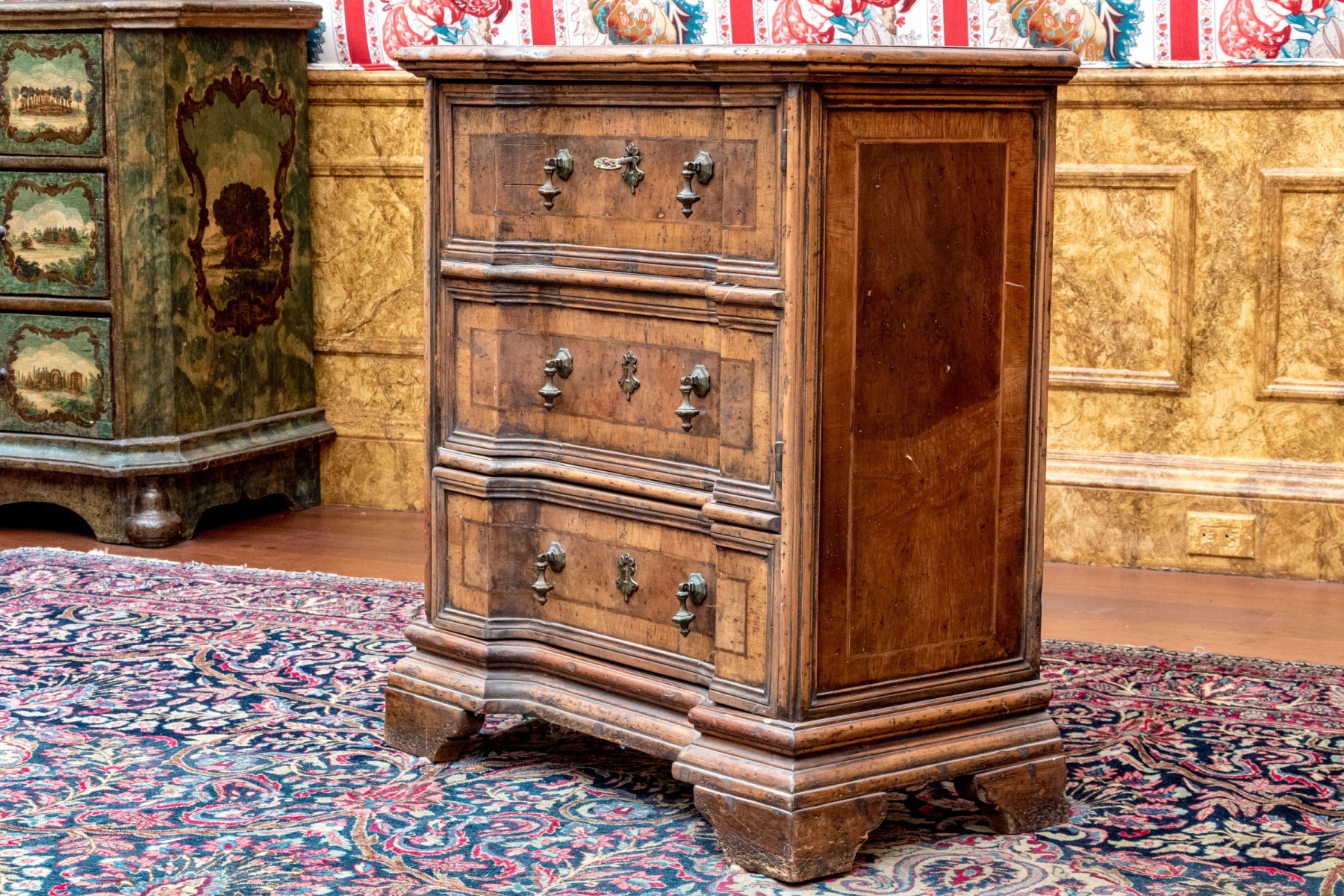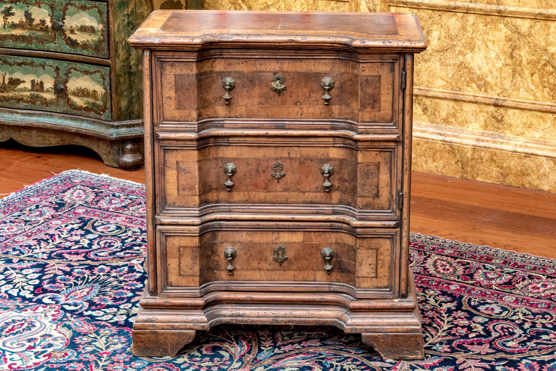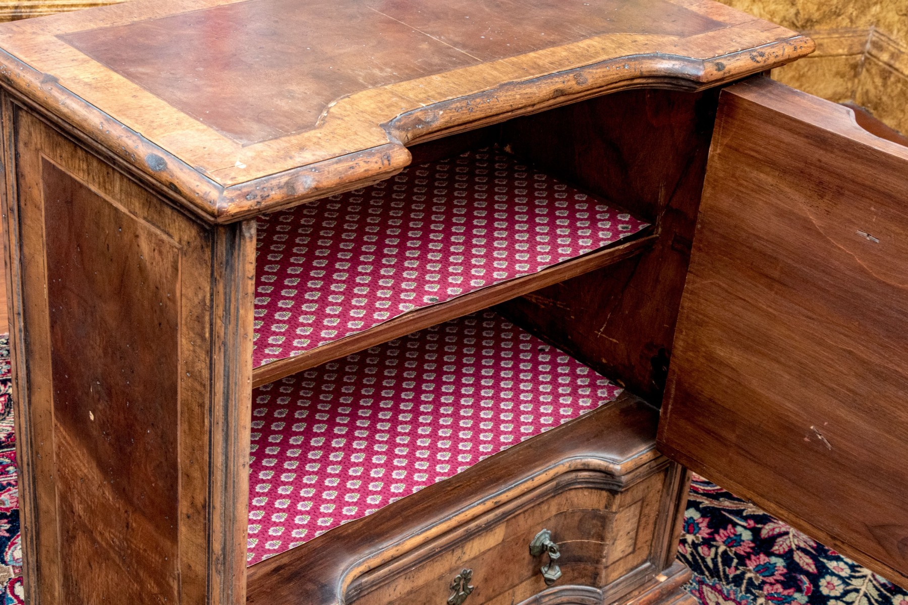 A delightful vintage Italian cabinet or bedside table well constructed in walnut with darker brown center panels and lighter brown banded edges. The chest features a shapely bracketed design across the front, creating eye-catching ridges down a single cabinet door with a facade of two drawers opening to a shelved interior with patterned red liners, leading to a single drawer below.