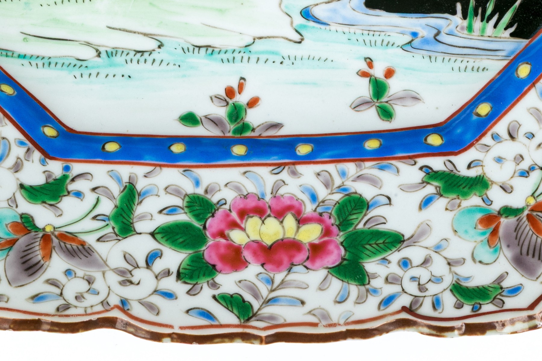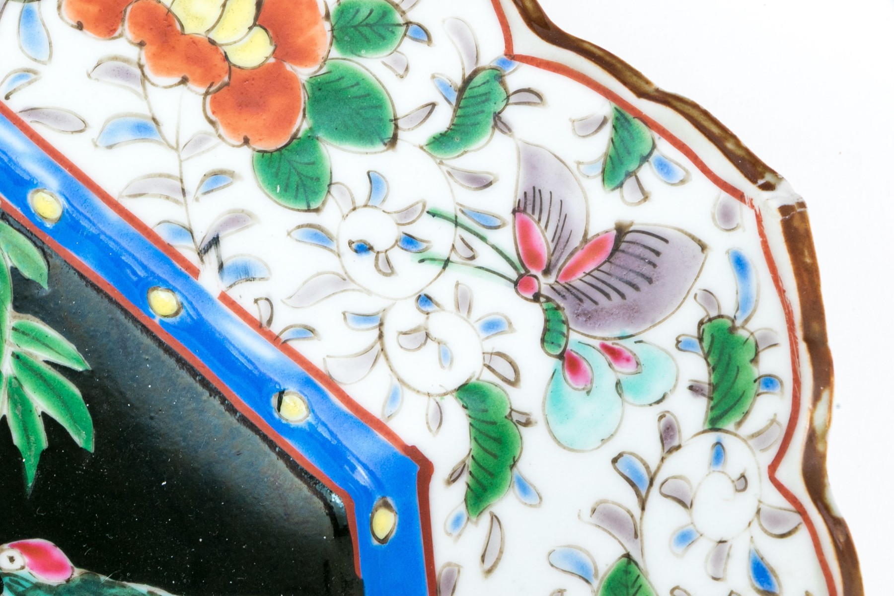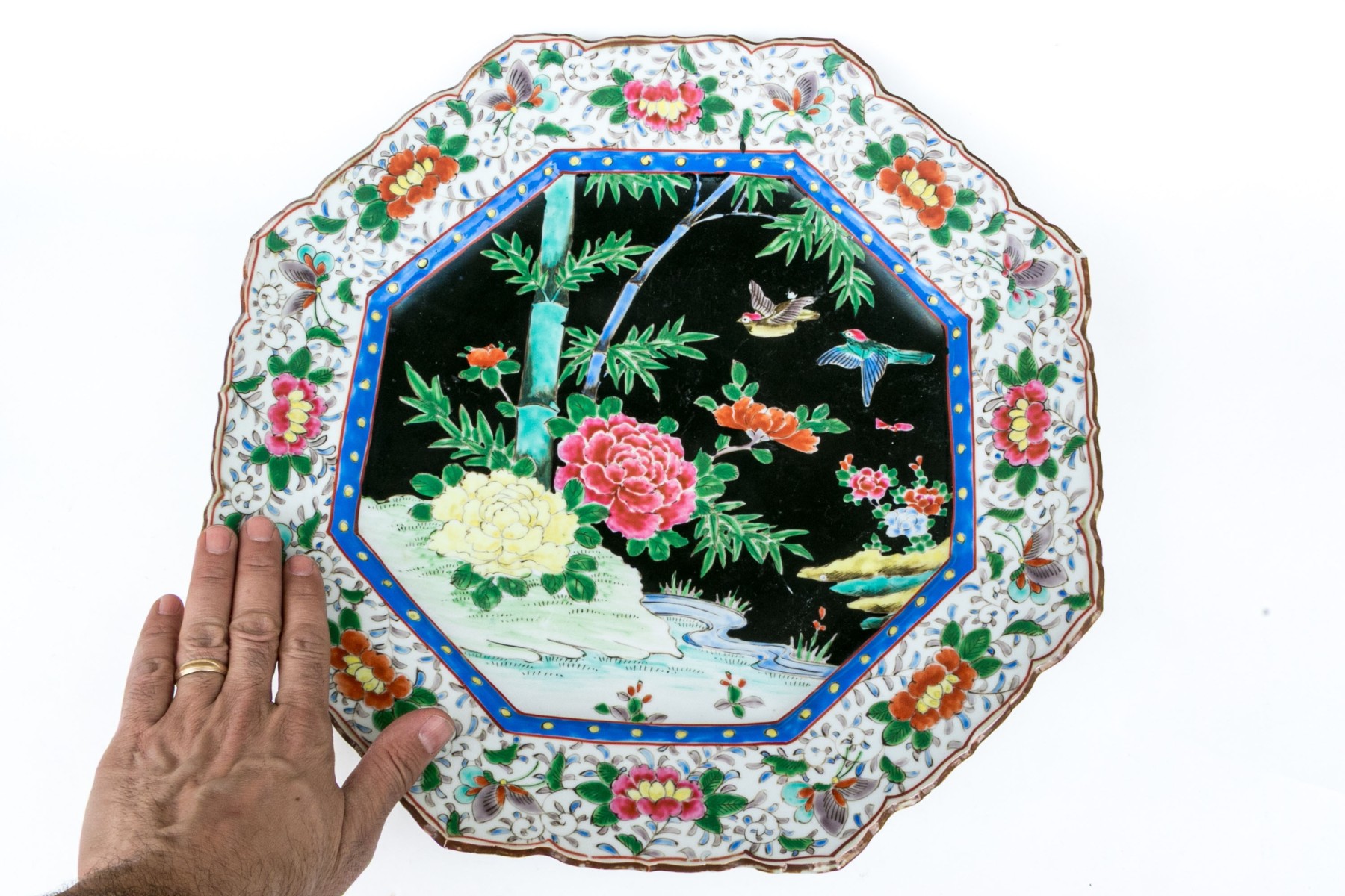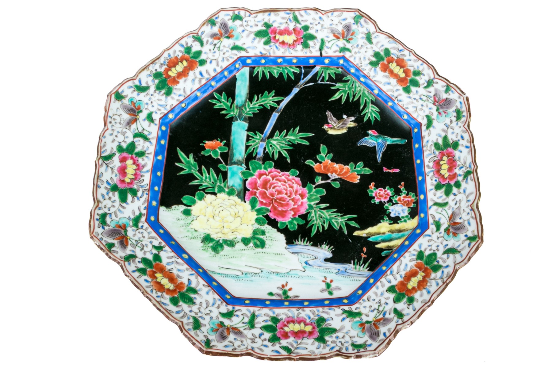 A wonderful Tetsuka & Co. ceramic charger with an octagonal form, beautifully decorated with a famille noire center scene of vibrant flowers, bamboo, and birds against a black ground. The scene is surrounded by a blue border and a white scalloped rim decorated by flowers and moths, creating an eye-catching and ornate appearance. Marked underfoot.