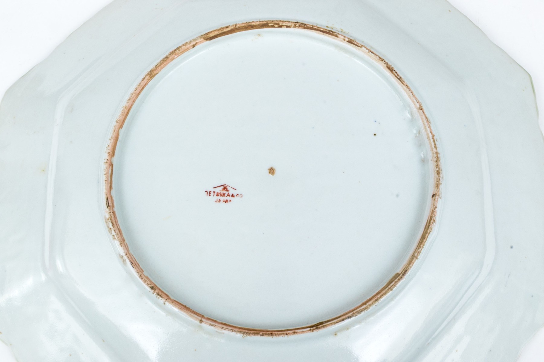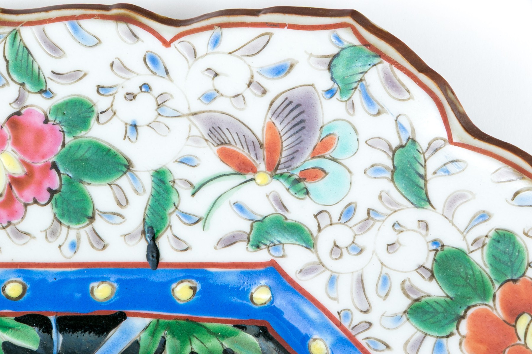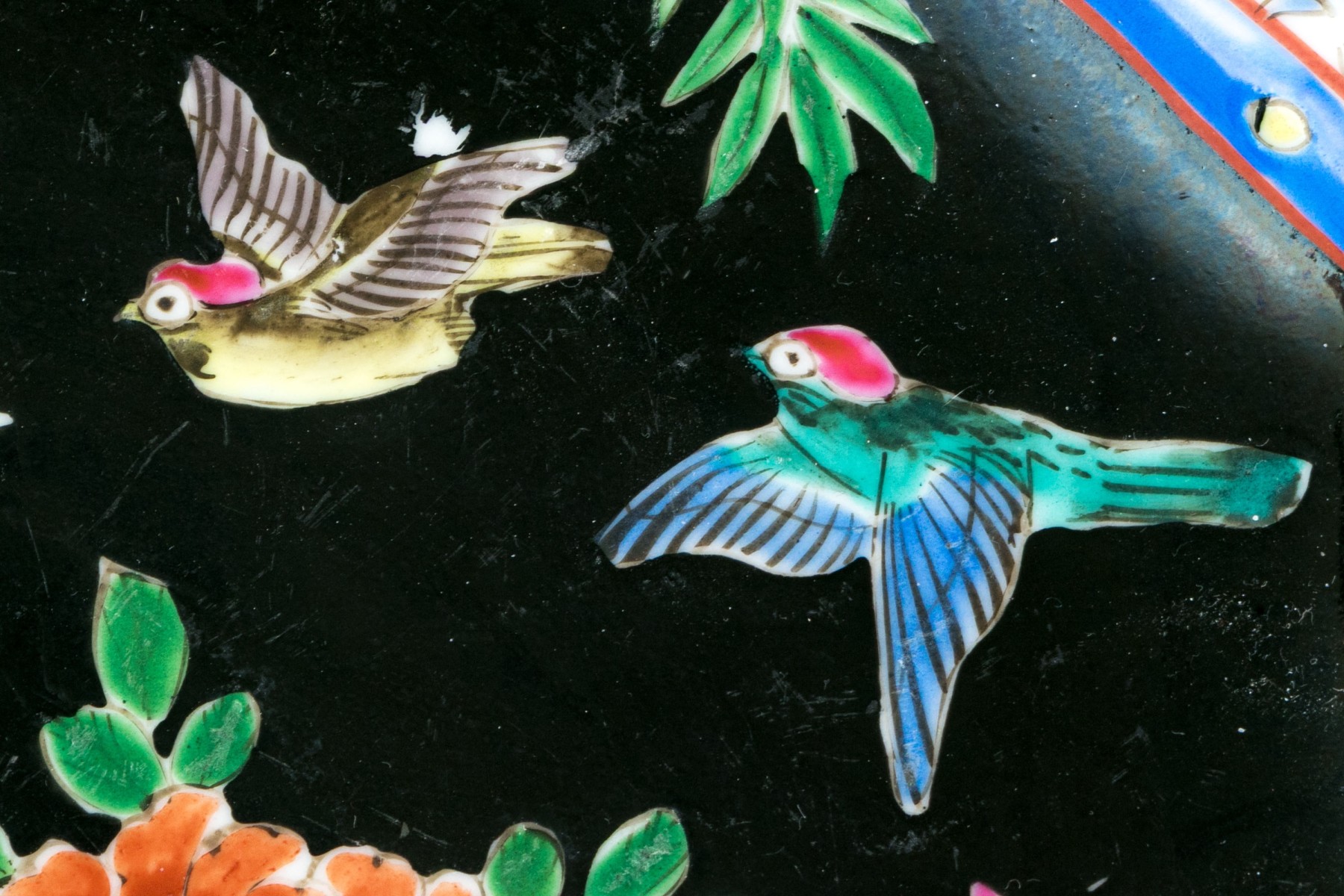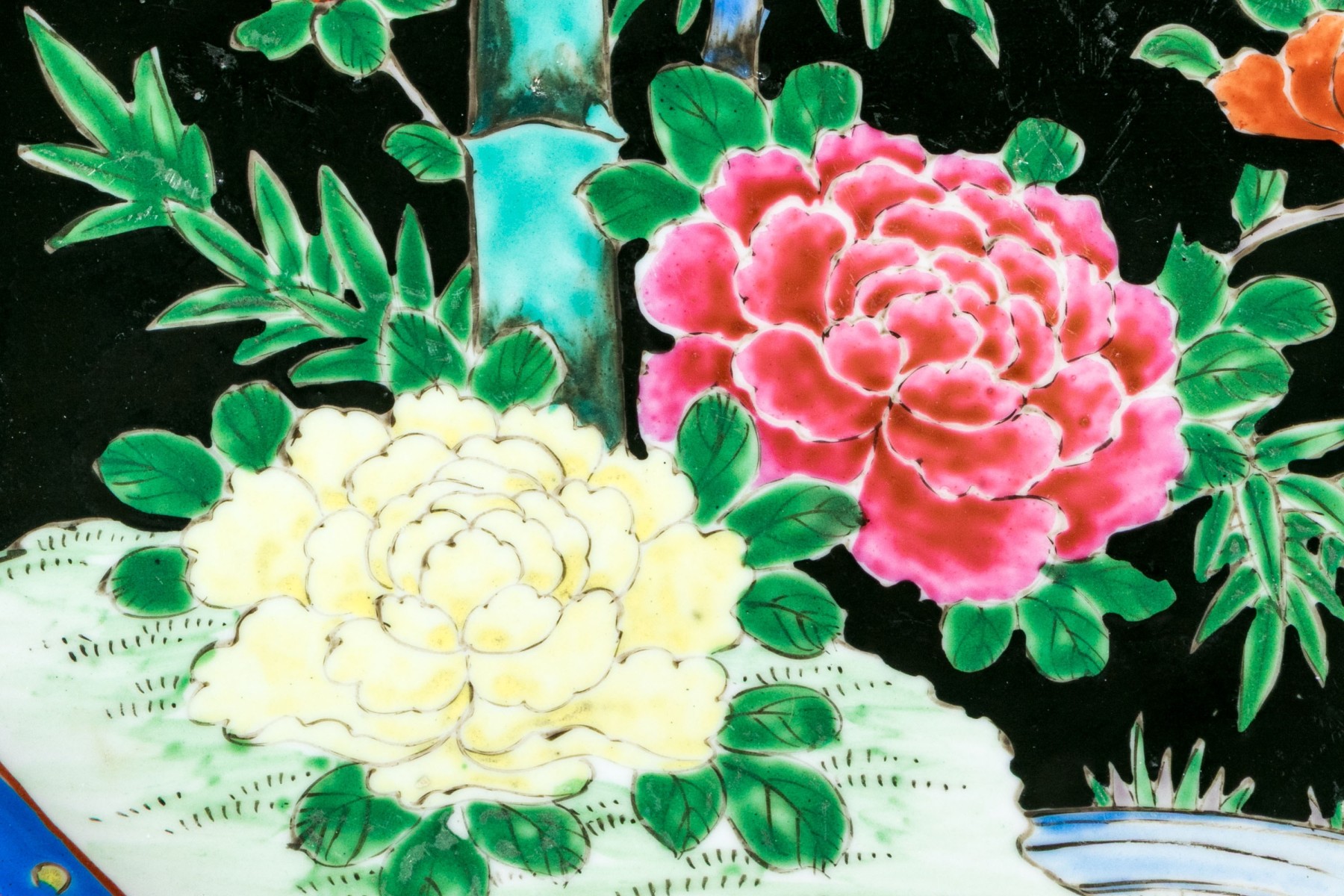 A wonderful Tetsuka & Co. ceramic charger with an octagonal form, beautifully decorated with a famille noire center scene of vibrant flowers, bamboo, and birds against a black ground. The scene is surrounded by a blue border and a white scalloped rim decorated by flowers and moths, creating an eye-catching and ornate appearance. Marked underfoot.