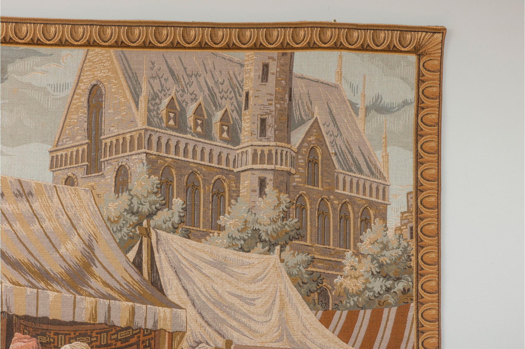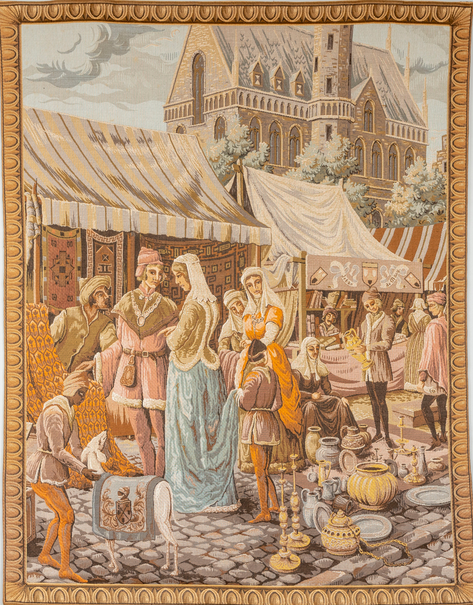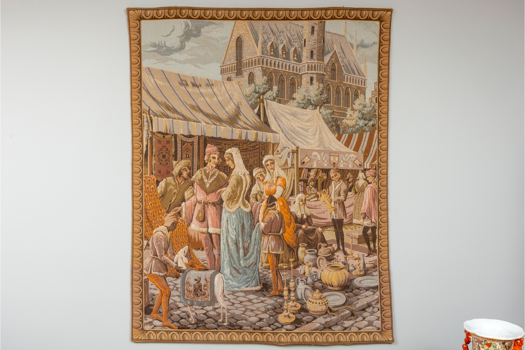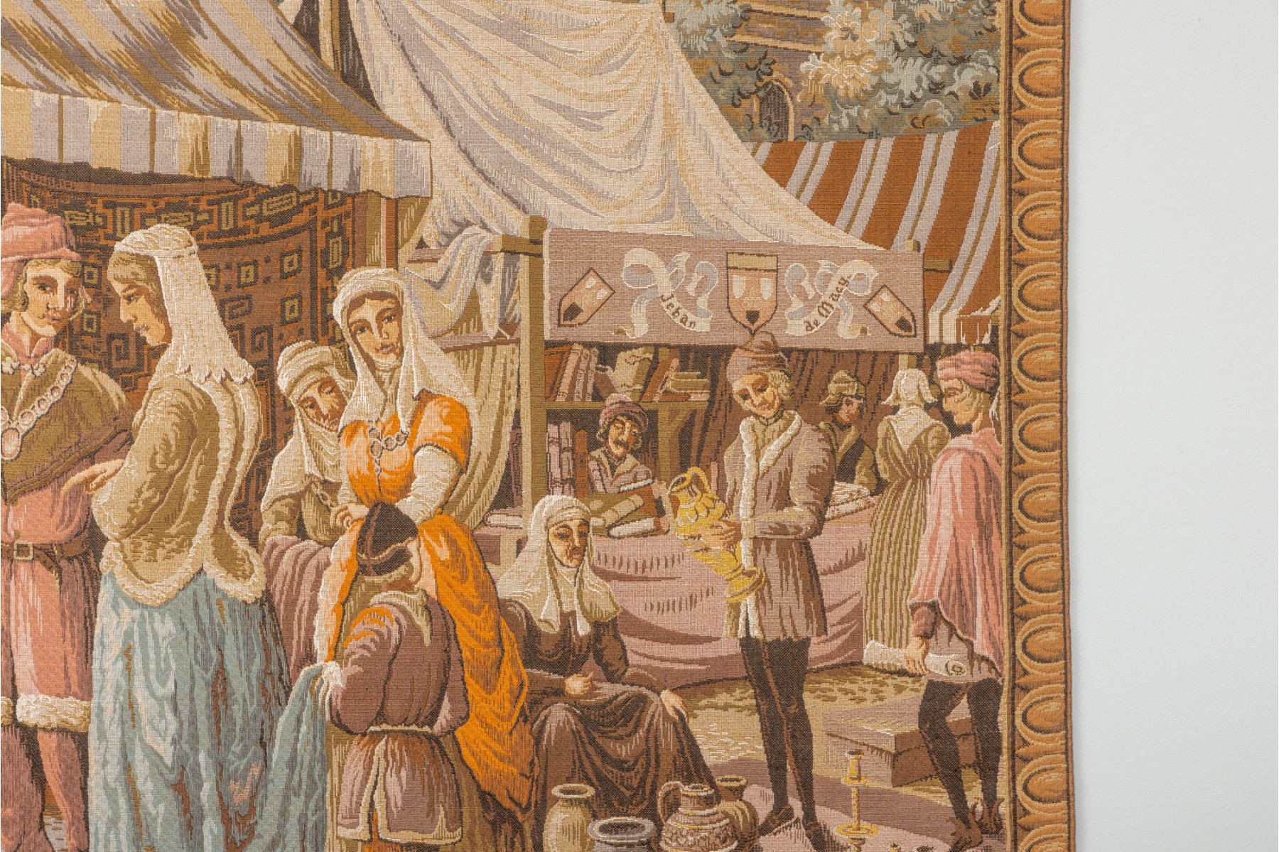 Vintage "Jeban de Macy" wall tapestry depicting a medieval market scene — likely French or Belgium. Machine woven in wool. Fully lined with velvet edging.