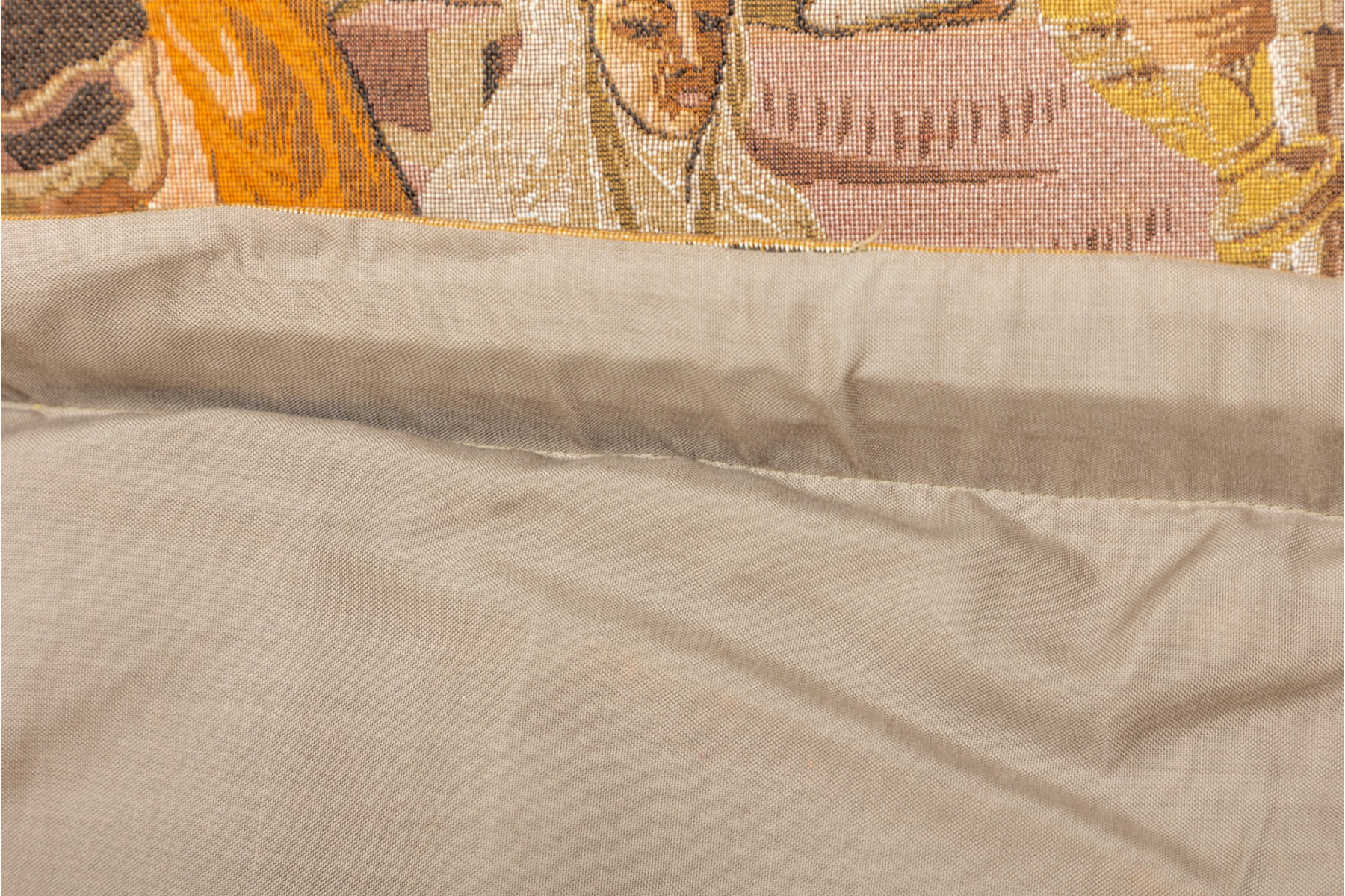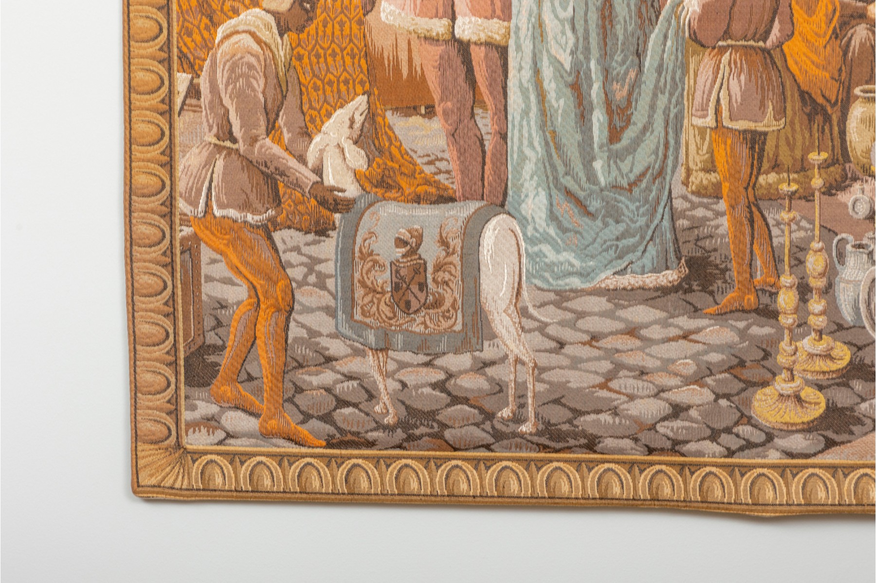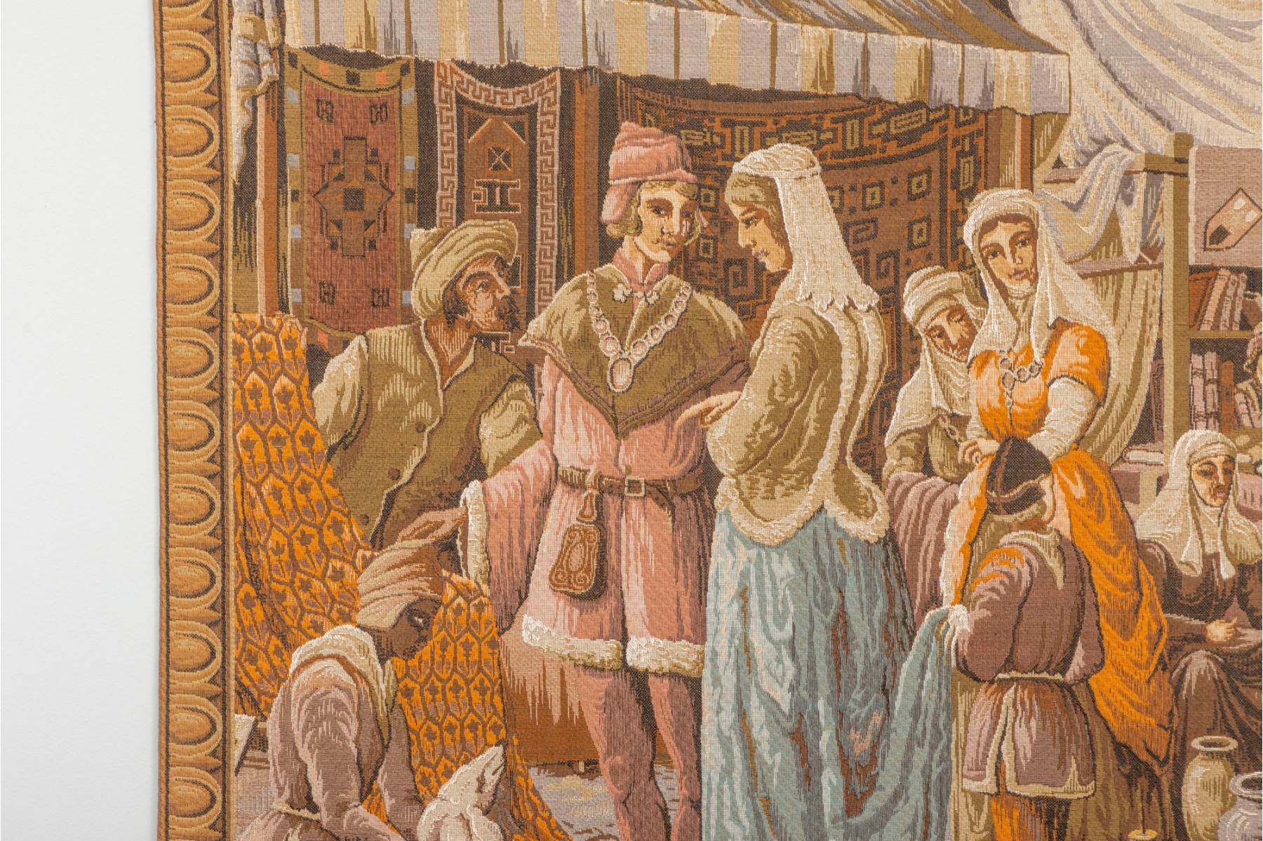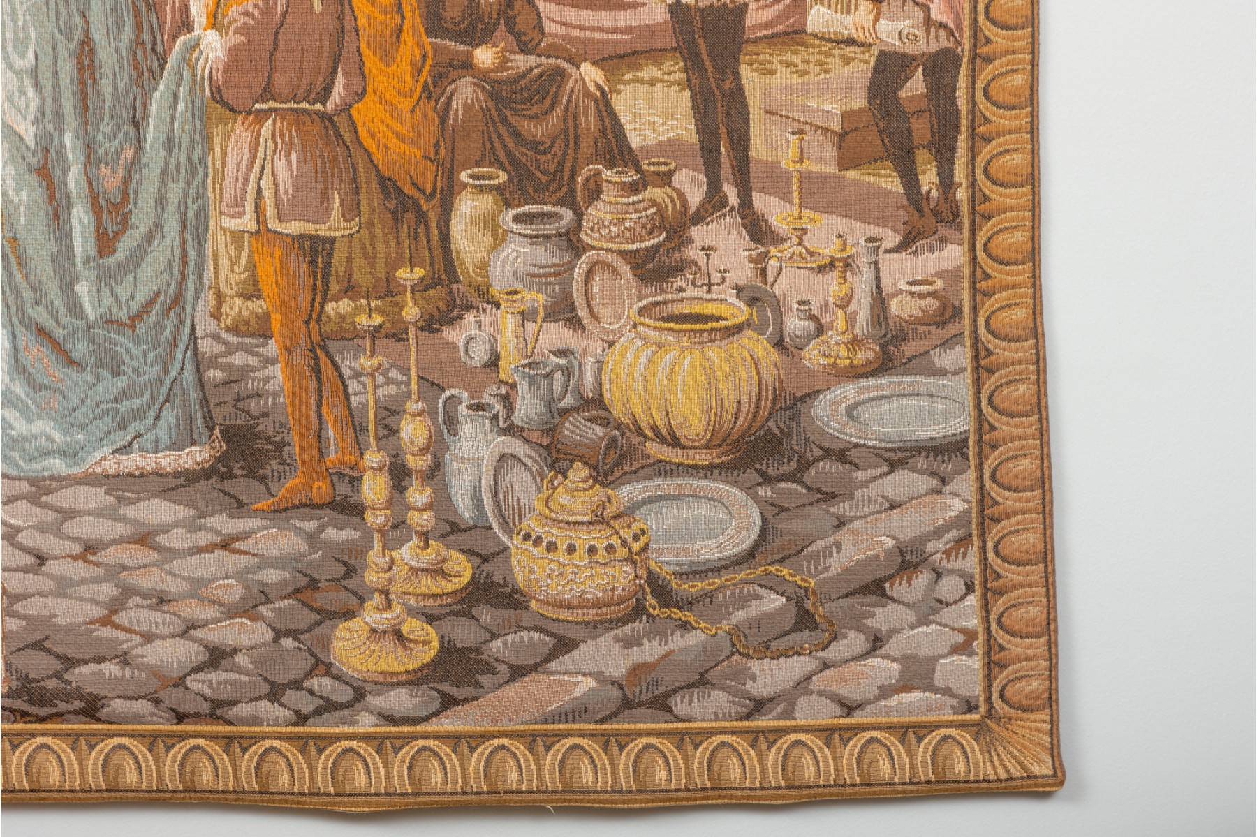 Vintage "Jeban de Macy" wall tapestry depicting a medieval market scene — likely French or Belgium. Machine woven in wool. Fully lined with velvet edging.