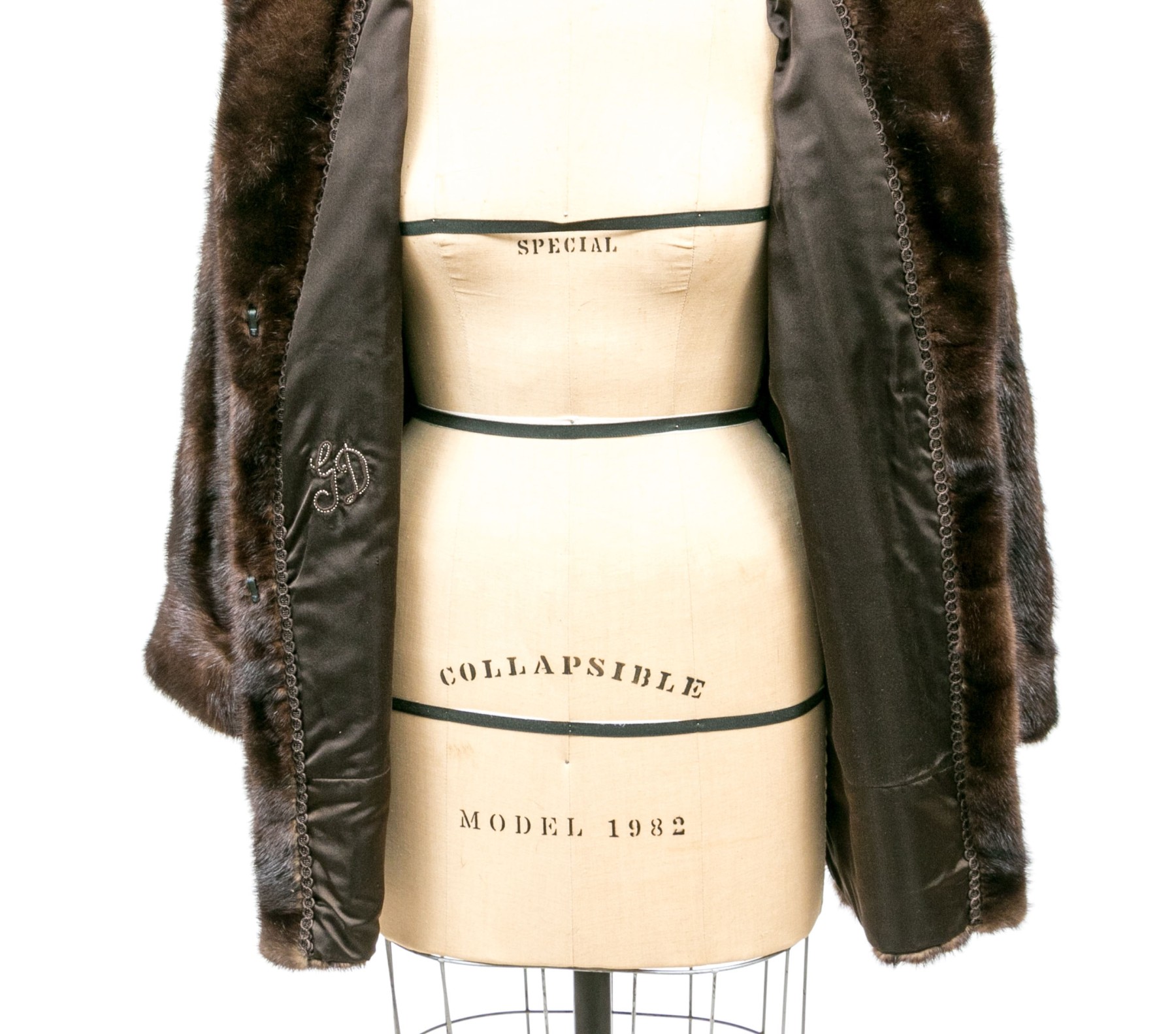 With a shawl collar and slash pockets. A button and loop closure at the collar and two hooks and eye closures down the front. Silk lined.