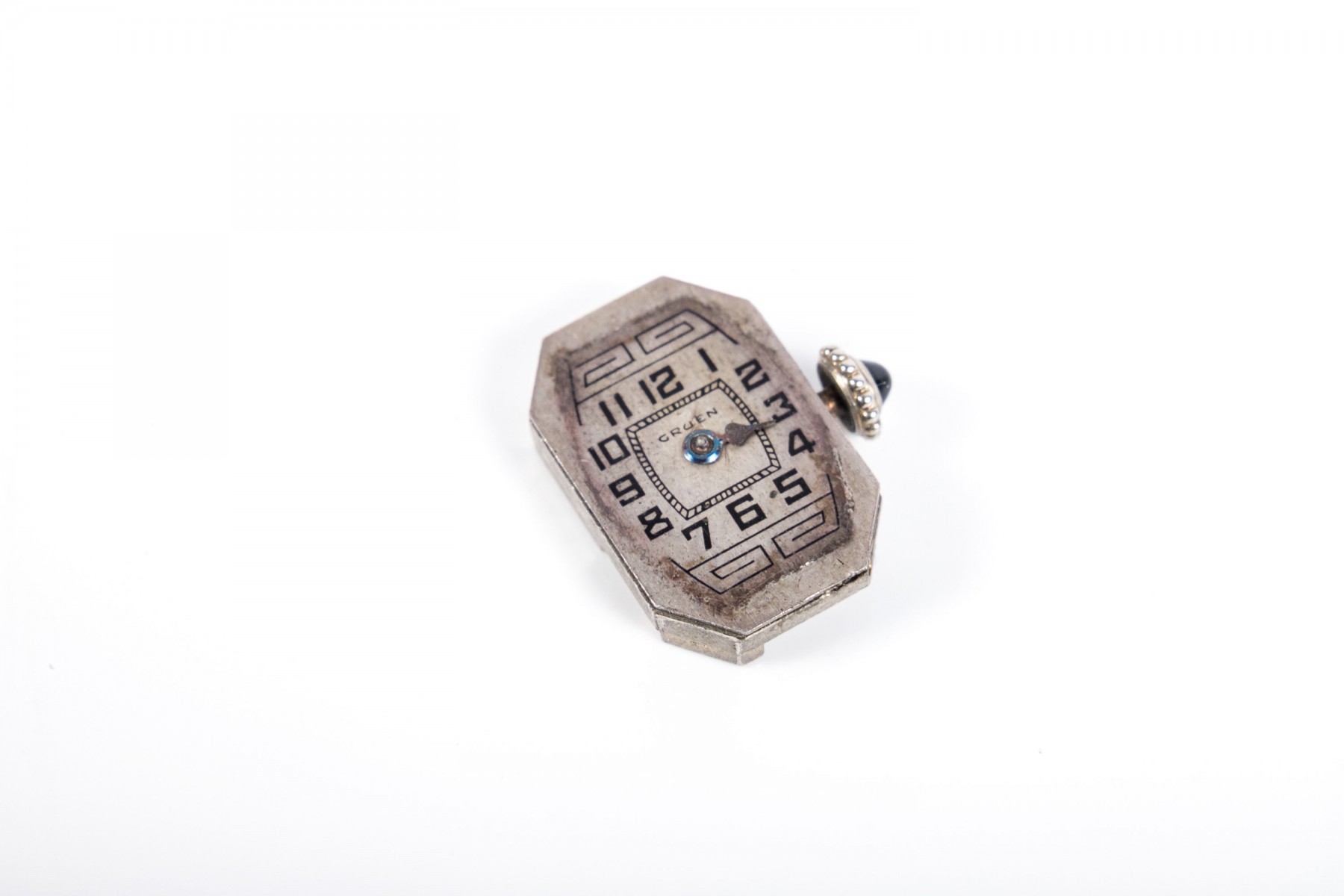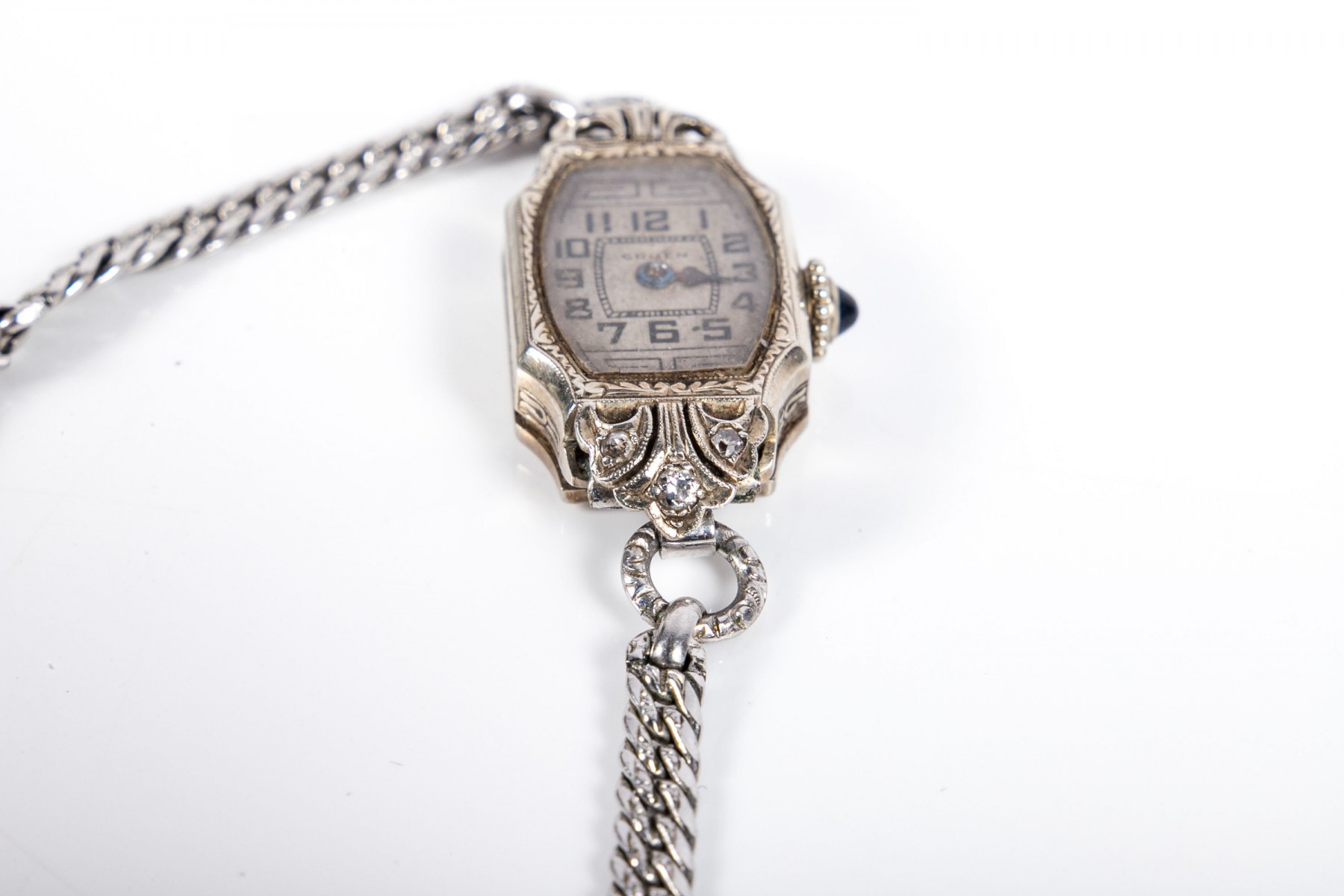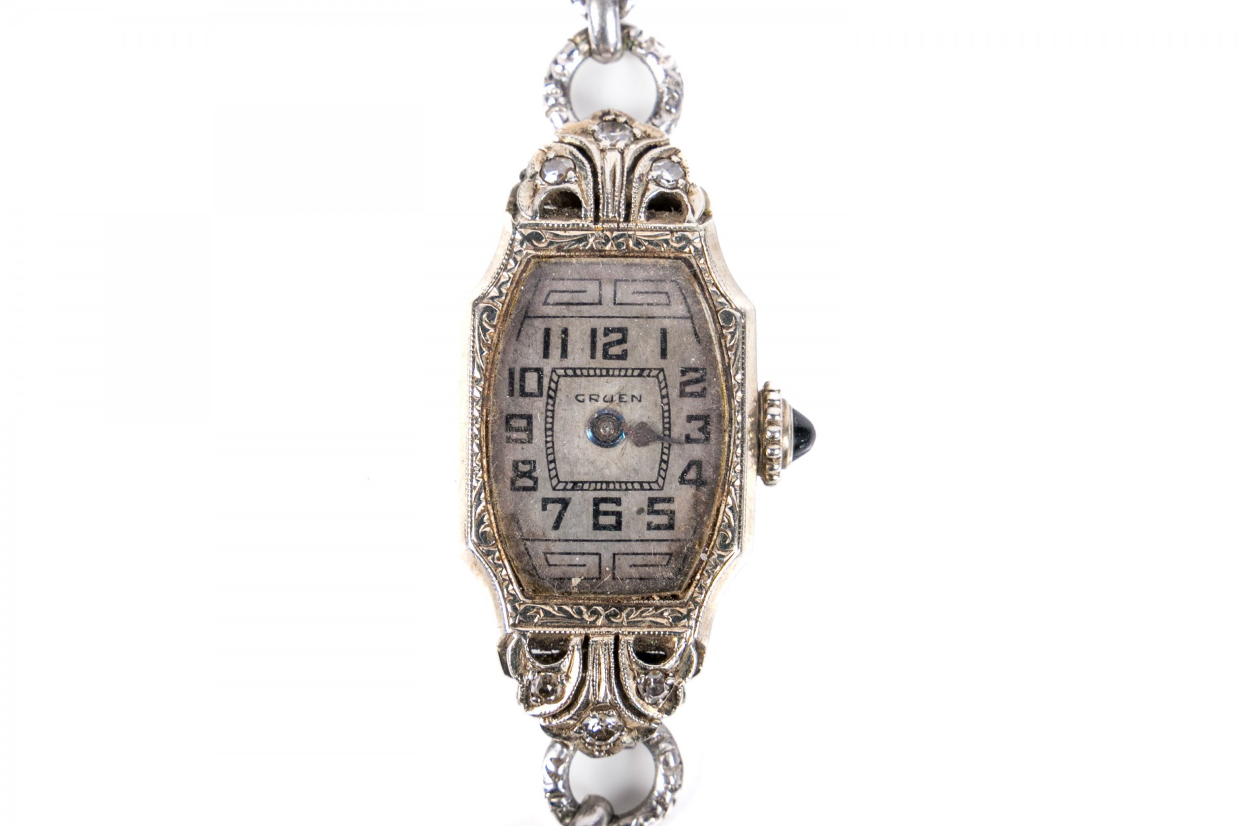 Vintage ladies' Gruen 14K white gold watch with silvertone band. With an elongated octagonal silvertone face with black Roman Numerals houses in a 14K white gold bezel accented with small diamonds. 15 jewels. Marked on interior of bezel backing.