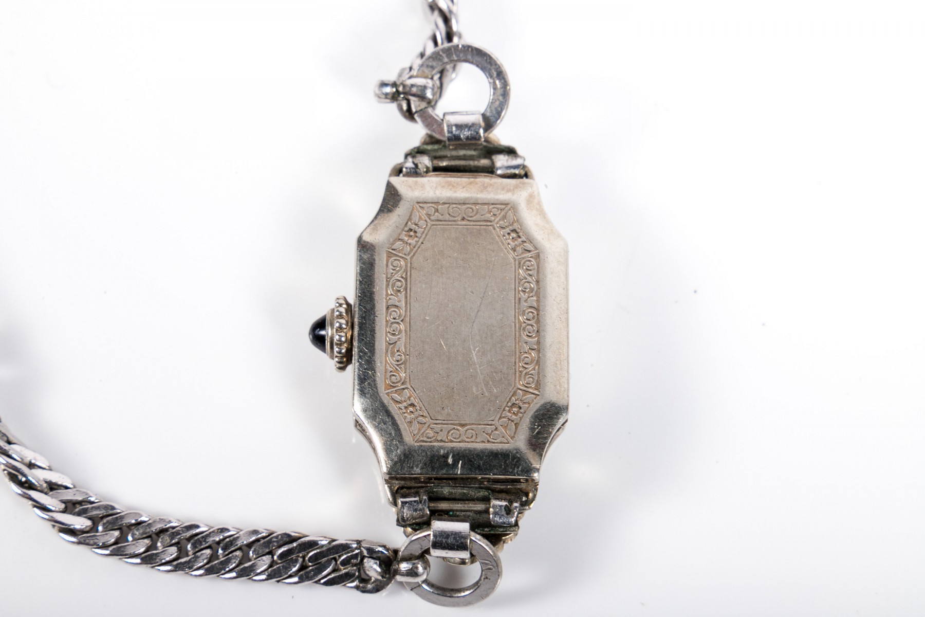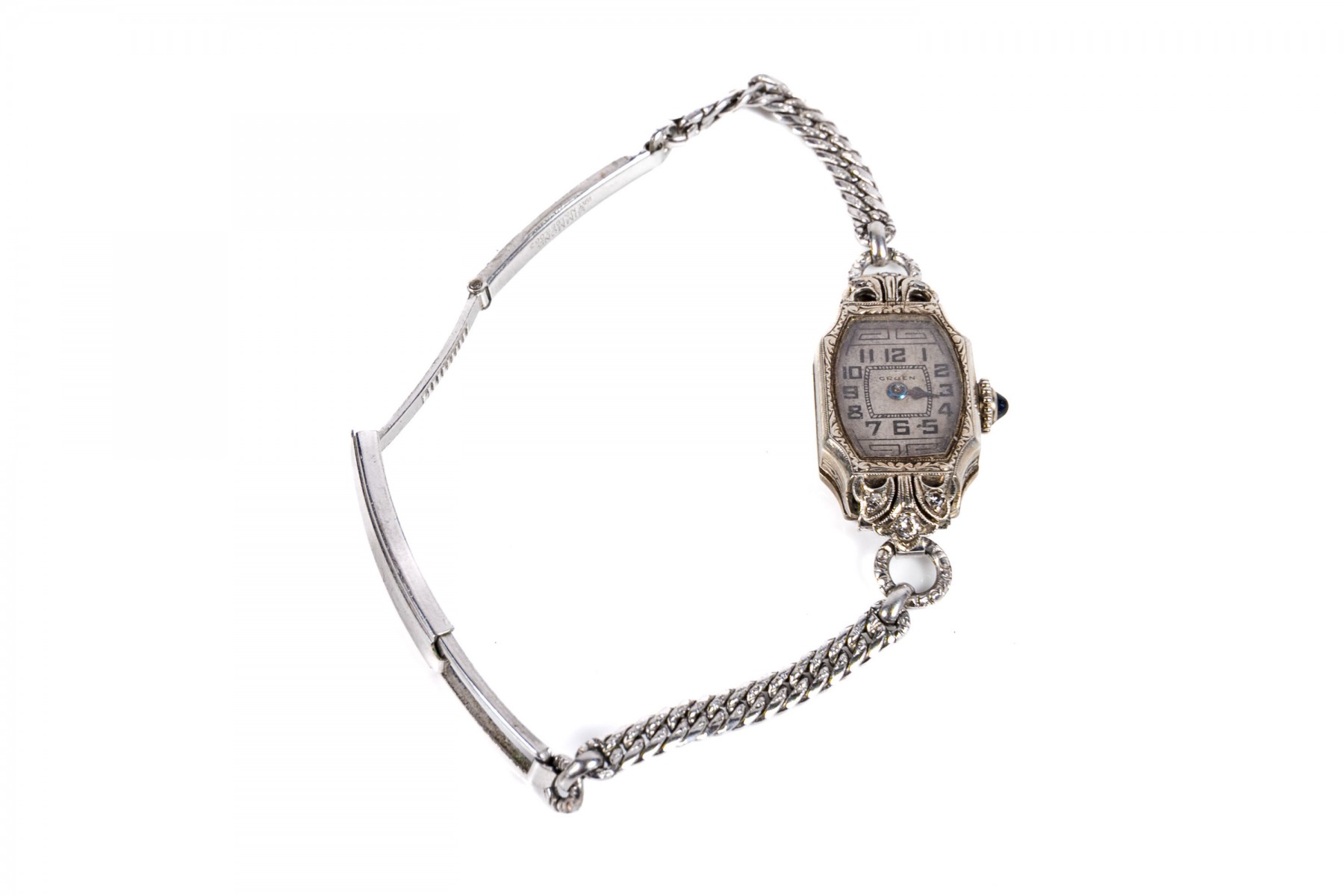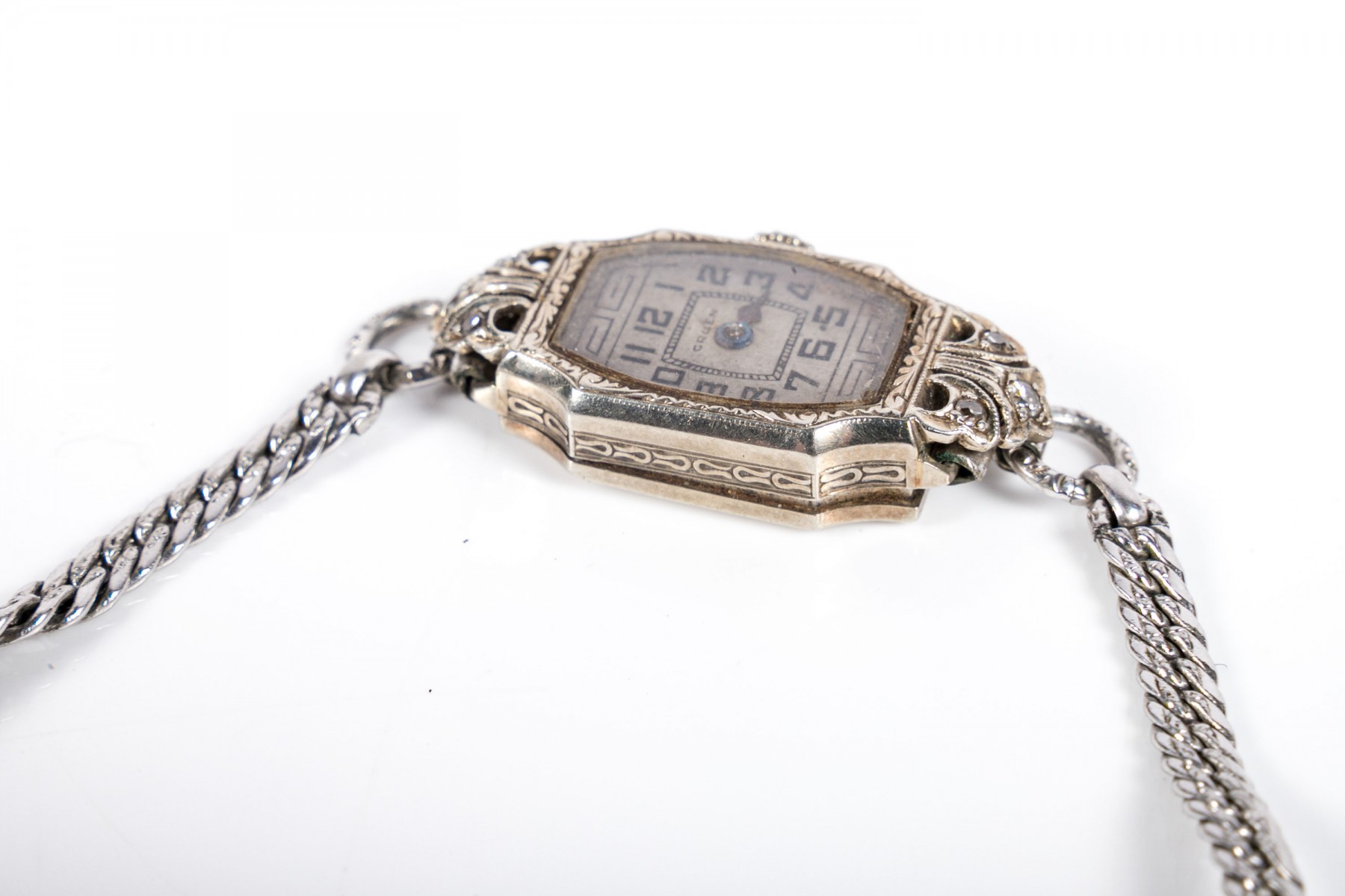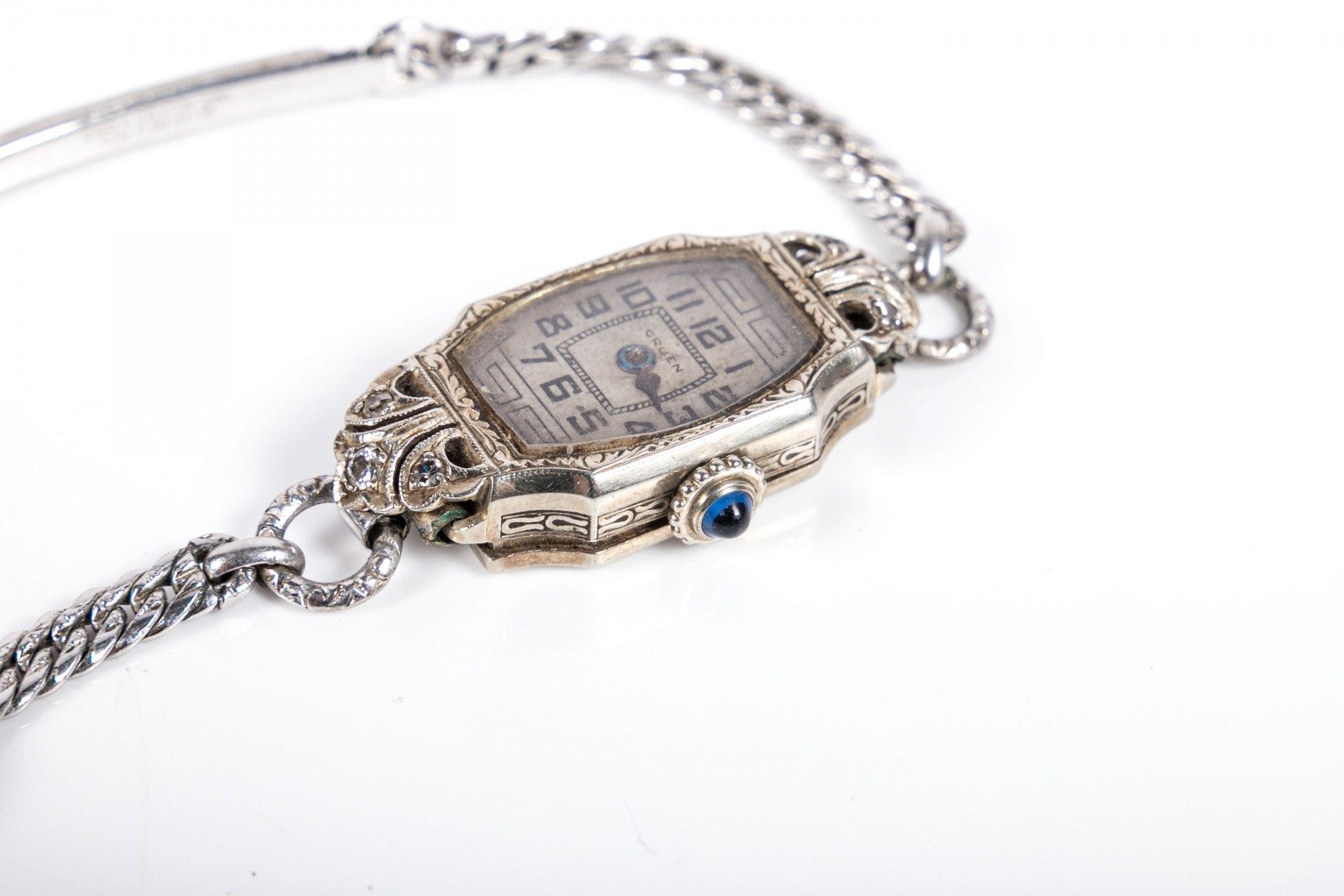 Vintage ladies' Gruen 14K white gold watch with silvertone band. With an elongated octagonal silvertone face with black Roman Numerals houses in a 14K white gold bezel accented with small diamonds. 15 jewels. Marked on interior of bezel backing.