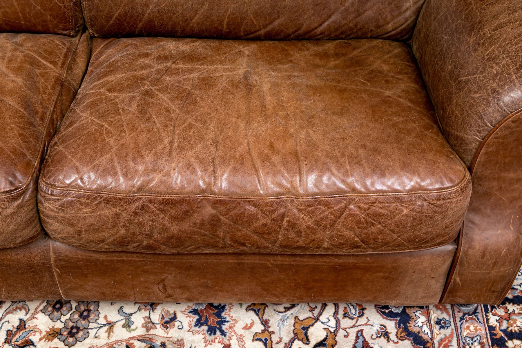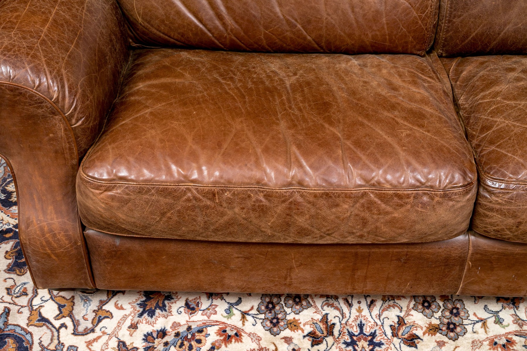 Raised on four legs with two loose, leather upholstered seat cushion, affixed seat back cushions and rolled arms.