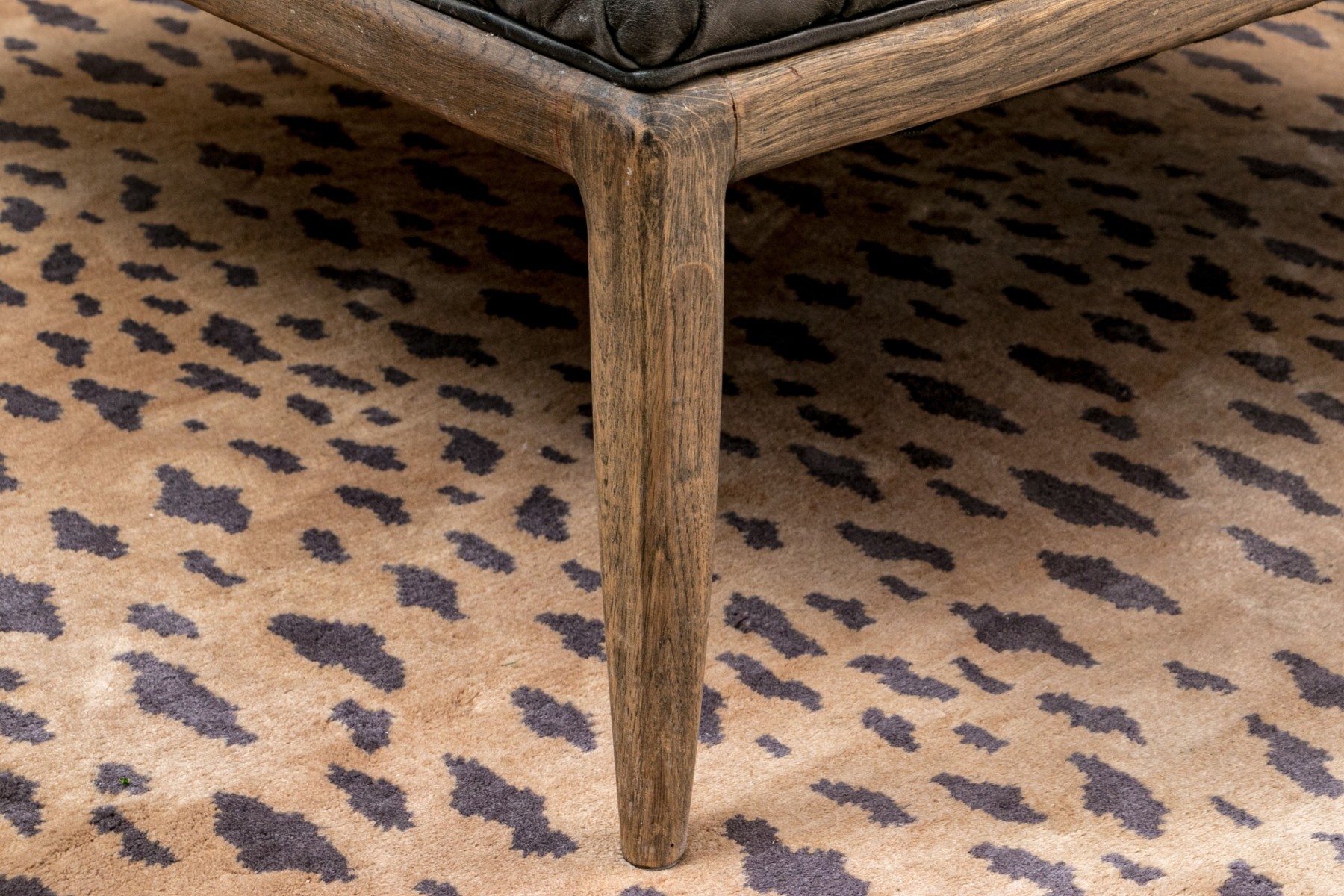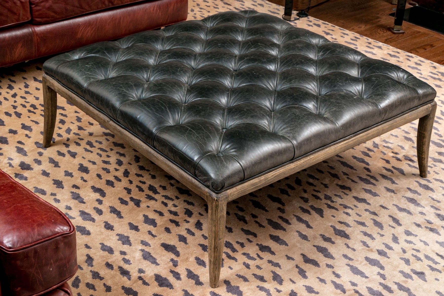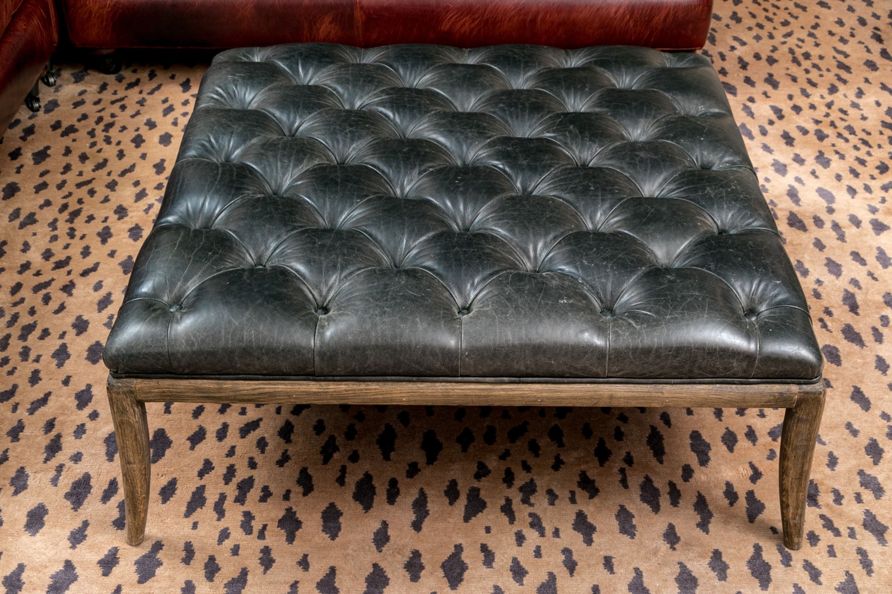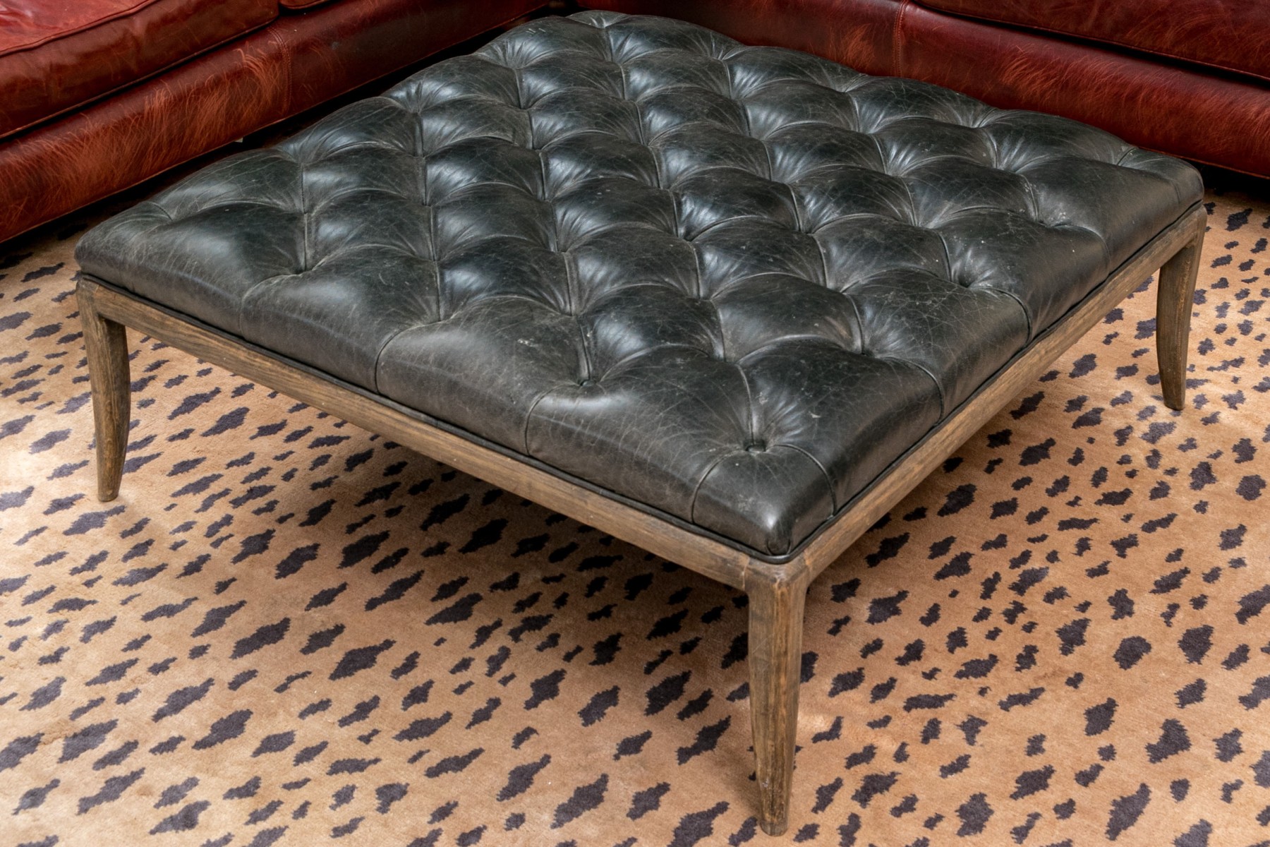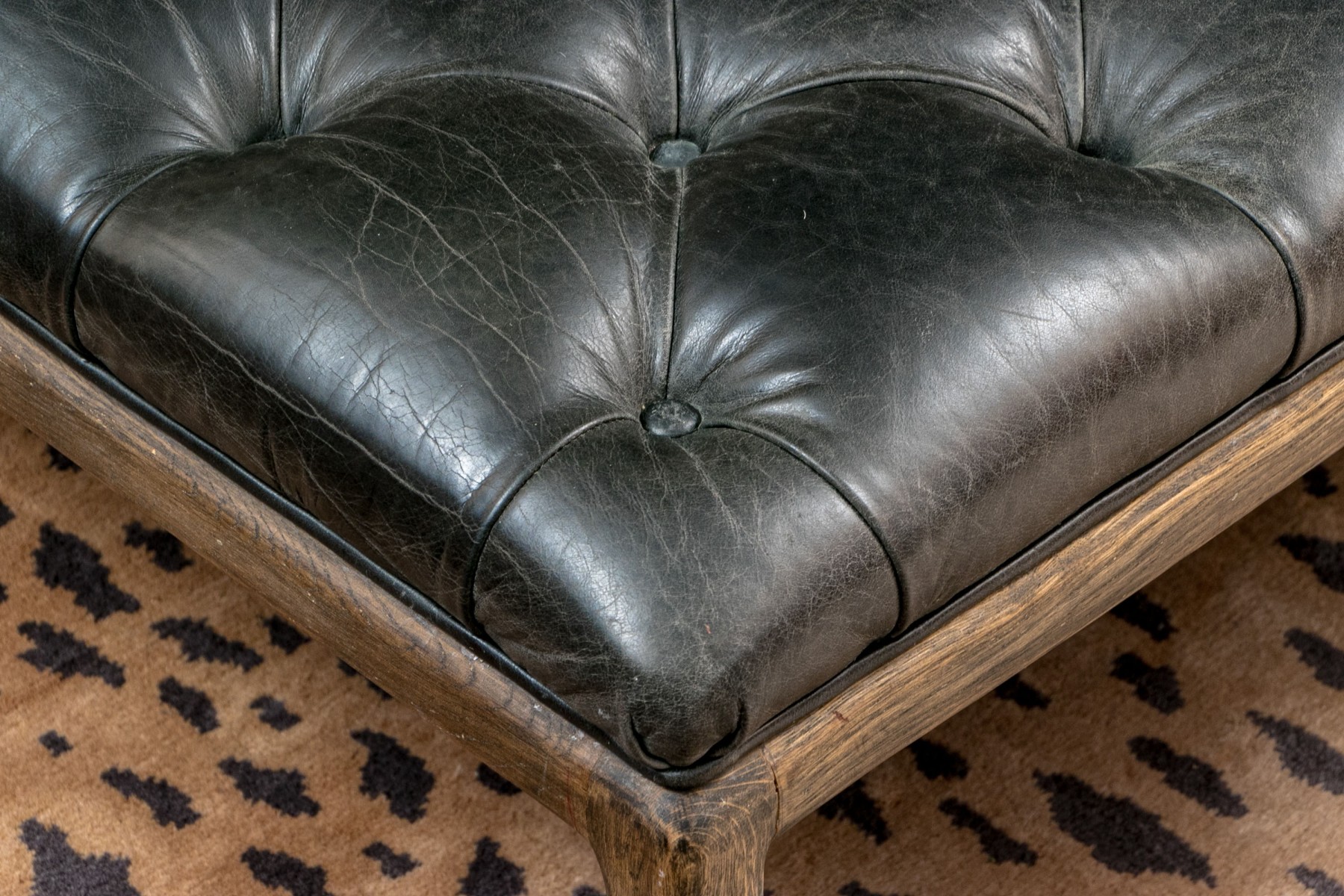A square bench with a mottled tone wood frame with tapering square legs and a button tufted dark brown leather seat.