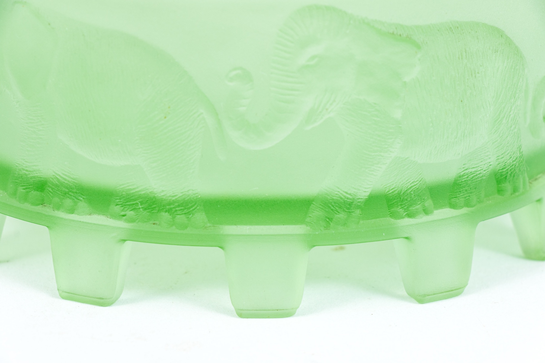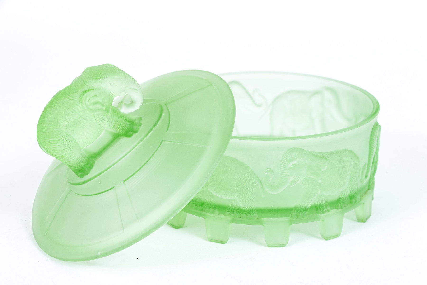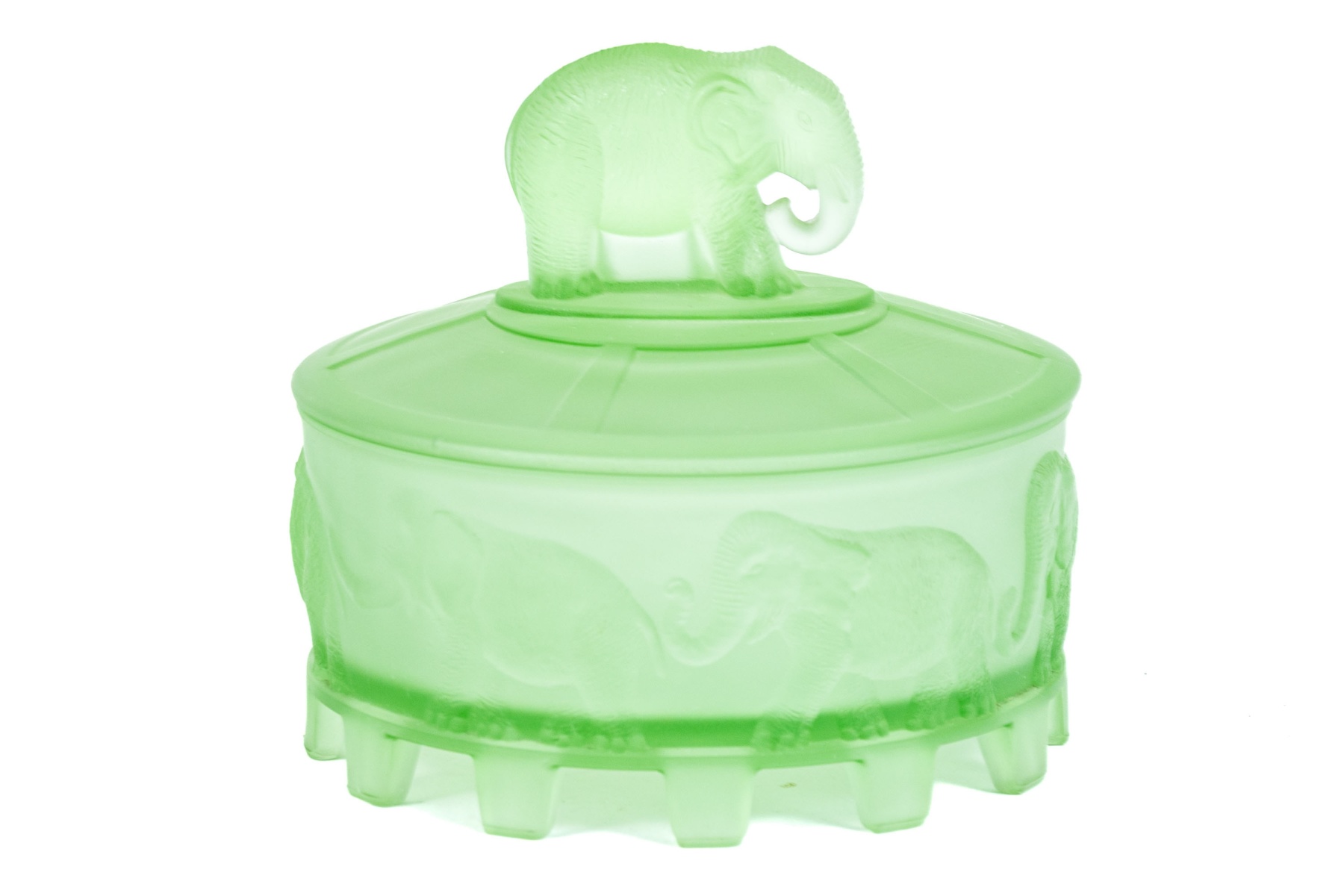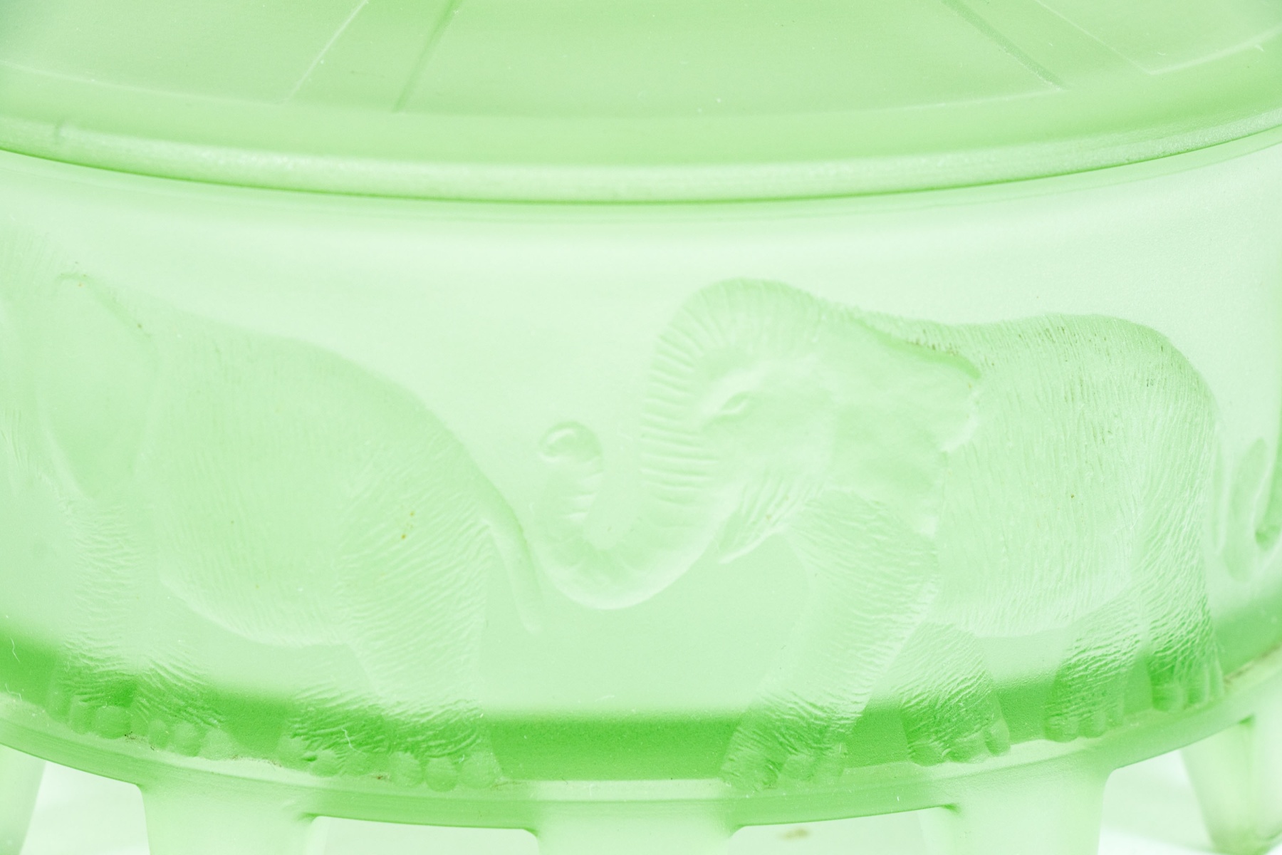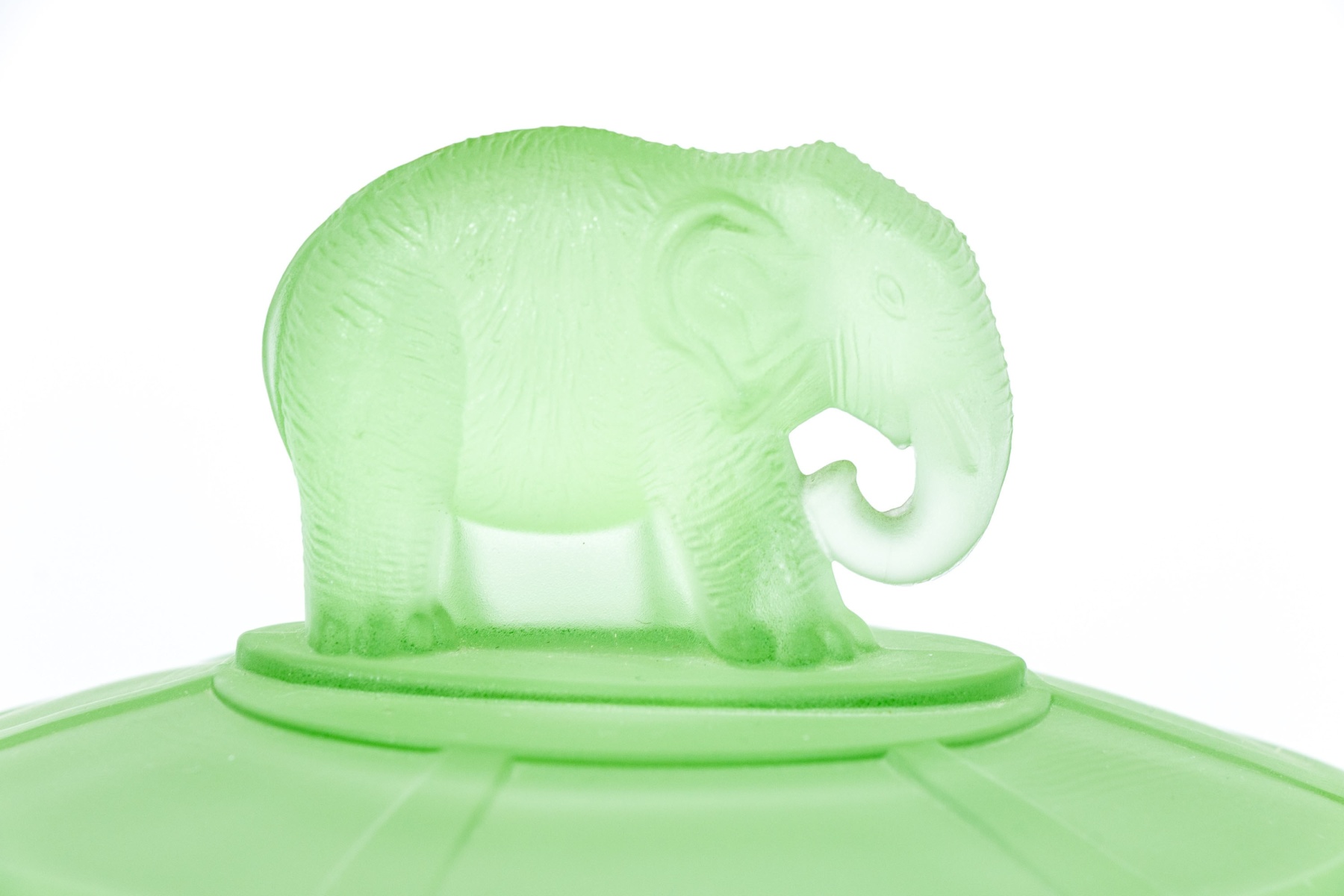 The circular box stands on numerous short feet with lid boasting a fabulously formed elephant form finial.