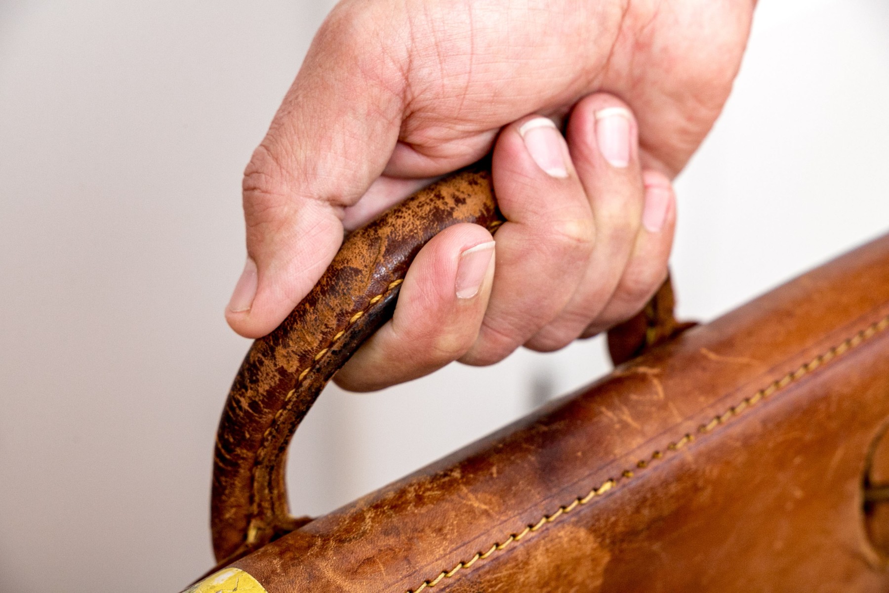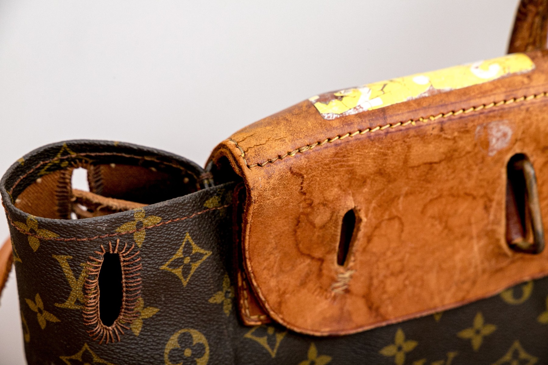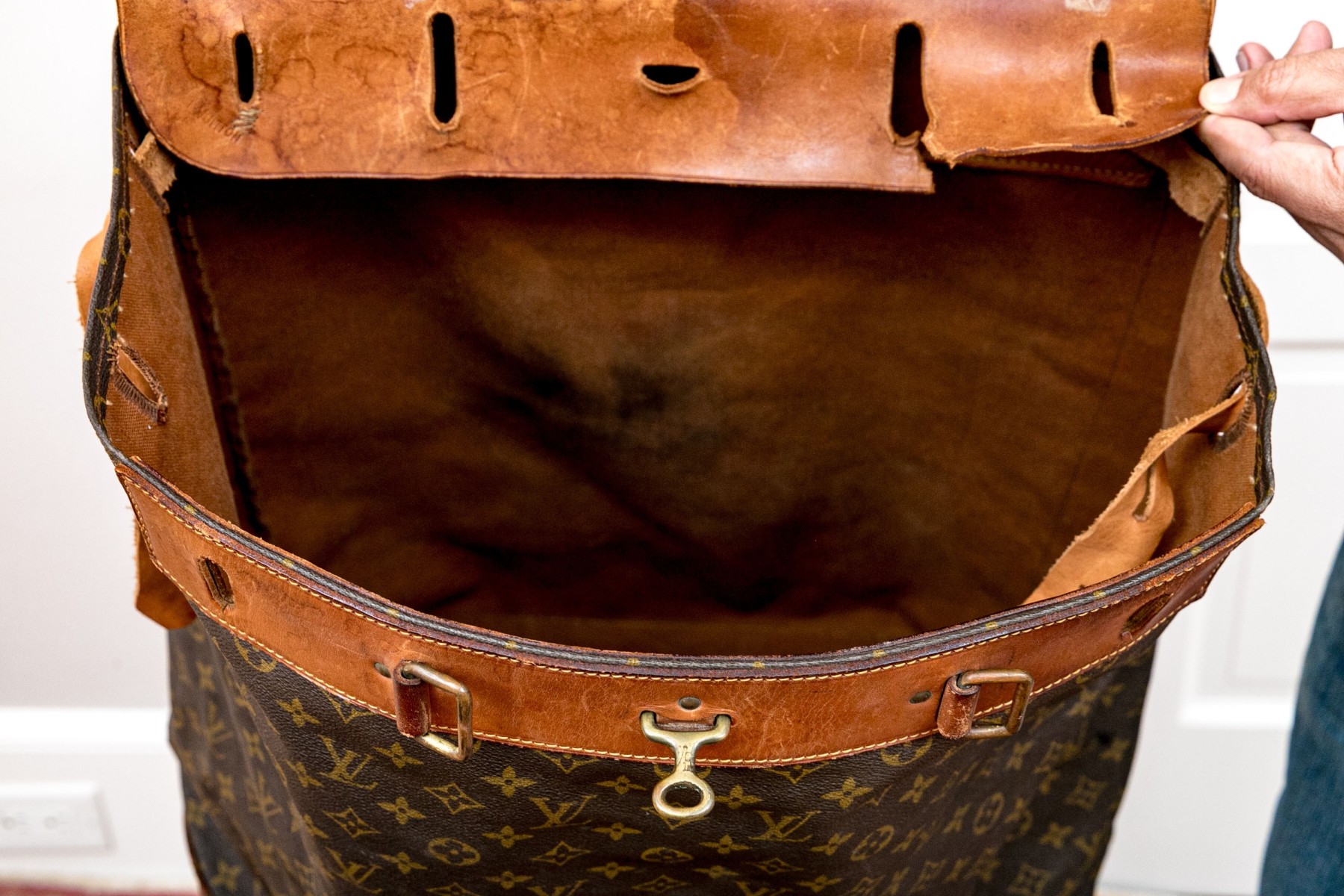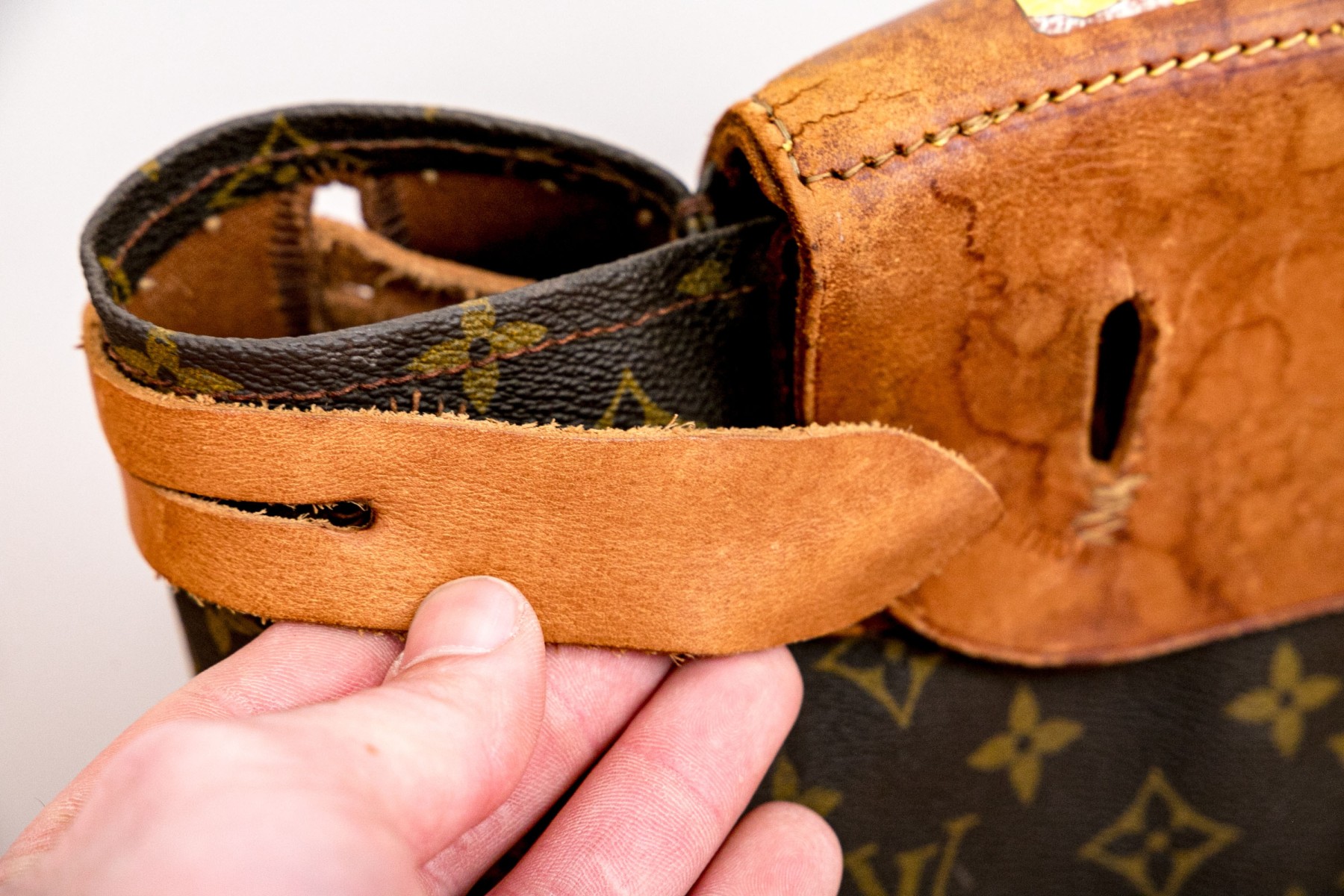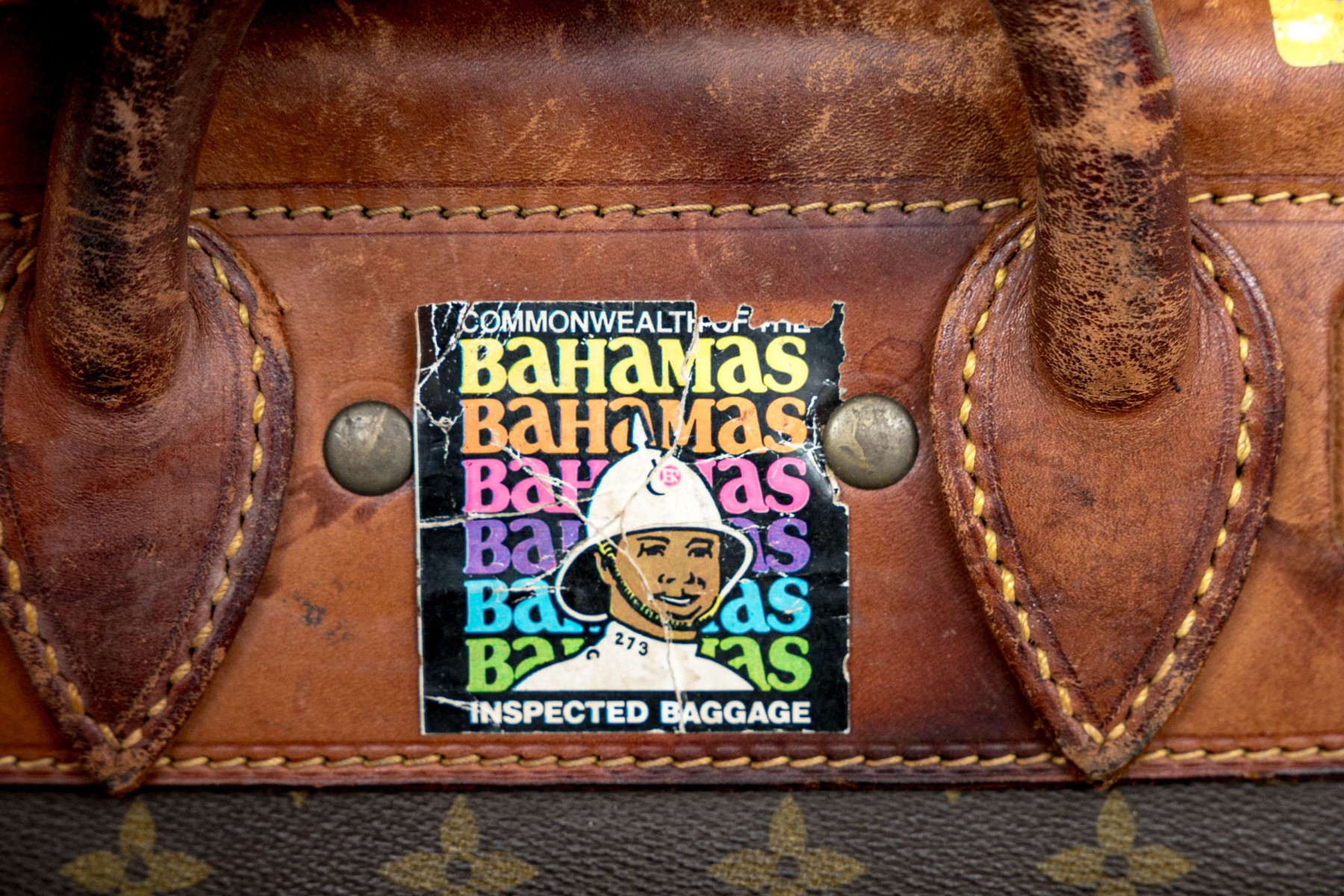 As is with wear commensurate with age and travel. Tear to the leather near the loop for the right buckle on the flap. A Bahamas sticker affixed near the handle.