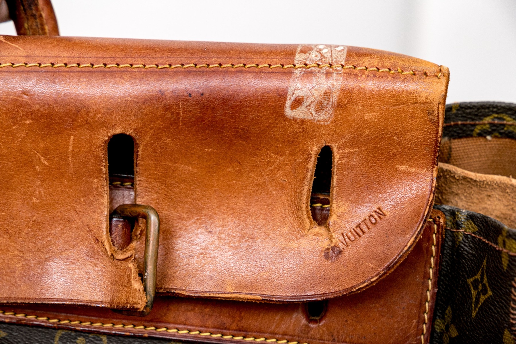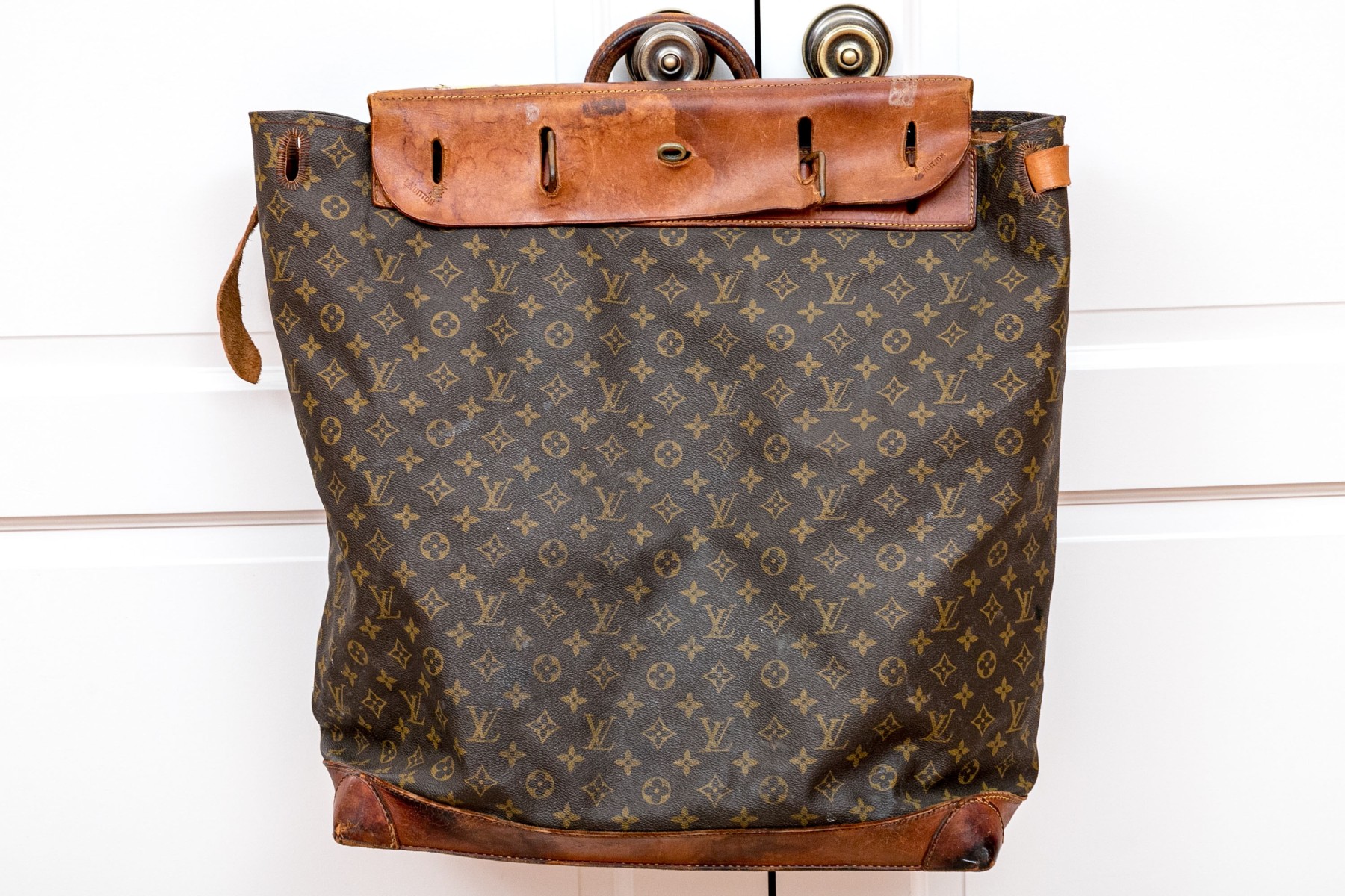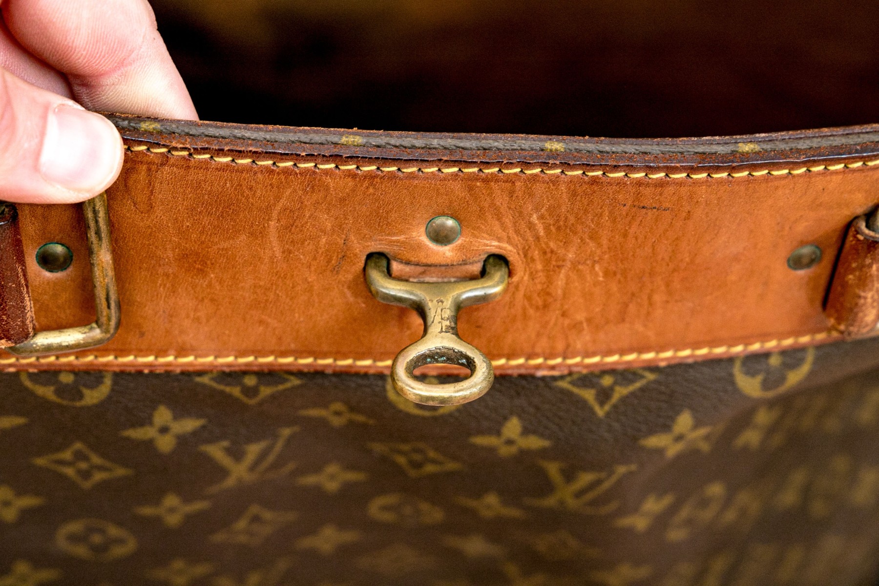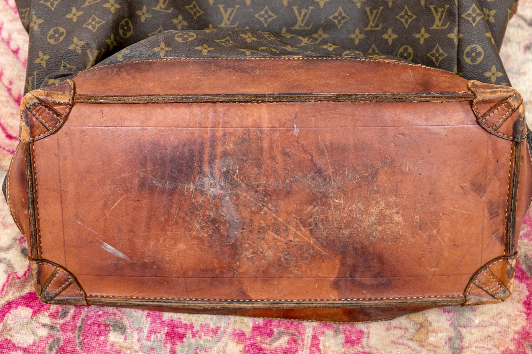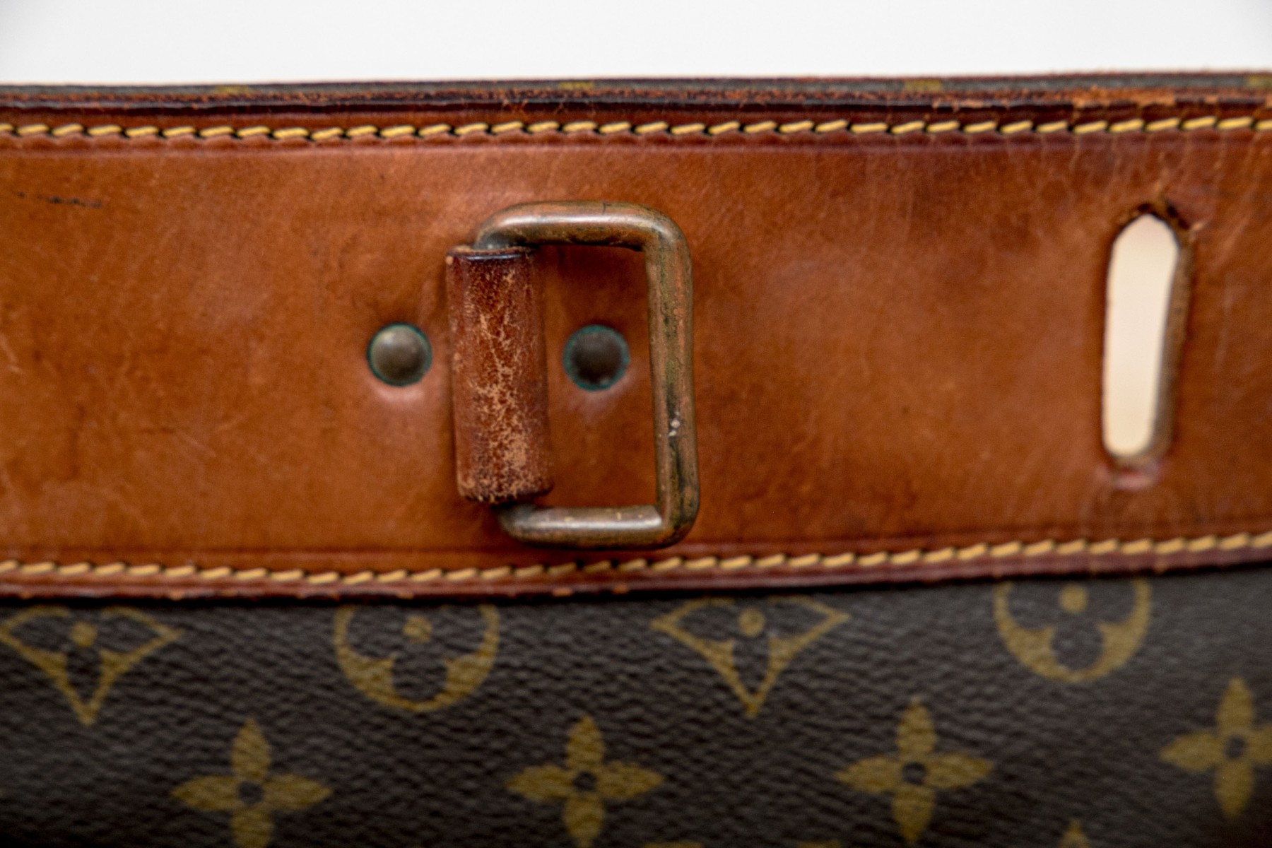 A wonderful vintage Louis Vuitton steamer bag in iconic monogram patterned leather. Features a warm brown leather handle, flap closure with slots for buckles to thread a strap, and brown leather bottom with reinforced corners.