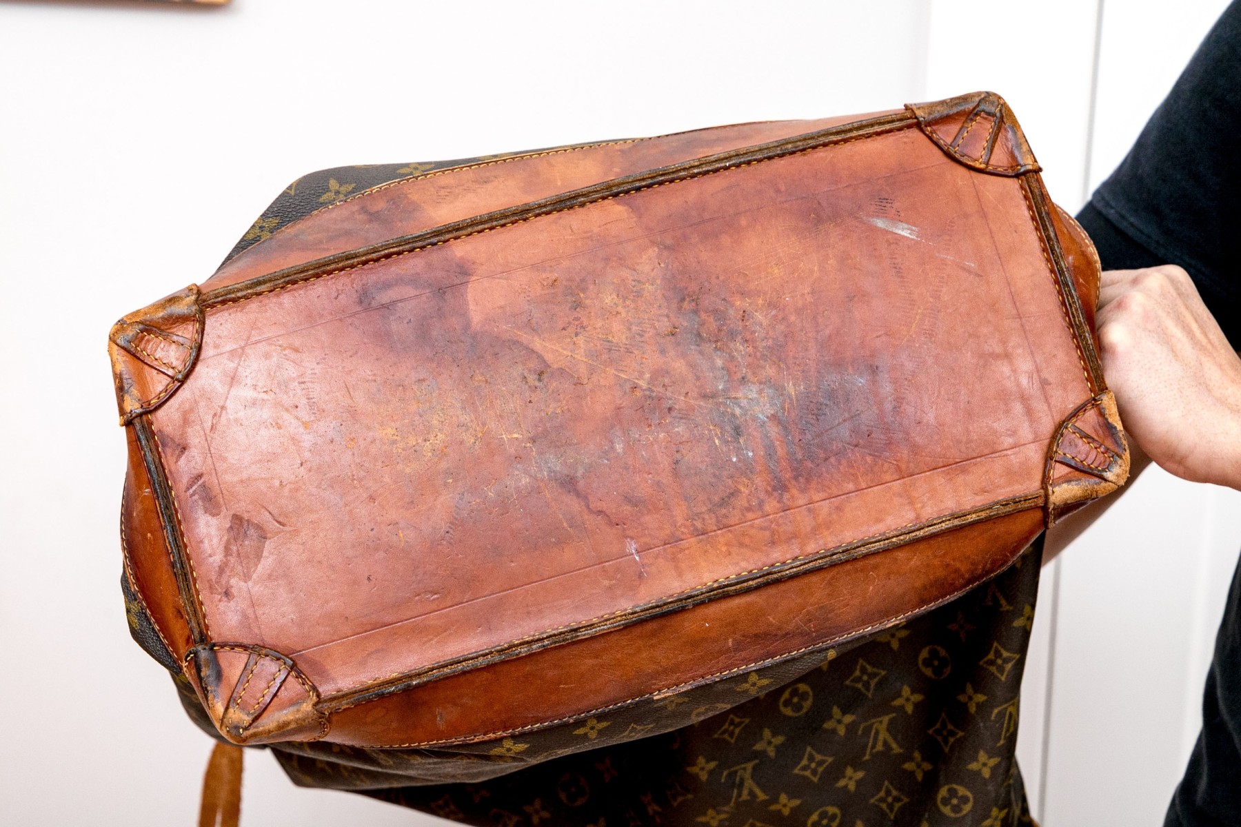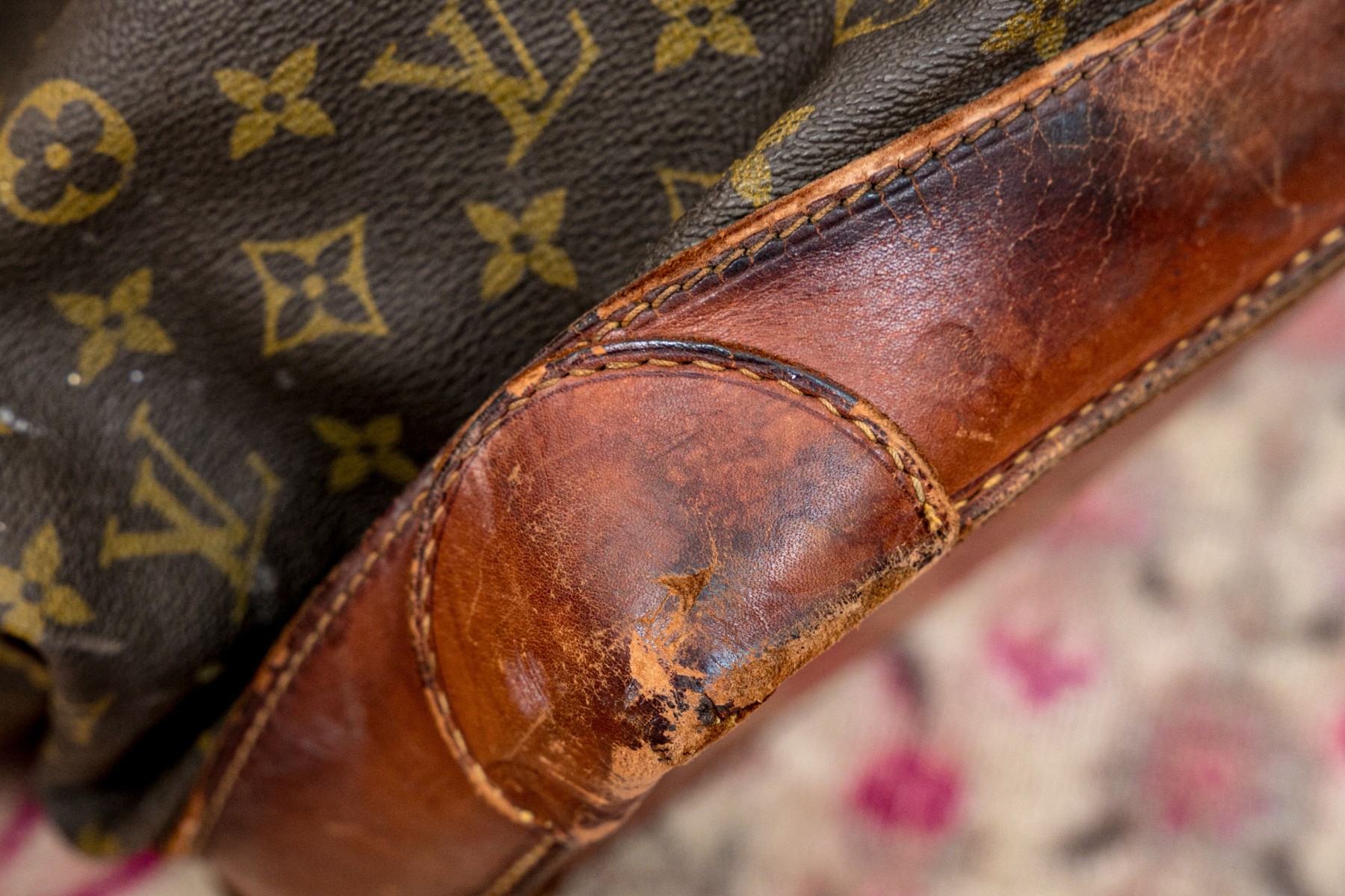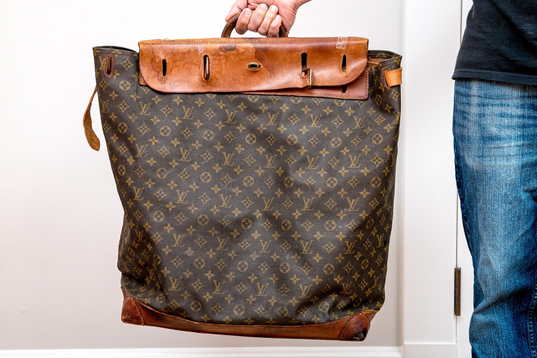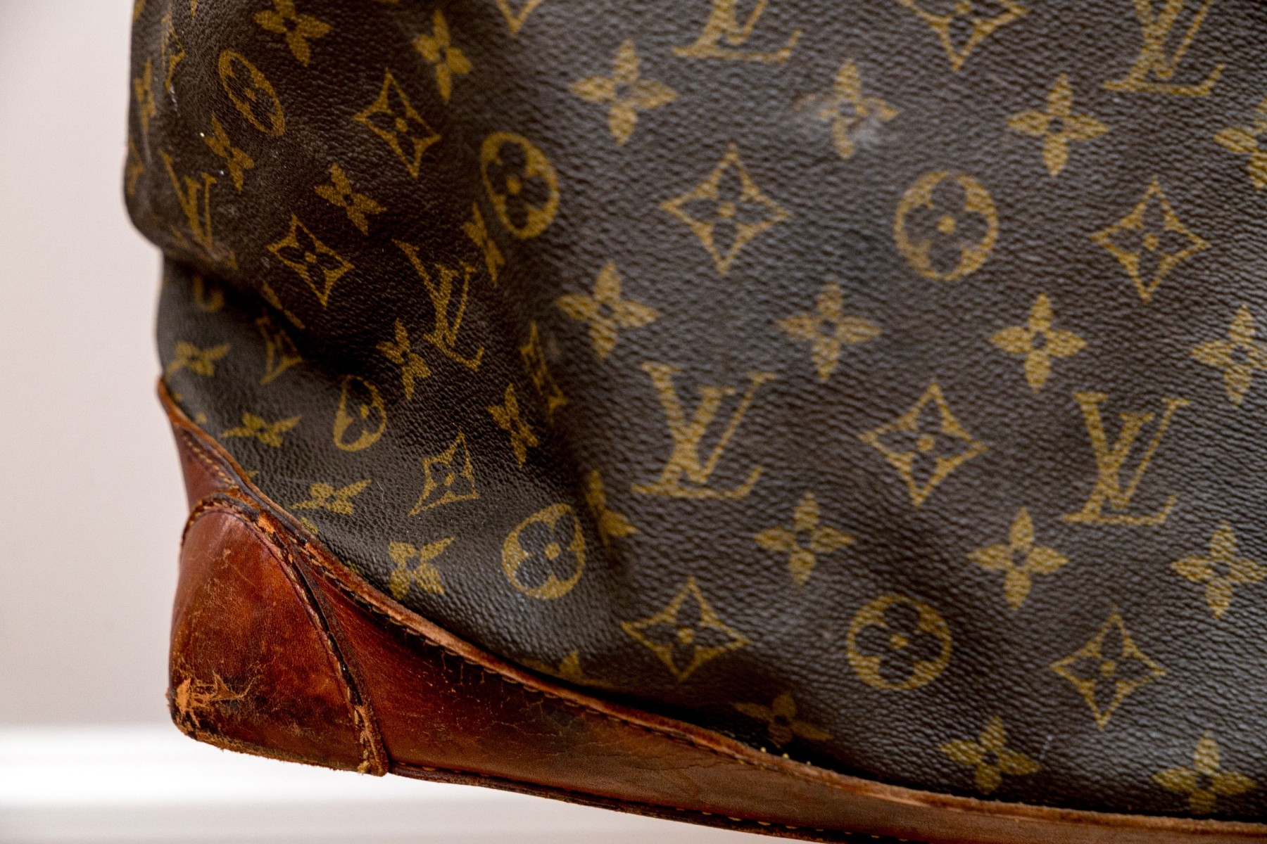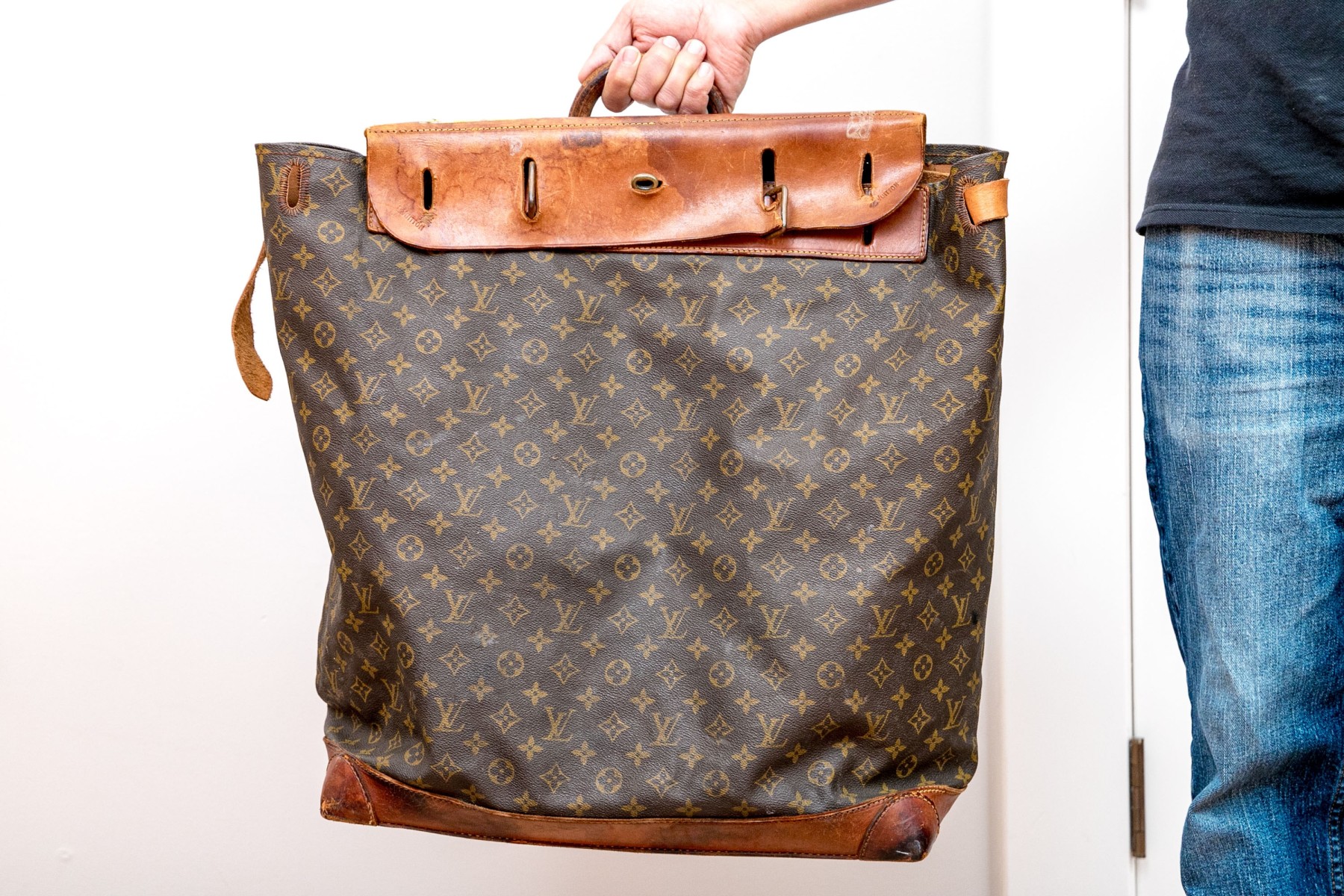 A wonderful vintage Louis Vuitton steamer bag in iconic monogram patterned leather. Features a warm brown leather handle, flap closure with slots for buckles to thread a strap, and brown leather bottom with reinforced corners.