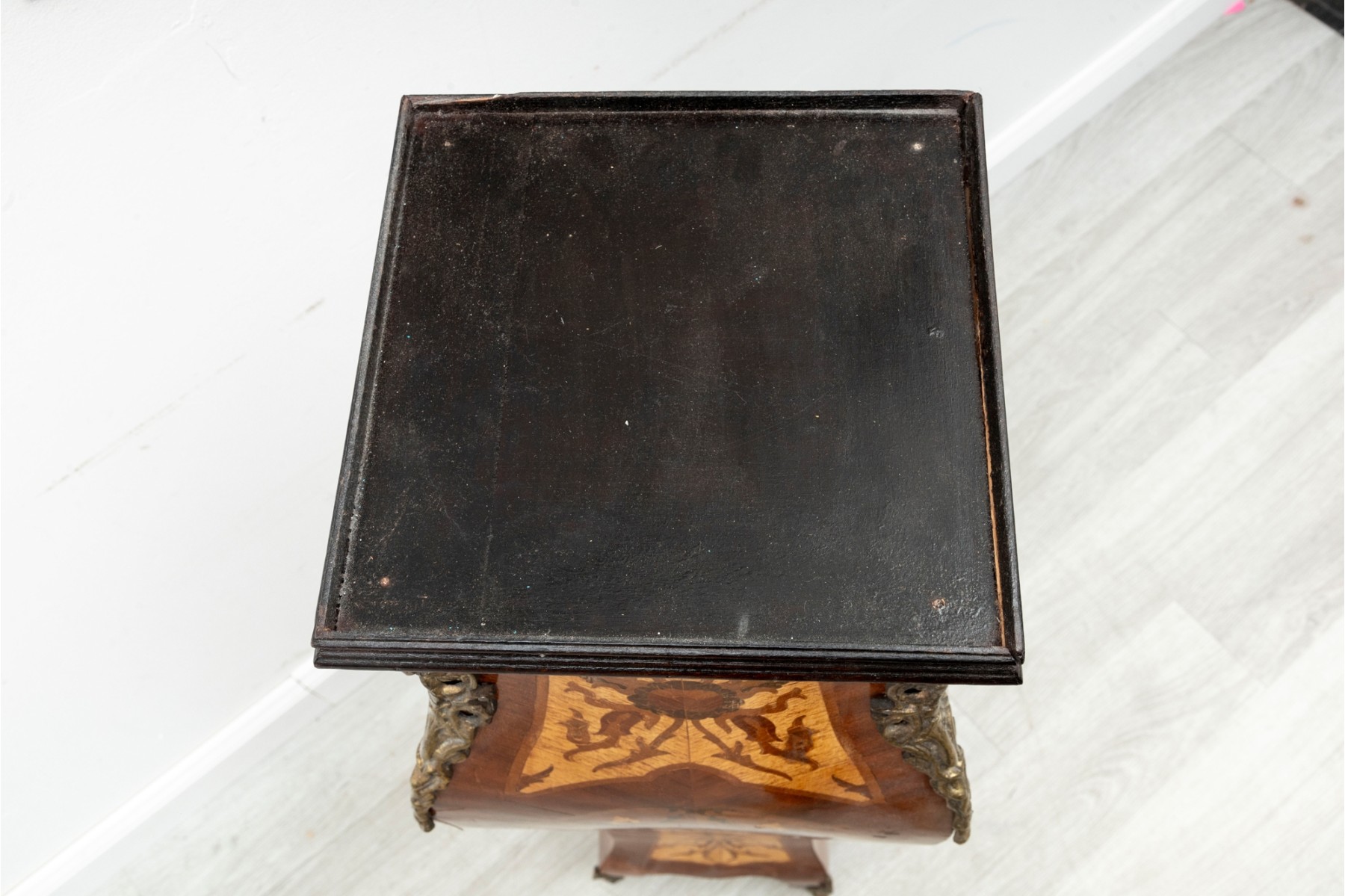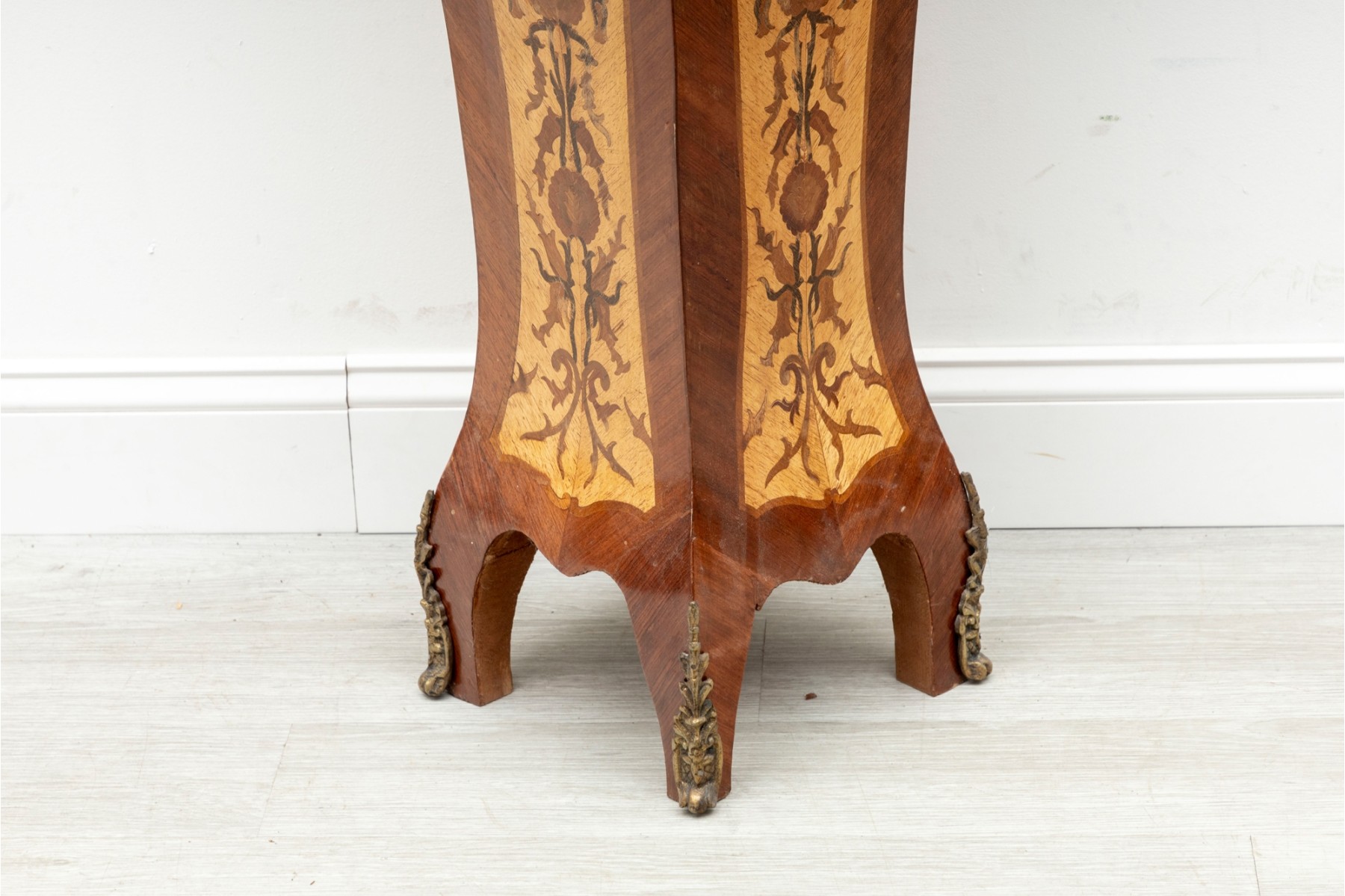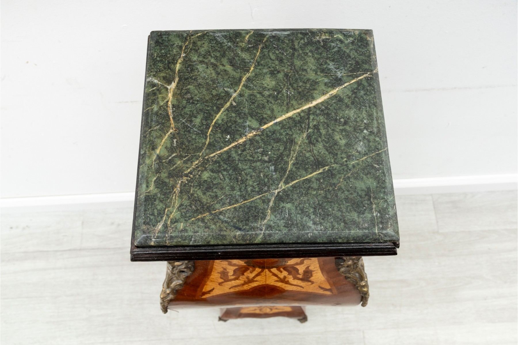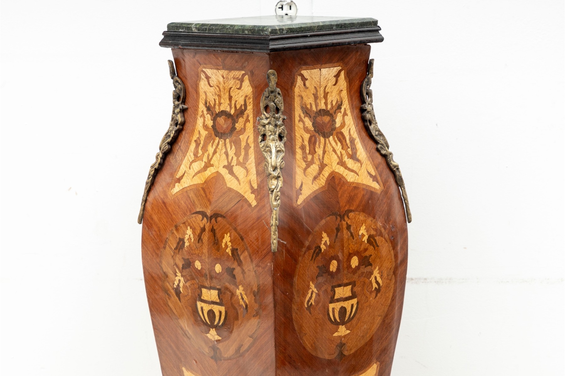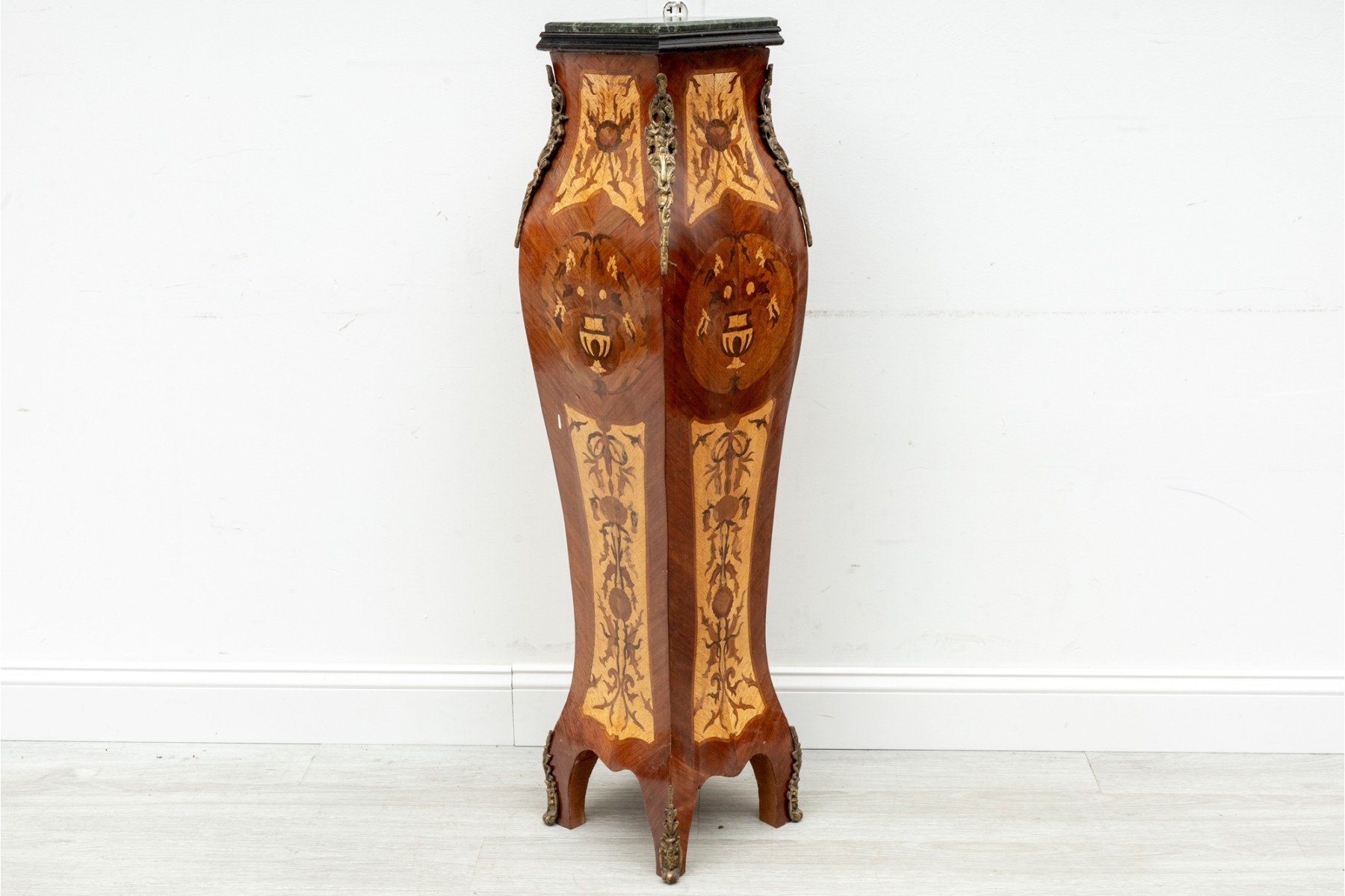 This antique pedestal in the style of Louis XV features intricate, expressive inlaid designs throughout, showcasing the beauty of fine marquetry work accompanied with brass trim adornments. The top is complete with a green marble top.