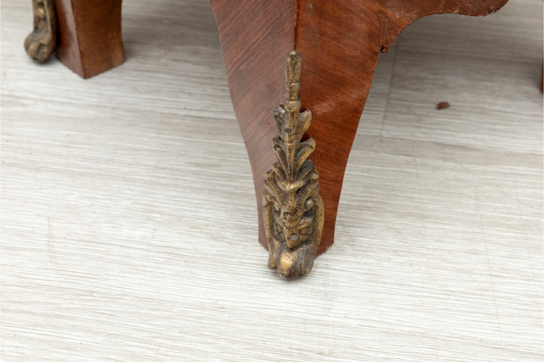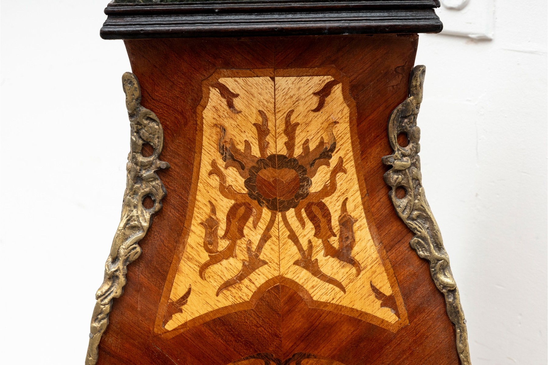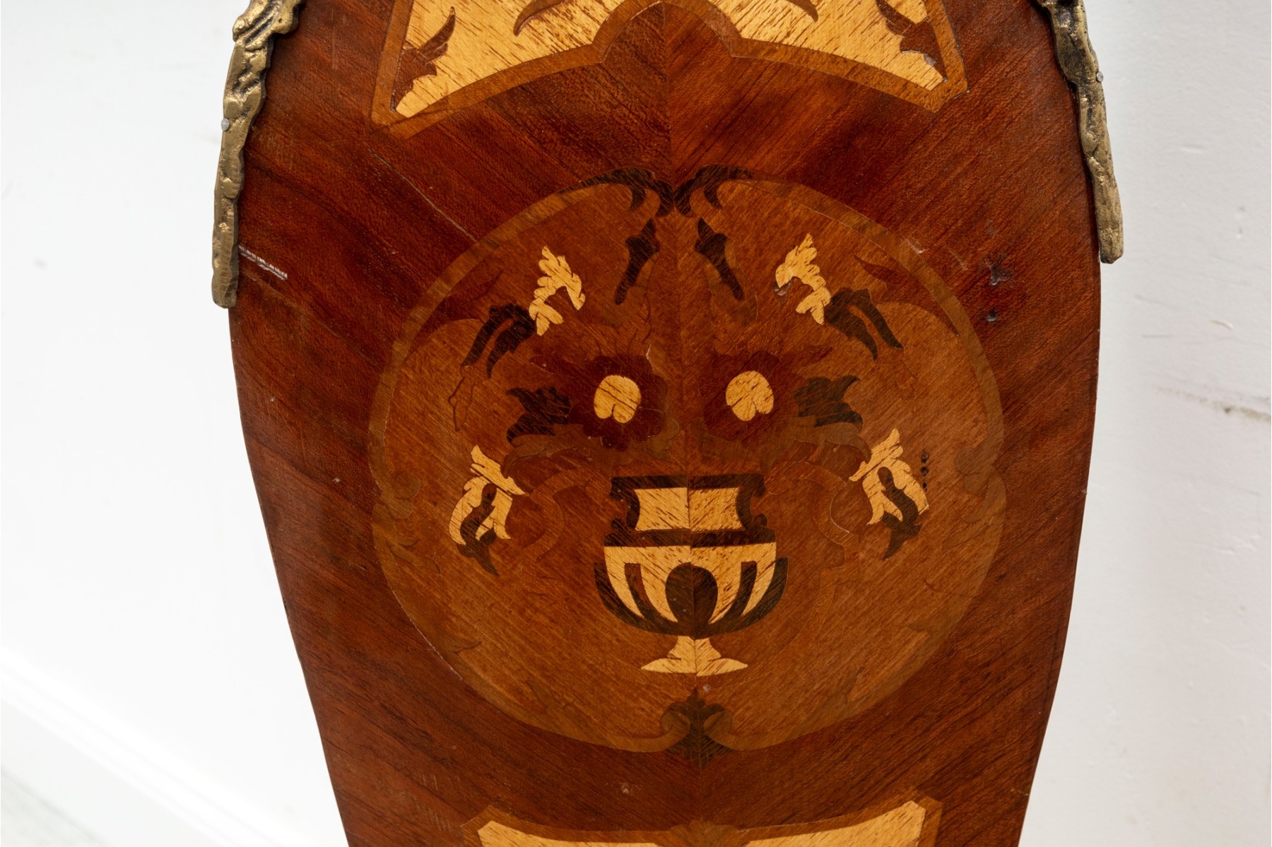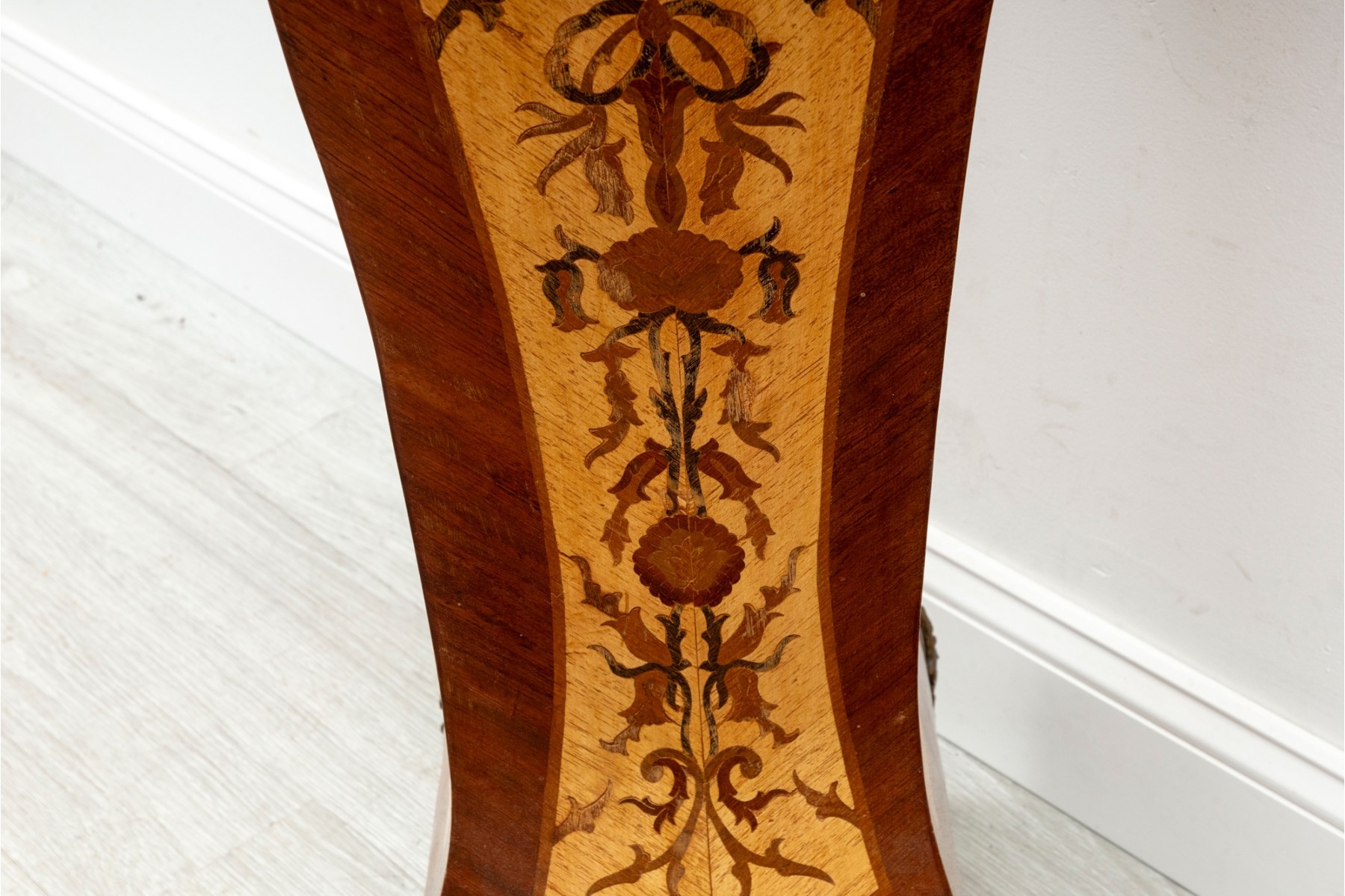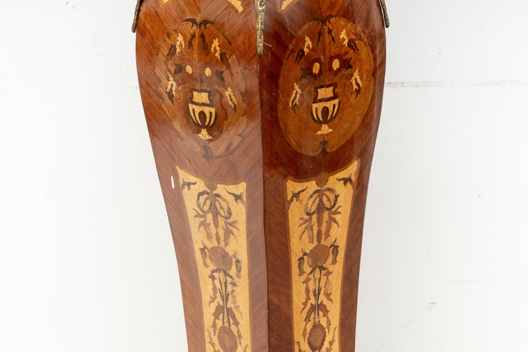 This antique pedestal in the style of Louis XV features intricate, expressive inlaid designs throughout, showcasing the beauty of fine marquetry work accompanied with brass trim adornments. The top is complete with a green marble top.