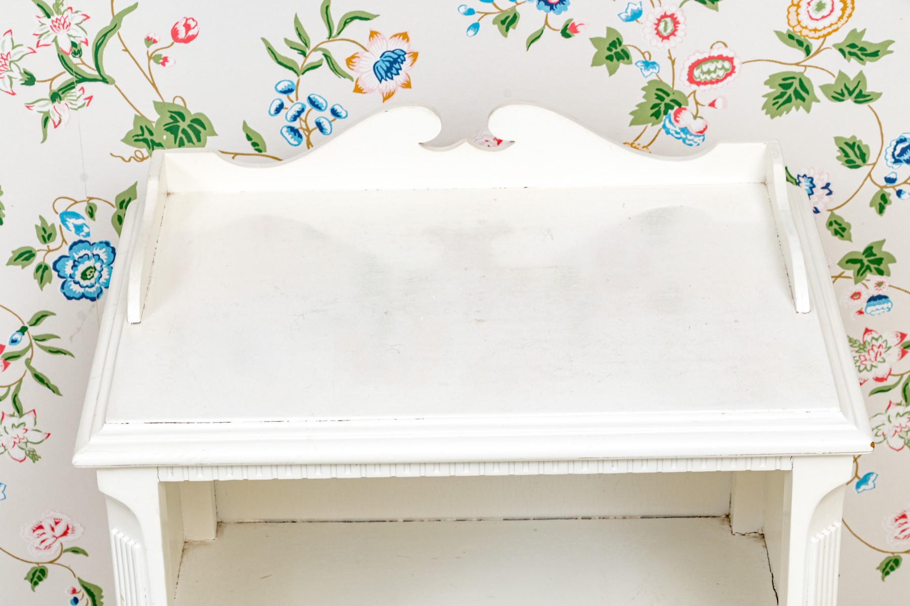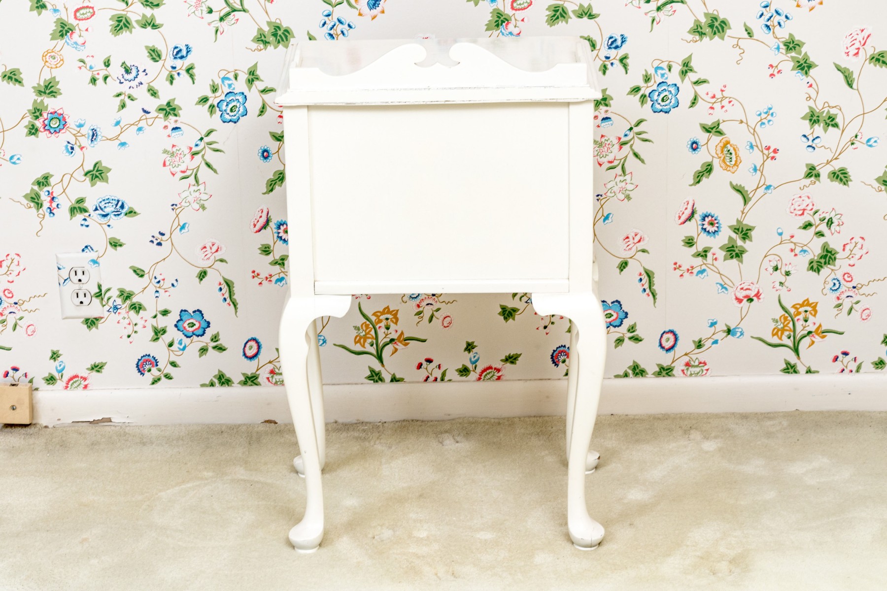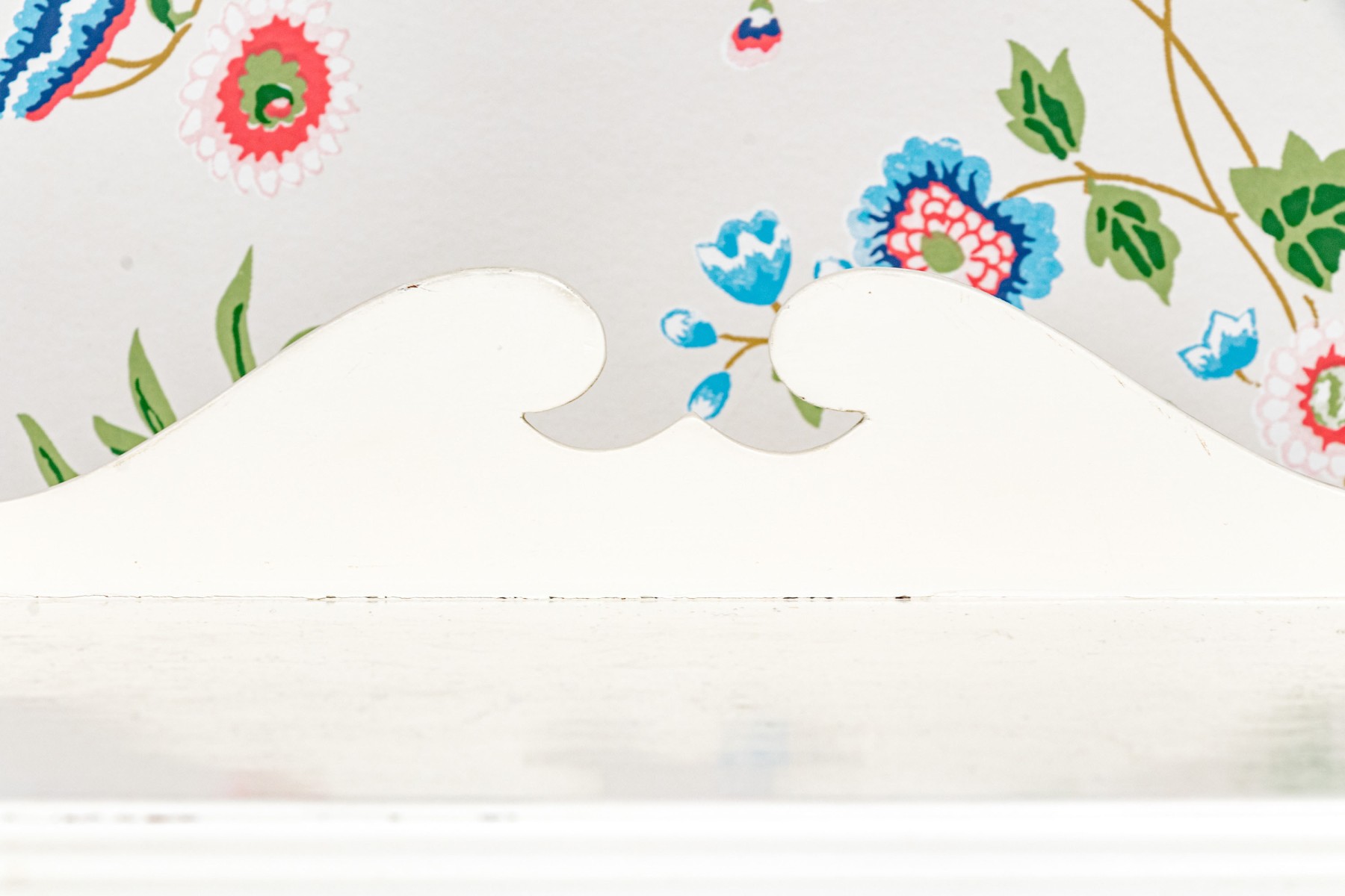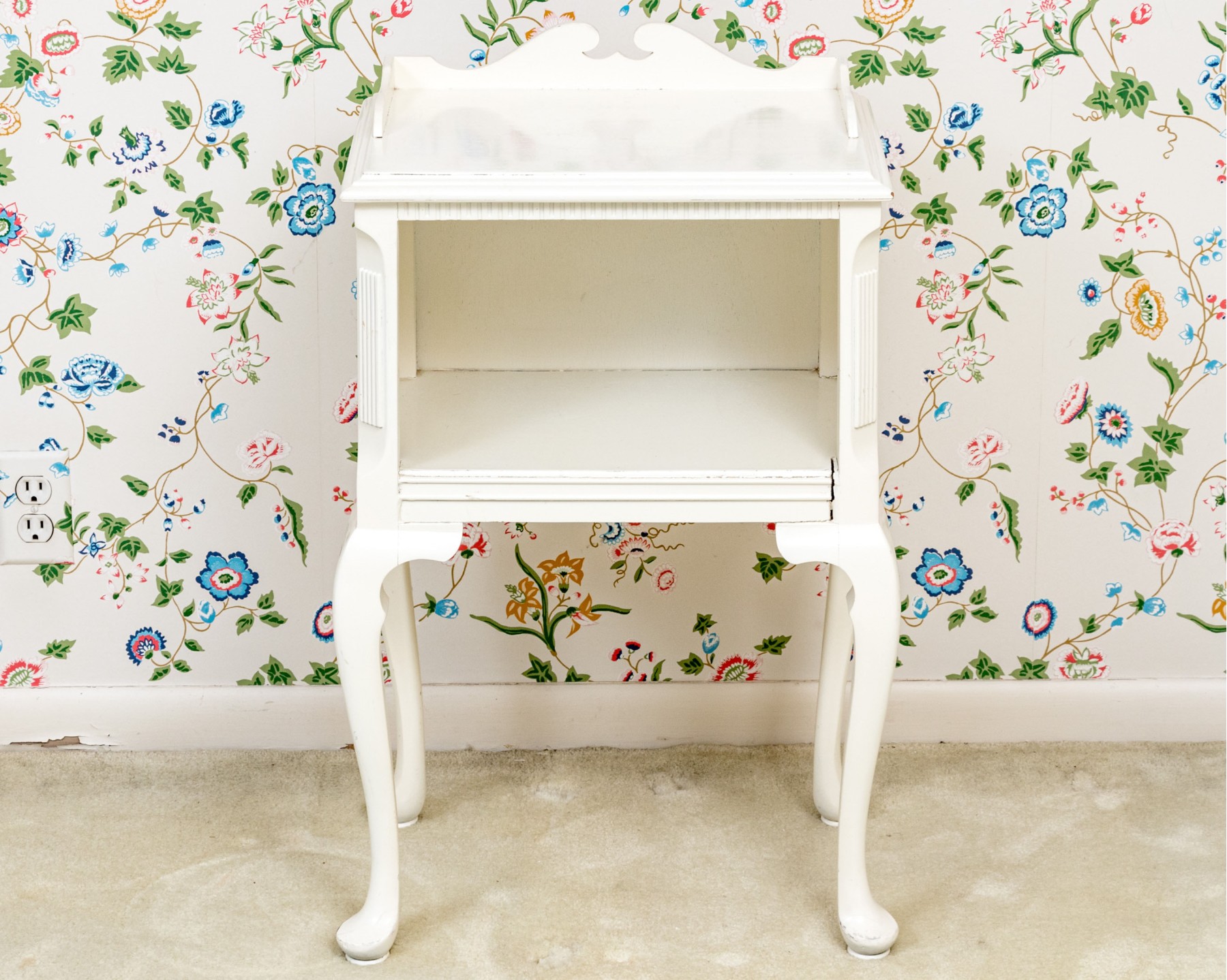 Raised on elegant, white finished cabriole legs with an open cabinet with fluted embellishment.