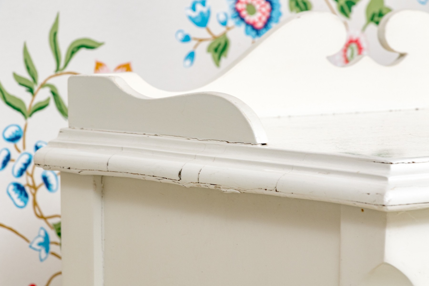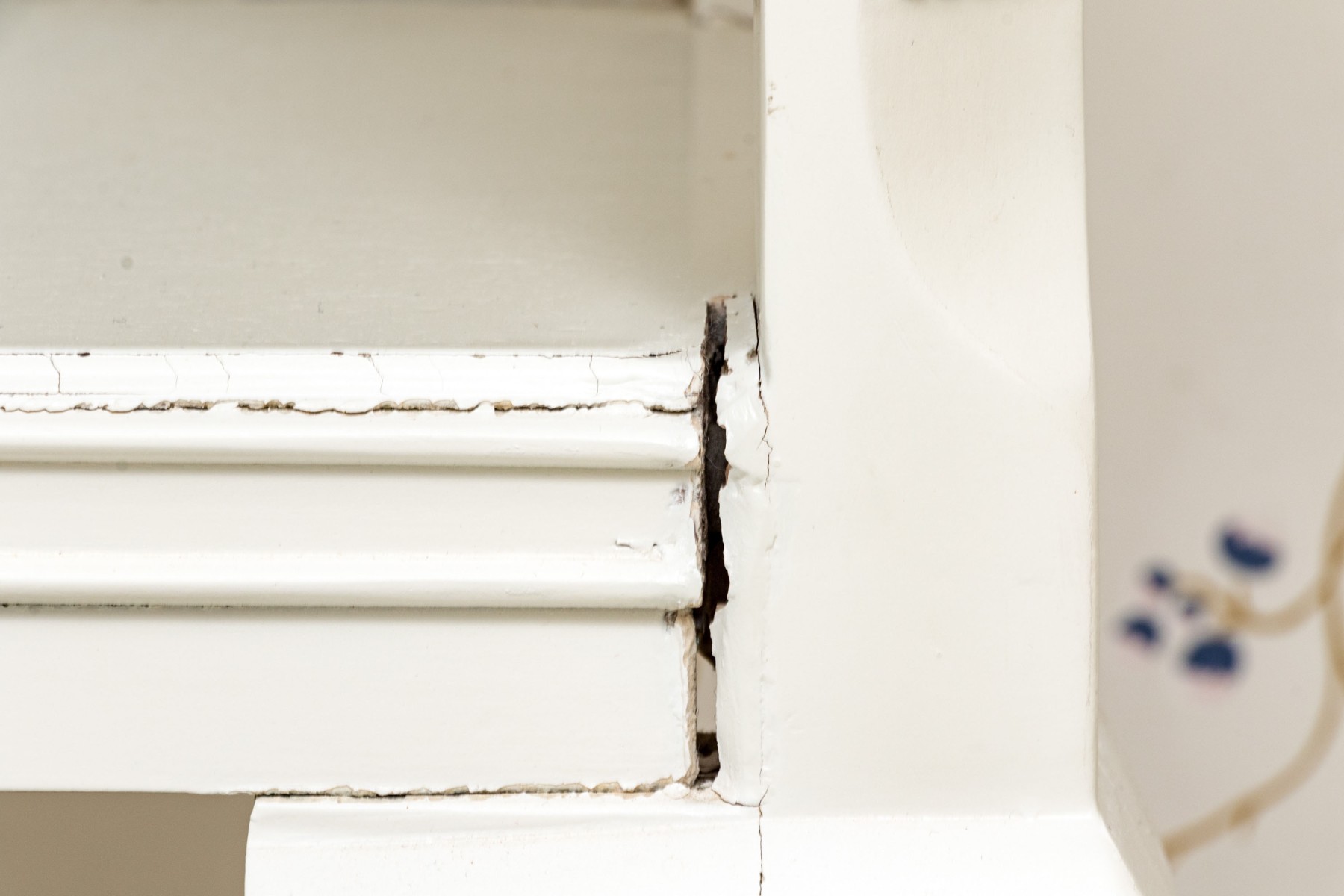Damage to the shelf where there is a split and should be refurbished. Additionally there is cracking with minute losses to the paint finish around the cabinet. Please review the photos as they are part of the condition report.