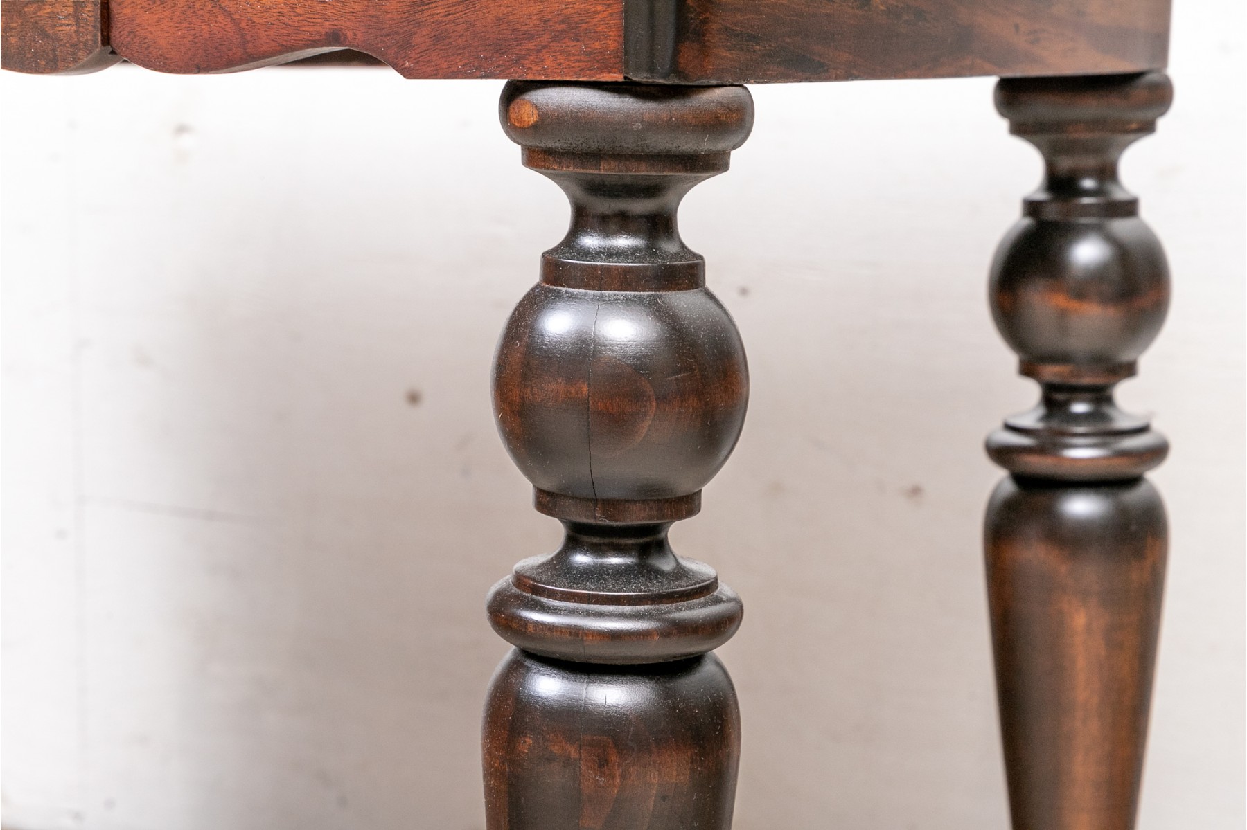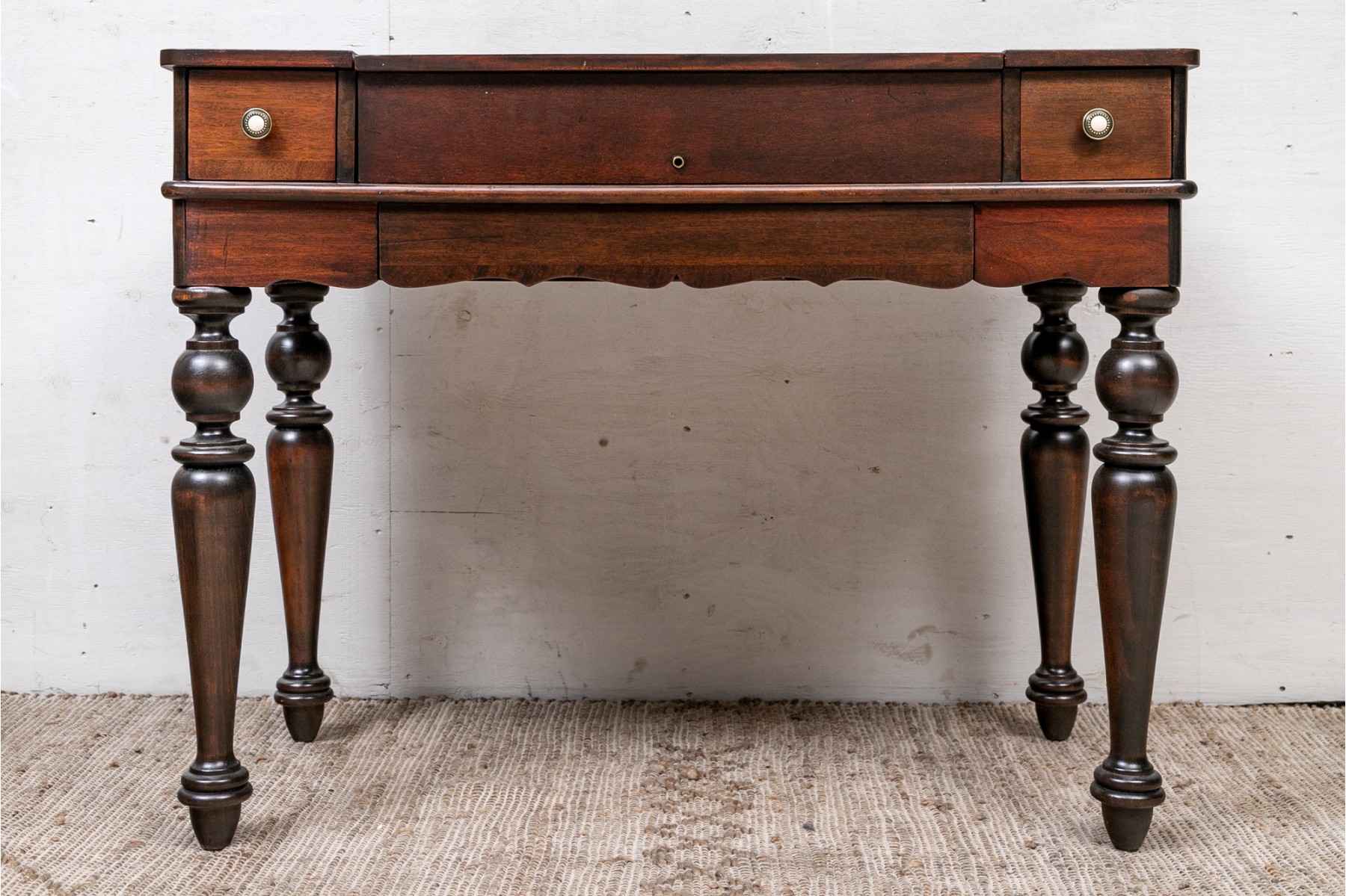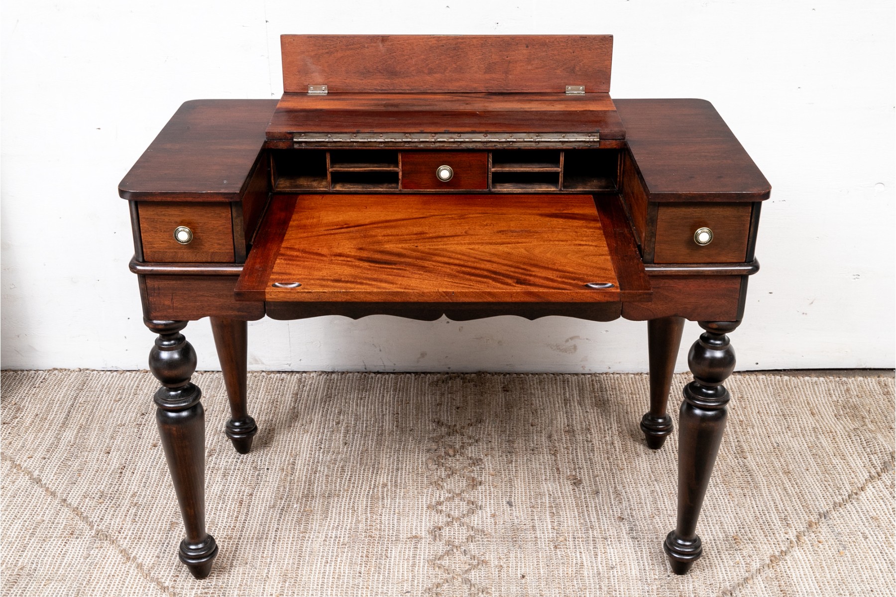 A rectangular secretary with a center hinged lift top desk with figured wood writing surface and cubby holes and a drawer inside. Flanked by two short drawers above the scalloped frieze. Raised on heavy dark stained turned legs.