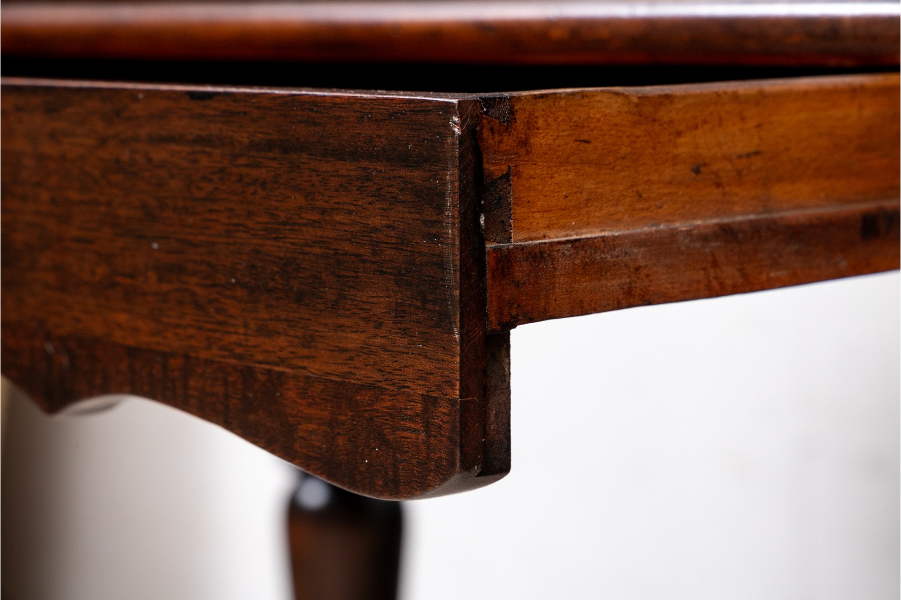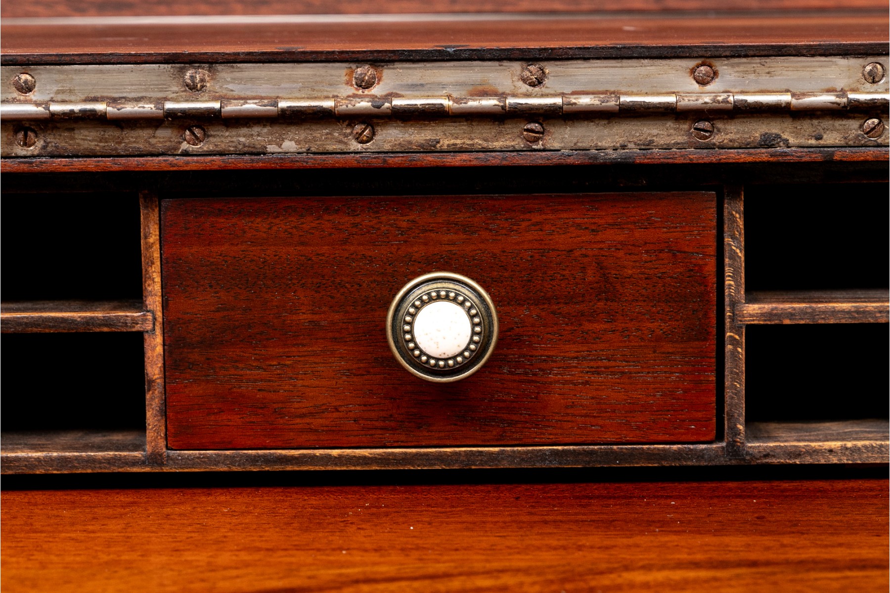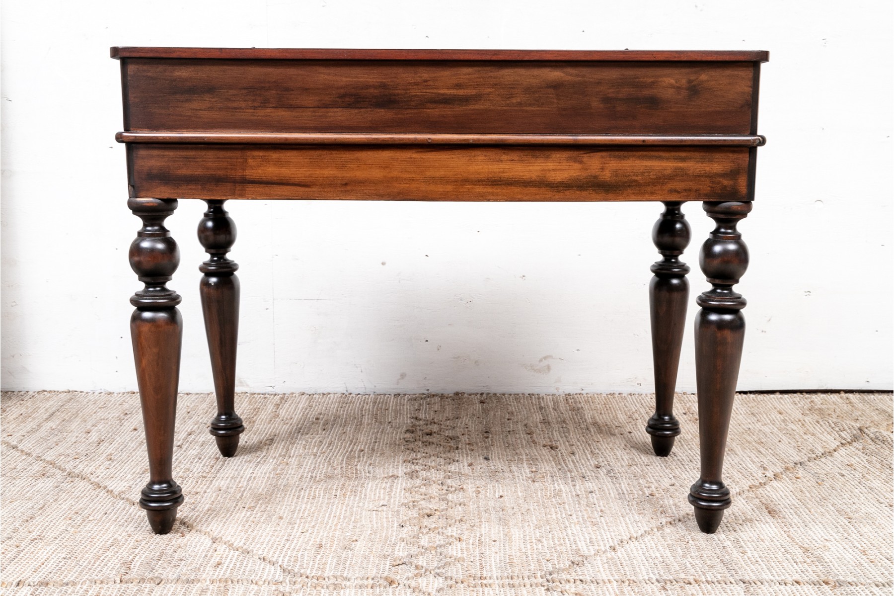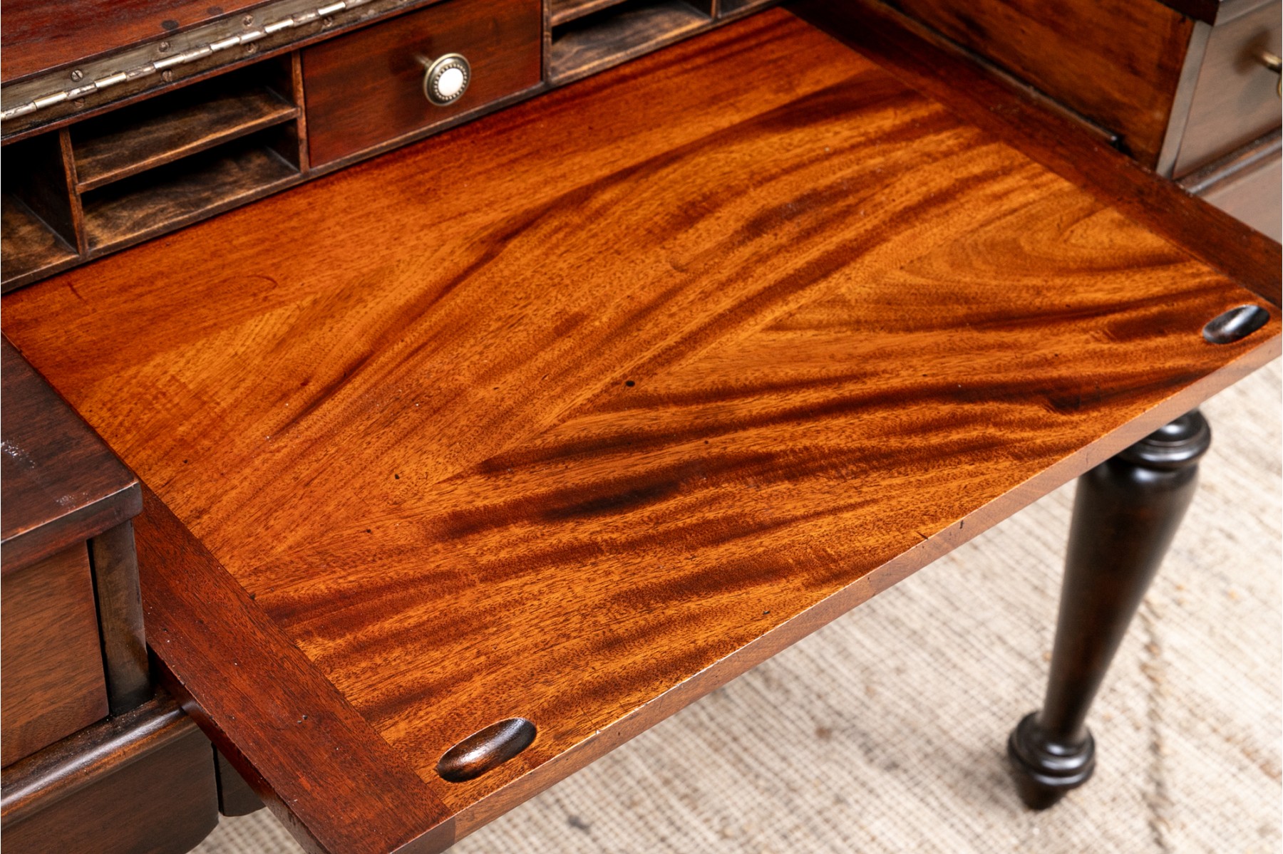 A rectangular secretary with a center hinged lift top desk with figured wood writing surface and cubby holes and a drawer inside. Flanked by two short drawers above the scalloped frieze. Raised on heavy dark stained turned legs.
