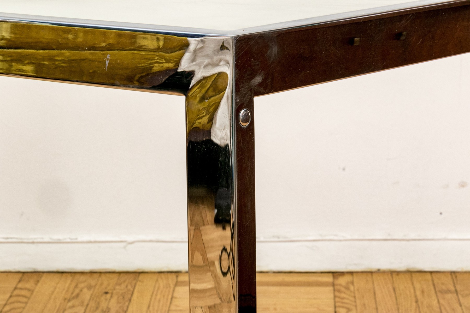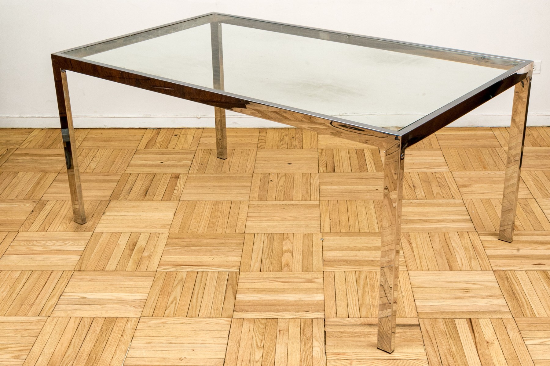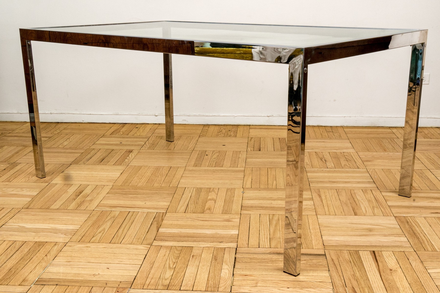 Awesome chromed steel frame with glass top give an overall sleek and modern aesthetic, harmonizing the wonder of minimalistic construction with the allure of eye popping mediums including chrome and glass.