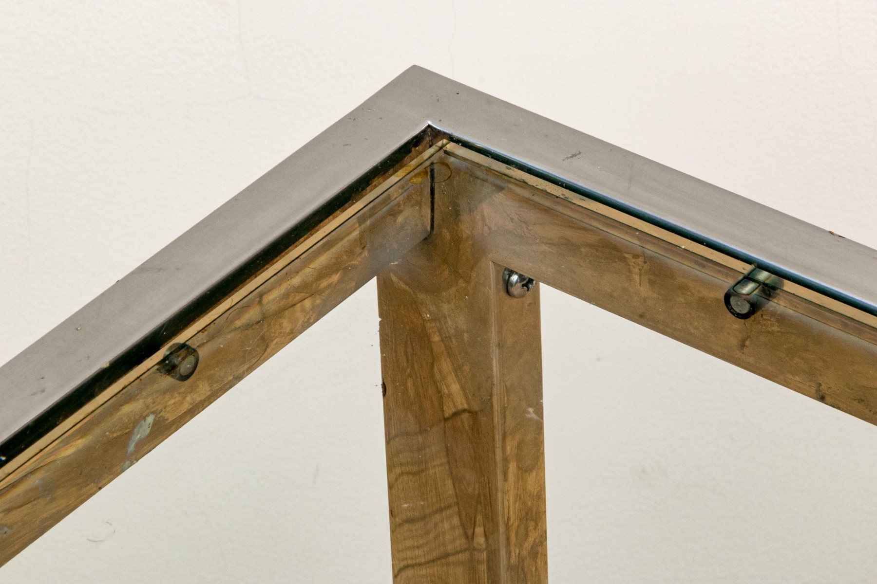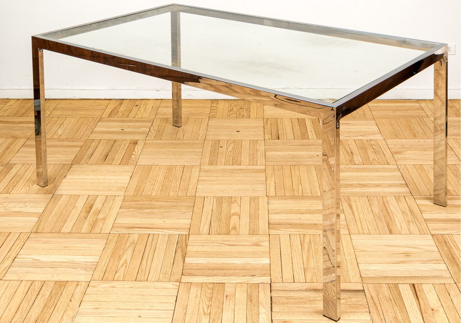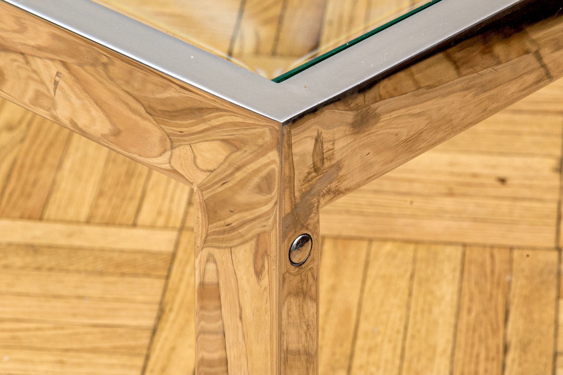 Awesome chromed steel frame with glass top give an overall sleek and modern aesthetic, harmonizing the wonder of minimalistic construction with the allure of eye popping mediums including chrome and glass.