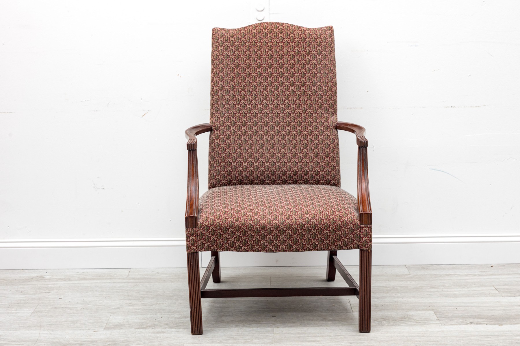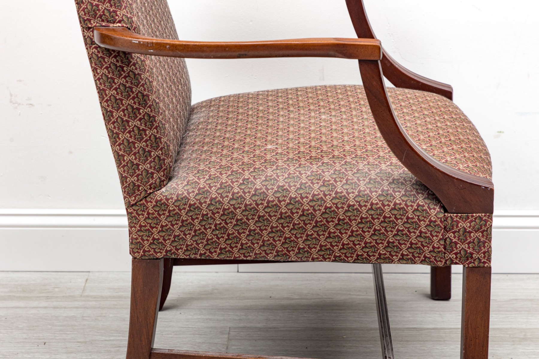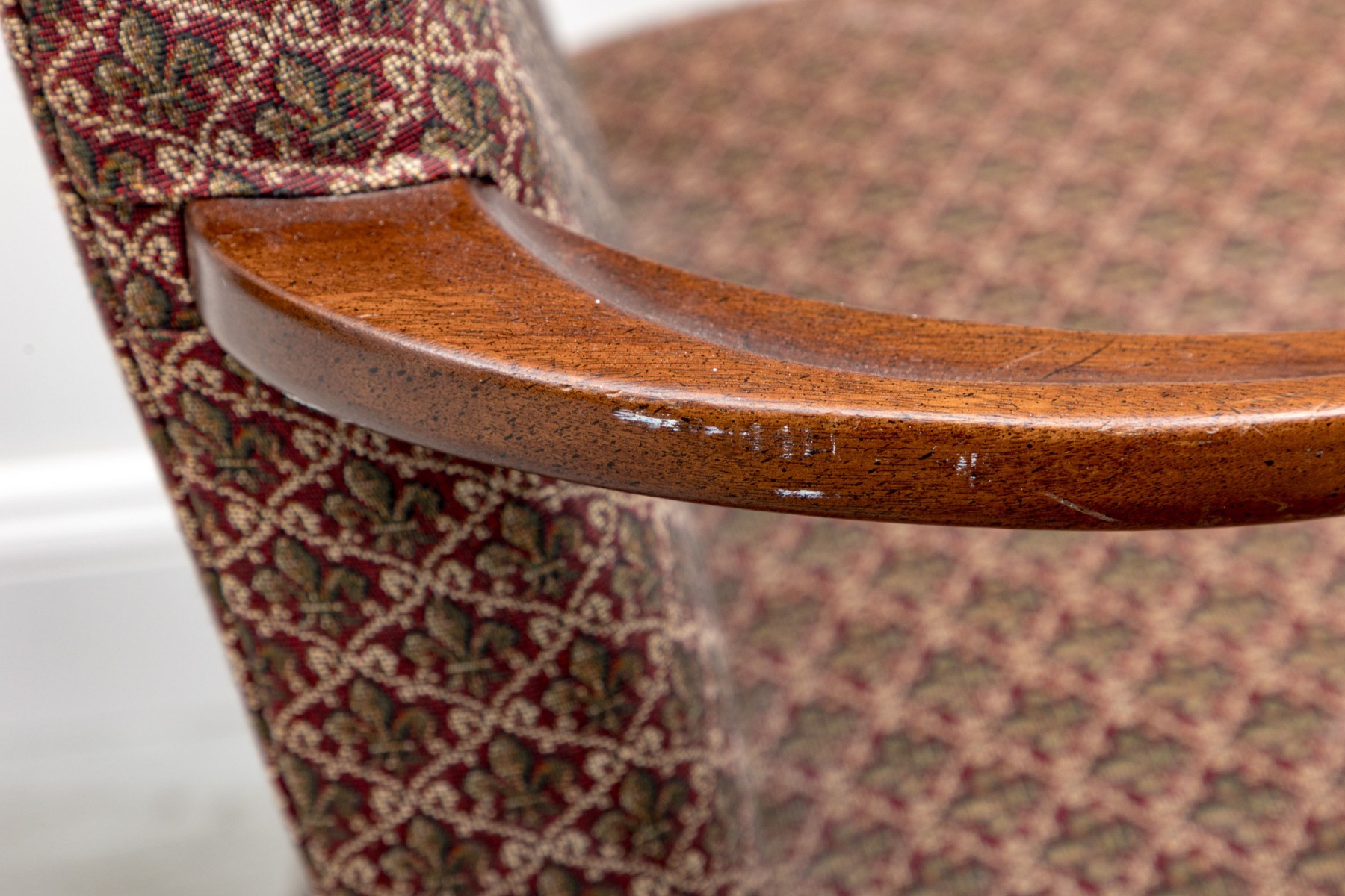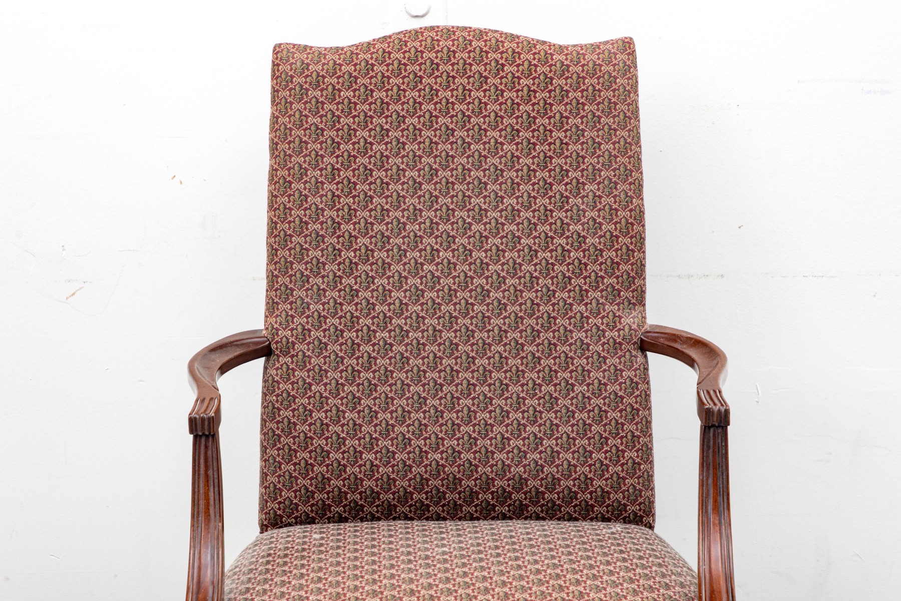 This vintage "lolling" chair — also known as a Martha Washington chair, displays a high flat back, red Fleur-de-lis upholstery on seat and back, and open arms framed in mahogany,