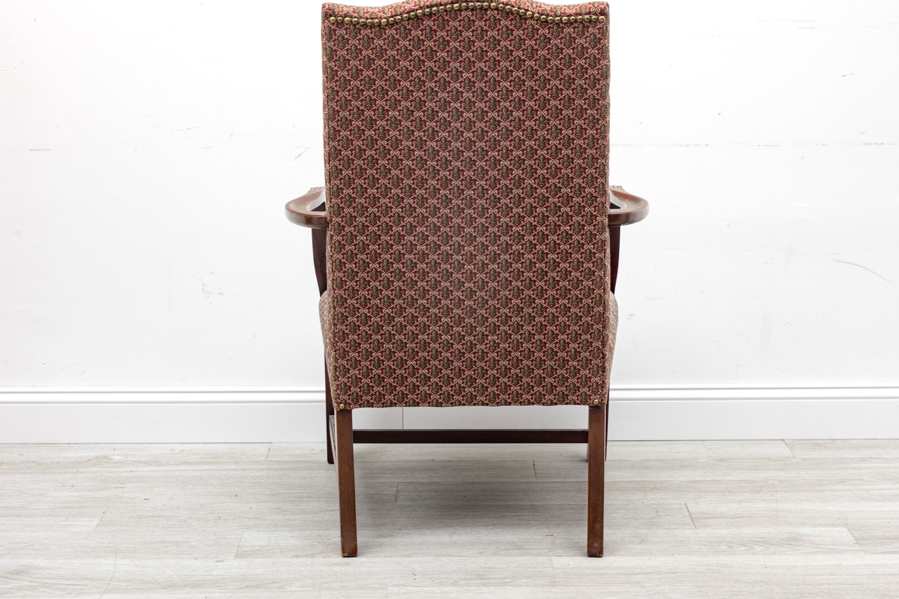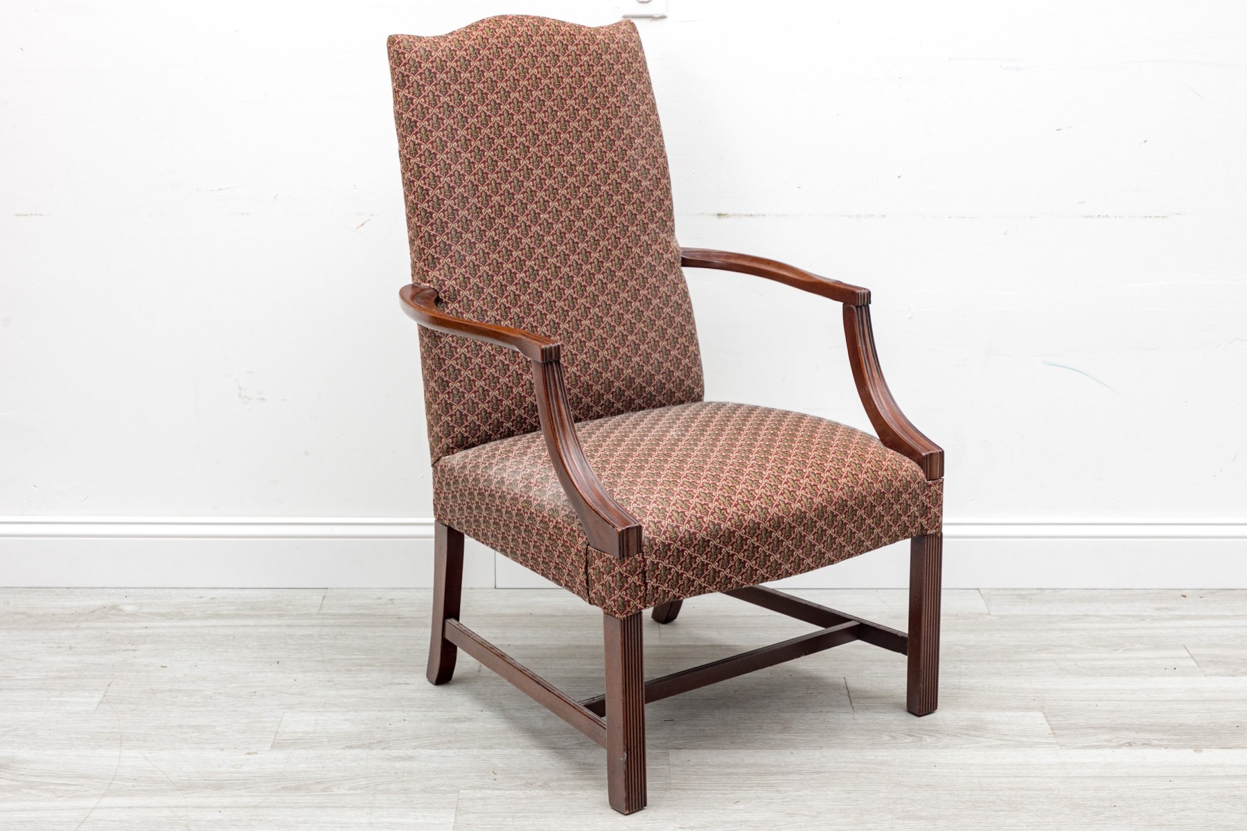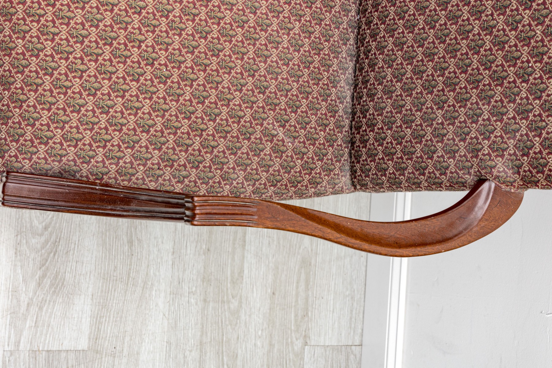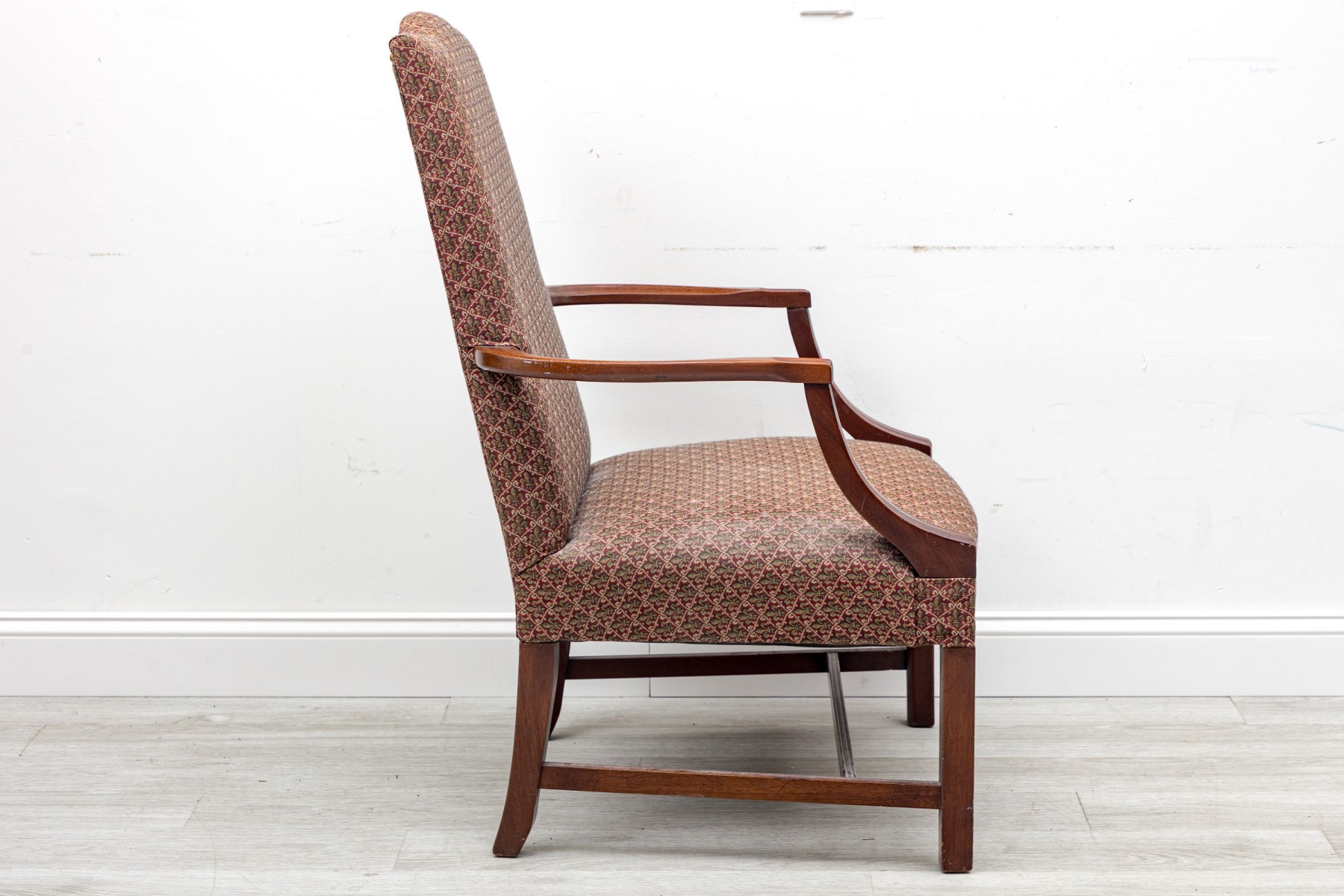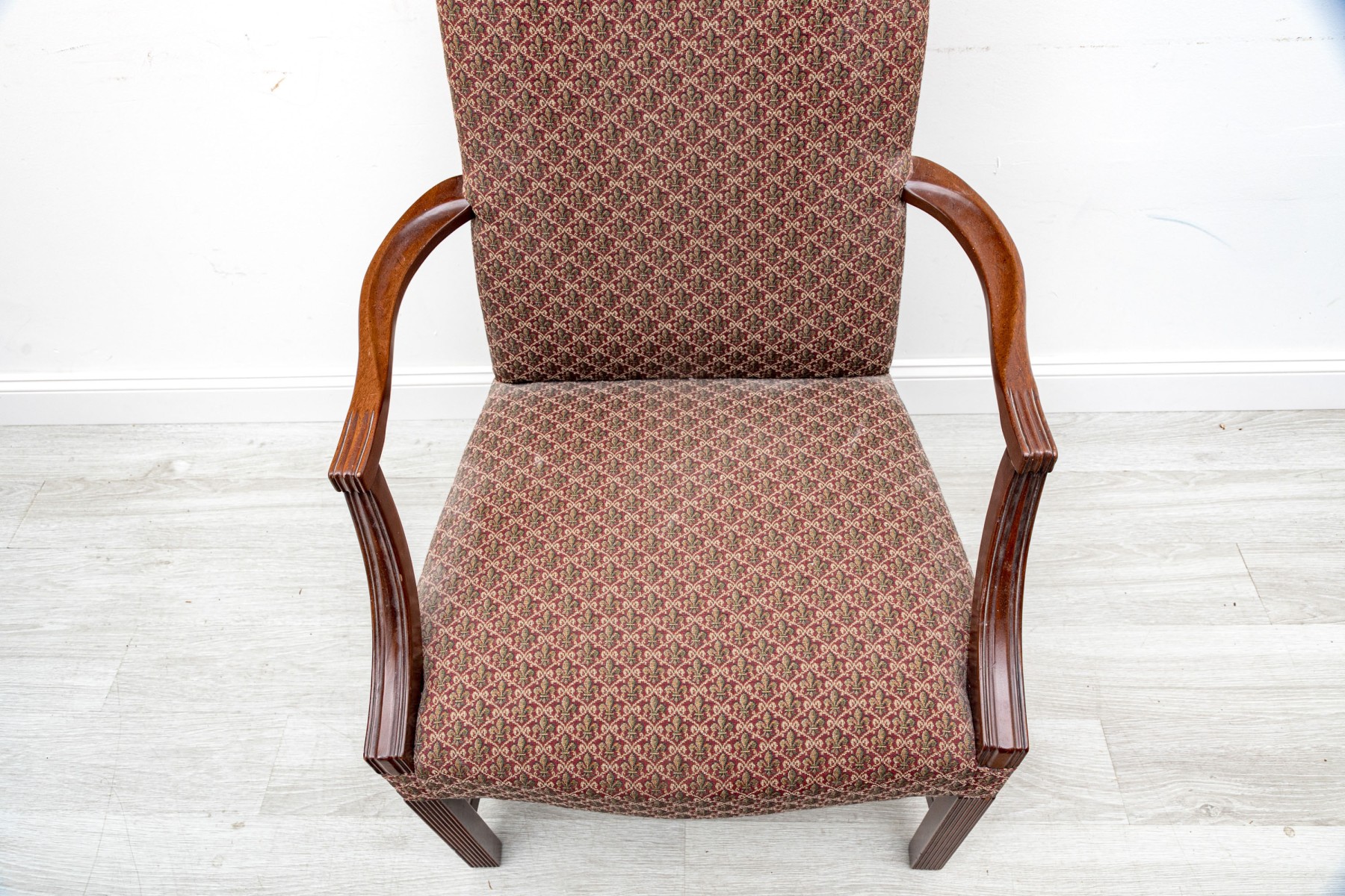 This vintage "lolling" chair — also known as a Martha Washington chair, displays a high flat back, red Fleur-de-lis upholstery on seat and back, and open arms framed in mahogany,