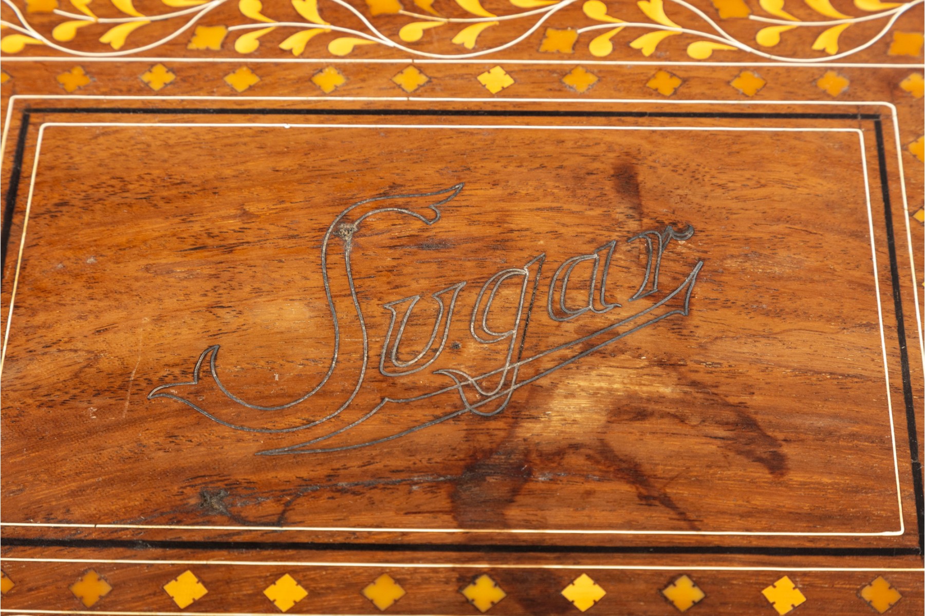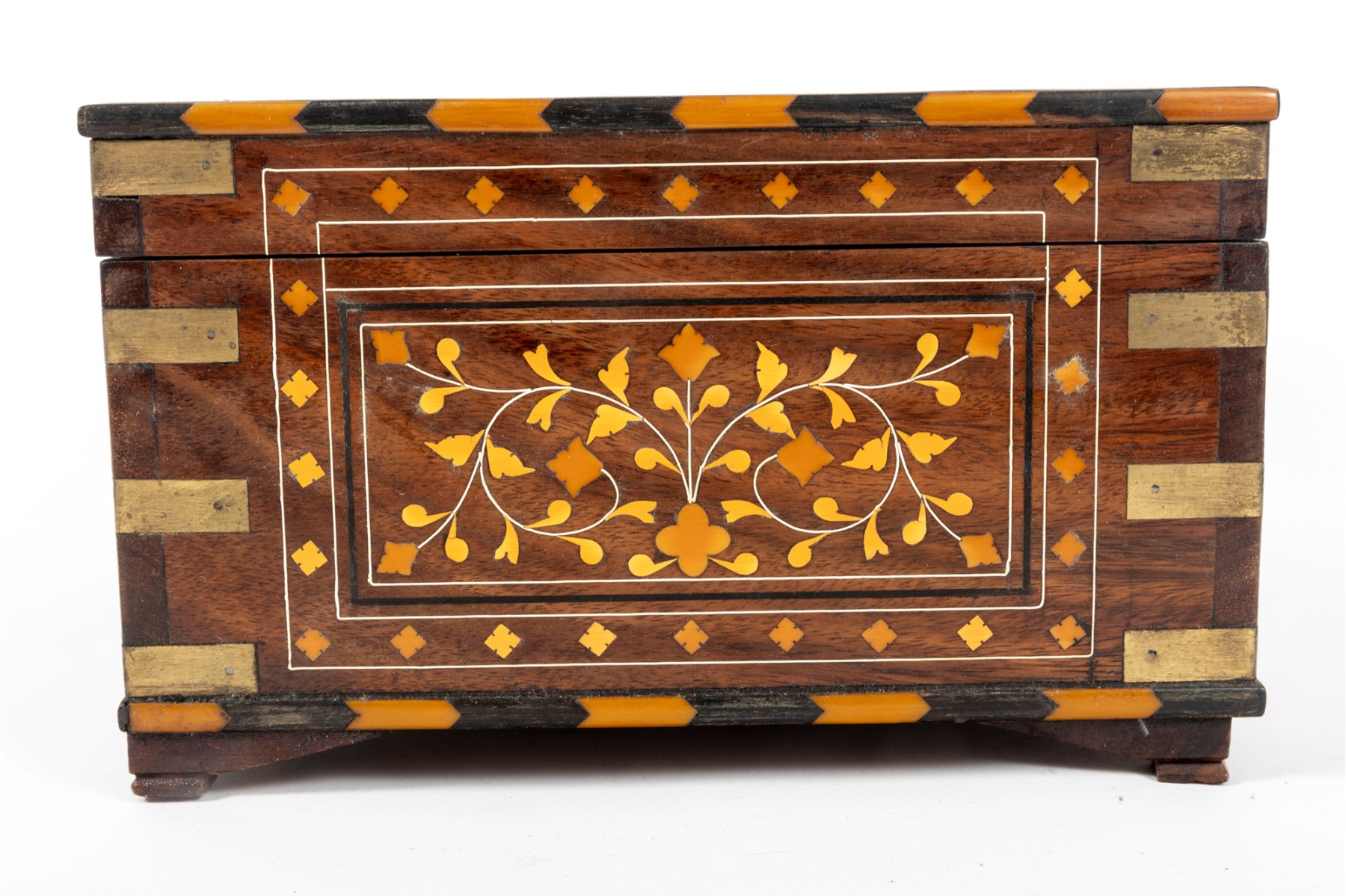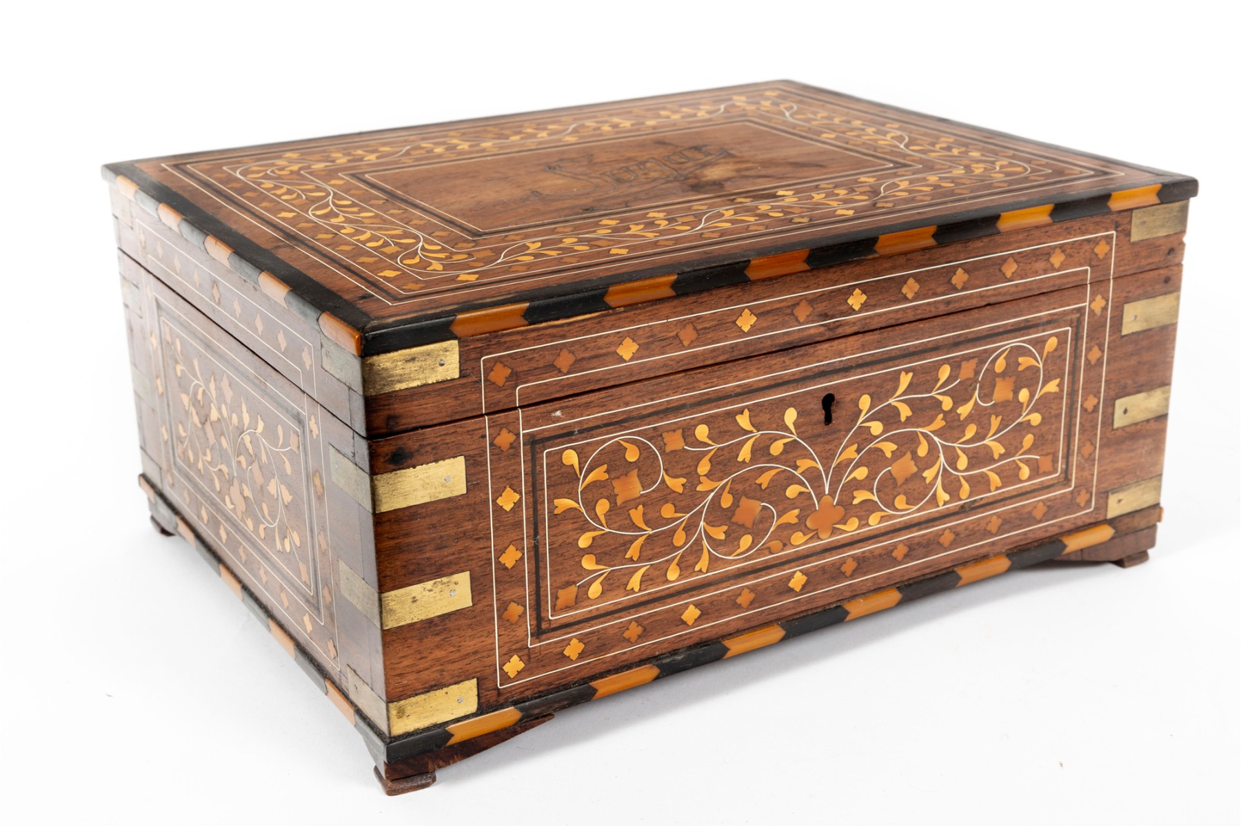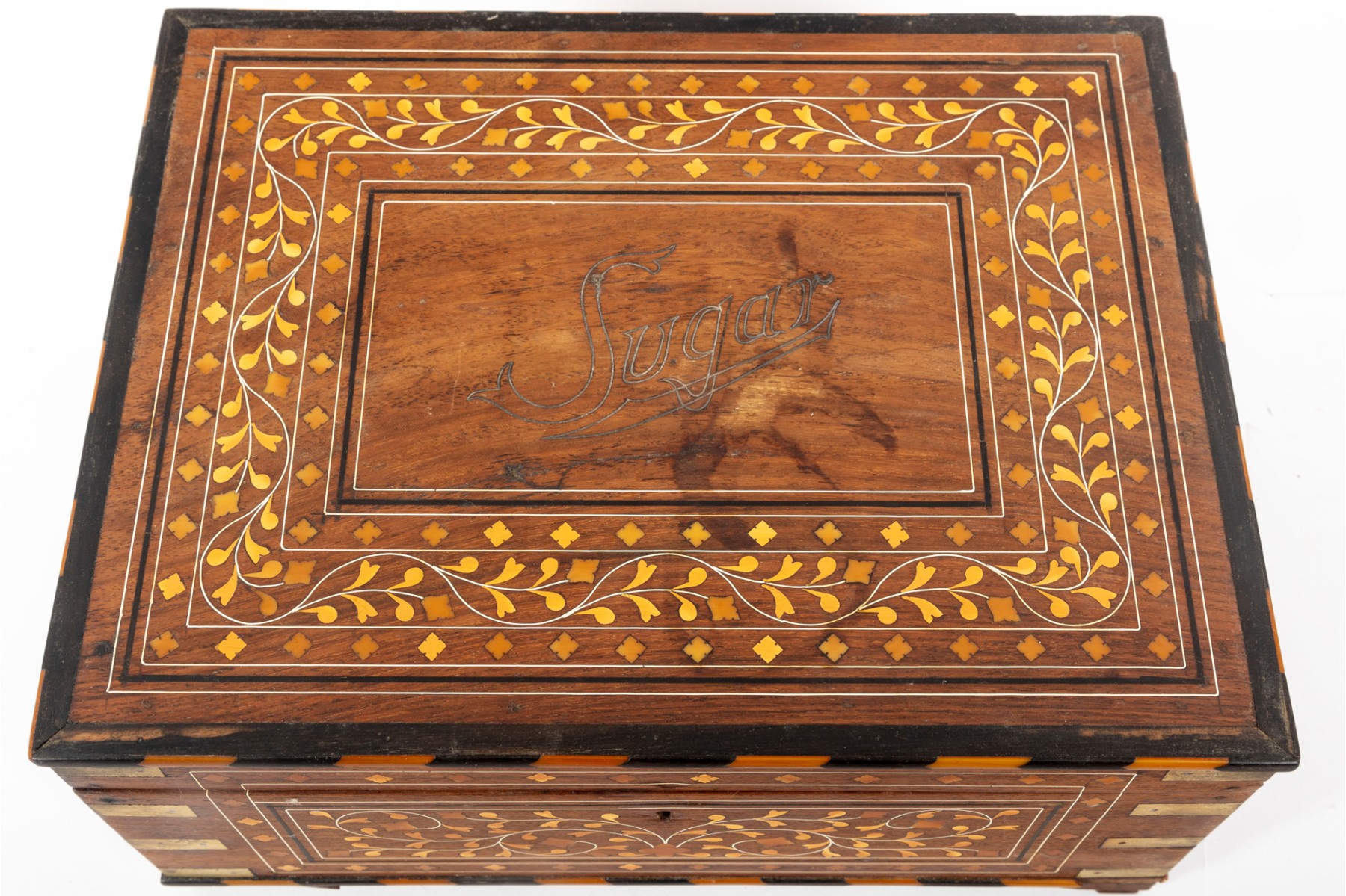 A wooden marquetry jewelry box, Moroccan inspired, heavily inlaid in sprawling florals and foliates outlined in black/white with "Sugar" emblazoned in steel. Additionally features brass brackets, a removable divided wood insert, and a felt lined storage area hidden behind a roll-top mechanism. Amazing quality piece, circa early 20th century.