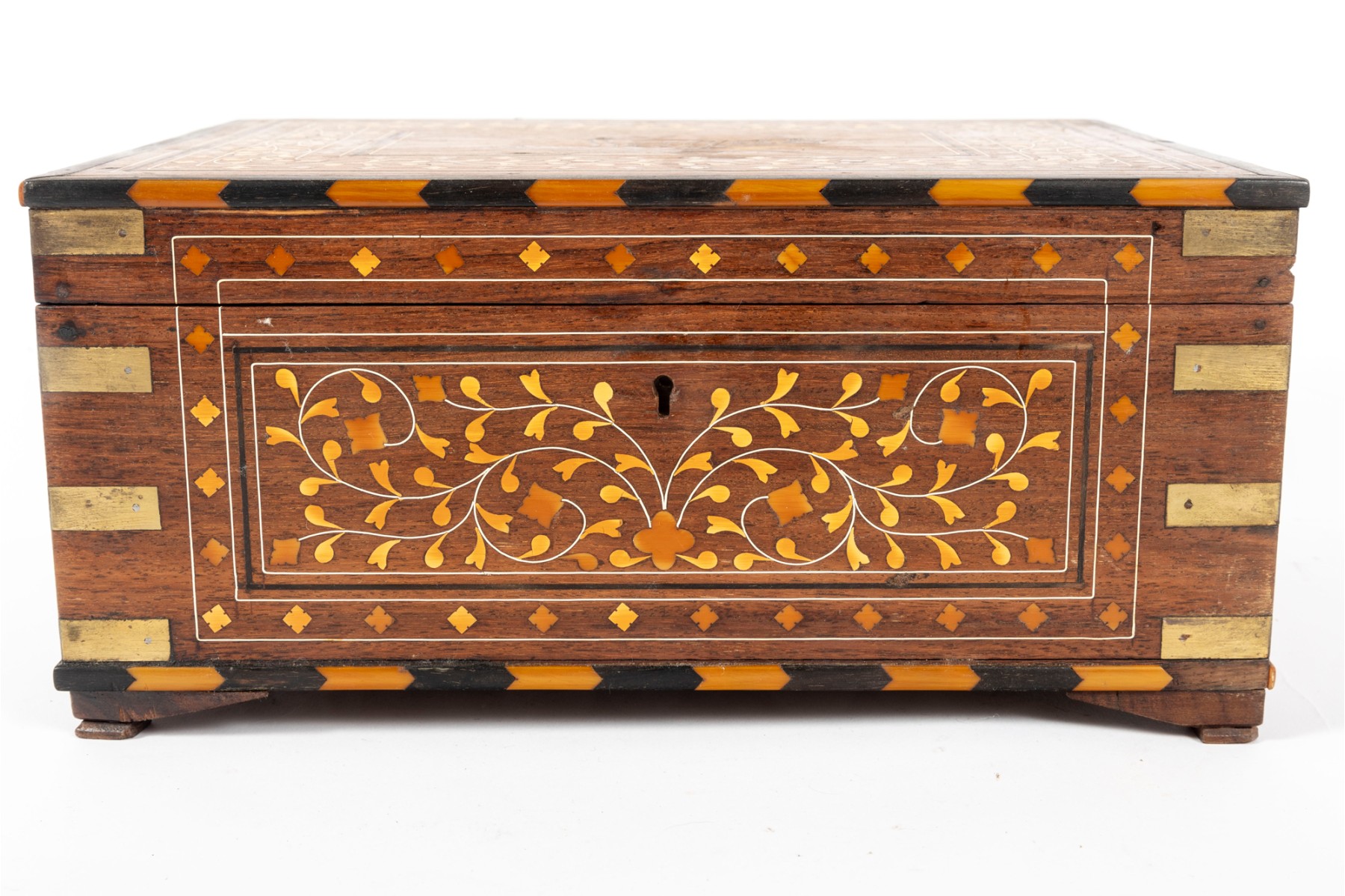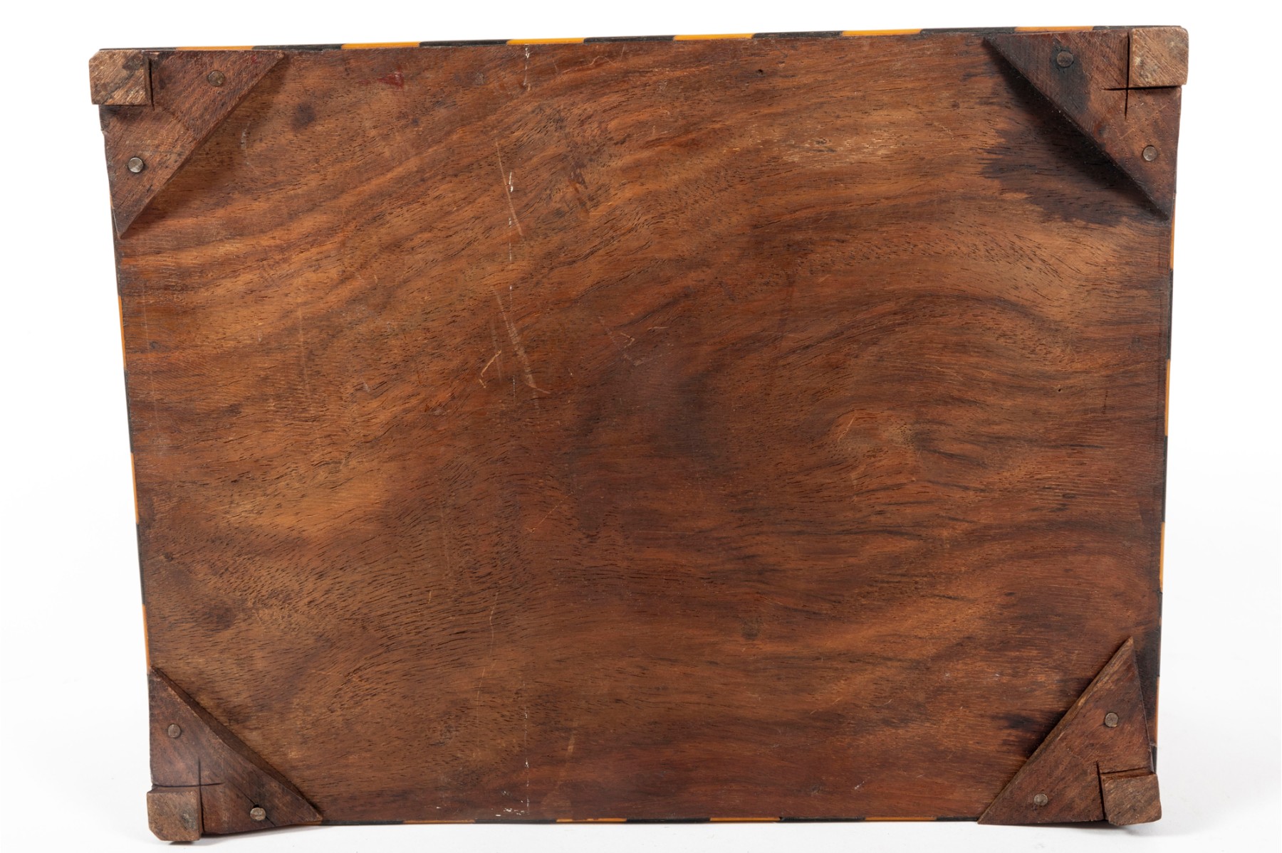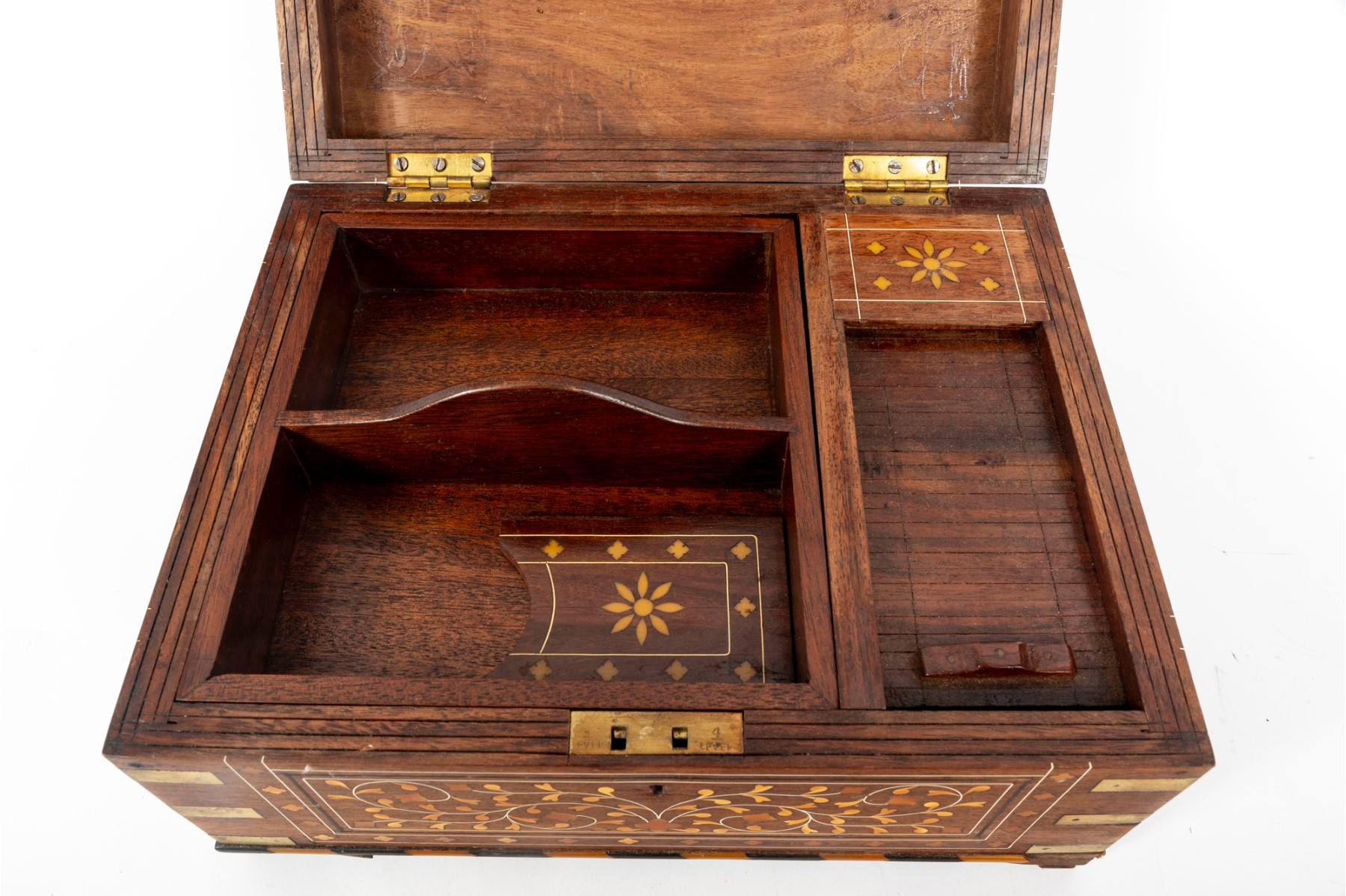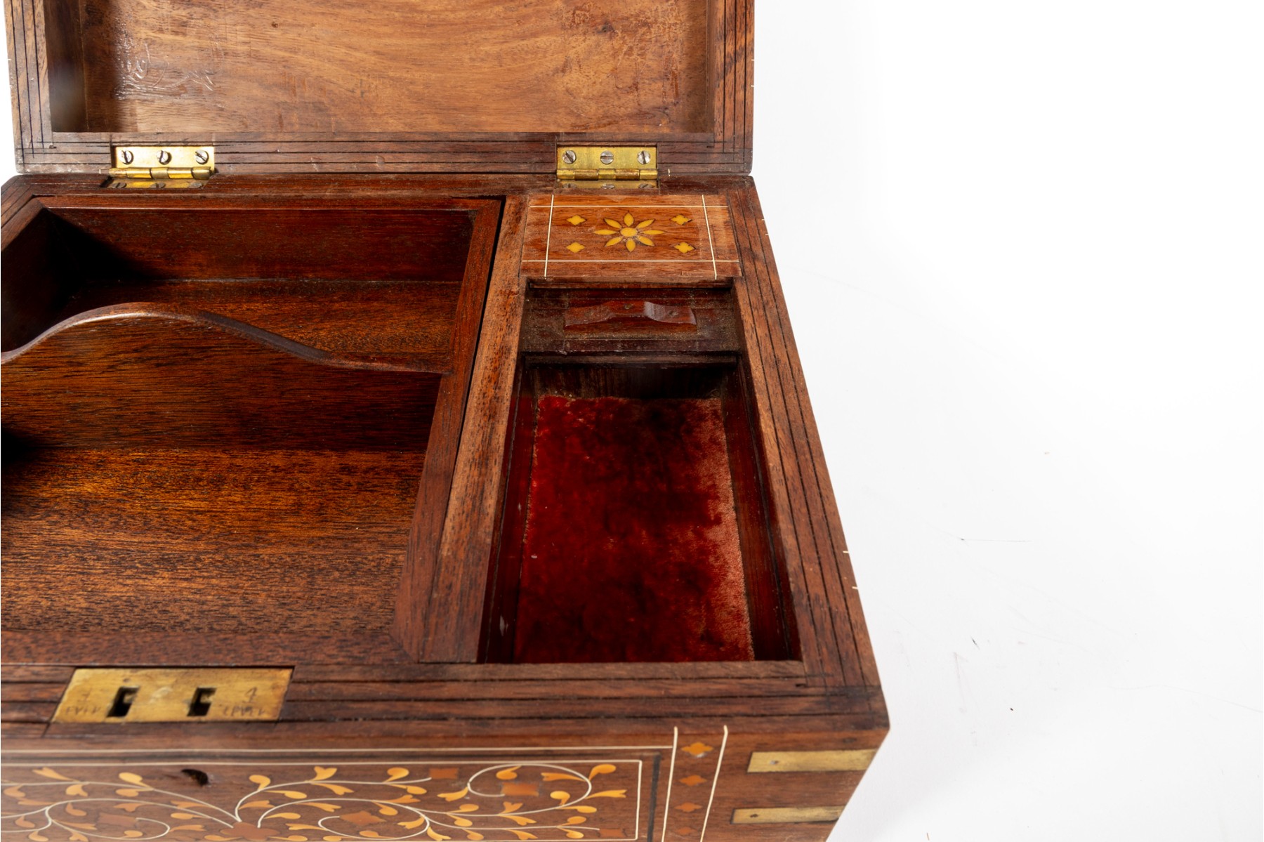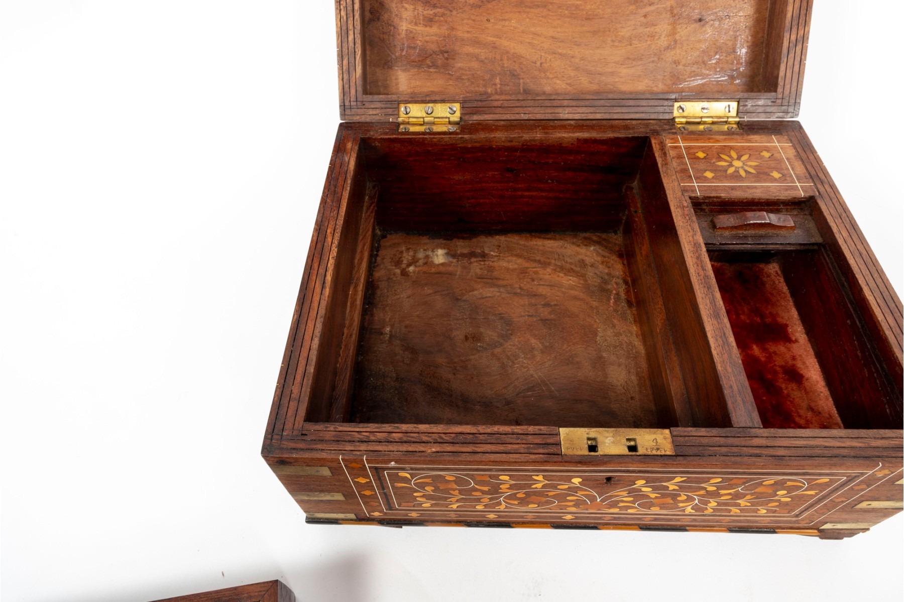 A wooden marquetry jewelry box, Moroccan inspired, heavily inlaid in sprawling florals and foliates outlined in black/white with "Sugar" emblazoned in steel. Additionally features brass brackets, a removable divided wood insert, and a felt lined storage area hidden behind a roll-top mechanism. Amazing quality piece, circa early 20th century.