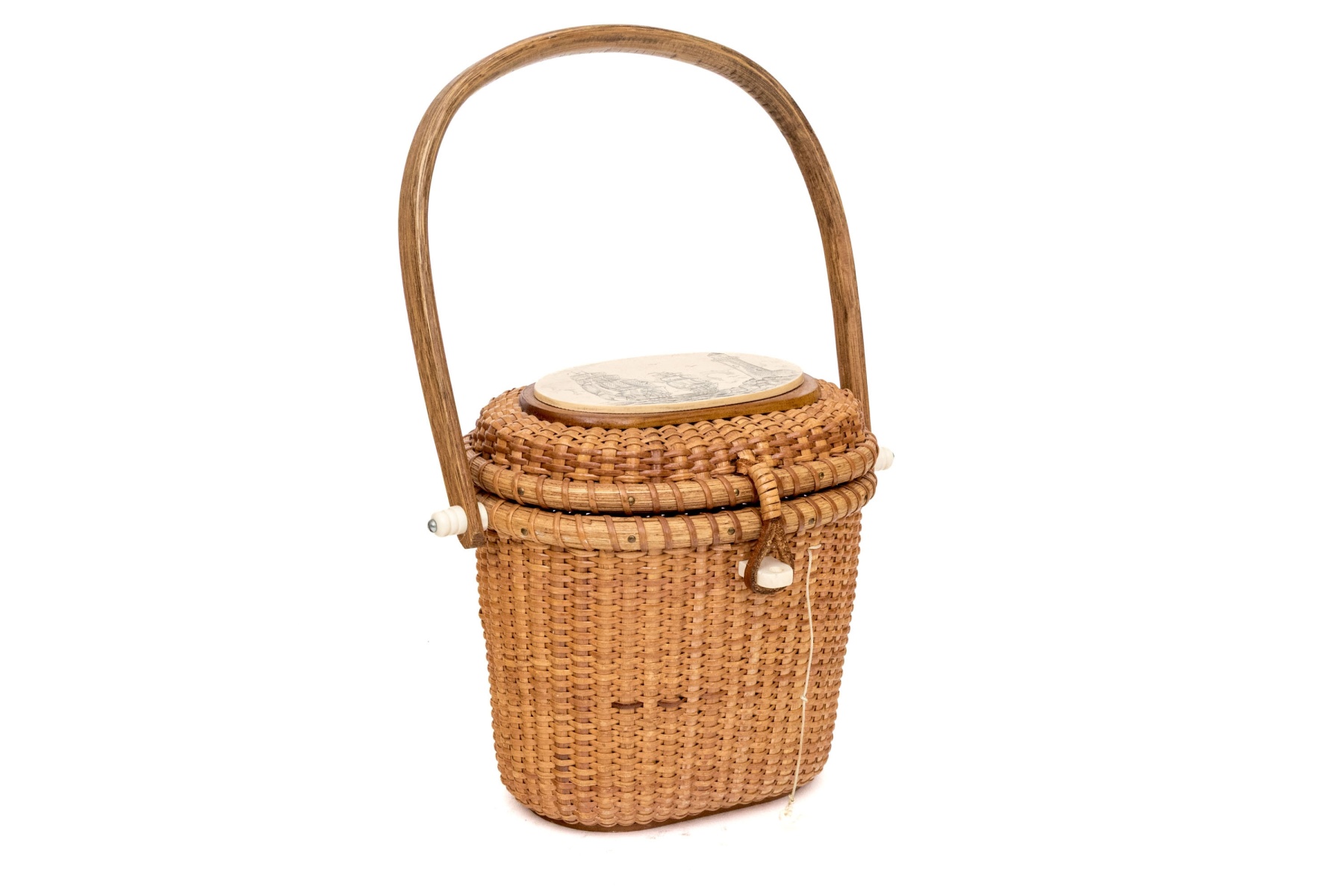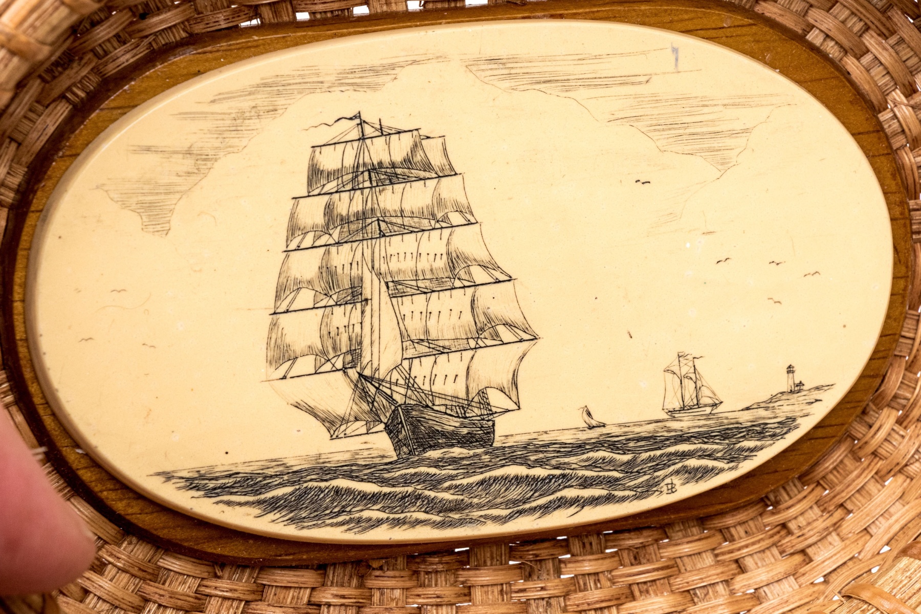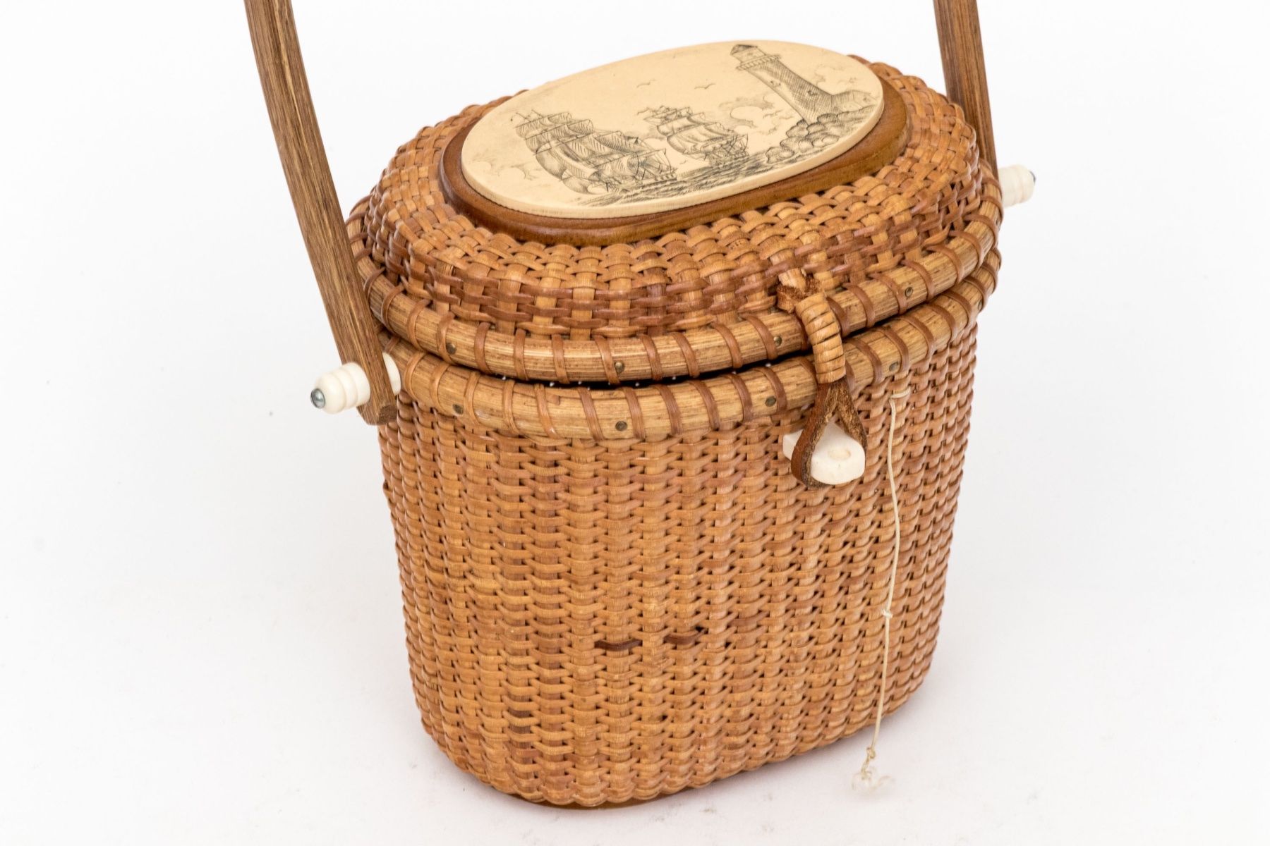 A charming vintage Nantucket basket purse in traditional design, showcasing a high-arched swing handle and an oval scrimshaw bone plaque on the hinged lid hand-detailed with scenes of clipper ships on the sea with lighthouses.