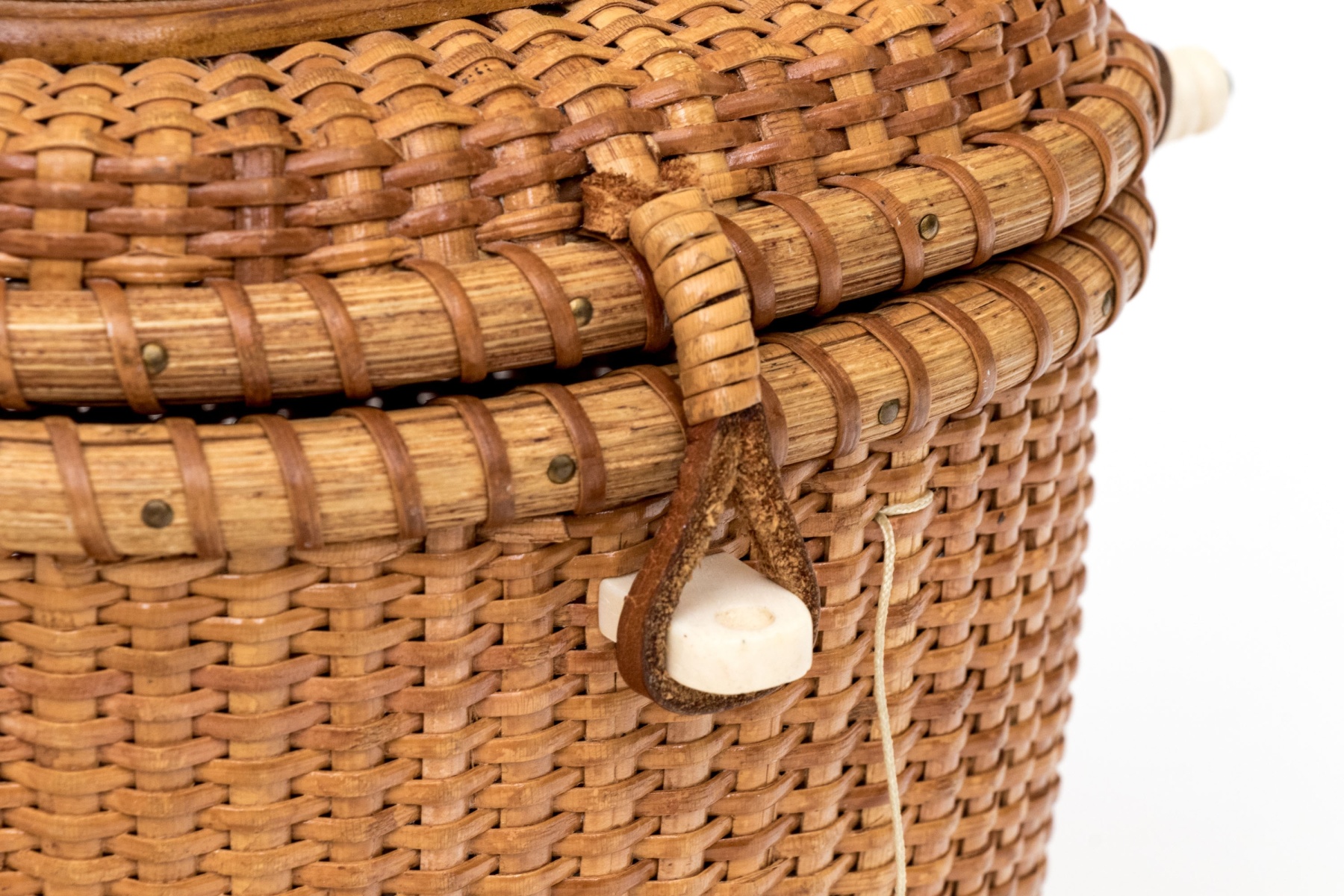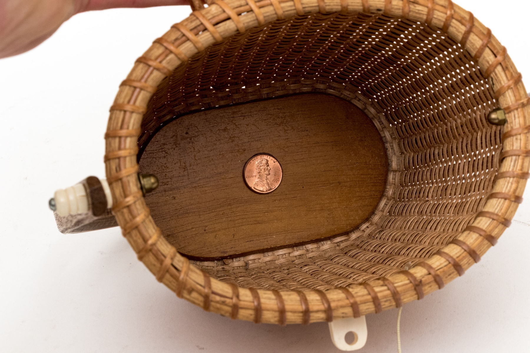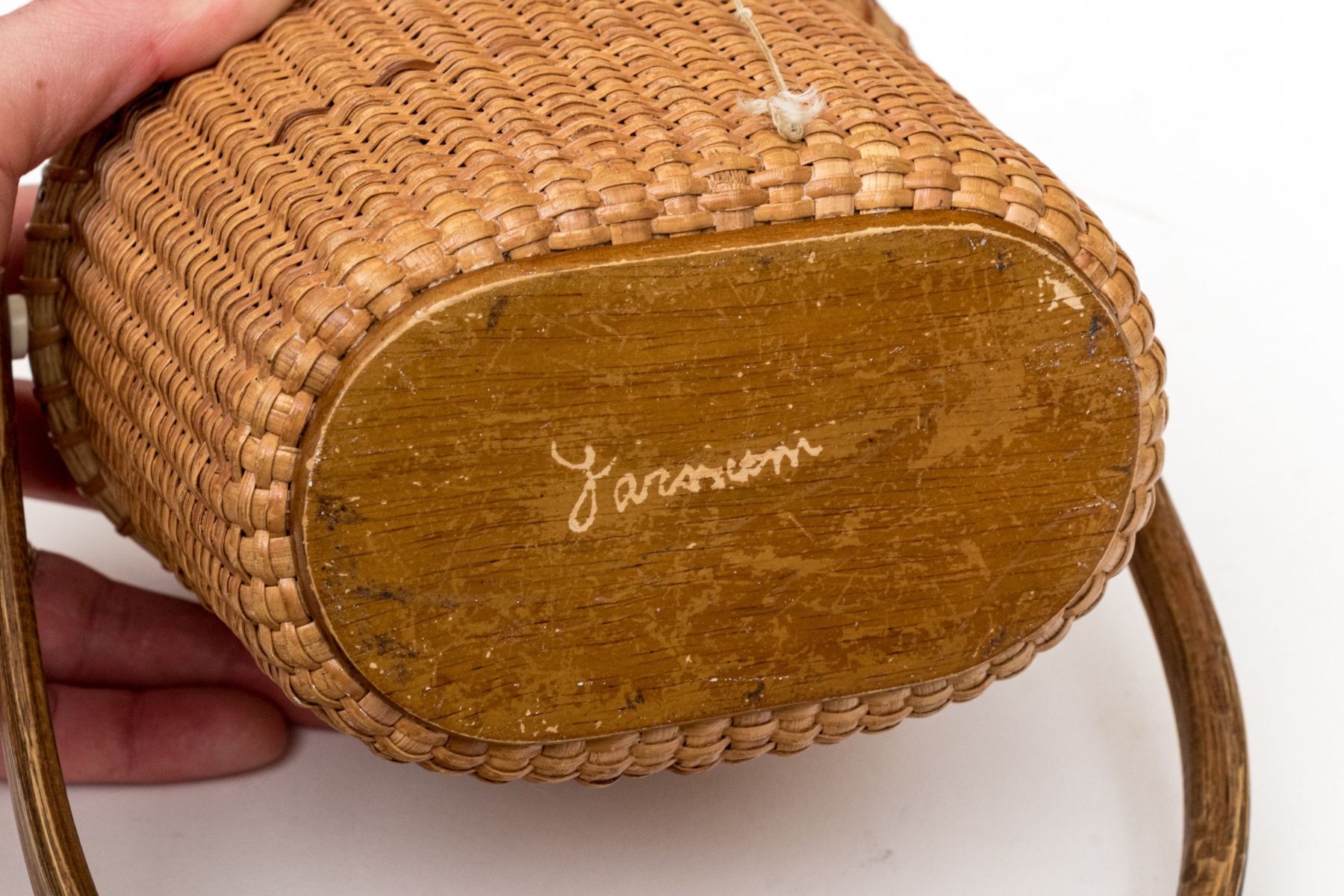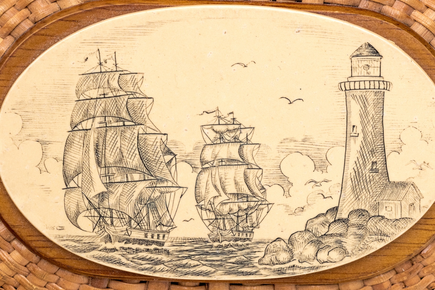 A charming vintage Nantucket basket purse in traditional design, showcasing a high-arched swing handle and an oval scrimshaw bone plaque on the hinged lid hand-detailed with scenes of clipper ships on the sea with lighthouses.