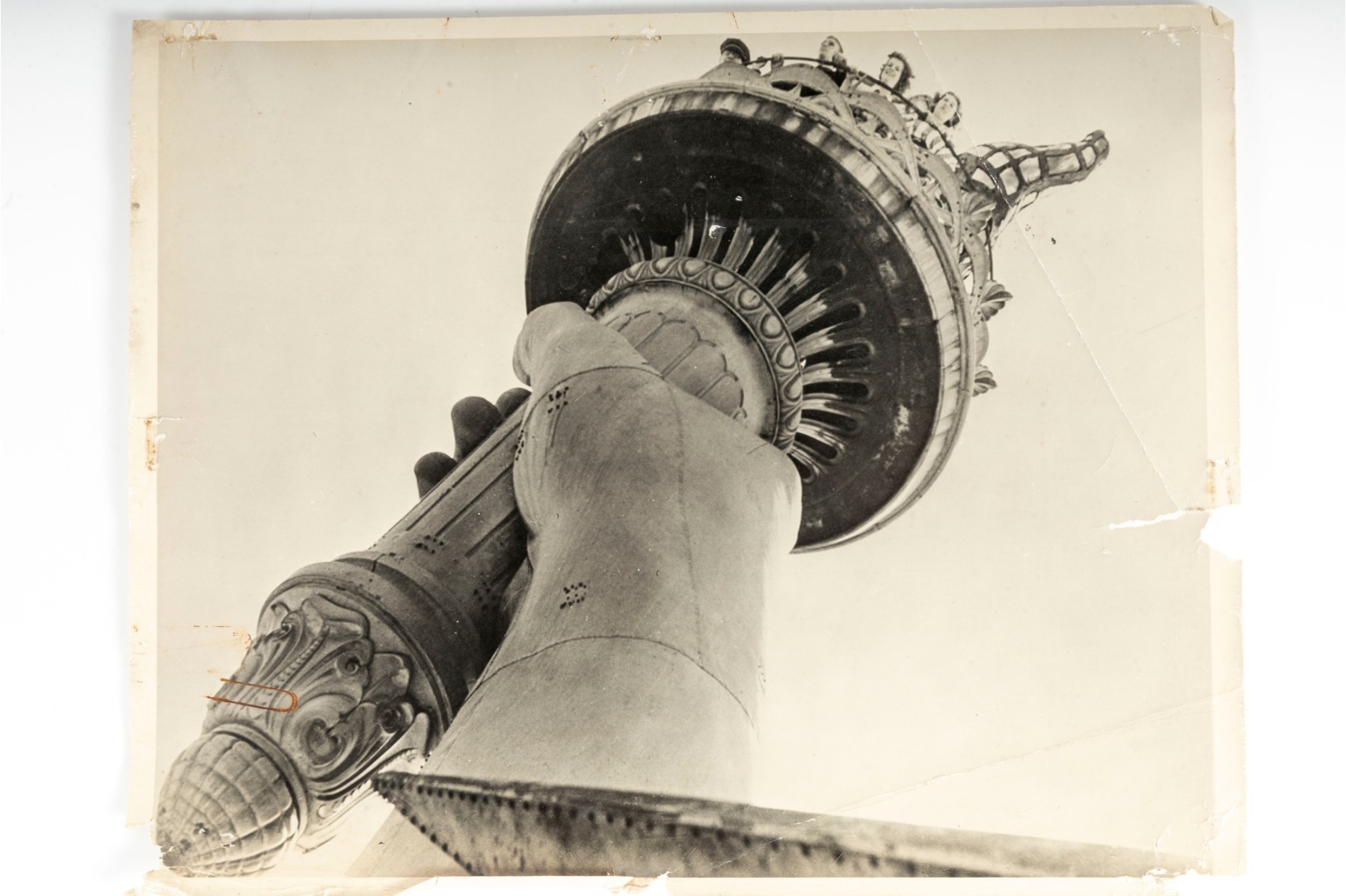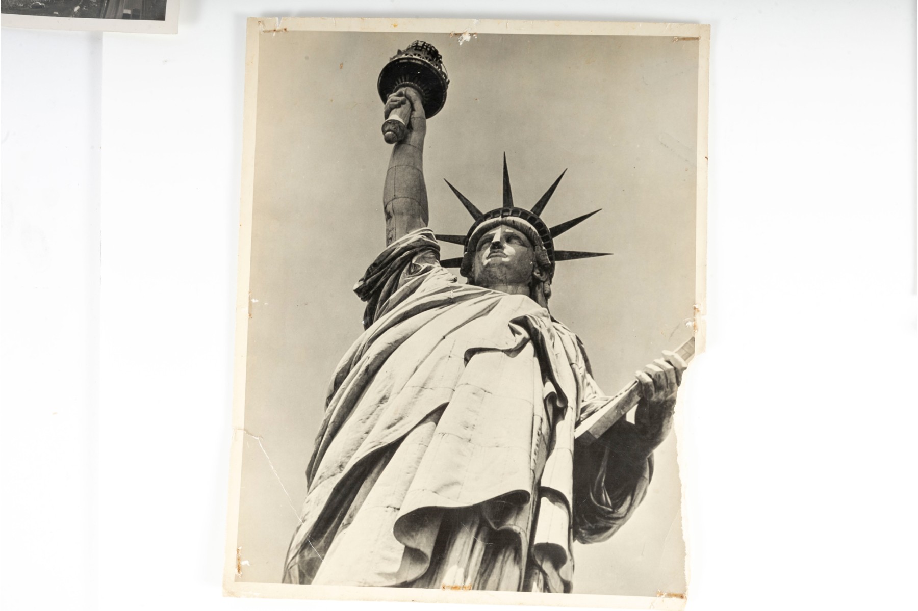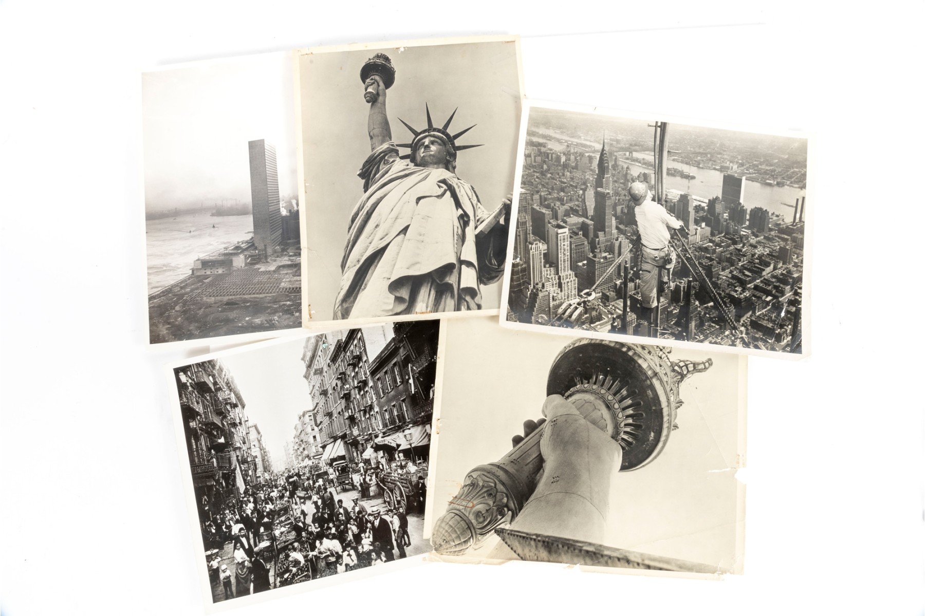 This collection of vintage photos captures iconic scenes of New York, including striking images of early Manhattan's construction and the Statue of Liberty. Five photos in total.