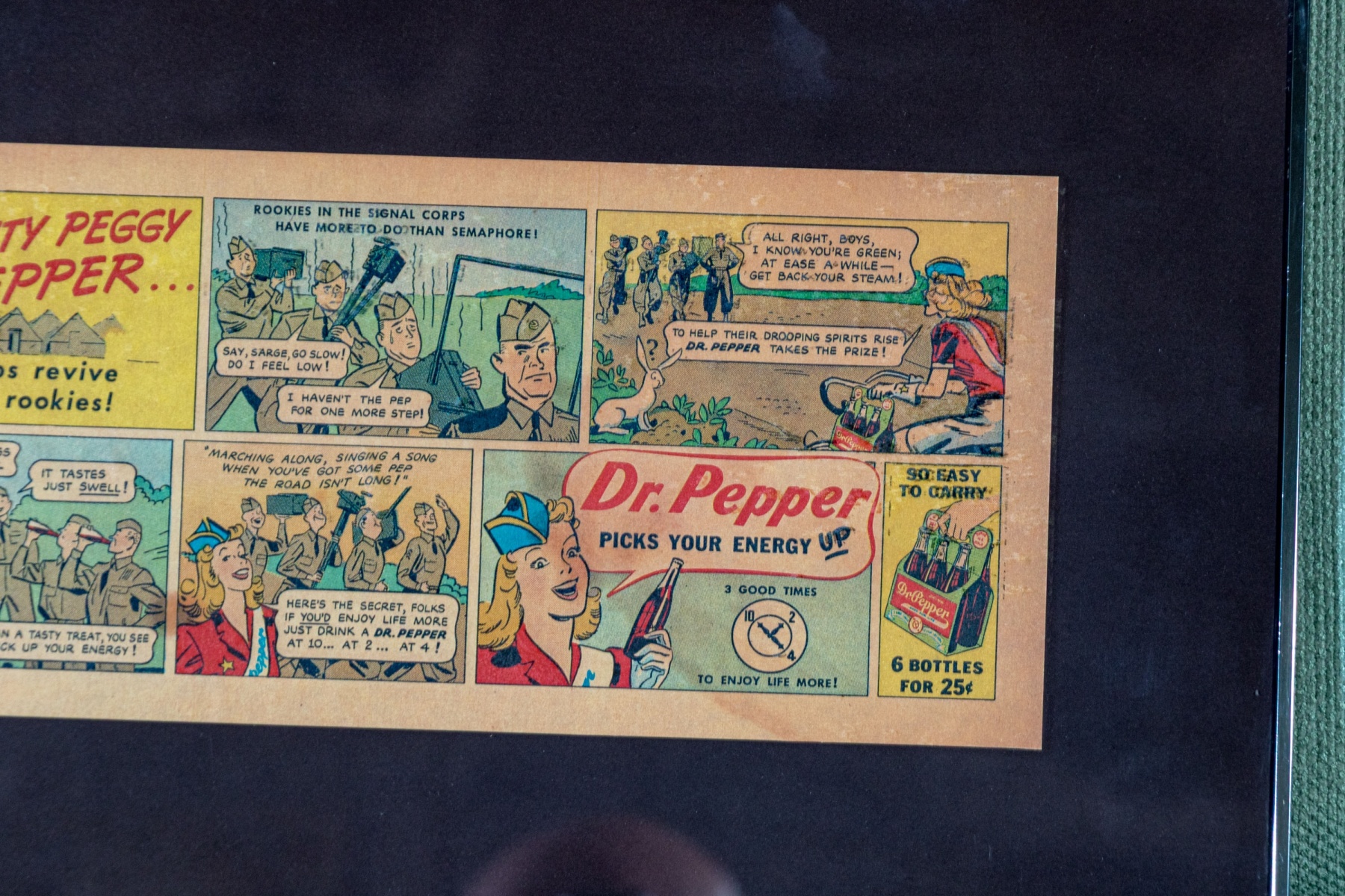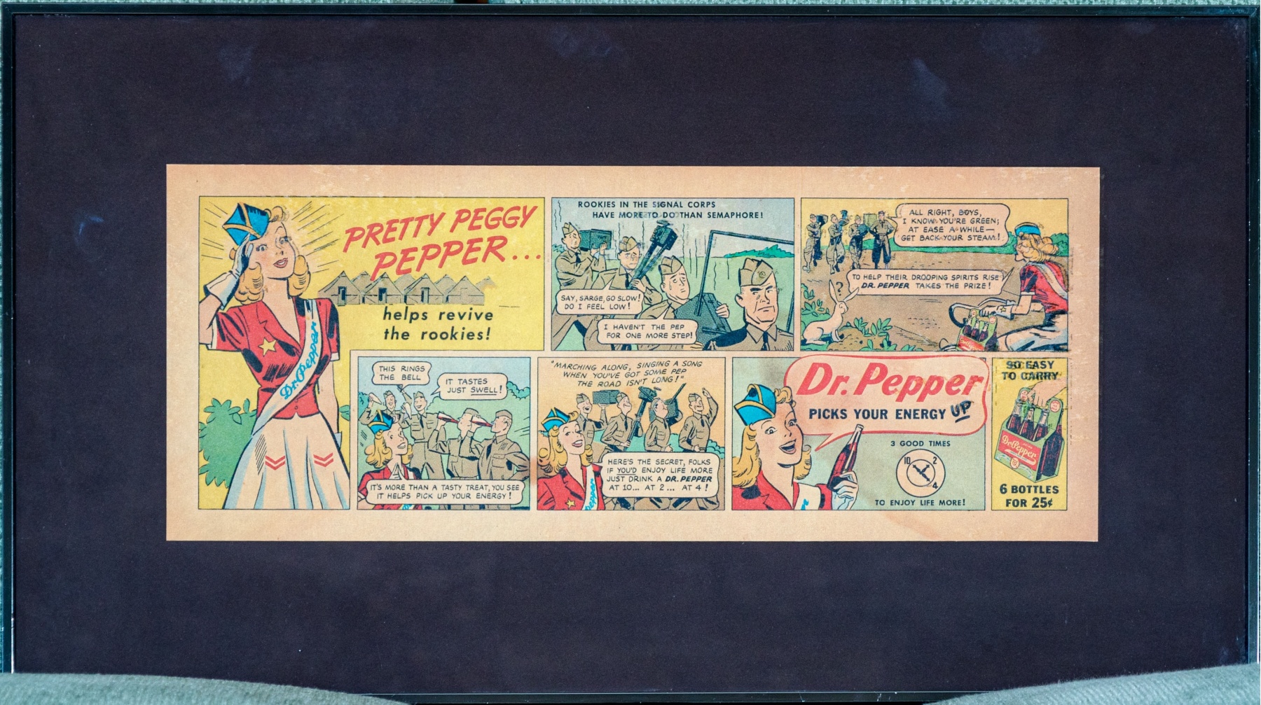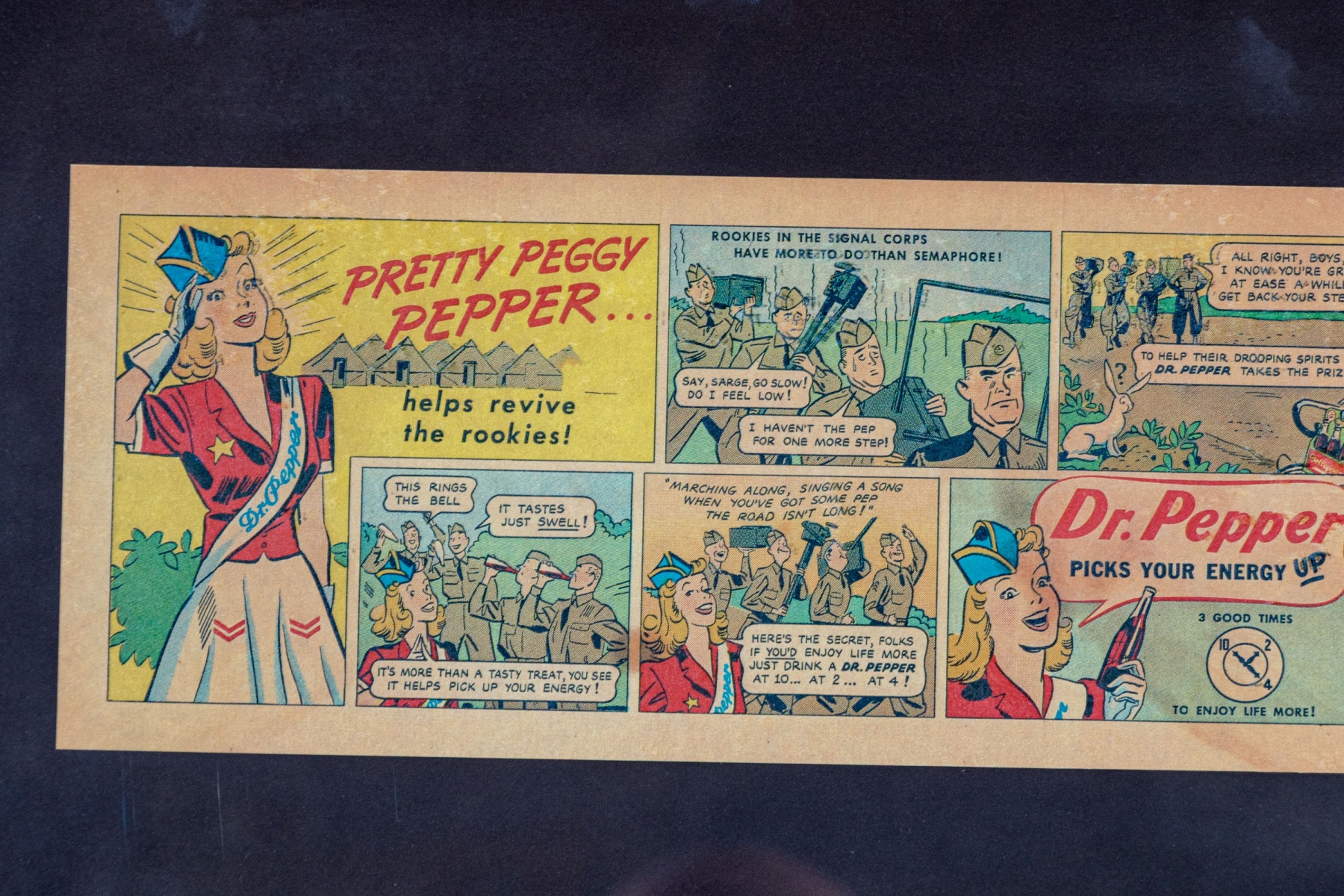 A fabulous newspaper clipping featuring a comic advertisement for Dr. Pepper "Pretty Peggy Pepper helps revive the rookies."