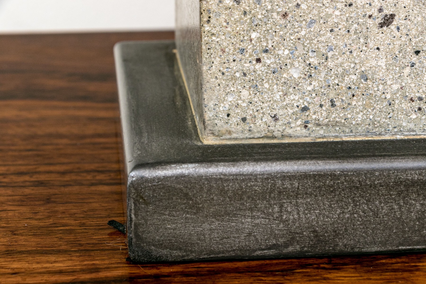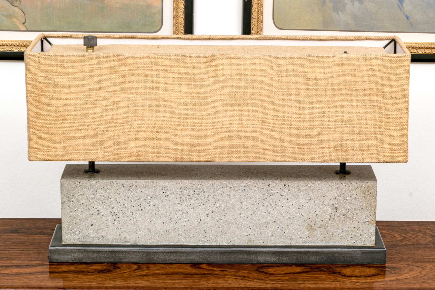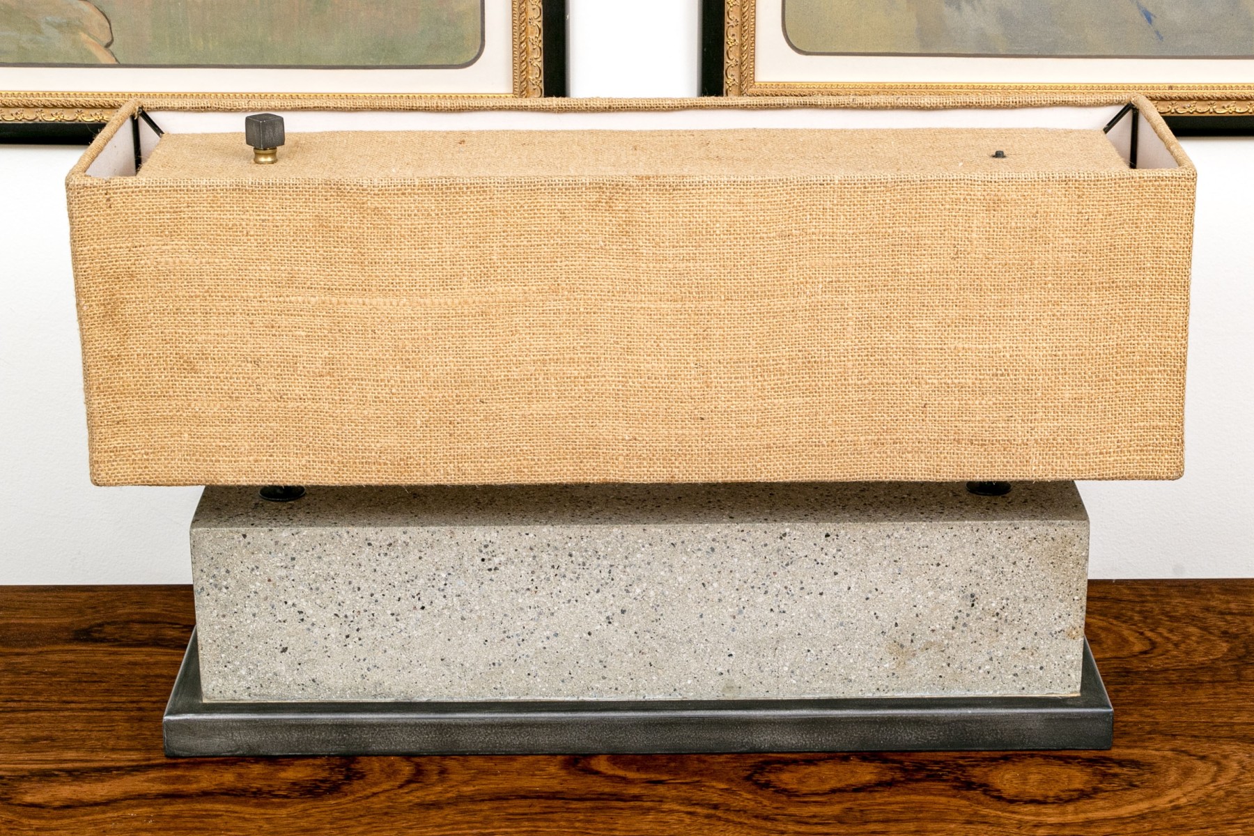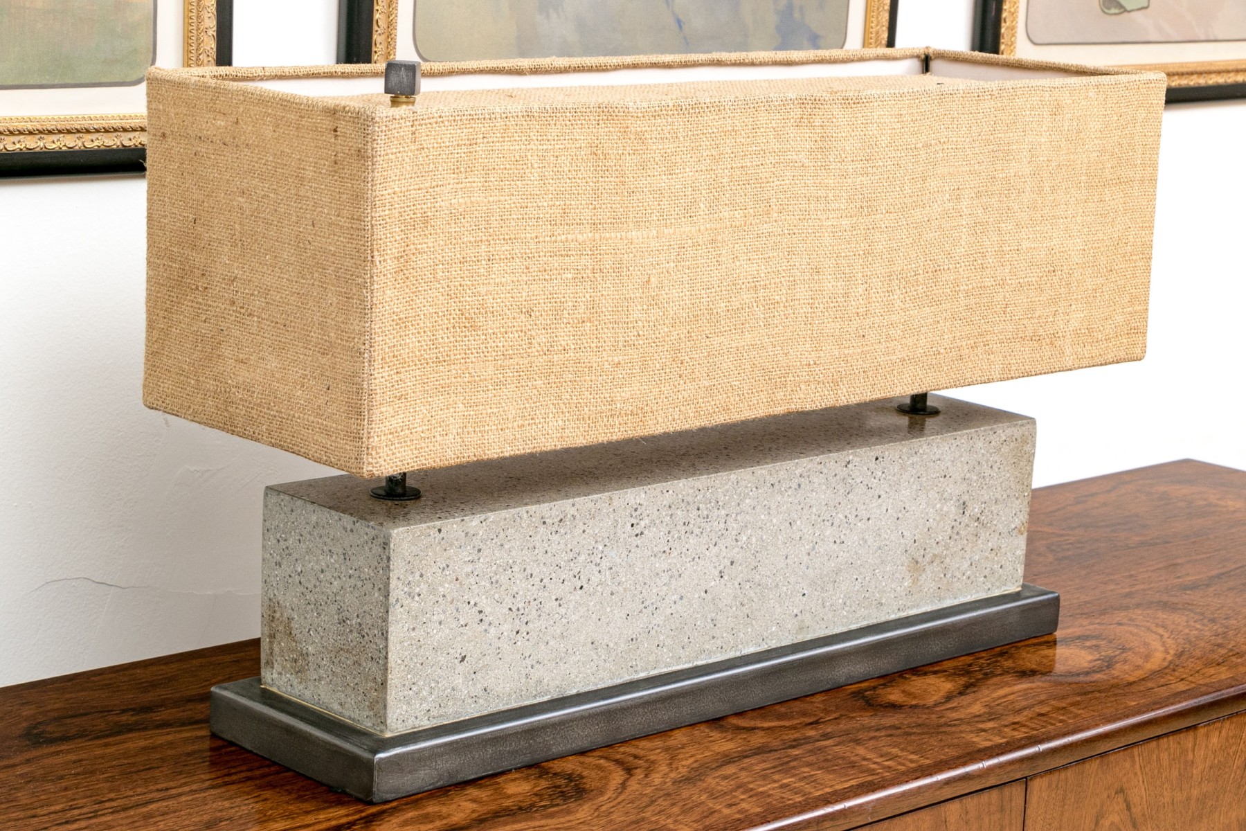 The Norris table lamp is fabulously sculptural in its aesthetic. The contemporary table lamp rests upon an iron base with polished concrete body. The table lamp has a wonderful burlap textured, rectangular shade with top cover.