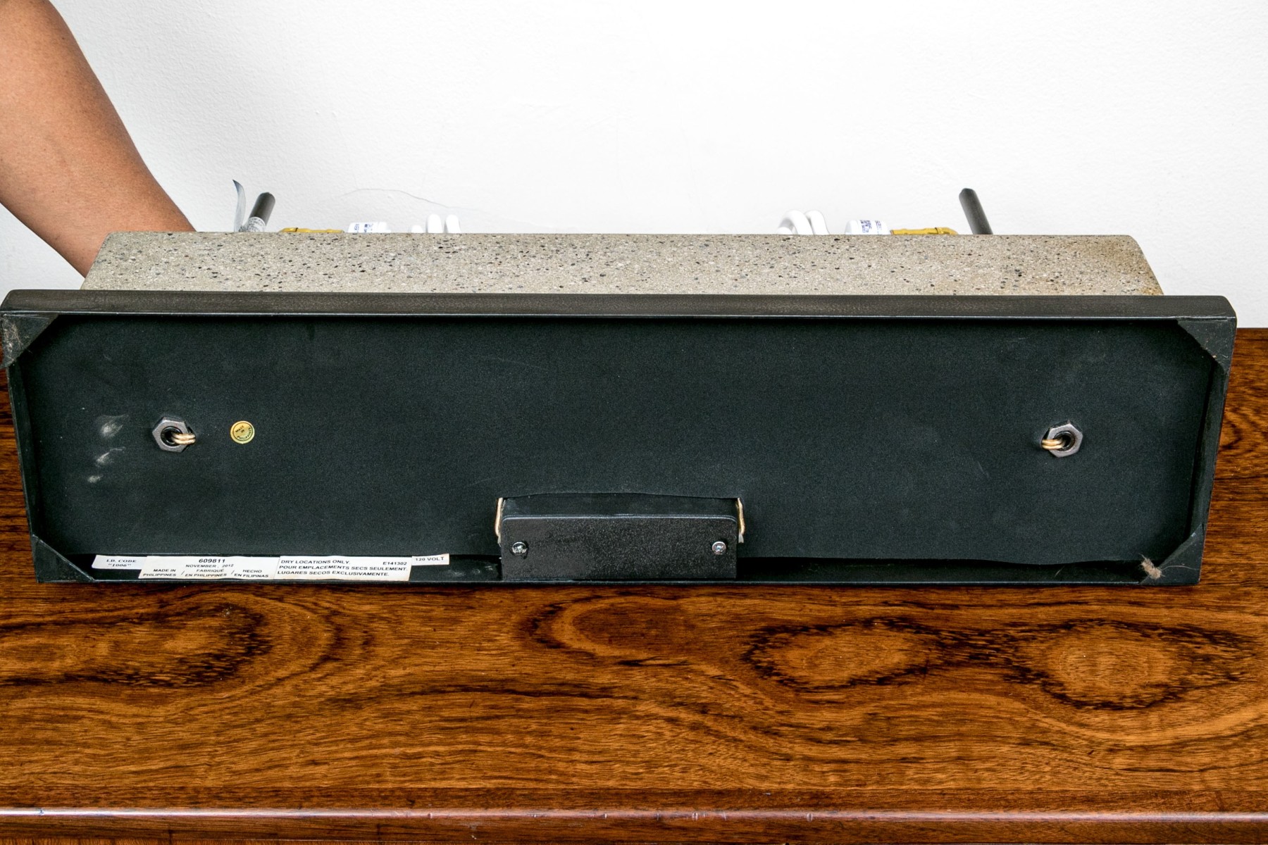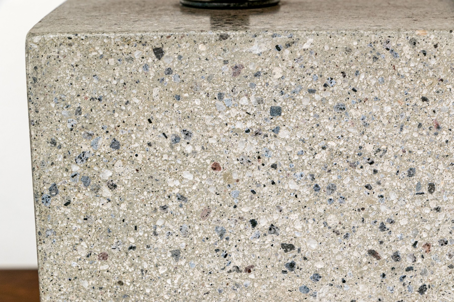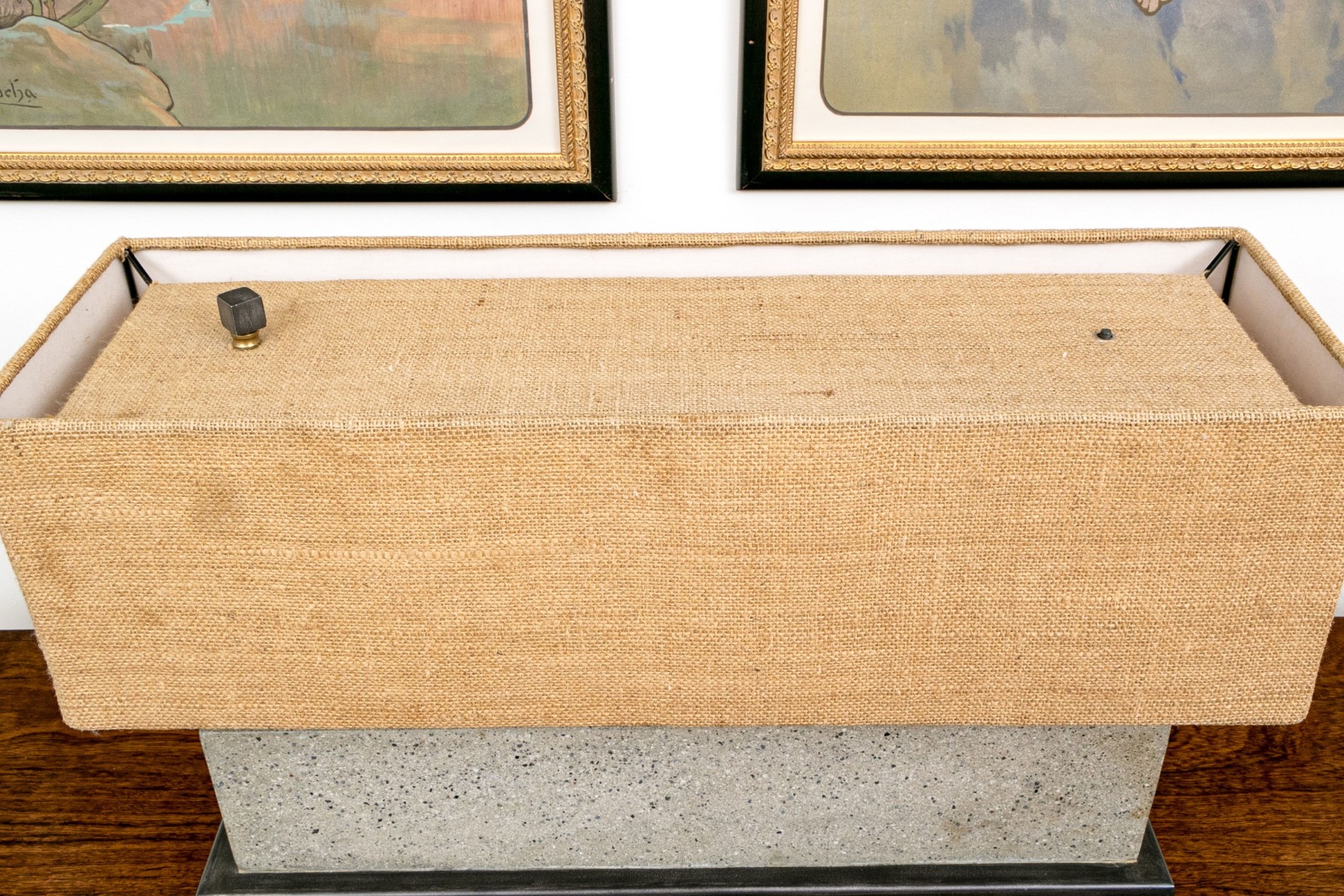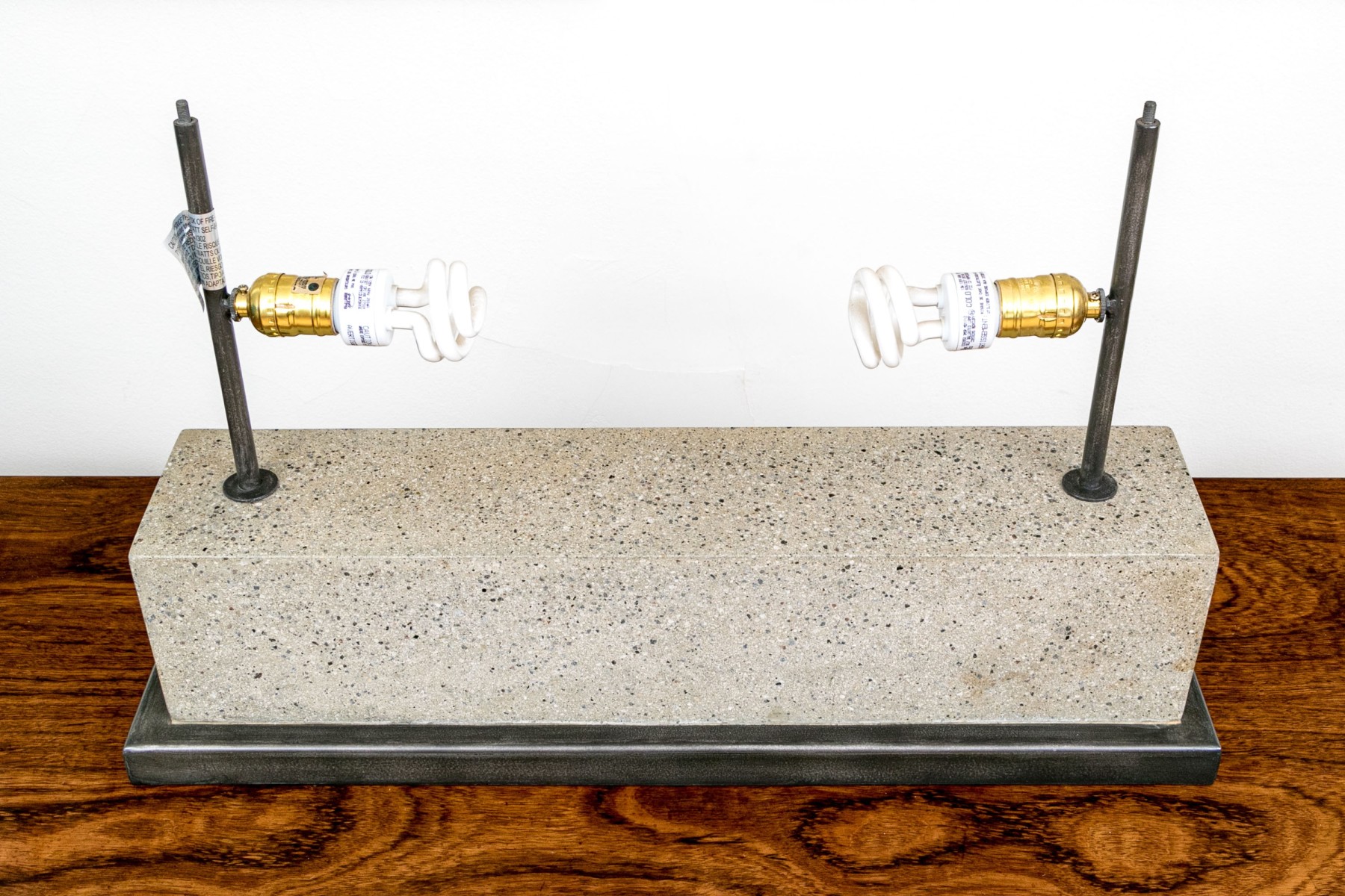 The Norris table lamp is fabulously sculptural in its aesthetic. The contemporary table lamp rests upon an iron base with polished concrete body. The table lamp has a wonderful burlap textured, rectangular shade with top cover.