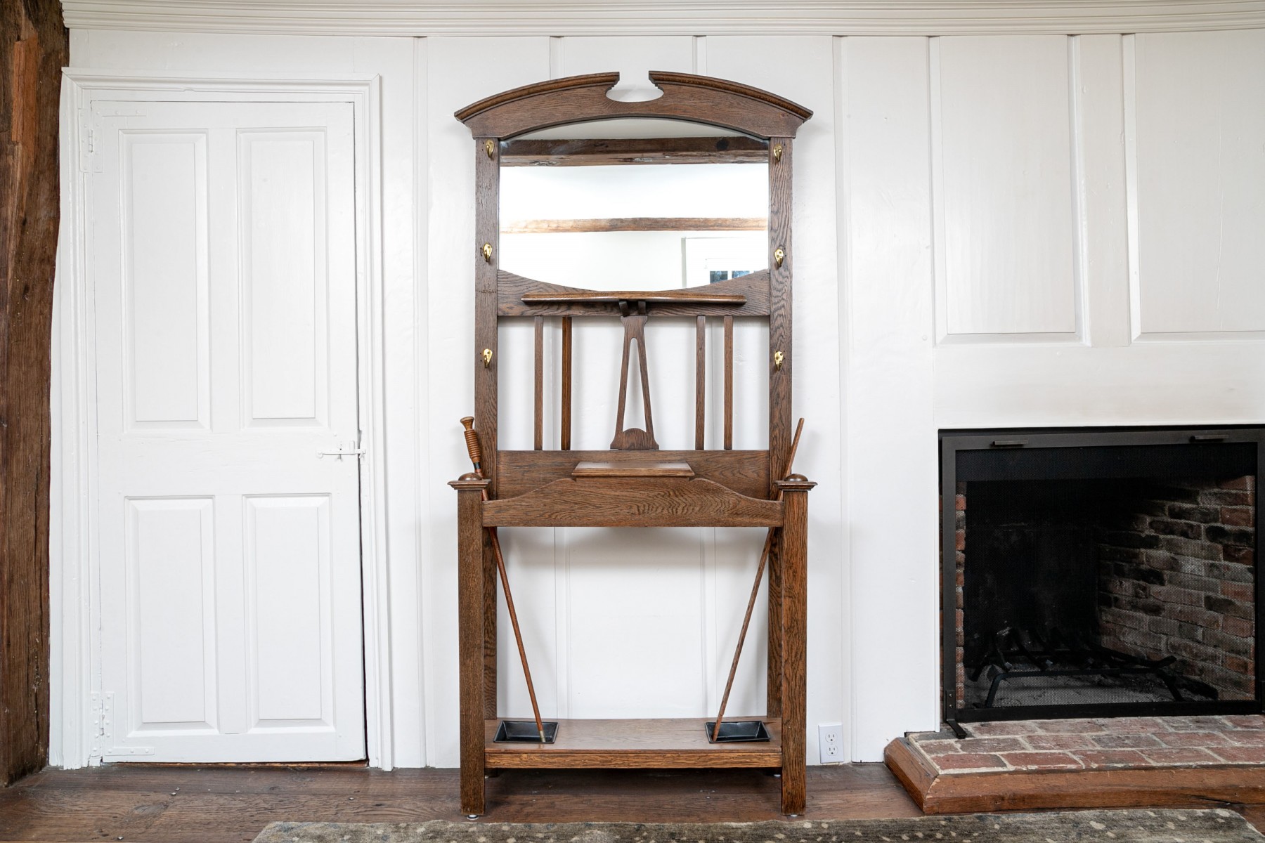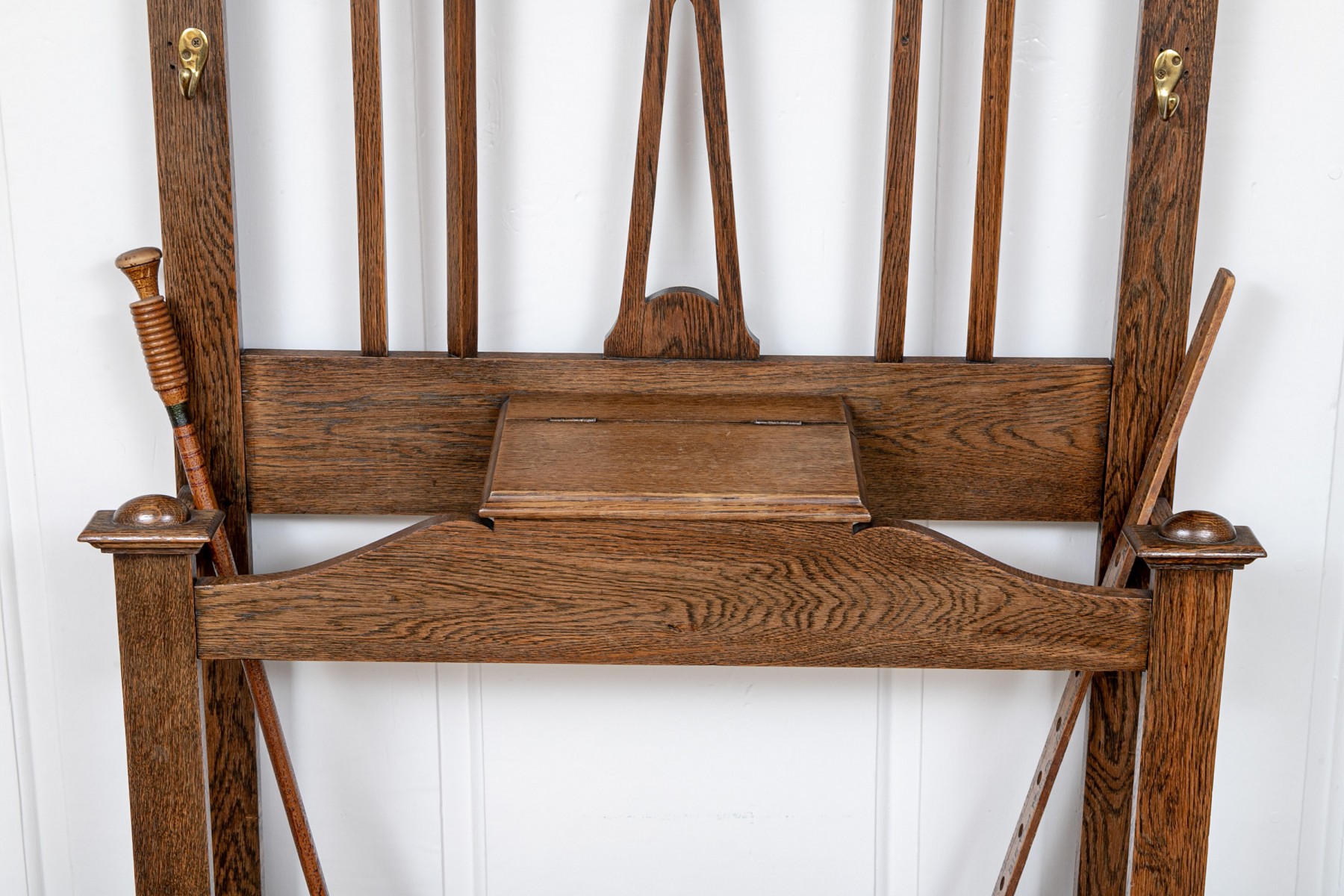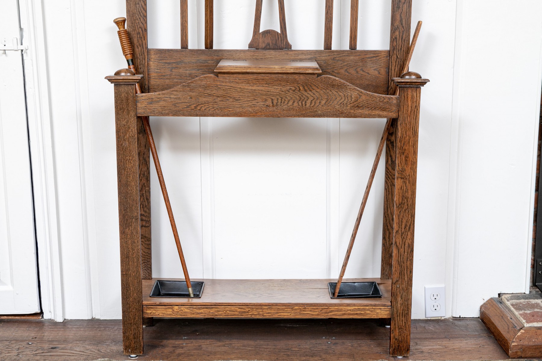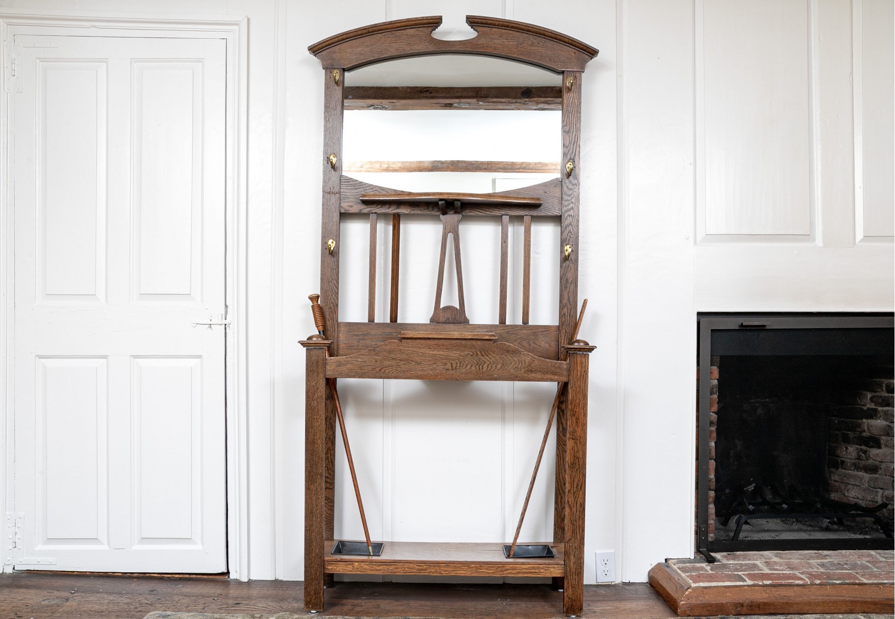 This vintage oak hall tree is a charming and functional piece of furniture perfect for entryways, mudrooms, or any space in need of a stylish storage solution. Crafted from solid oak, this hall tree features a warm and inviting country style with its natural wood grain and rustic details. It includes multiple hooks for hanging coats, hats, and other accessories