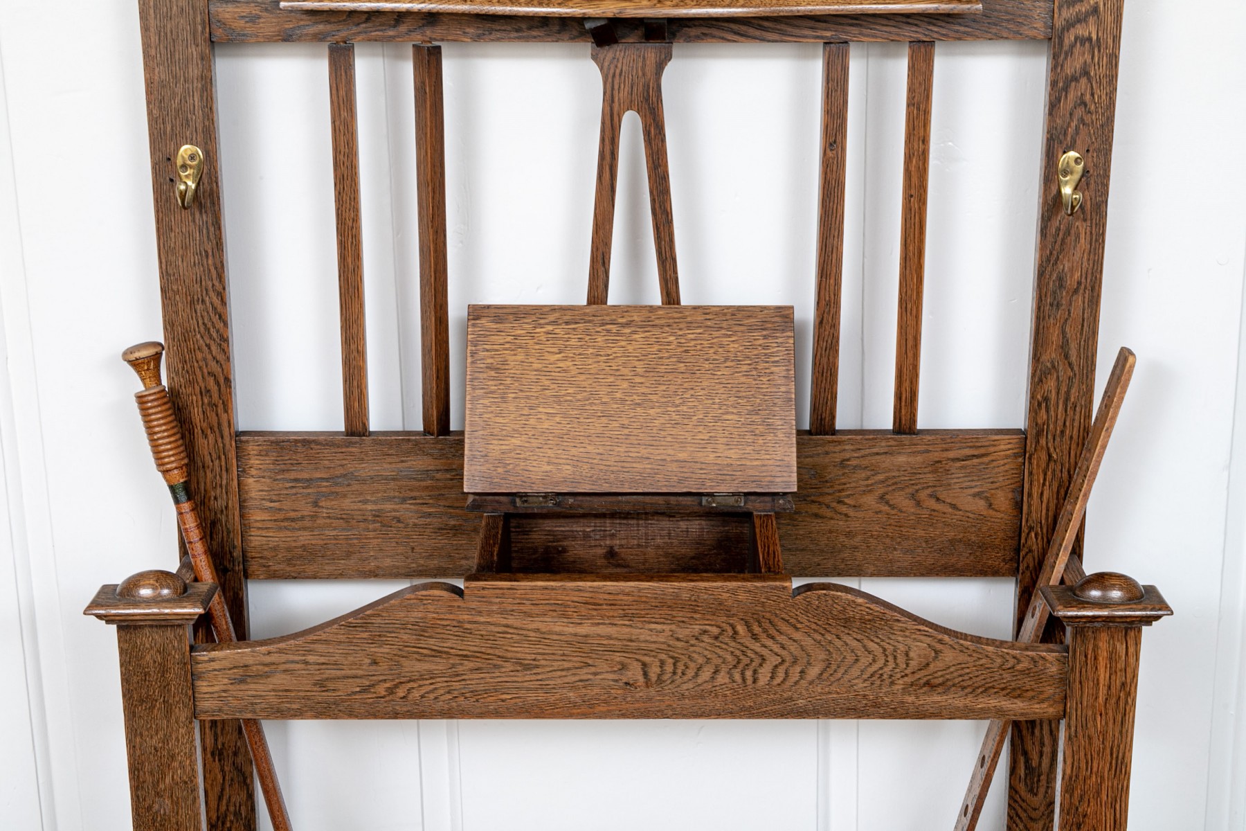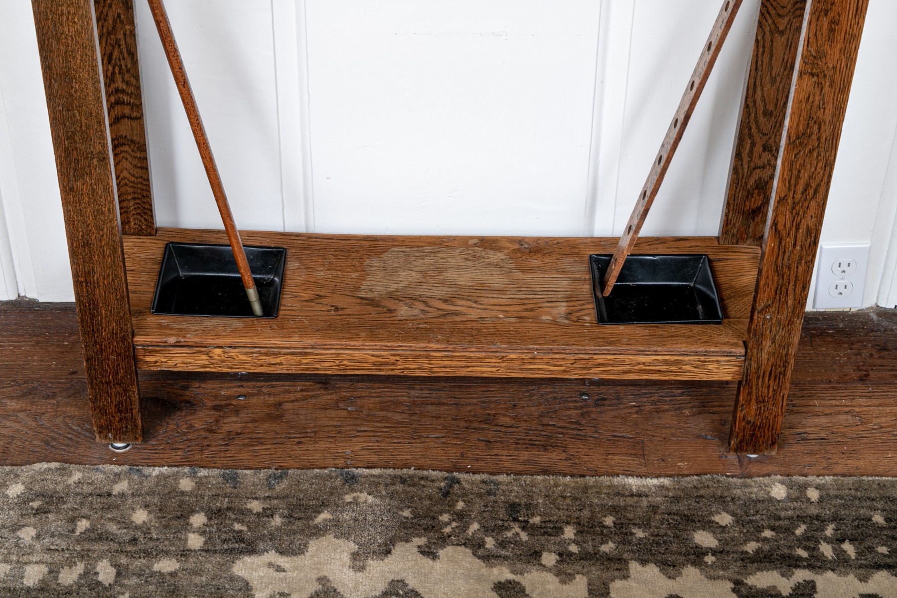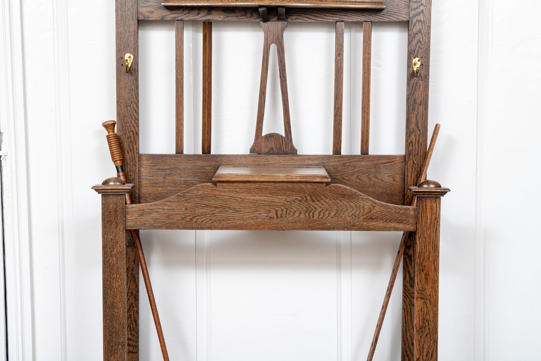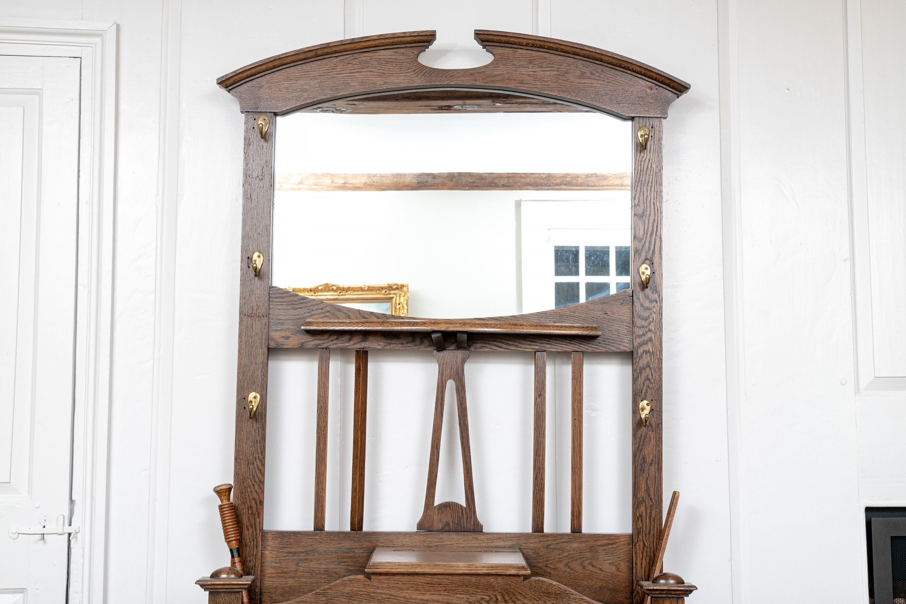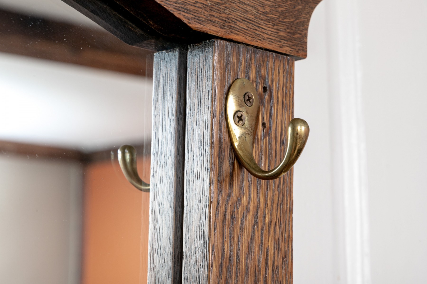 This vintage oak hall tree is a charming and functional piece of furniture perfect for entryways, mudrooms, or any space in need of a stylish storage solution. Crafted from solid oak, this hall tree features a warm and inviting country style with its natural wood grain and rustic details. It includes multiple hooks for hanging coats, hats, and other accessories