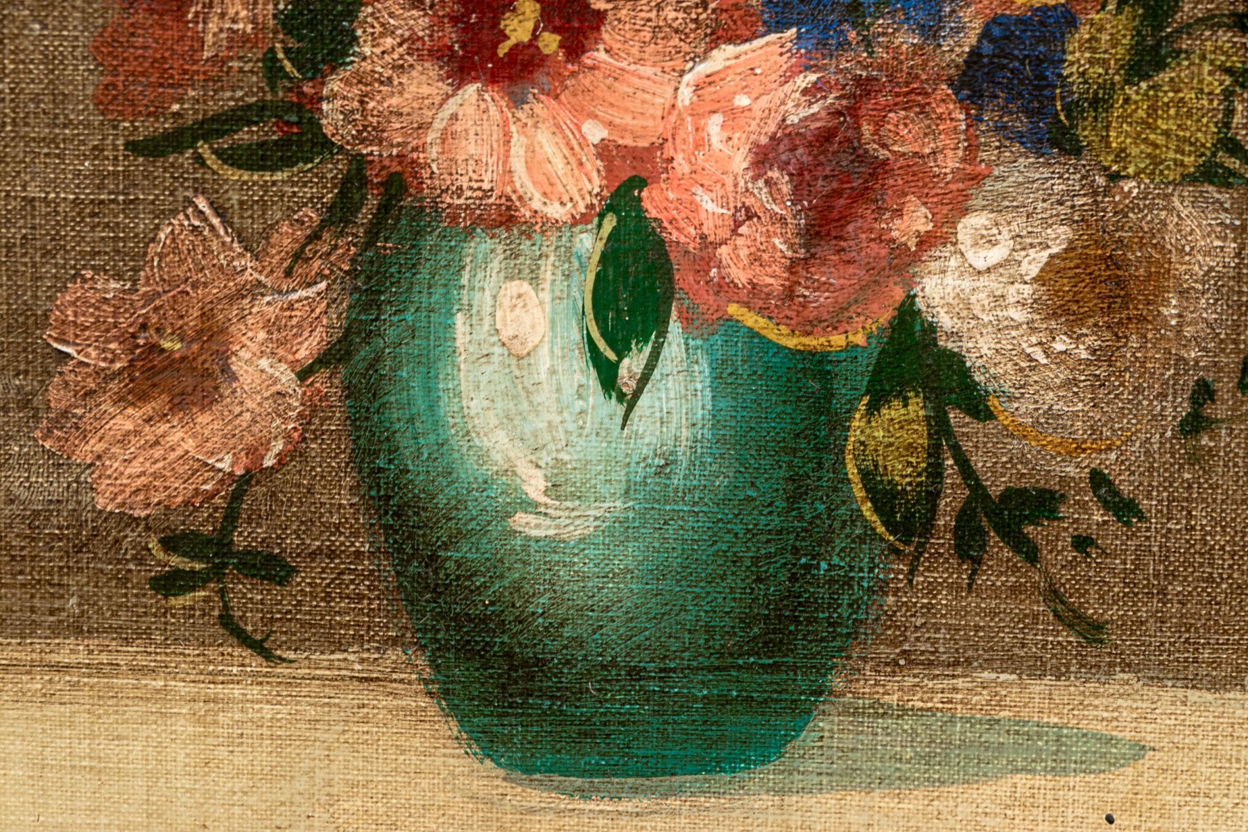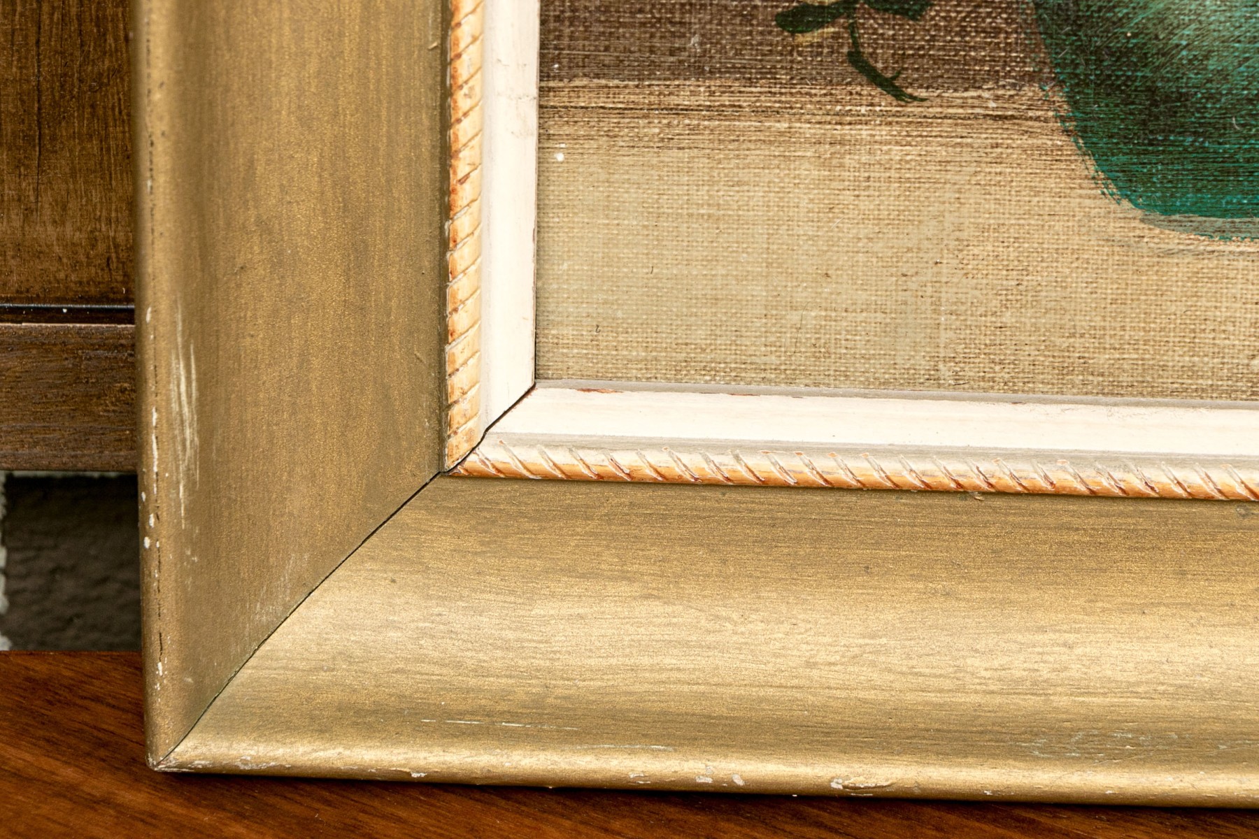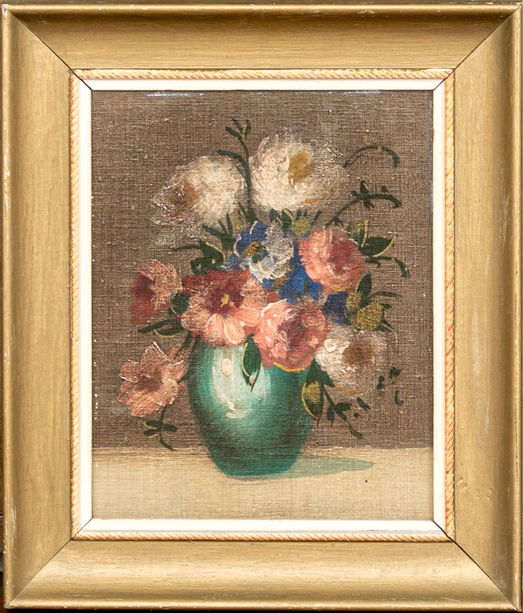 Unsigned. A green vase with pink and white large flowers on a table. Presented in a gilt frame.