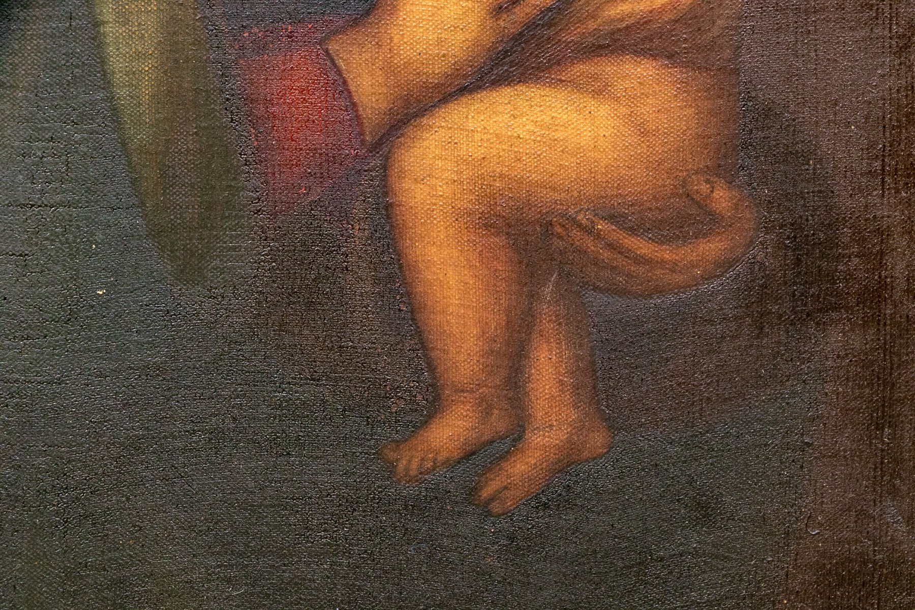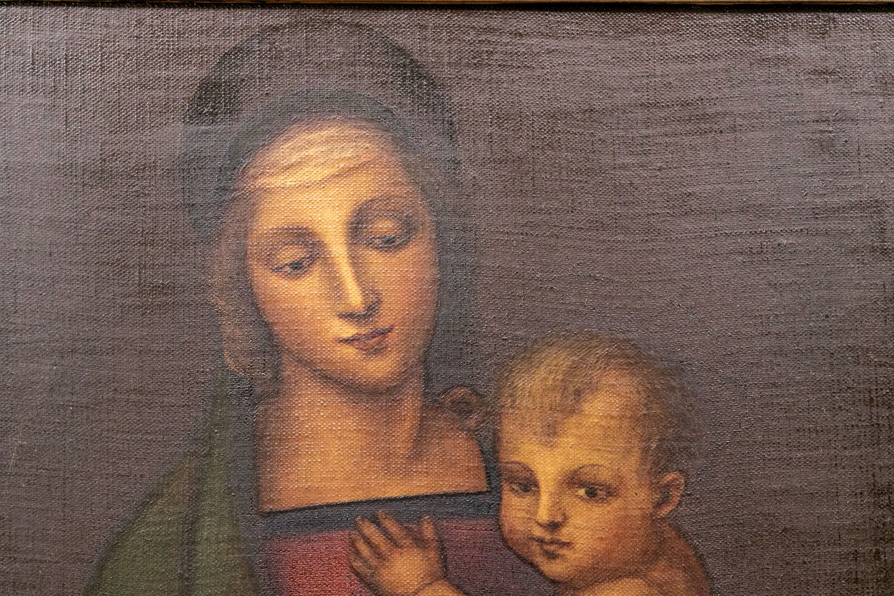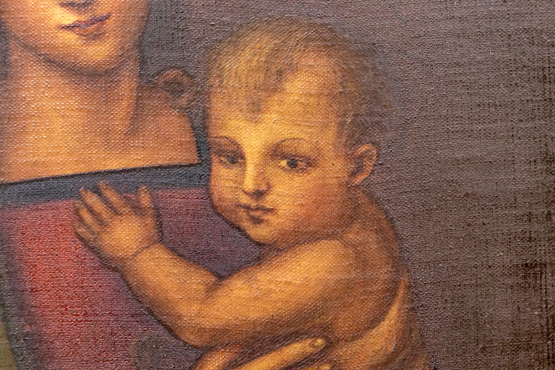 Unsigned. A Madonna and Child in the manner of Raphael’s “Granduca Madonna” in the Pitti Palace in Florence.. The Virgin Mary is dressed in her traditional red and blue robes and holds the Christ Child in her arms as she looks down in a pensive foreboding manner. Presented in a deep finely carved wood frame.