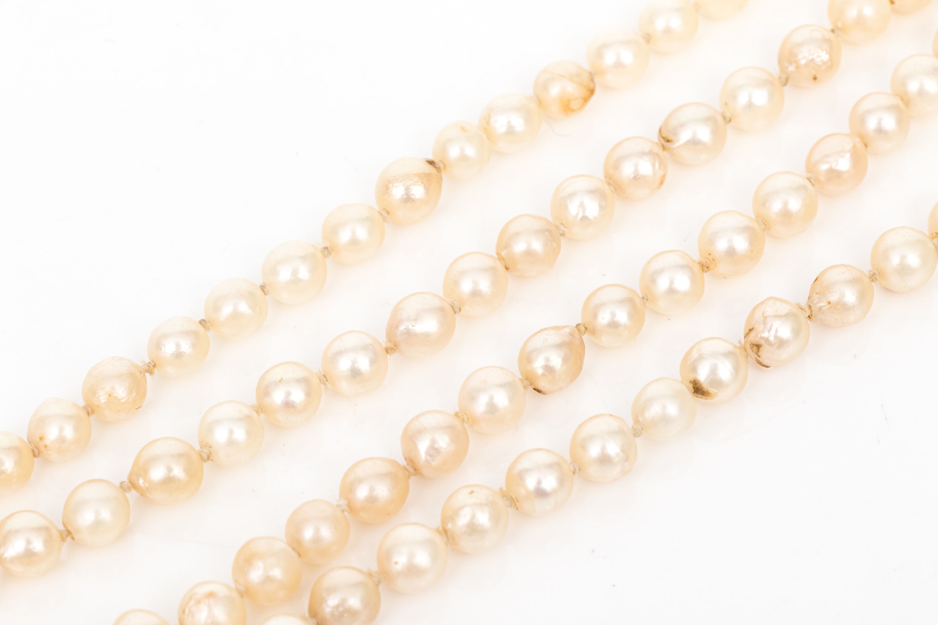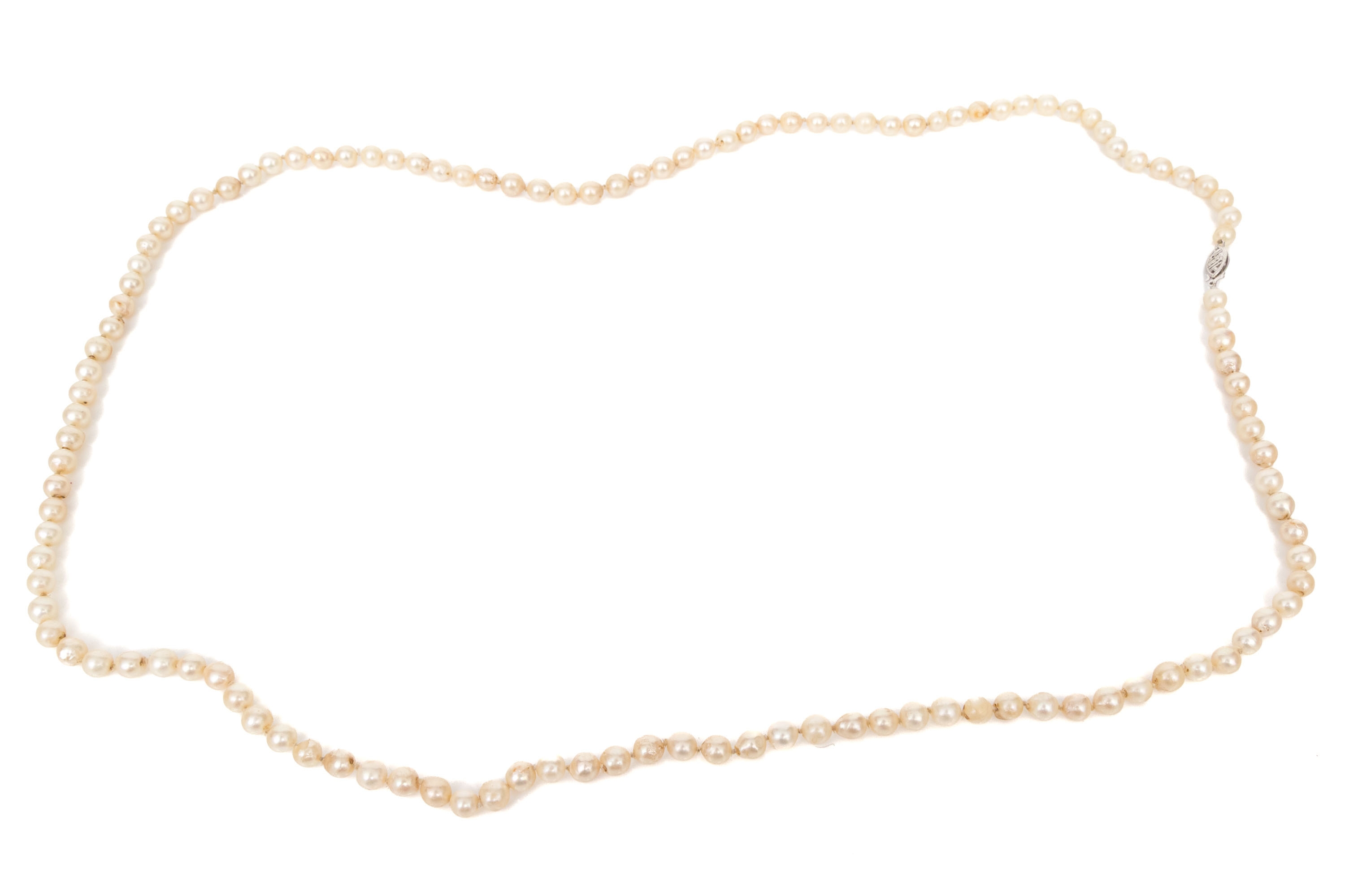 Vintage opera length strand of 5.5mm to 5.75mm cultured pearls, with 14k fishhook clasp