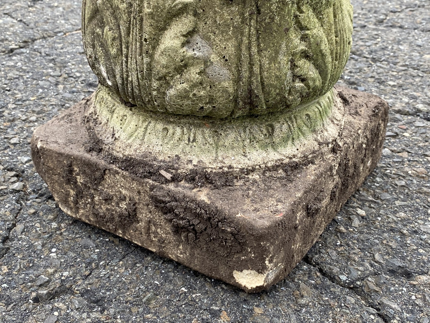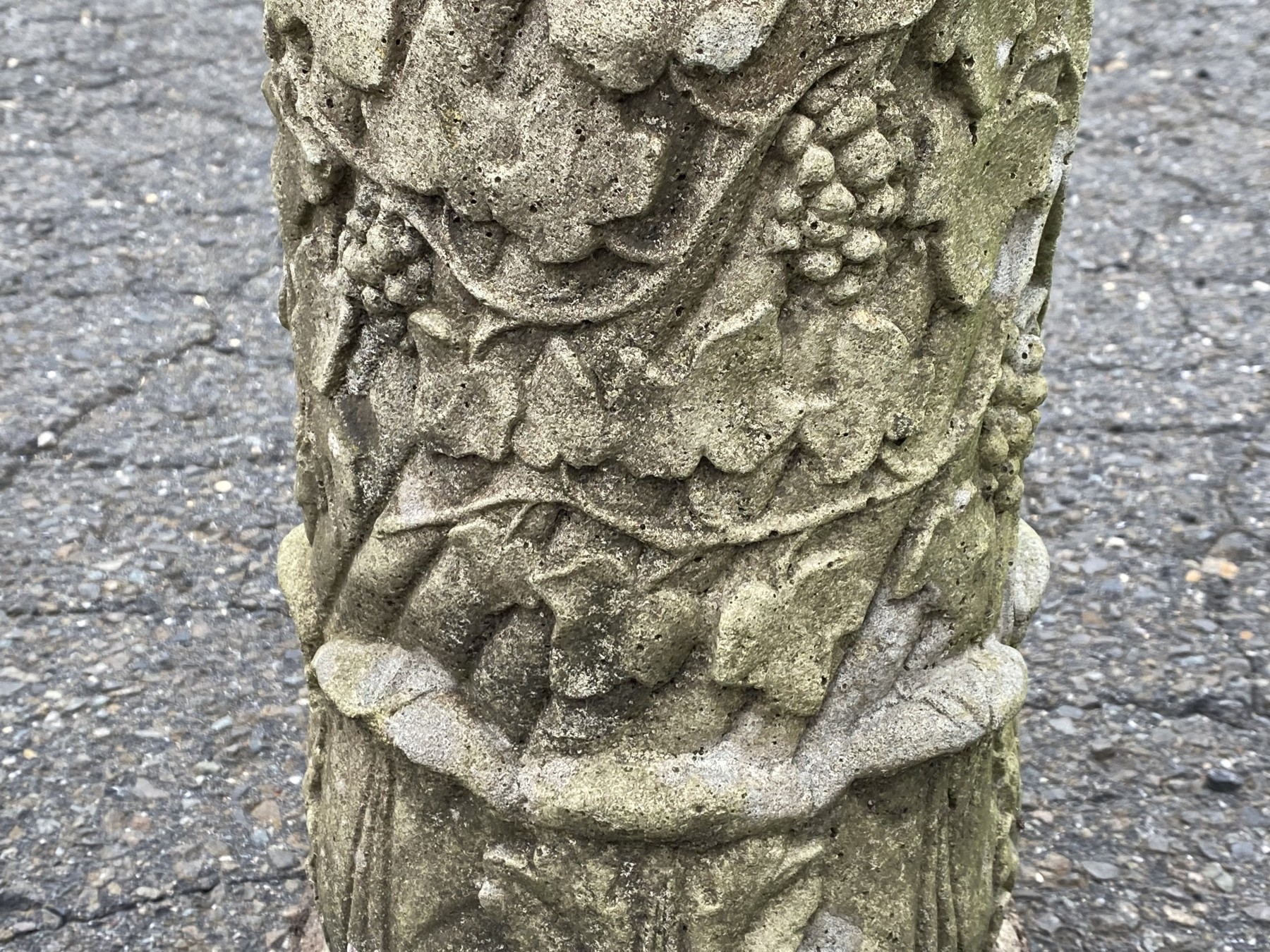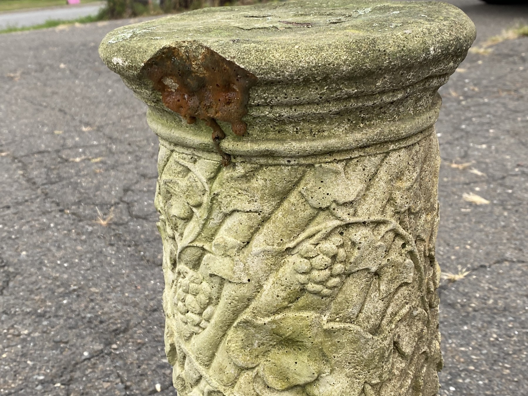 A vintage nicely weathered cement pedestal with ornate acanthus and grape vine motif.