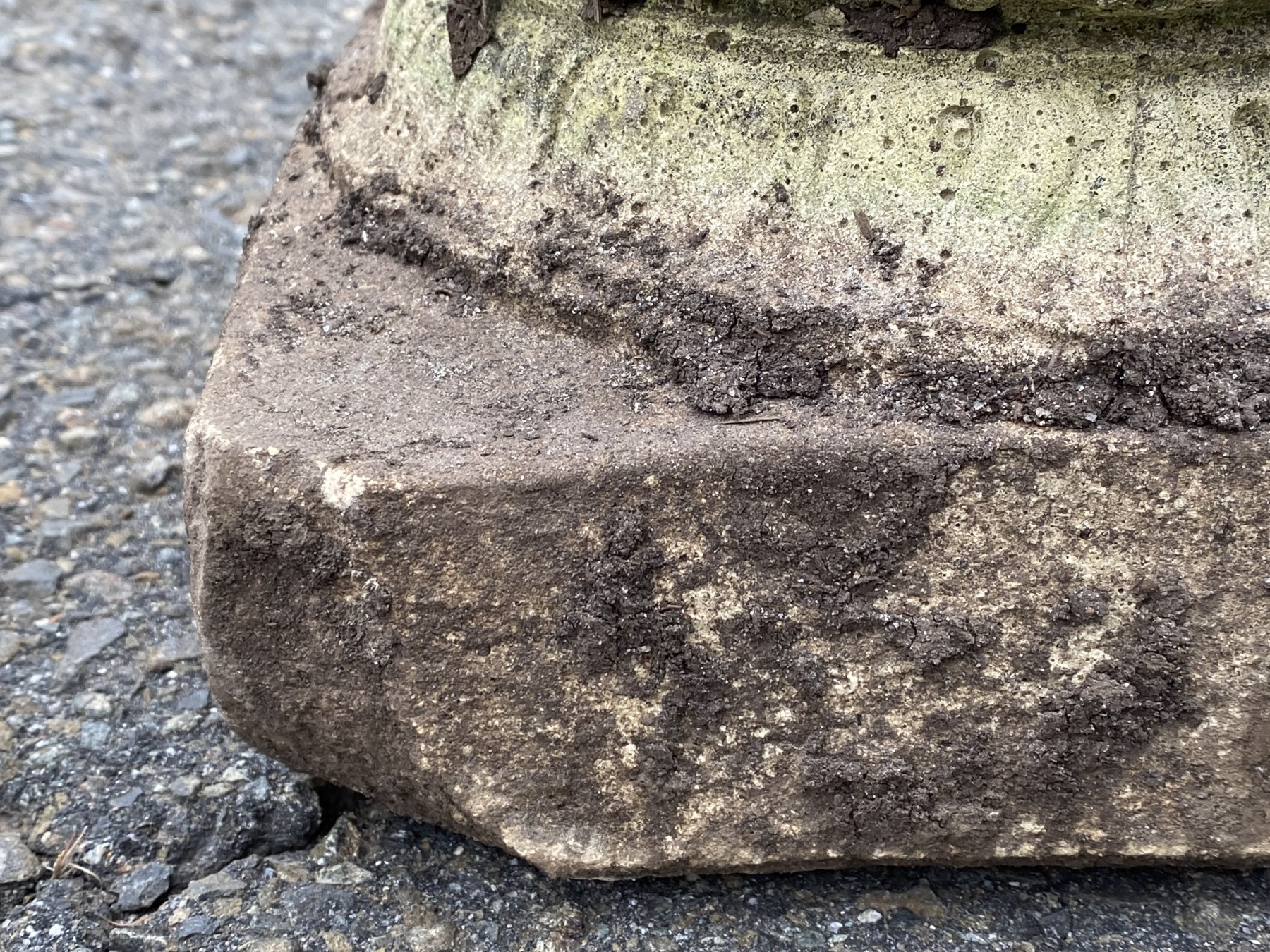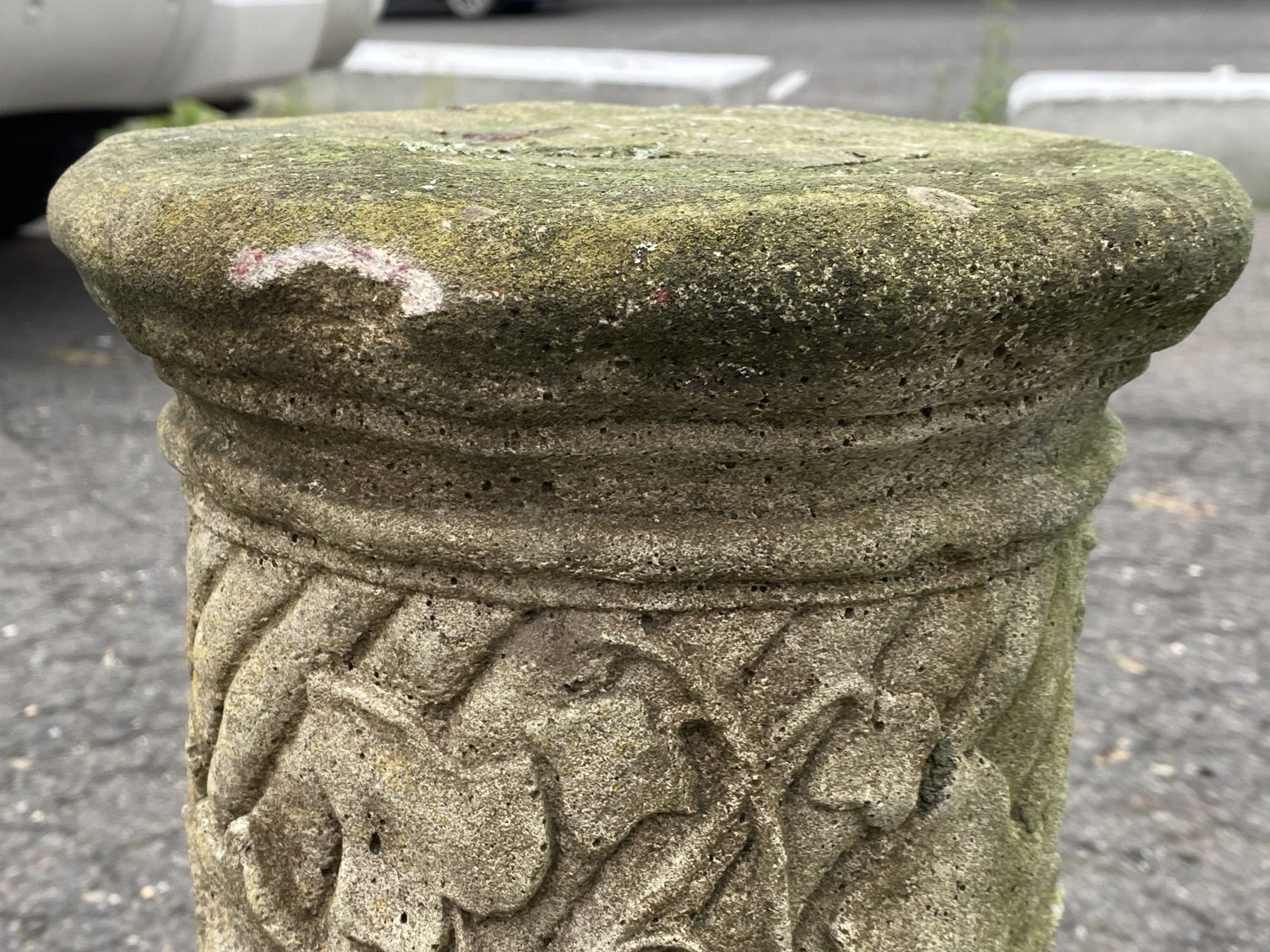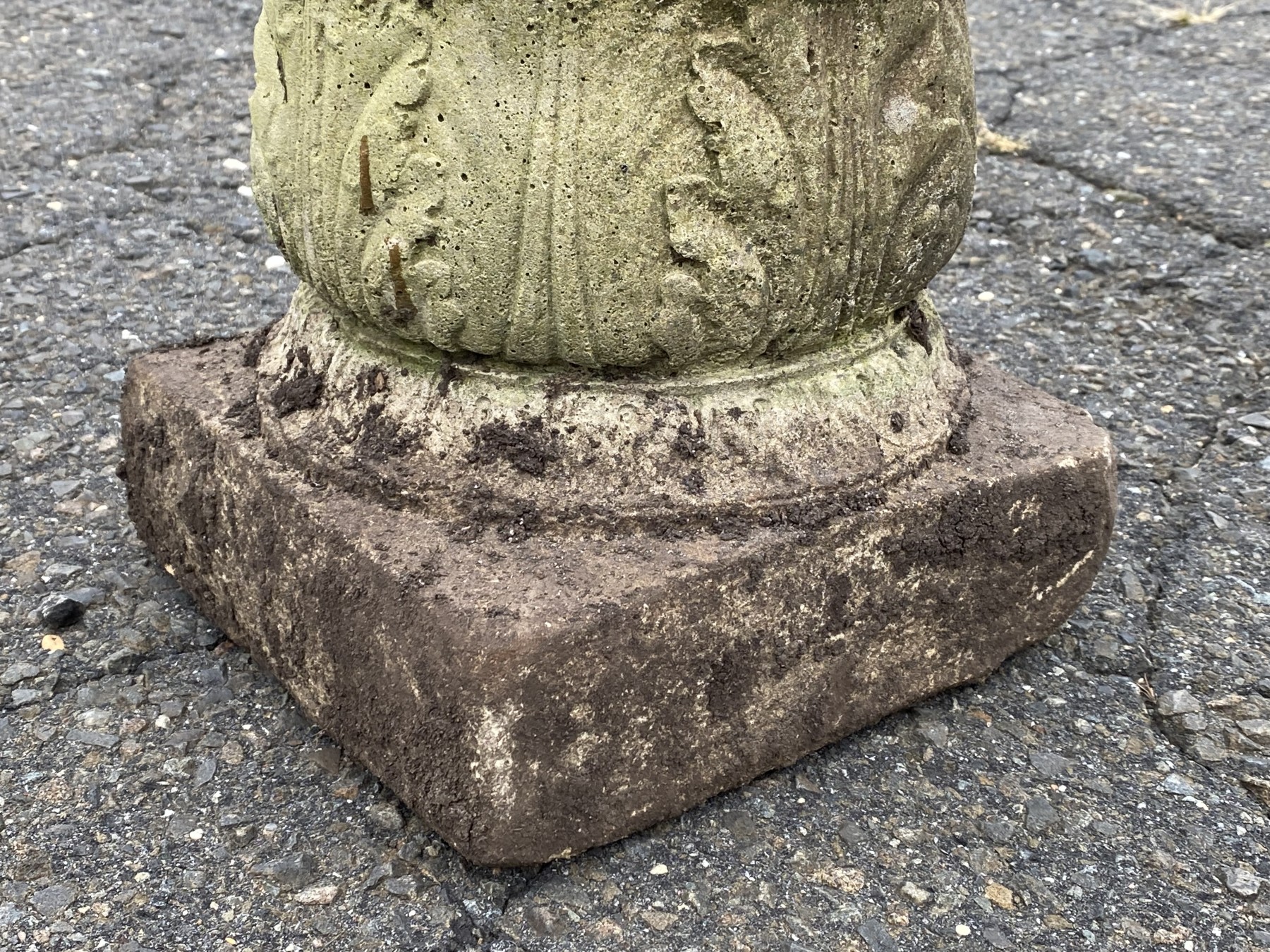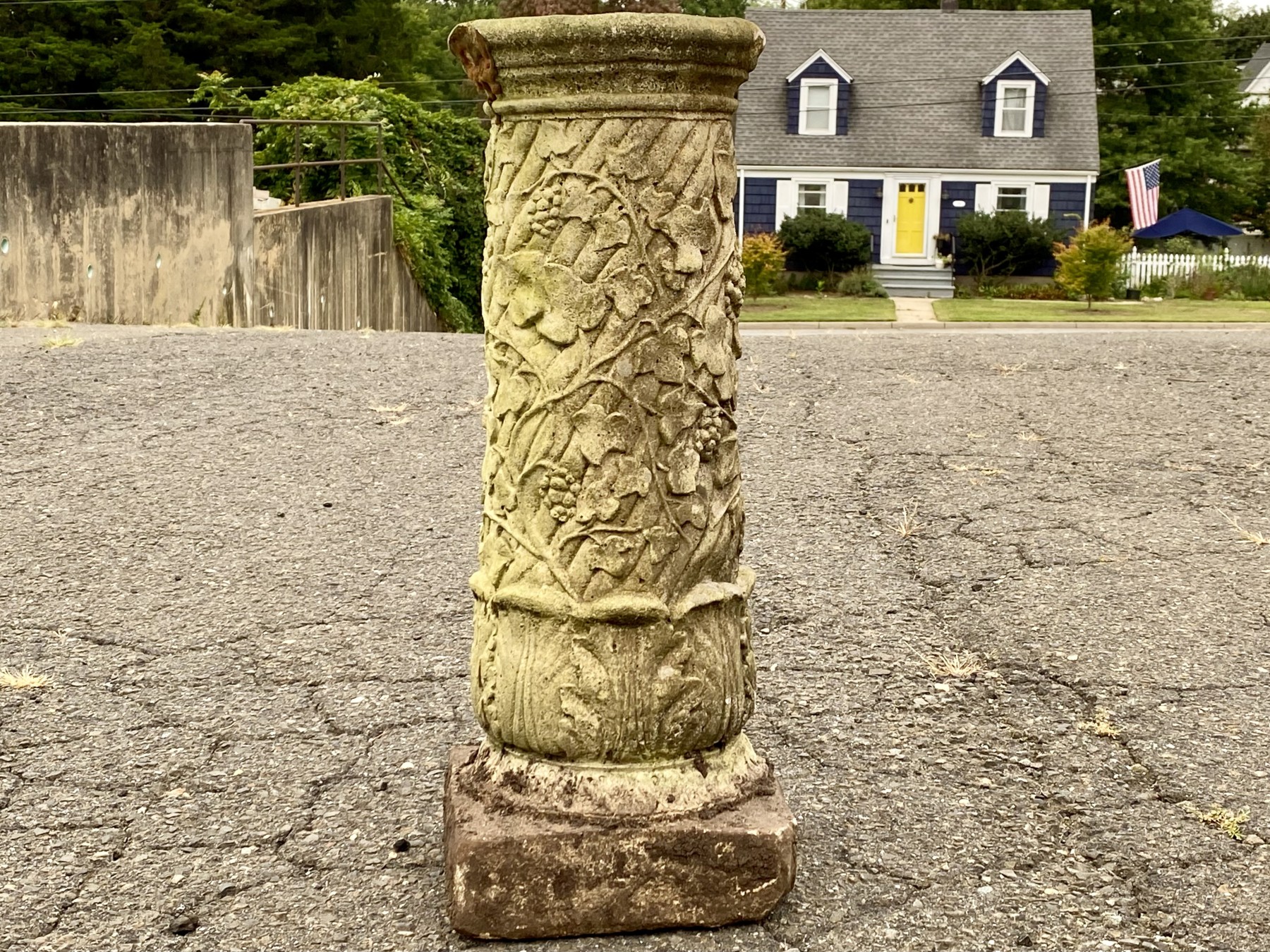 A vintage nicely weathered cement pedestal with ornate acanthus and grape vine motif.