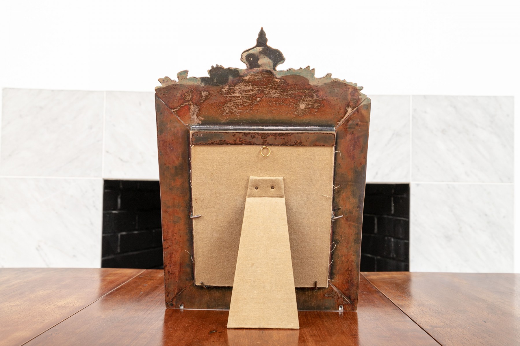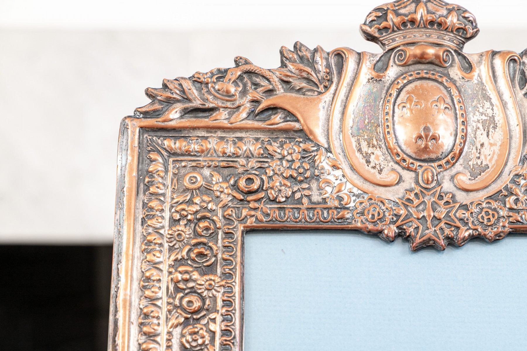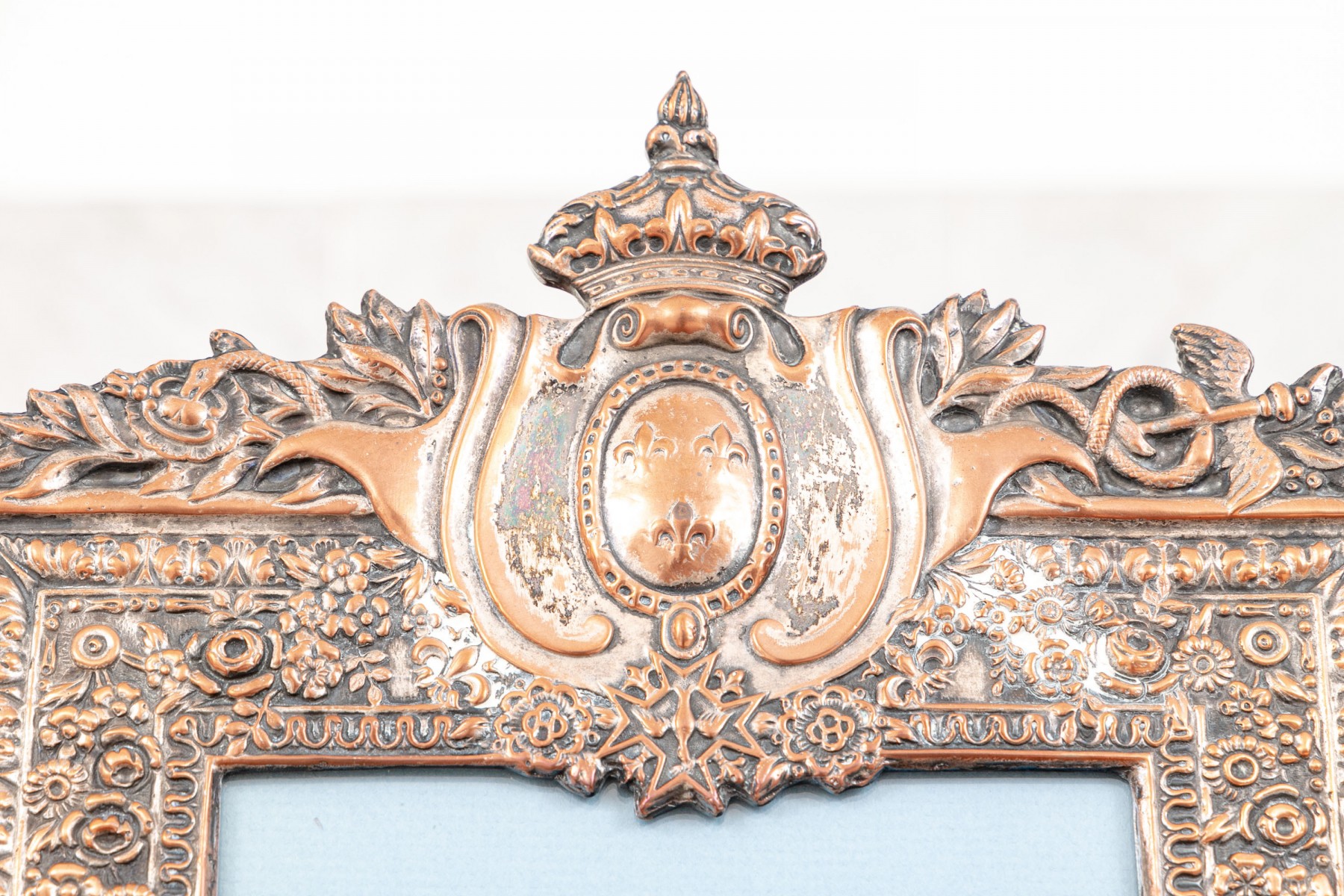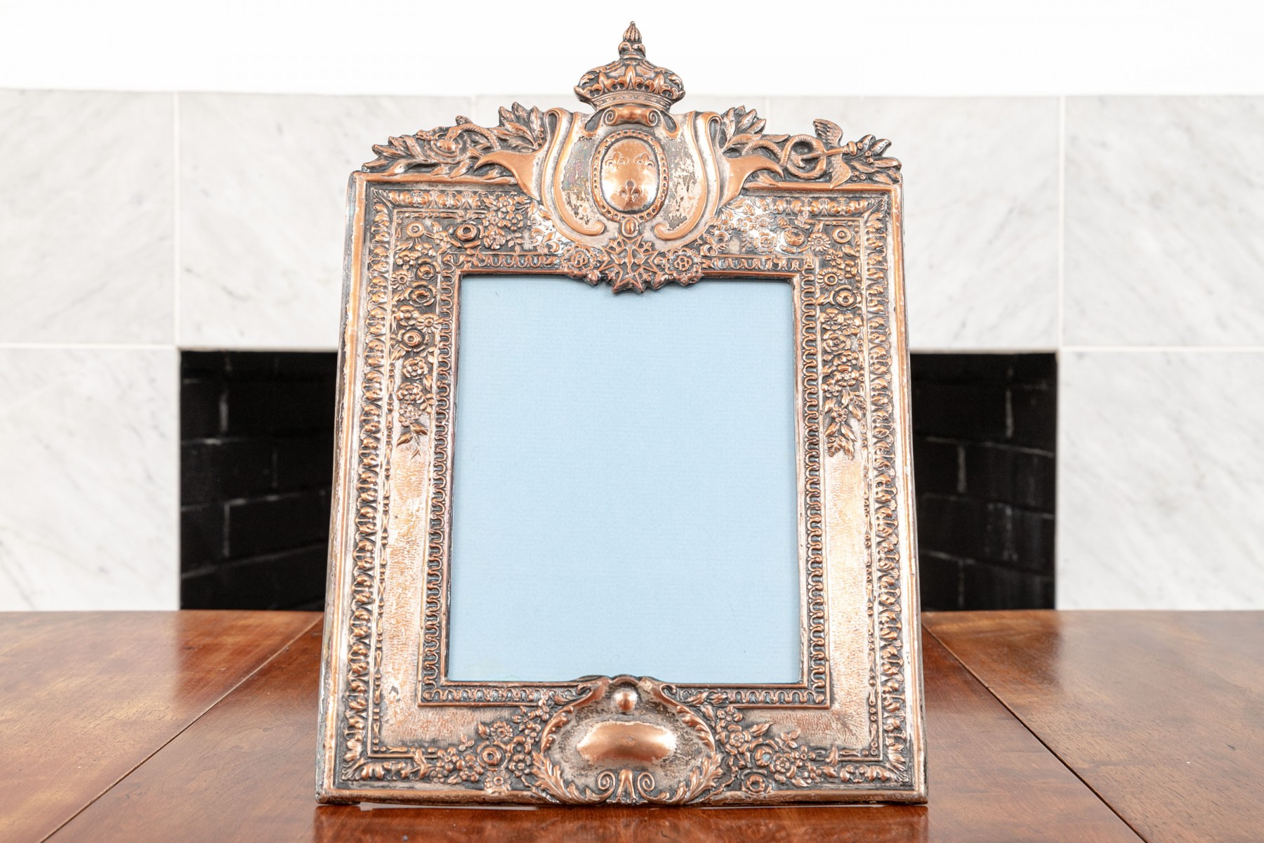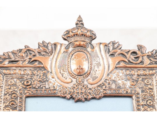 Vintage ornate picture frame with crown at crest and with floral and foliate design on frame.